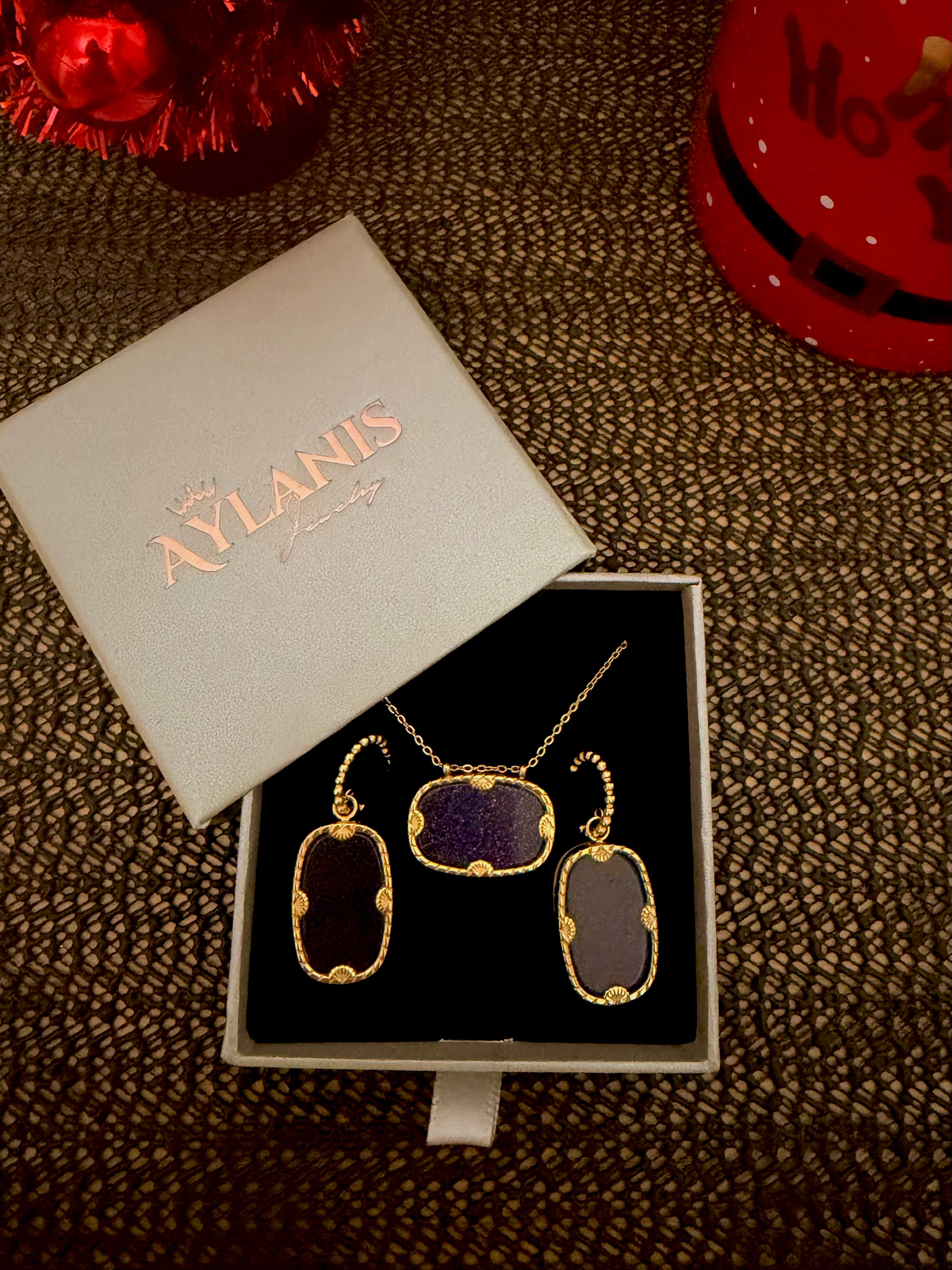 Pour une durée limitée, profitez de cette offre exclusive et offrez-vous un ensemble raffiné: le collier Olympéa en sable bleu et ses boucles d’oreilles assorties, présentés dans un écrin Aylanis.