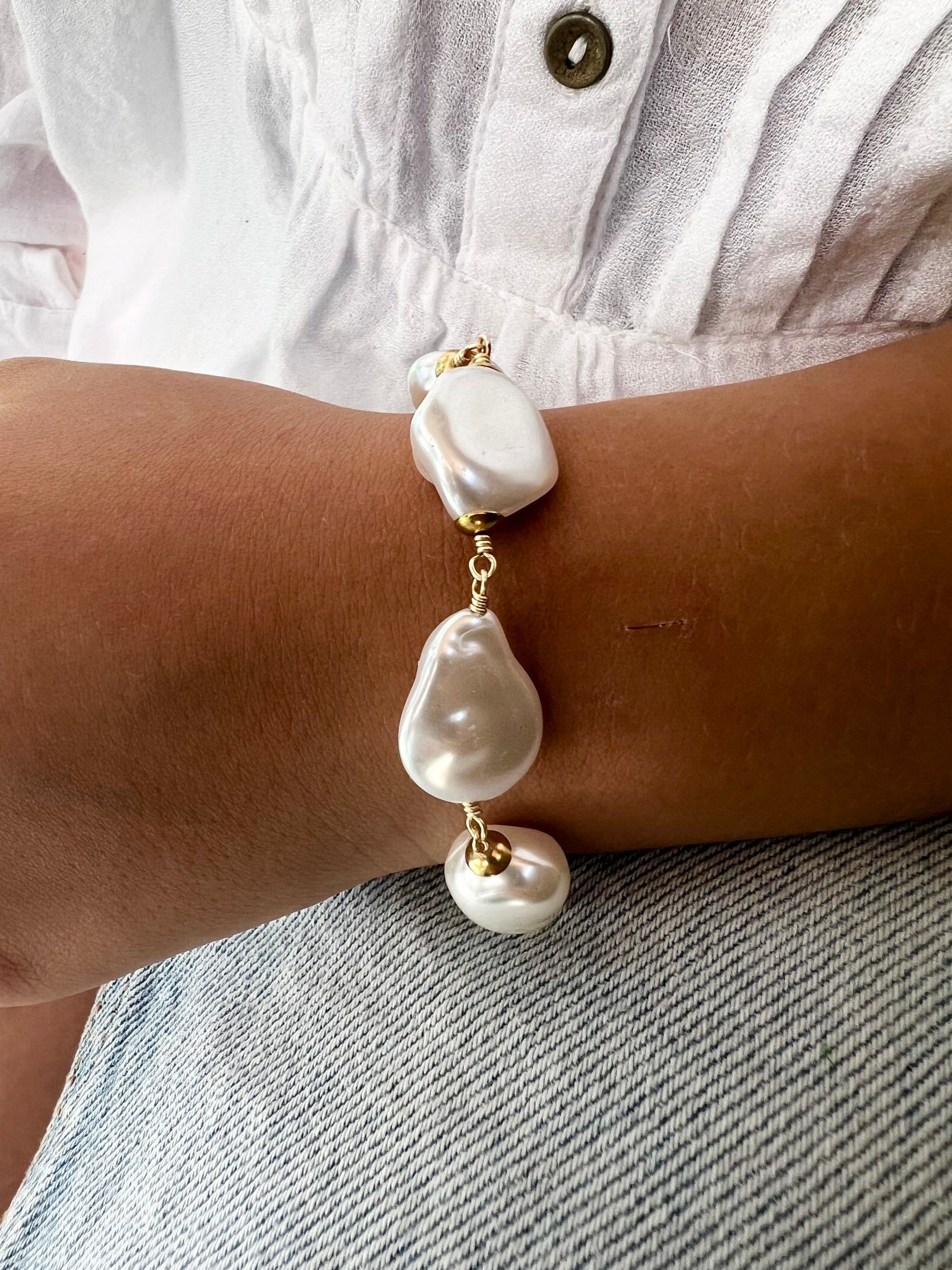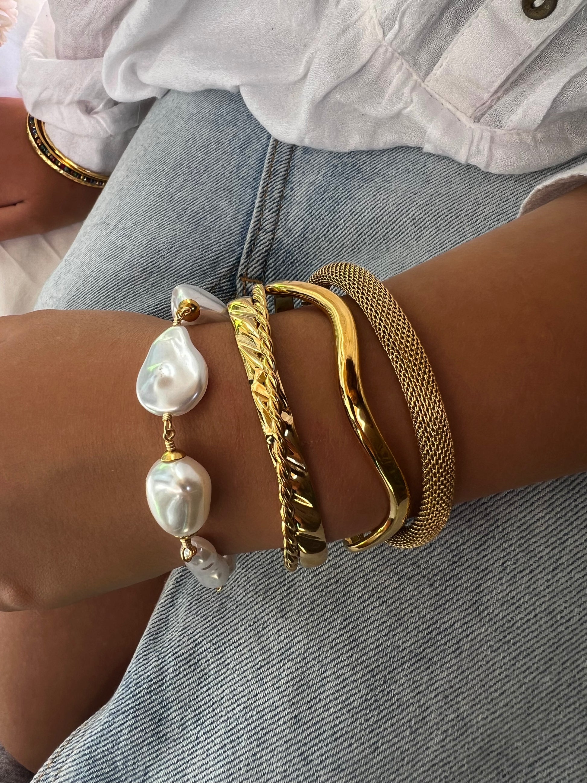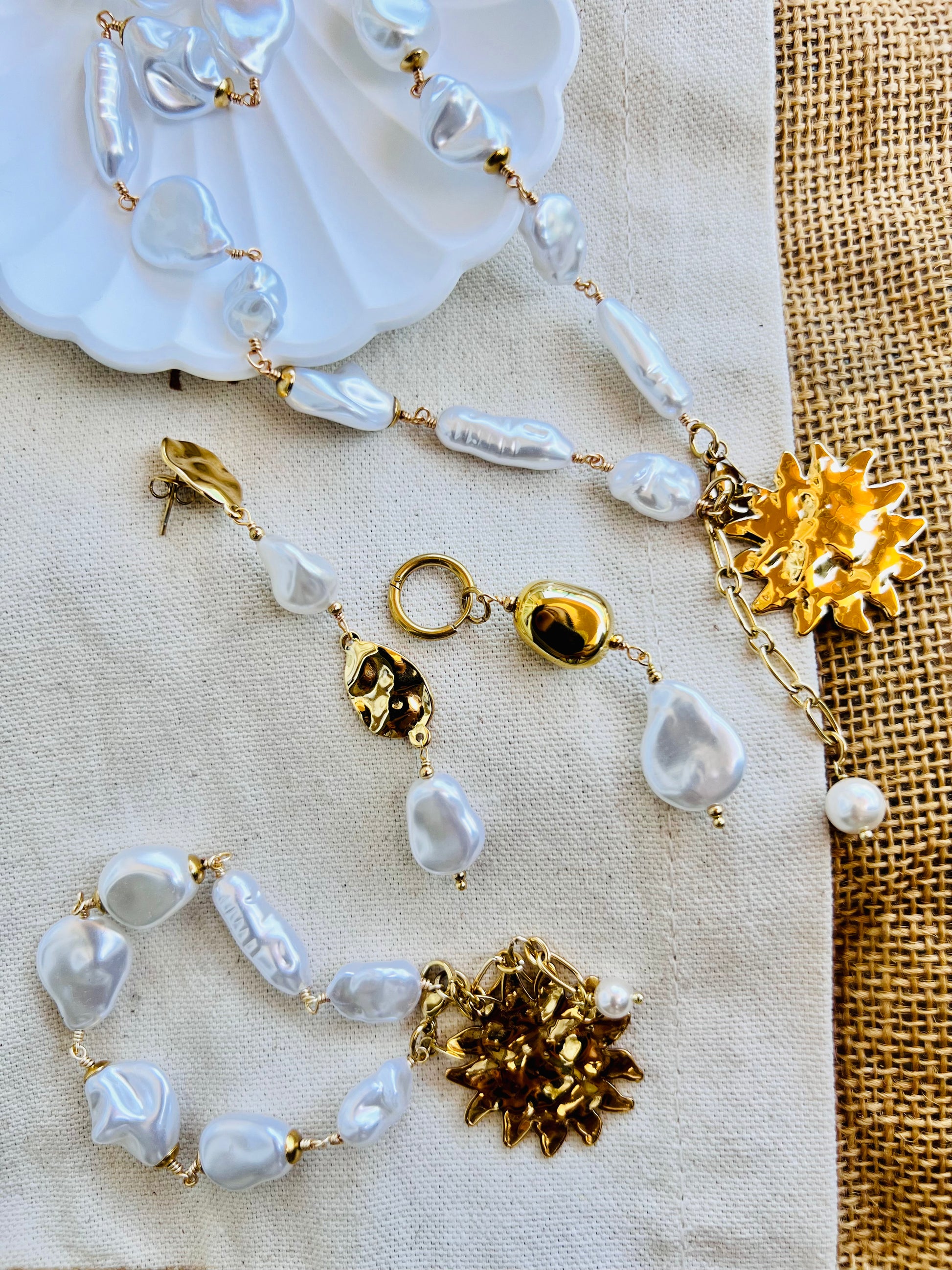 ☀️ Bracelet ACADIA, ce bracelet en acier inoxydable doré allie élégance contemporaine et inspiration solaire. Il est orné de perles en acrylique imitation perles d'eau douce baroques, qui offrent un effet nacré subtil et raffiné.