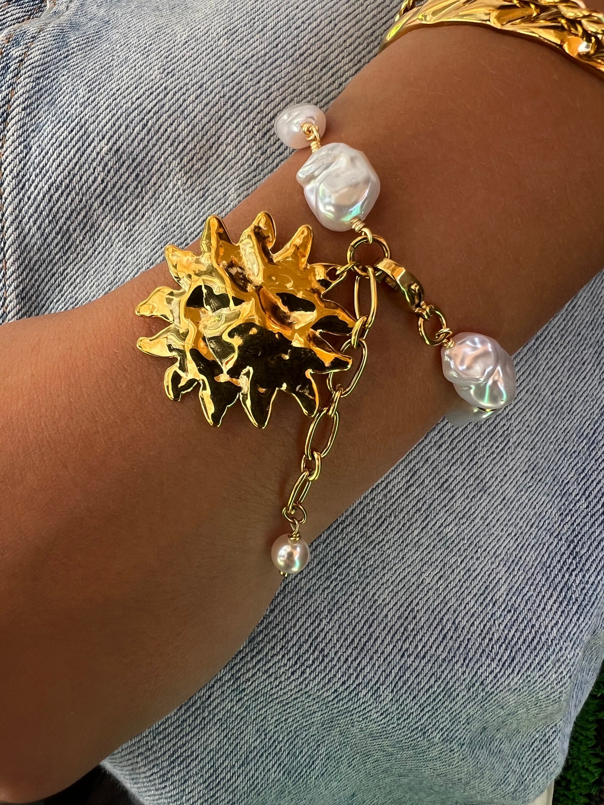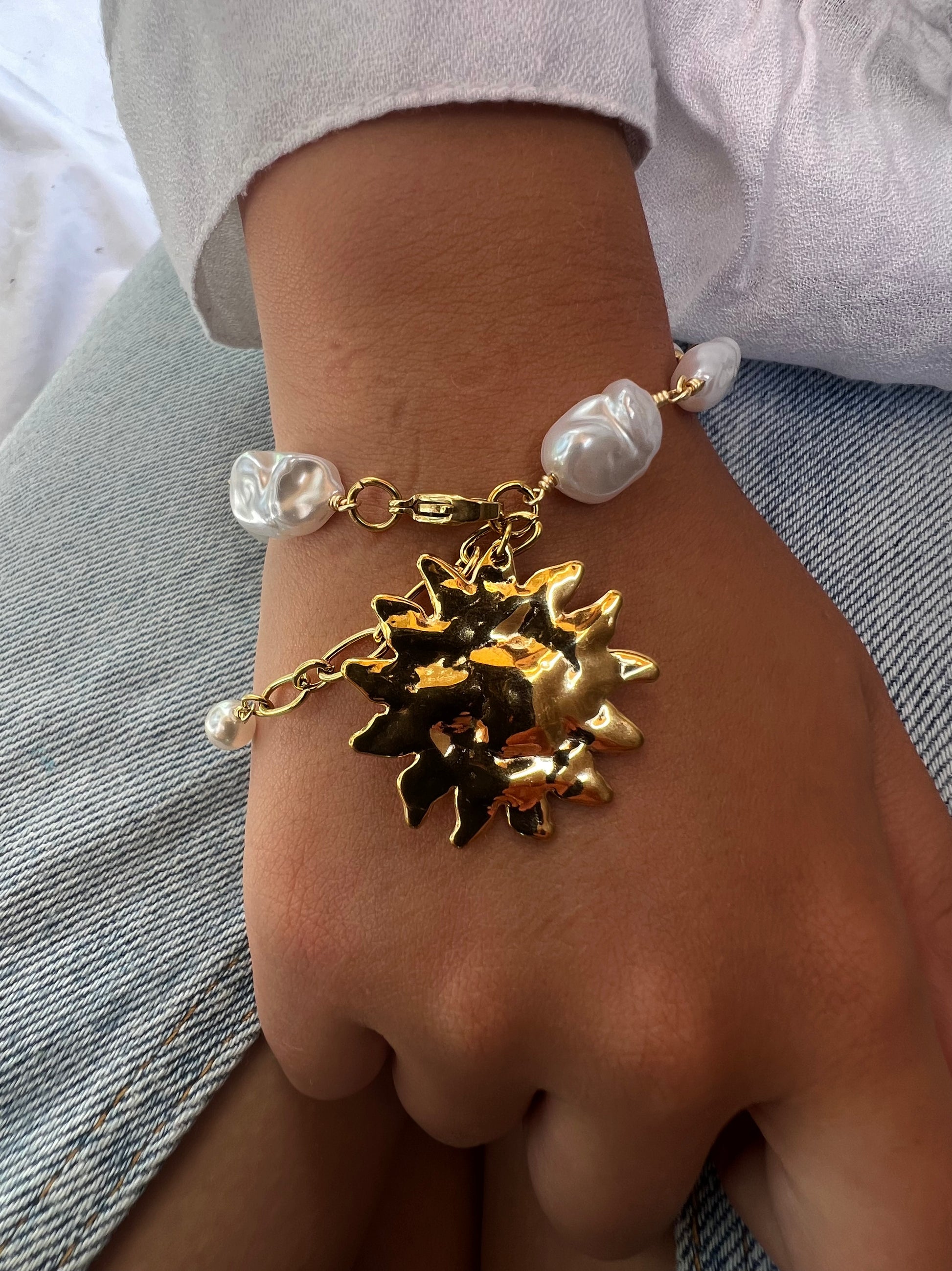 ✧ Bracelet en acier et perle acrylique, imitation de perles d'eau douce baroques, breloque soleil texturé martelé.