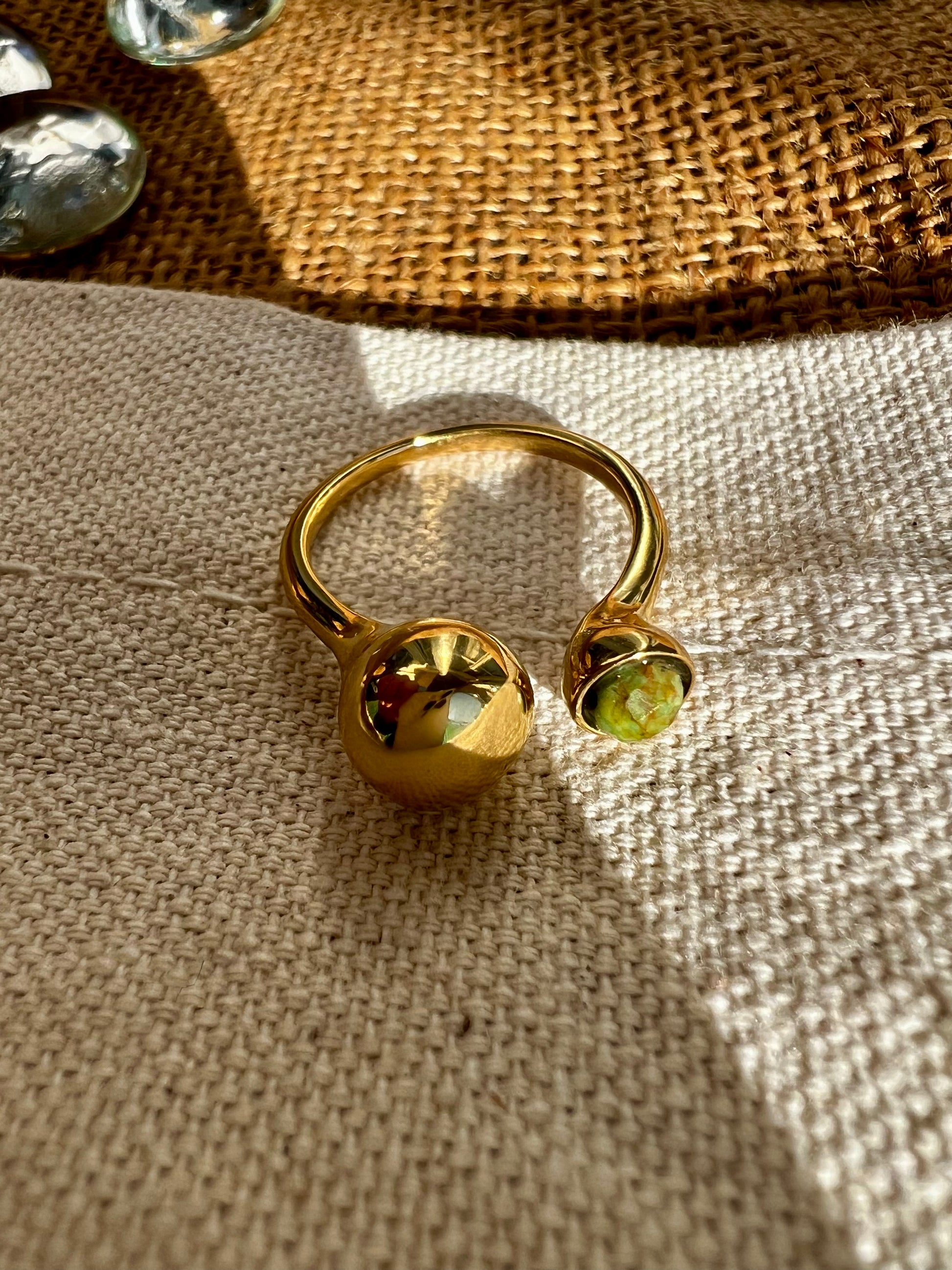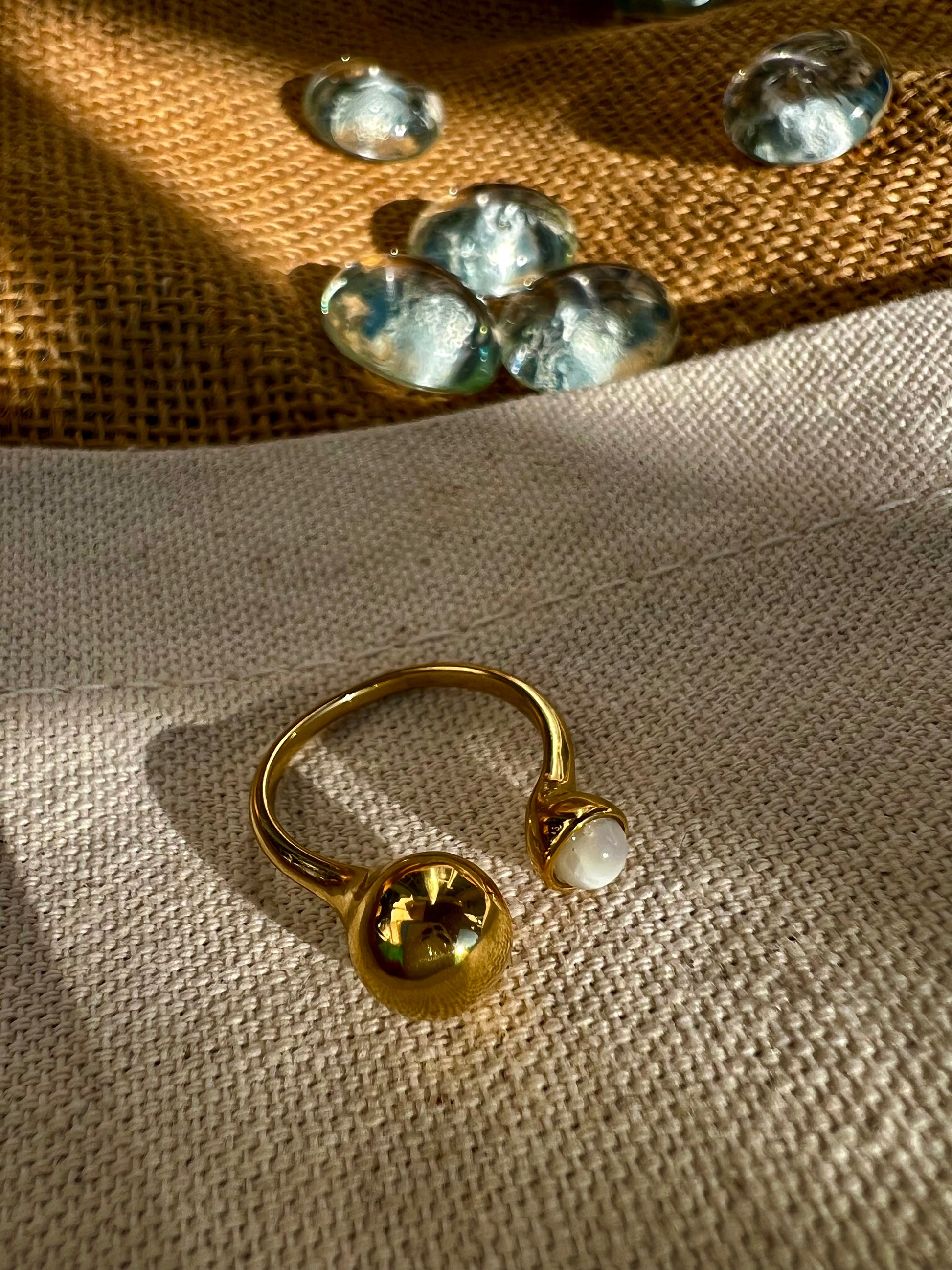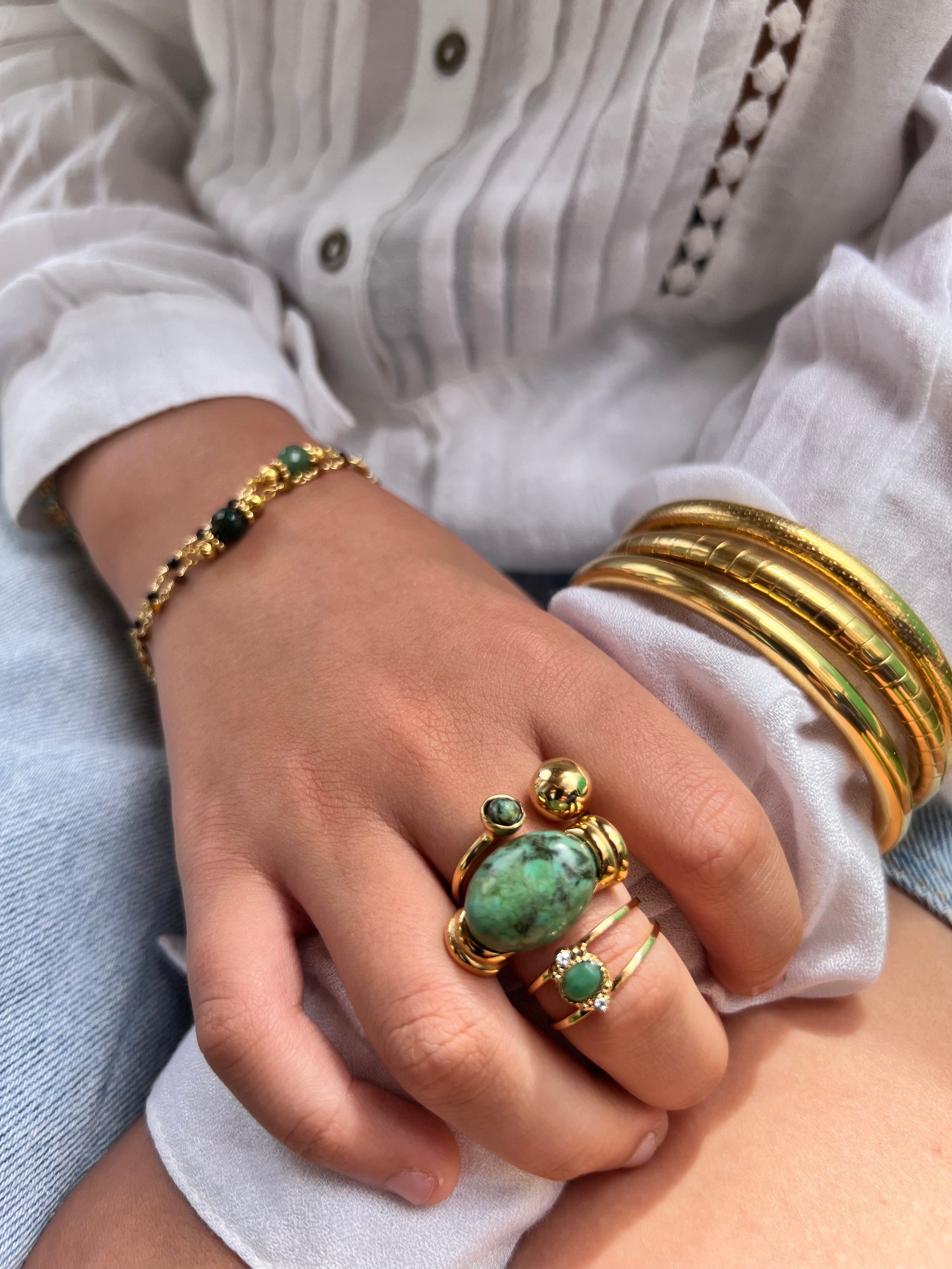 L’élégance discrète de la bague Adèle te séduira à coup sûr ! 💍 Son design ouvert est orné d'une boule lisse minimaliste d’un côté et d’une pierre naturelle ronde de l’autre. Disponible en nacre 🐚 ou turquoise africaine 🌍, elle s’ajuste facilement à tous les doigts. Fabriquée en acier inoxydable doré 💛, hypoallergénique 🚫🌸 et résistante à l’eau 💧, c’est la touche raffinée qui va avec tous tes looks.