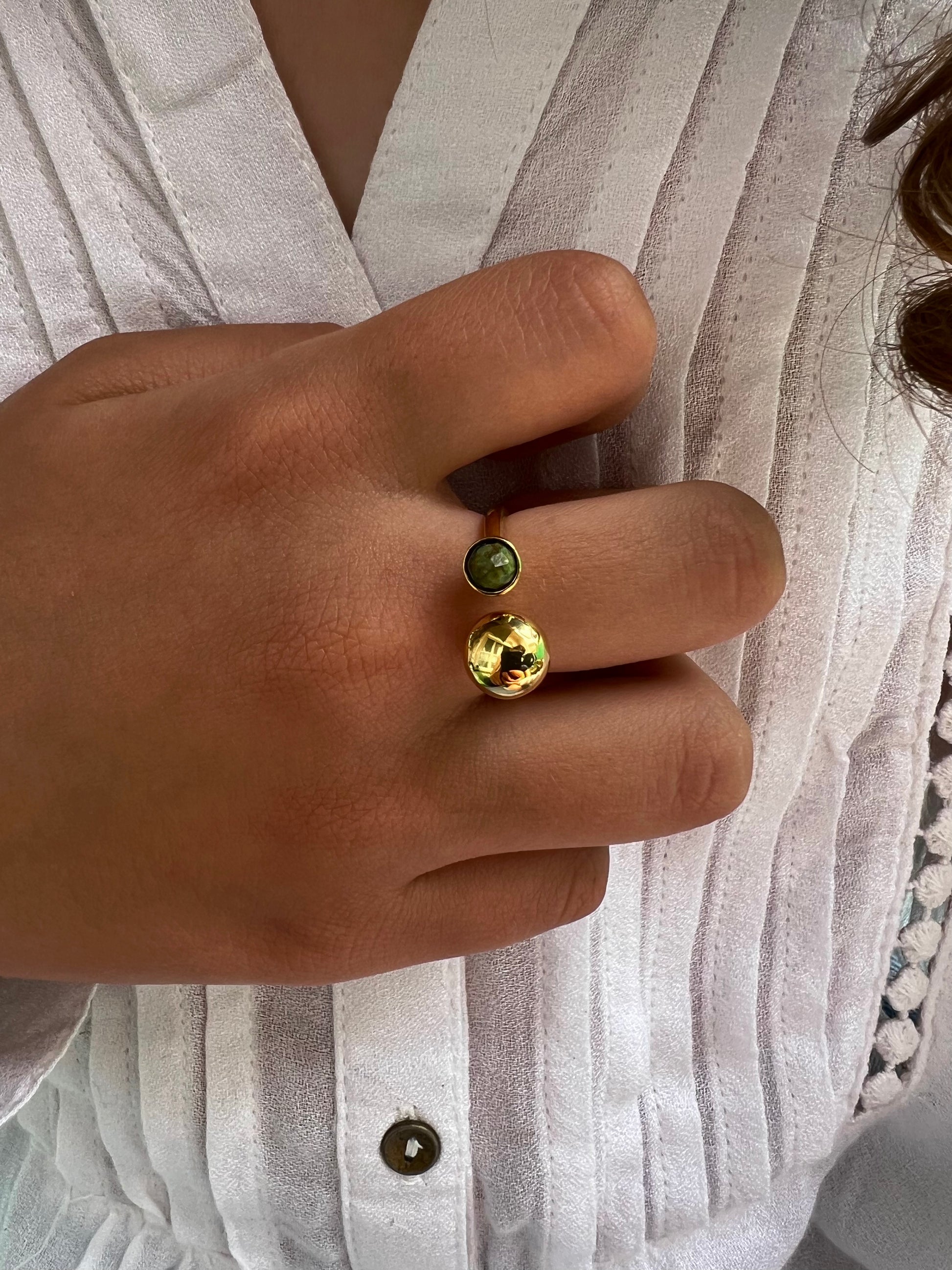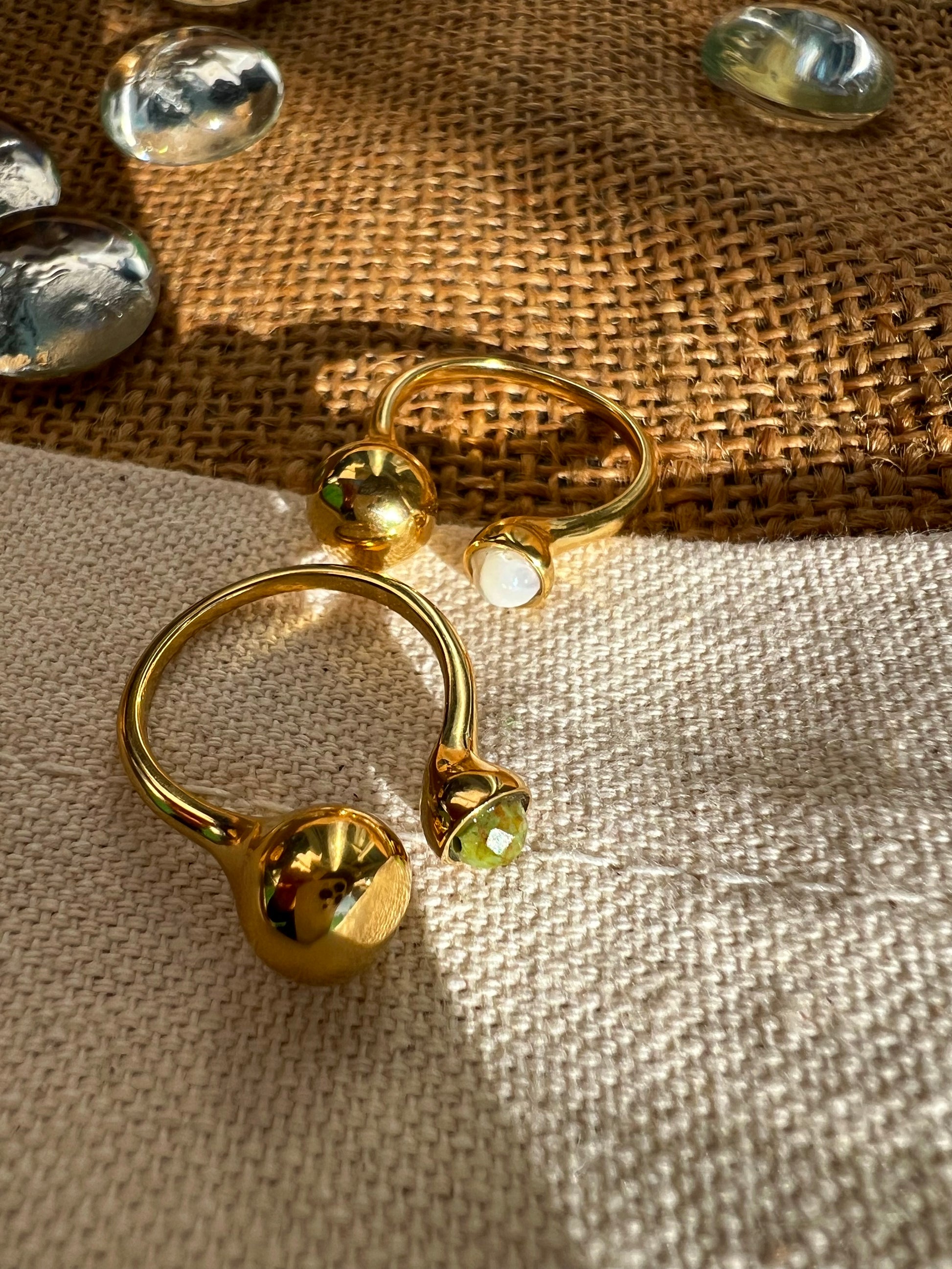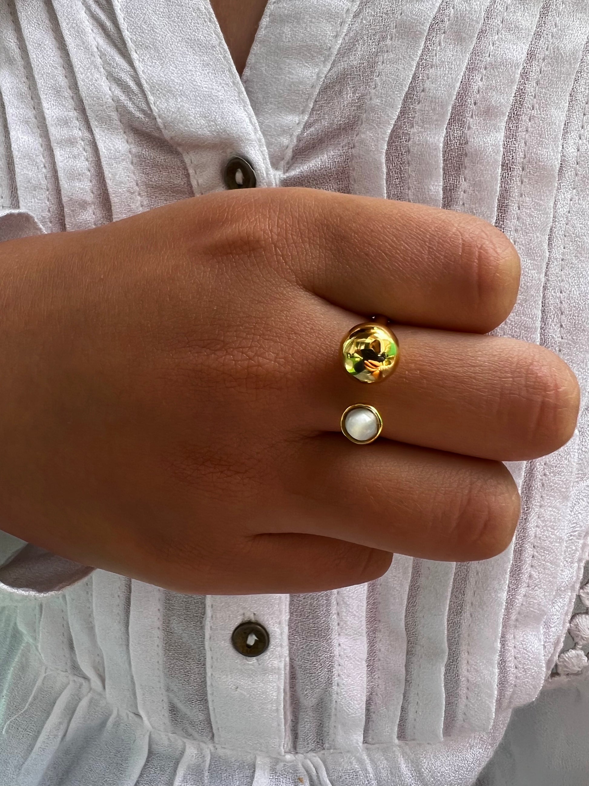 L’élégance discrète de la bague Adèle te séduira à coup sûr ! 💍 Son design ouvert est orné d'une boule lisse minimaliste d’un côté et d’une pierre naturelle ronde de l’autre. Disponible en nacre 🐚 ou turquoise africaine 🌍, elle s’ajuste facilement à tous les doigts. Fabriquée en acier inoxydable doré 💛, hypoallergénique 🚫🌸 et résistante à l’eau 💧, c’est la touche raffinée qui va avec tous tes looks.