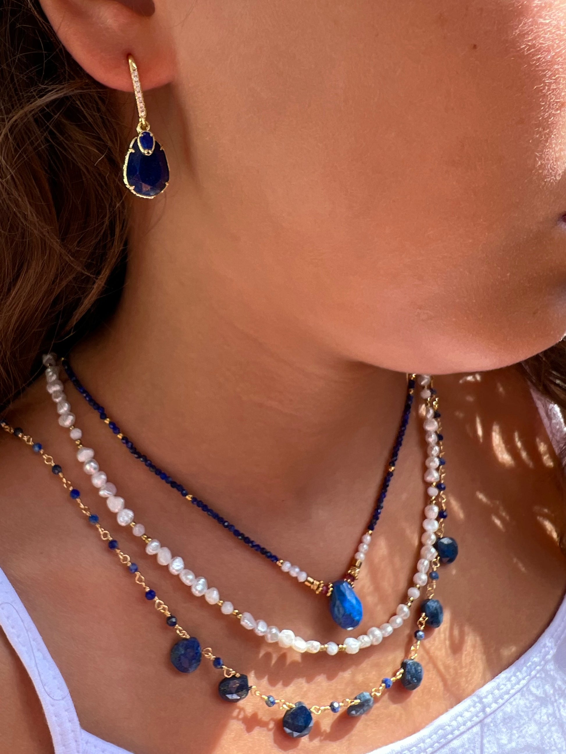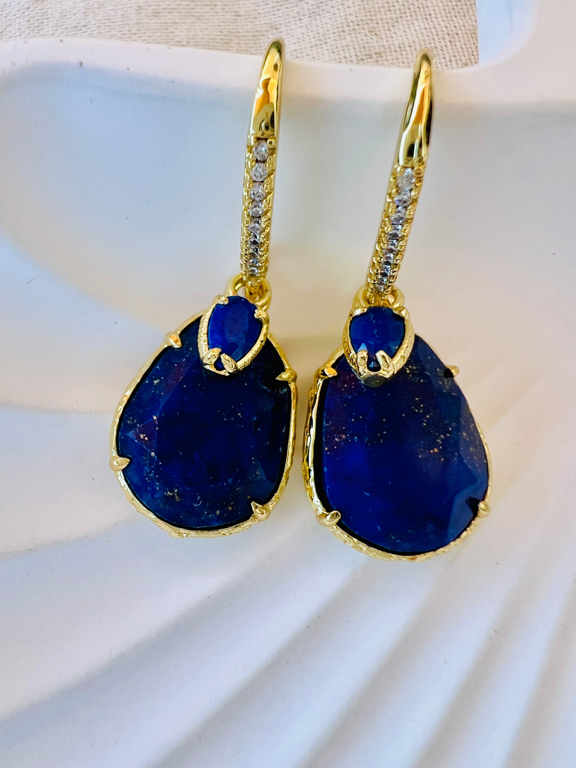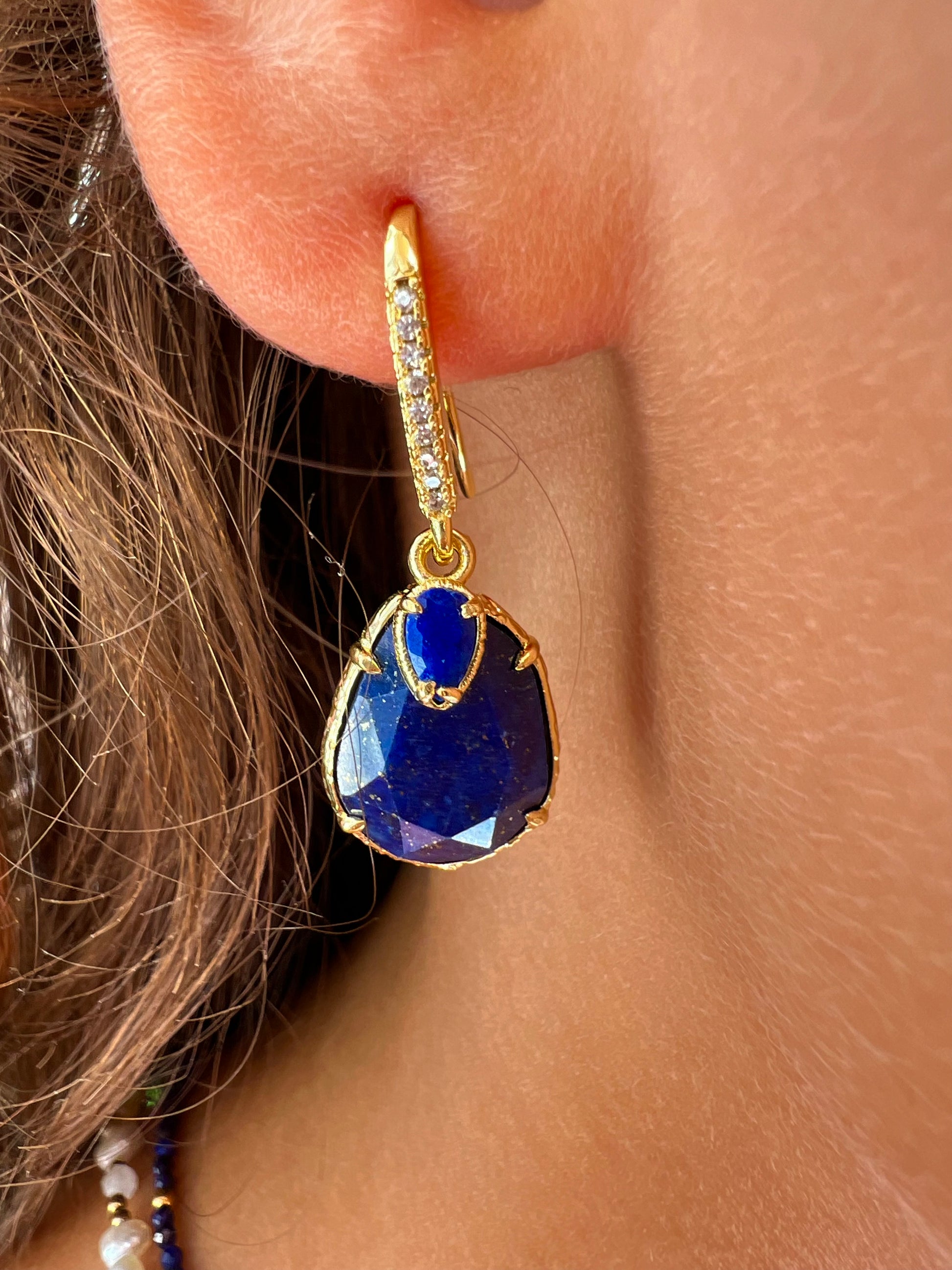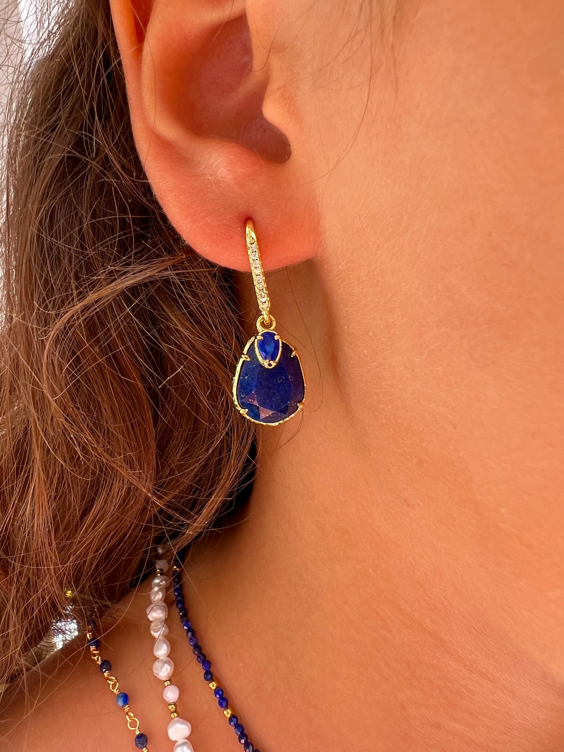 Les boucles Adélia allient chic et authenticité 💙. En laiton, elles présentent un crochet serti d’oxydes de zirconium, orné de perles ovales en lapis lazuli pour un look élégant et raffiné.