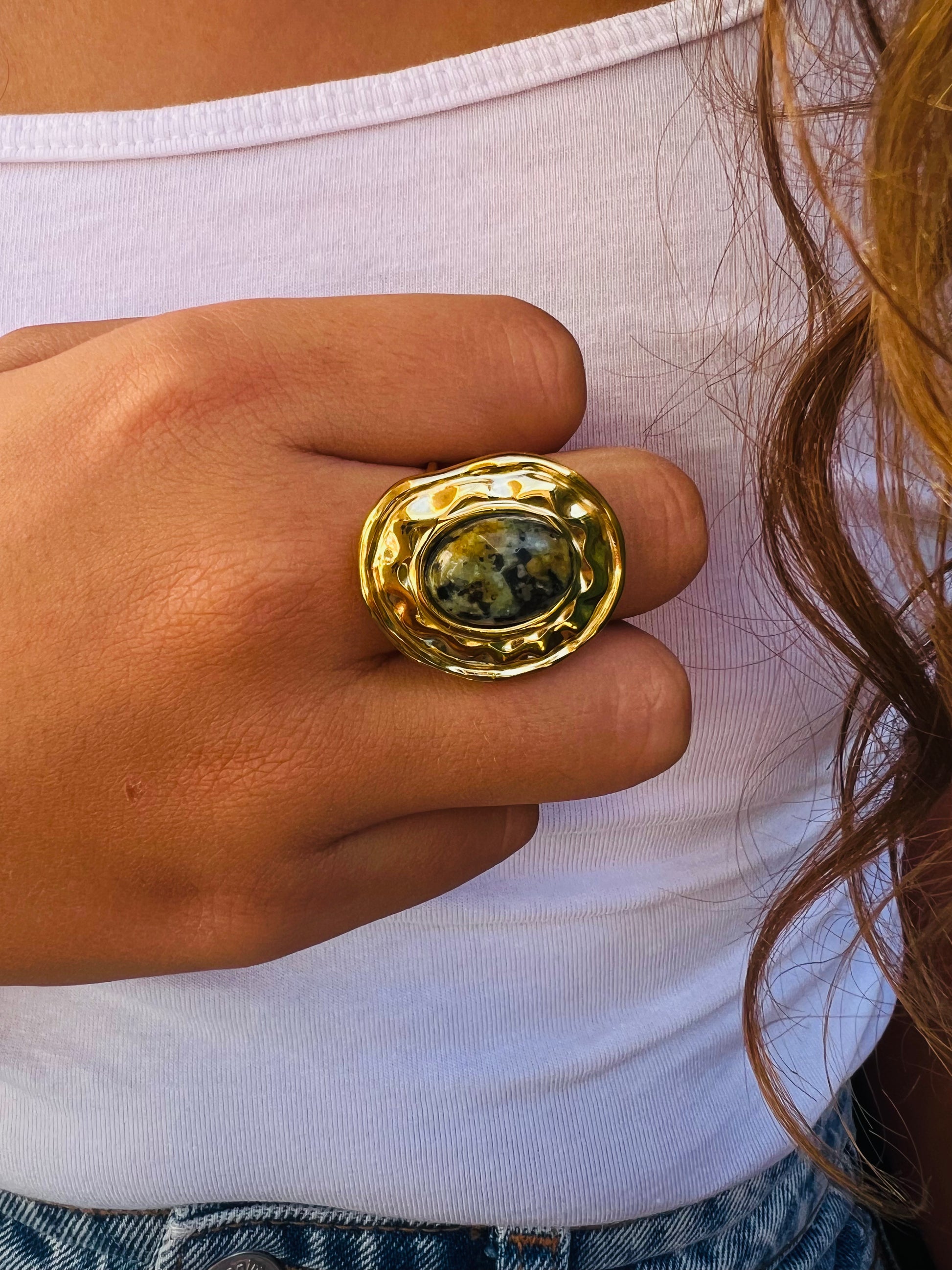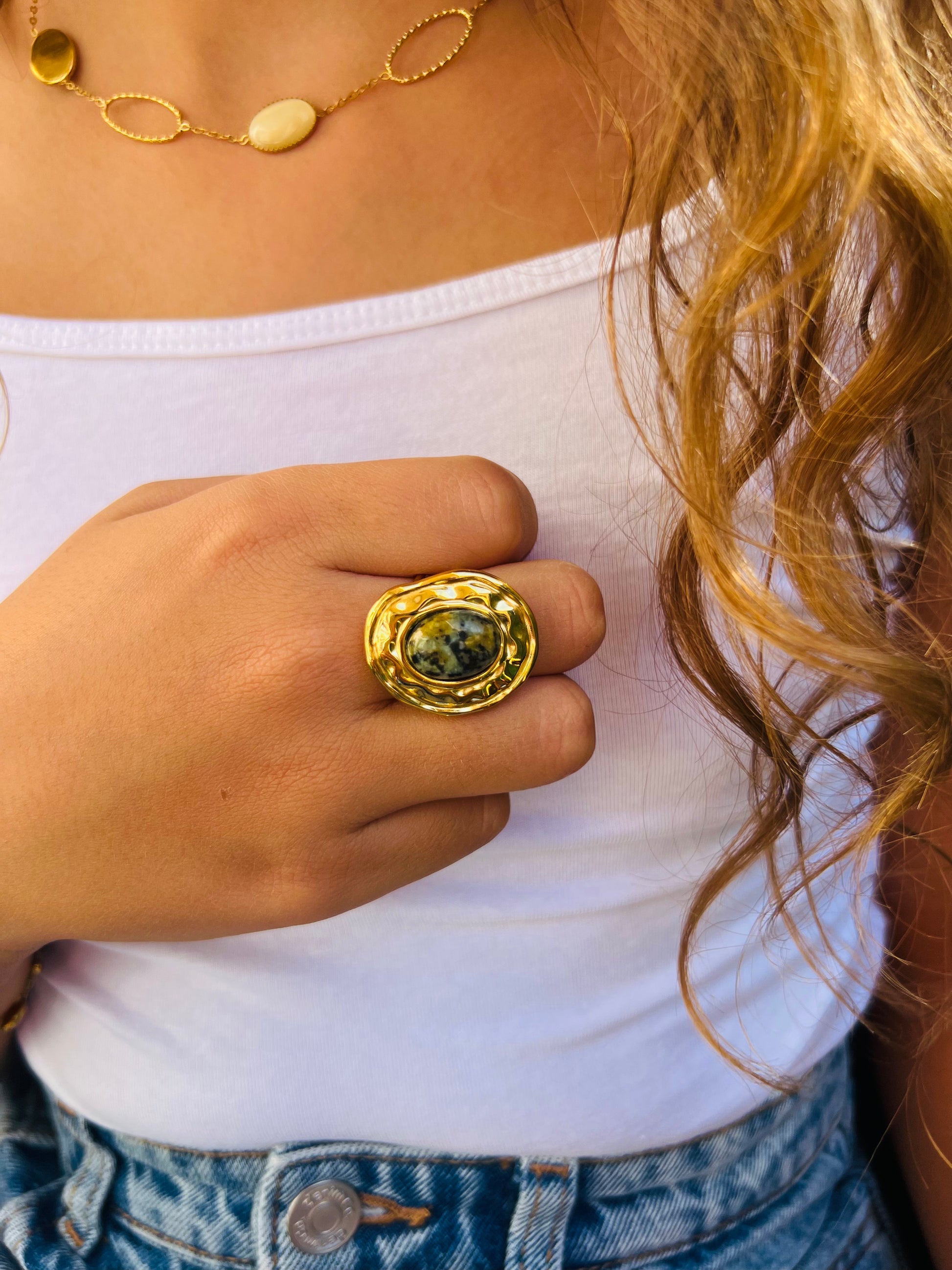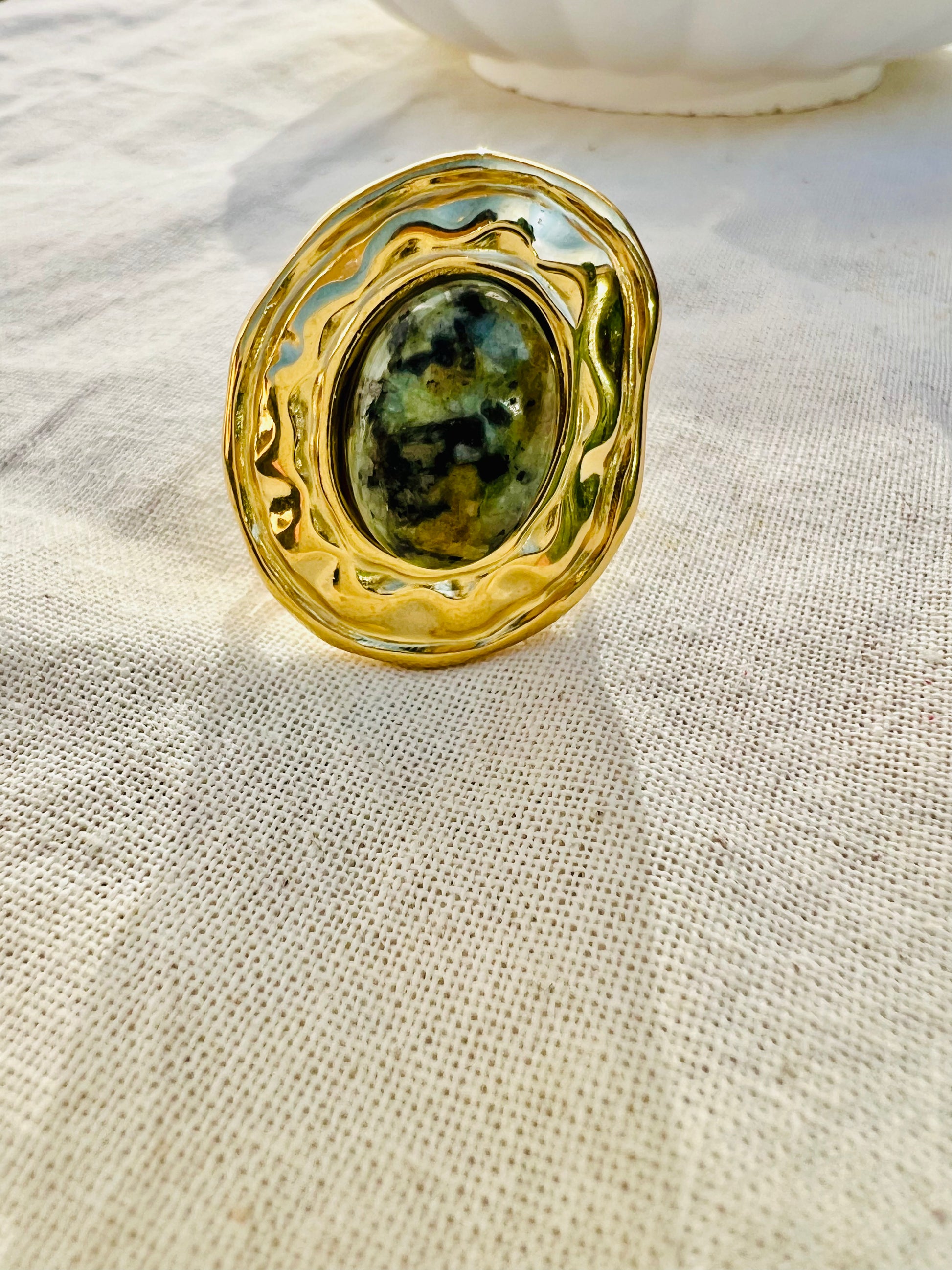 La bague Adeline met en valeur une grande pierre naturelle en turquoise africaine, entourée d’un anneau martelé en acier inoxydable. Elle existe aussi en boucles assorties pour une parure éclatante 💙.