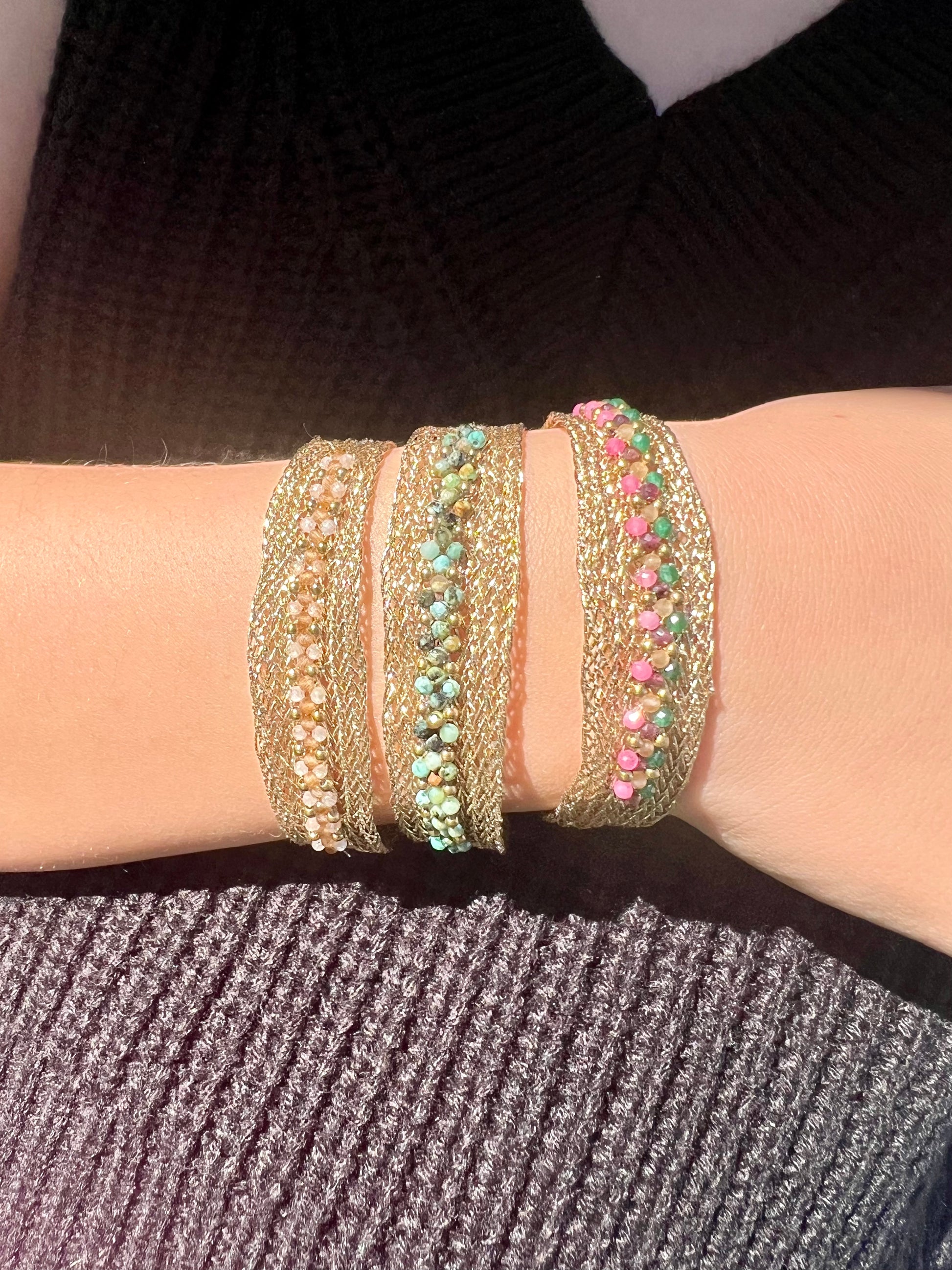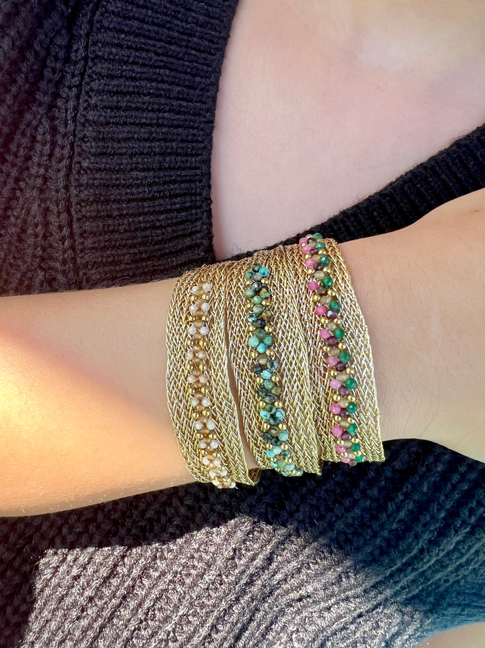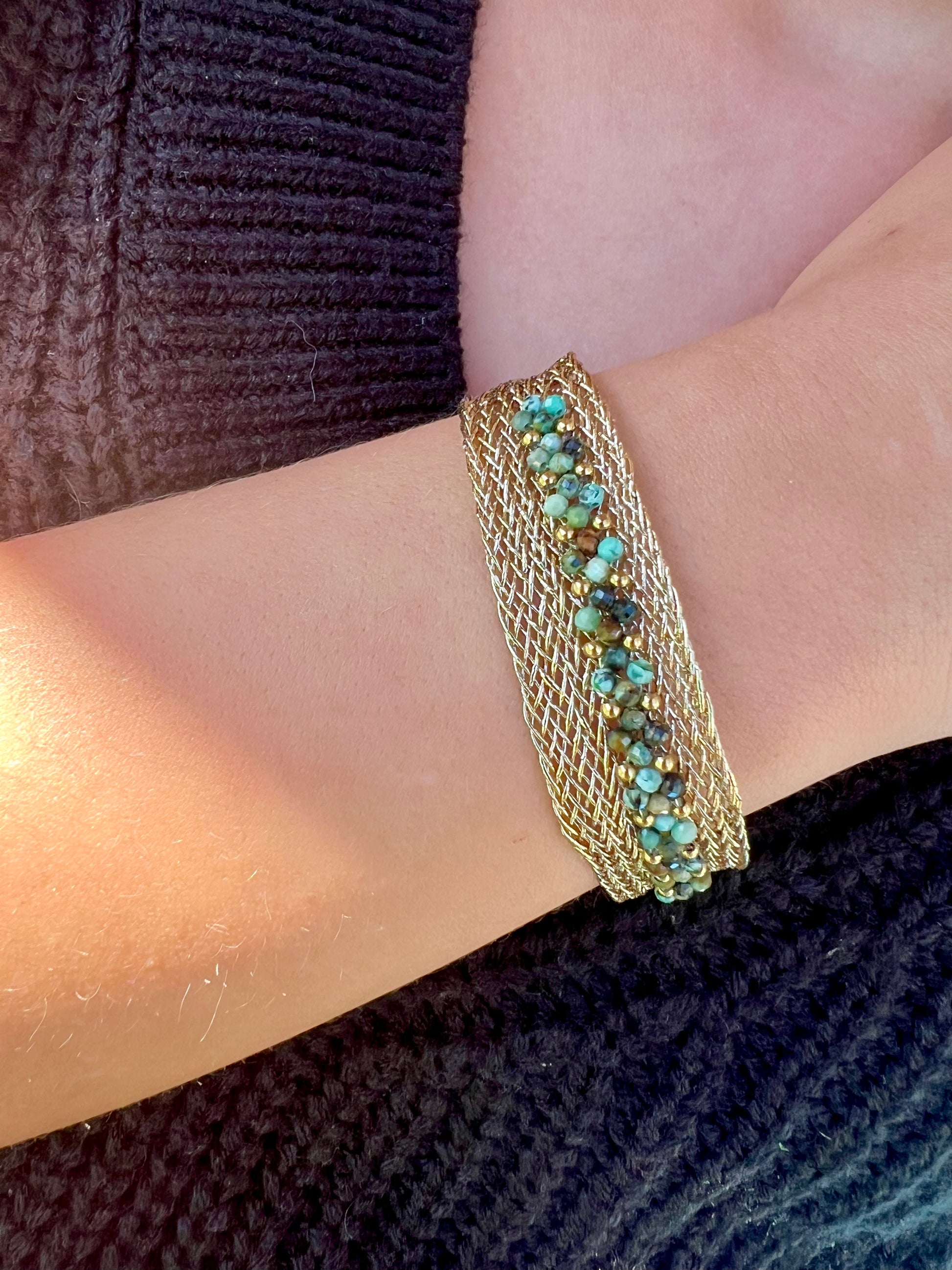 ✧ Bracelet doré en lurex et acier inoxydable serti de turquoise africaine ou d'oxyde de zirconium.
