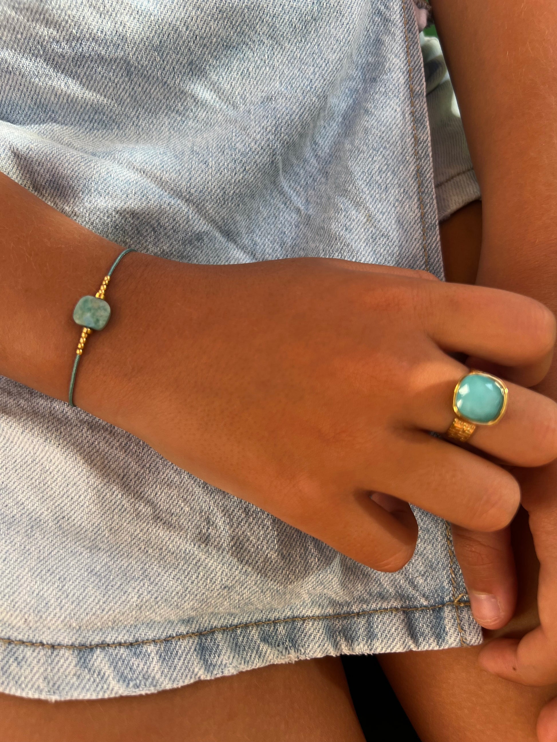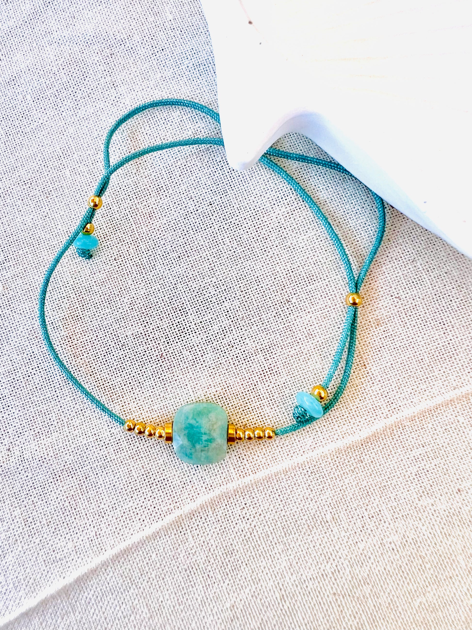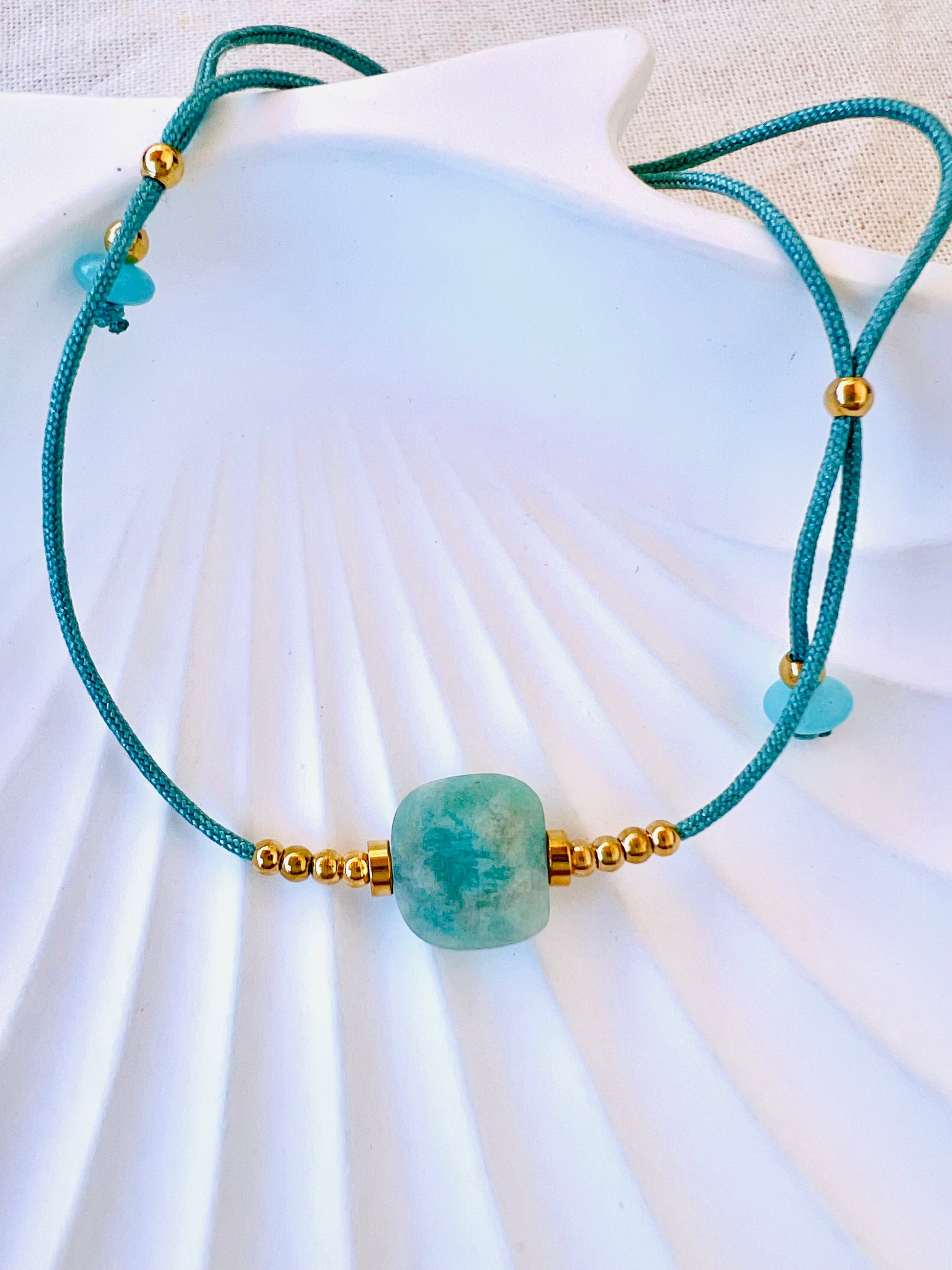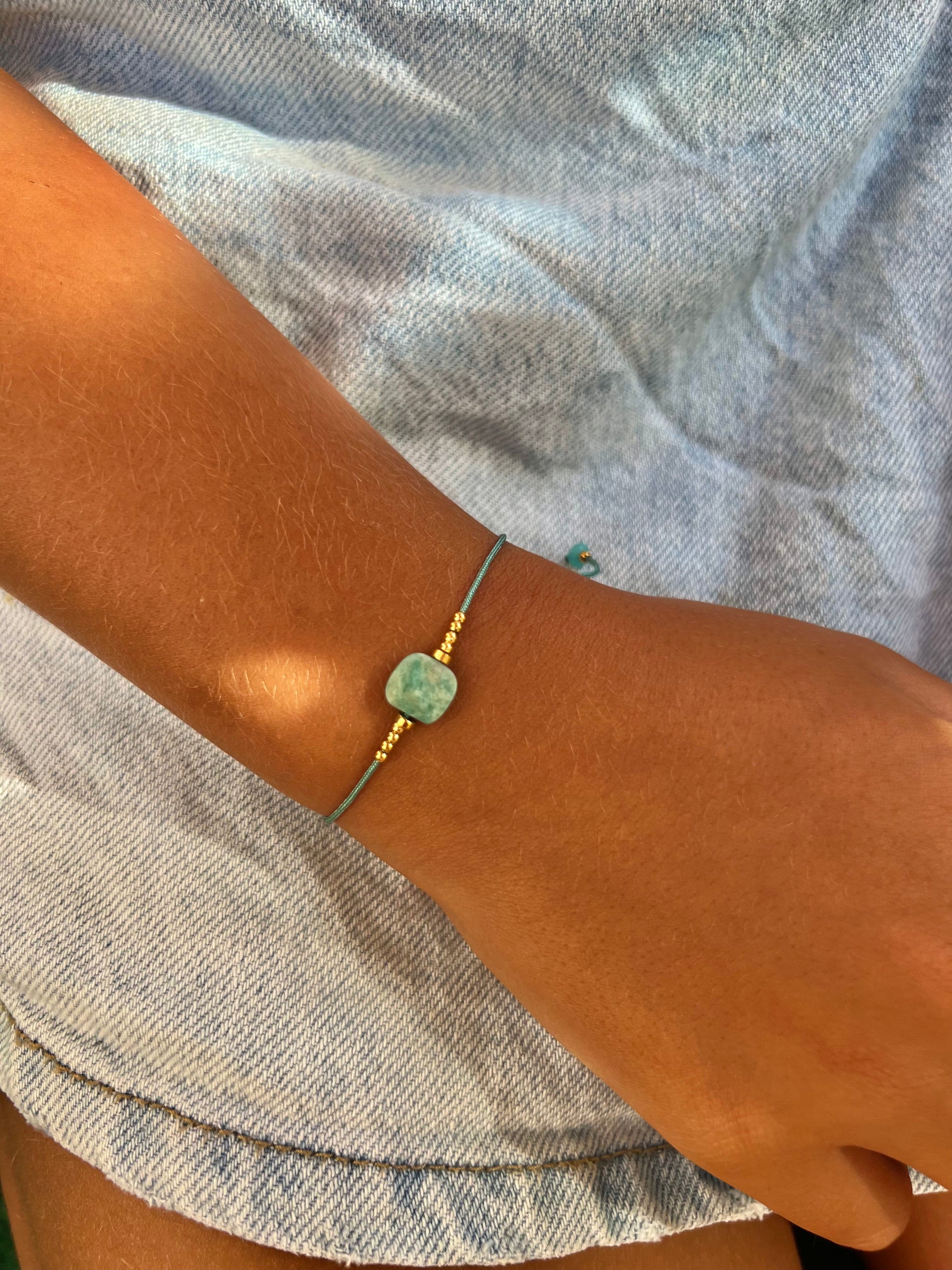 Le bracelet Amaris allie finesse et élégance 🌿. Monté sur un fil ajustable en acier inoxydable, il met en valeur une pierre carrée en amazonite, idéale pour une touche délicate et protectrice au poignet.