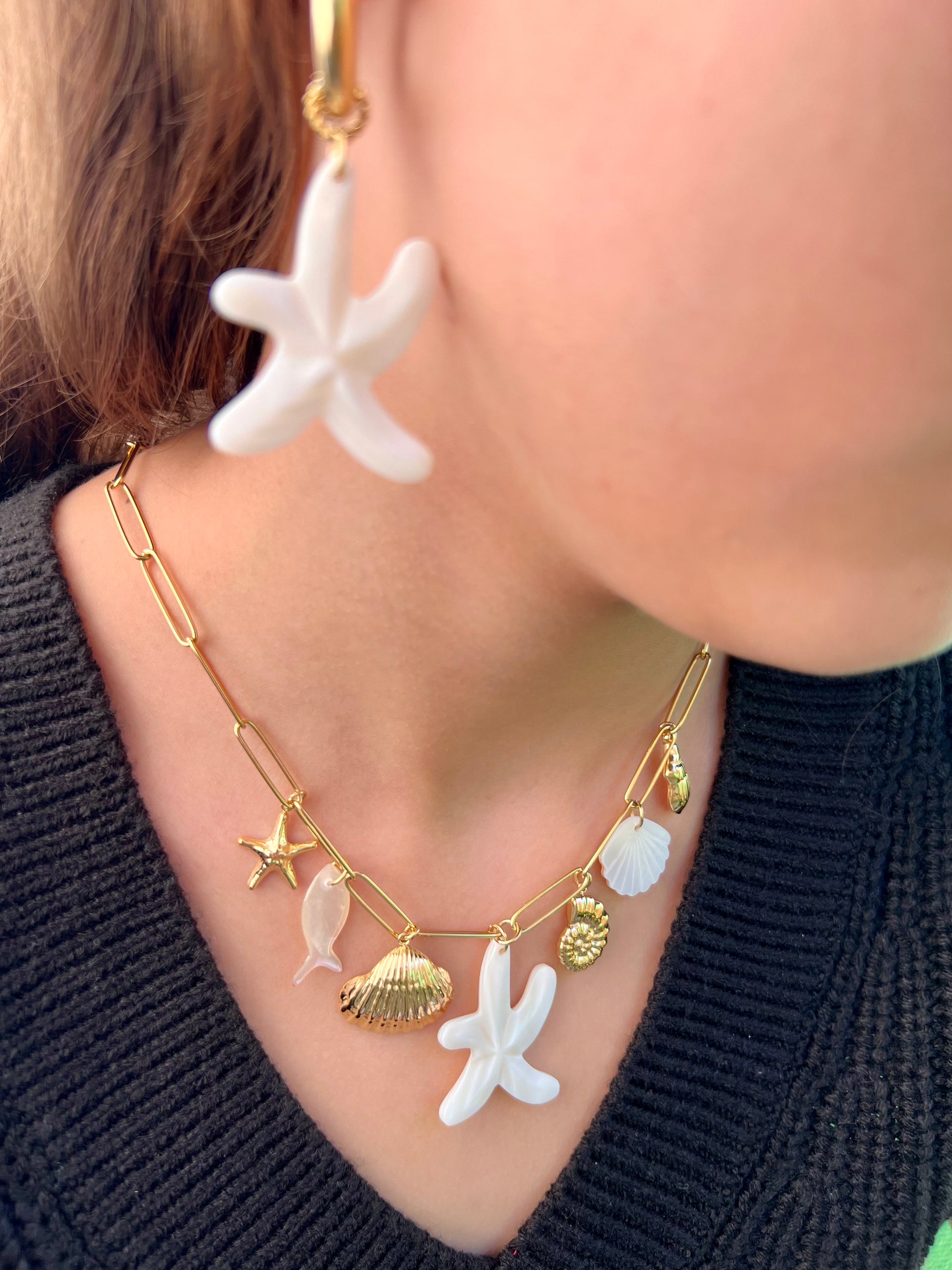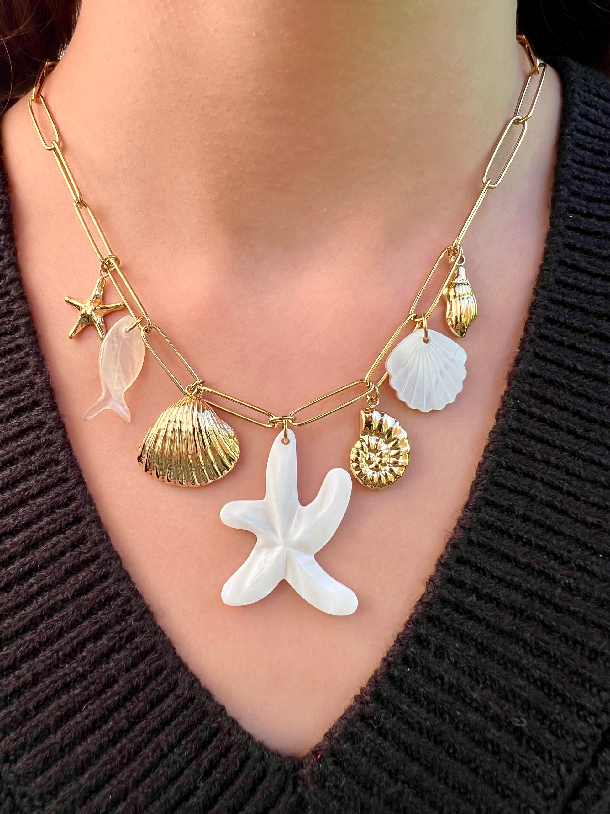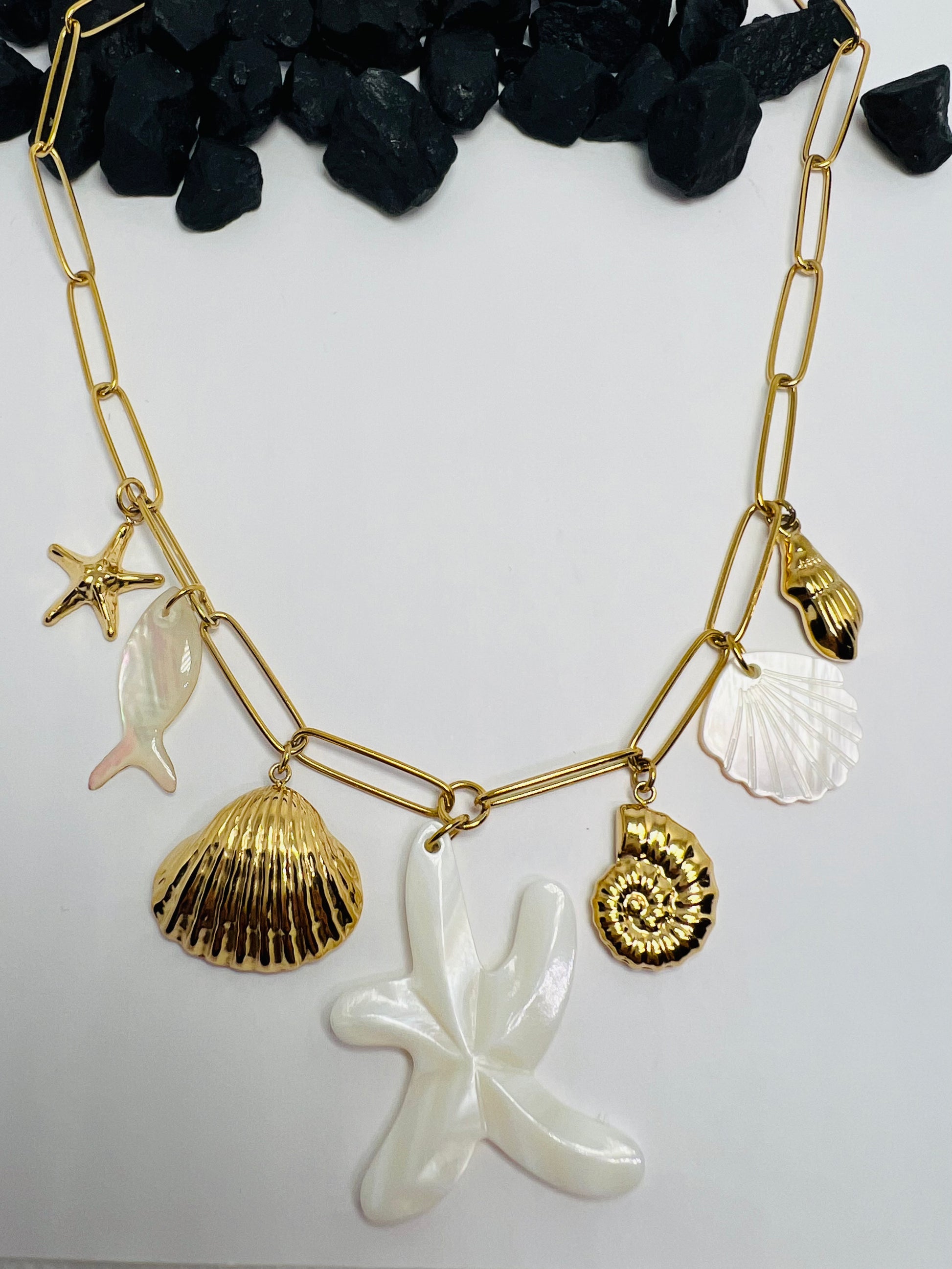 ✧ Collier doré en acier inoxydable, breloques marins (étoiles de mer, poisson en acétate et coquillages) et pierres naturelles: nacre blanche.