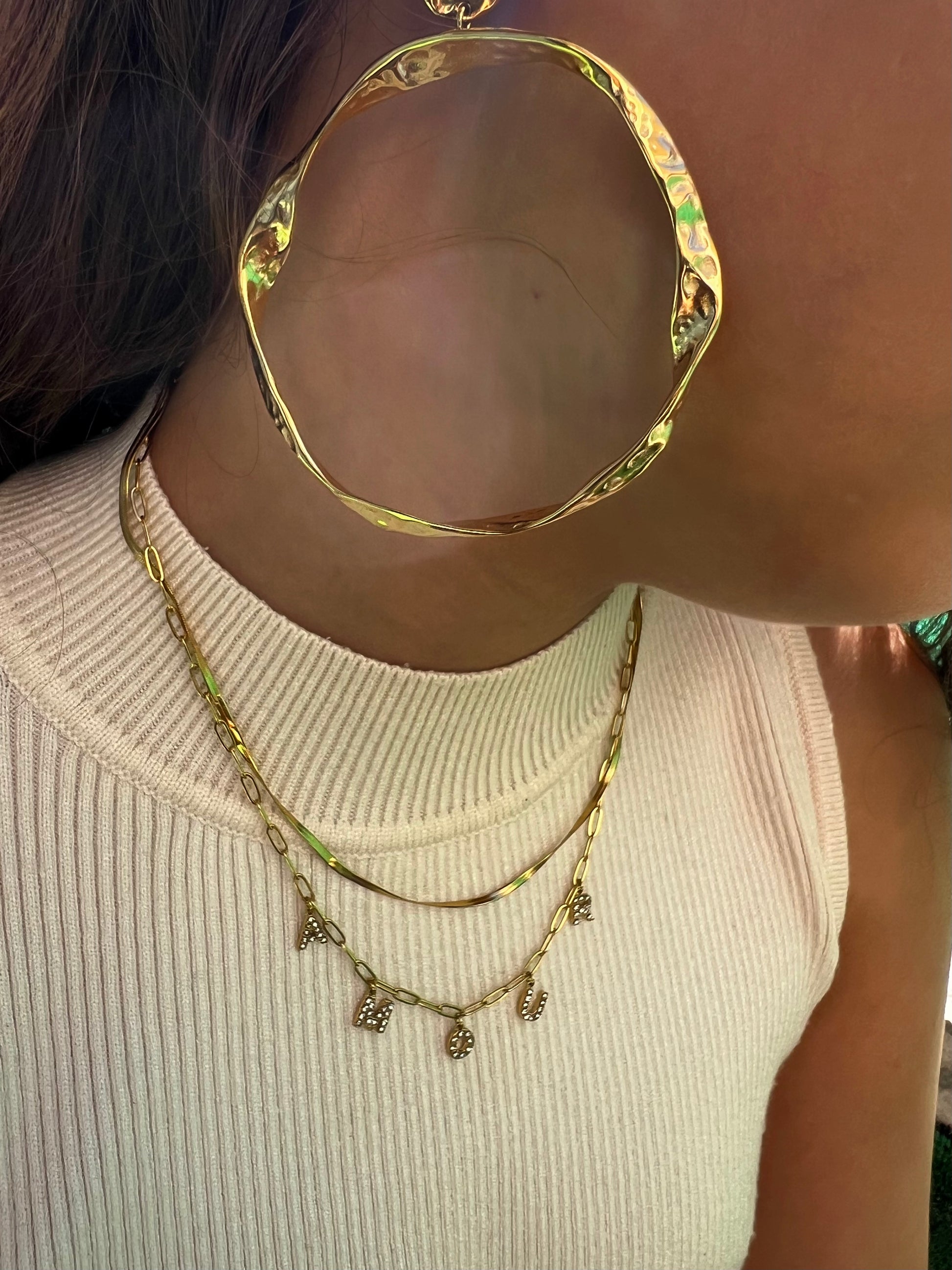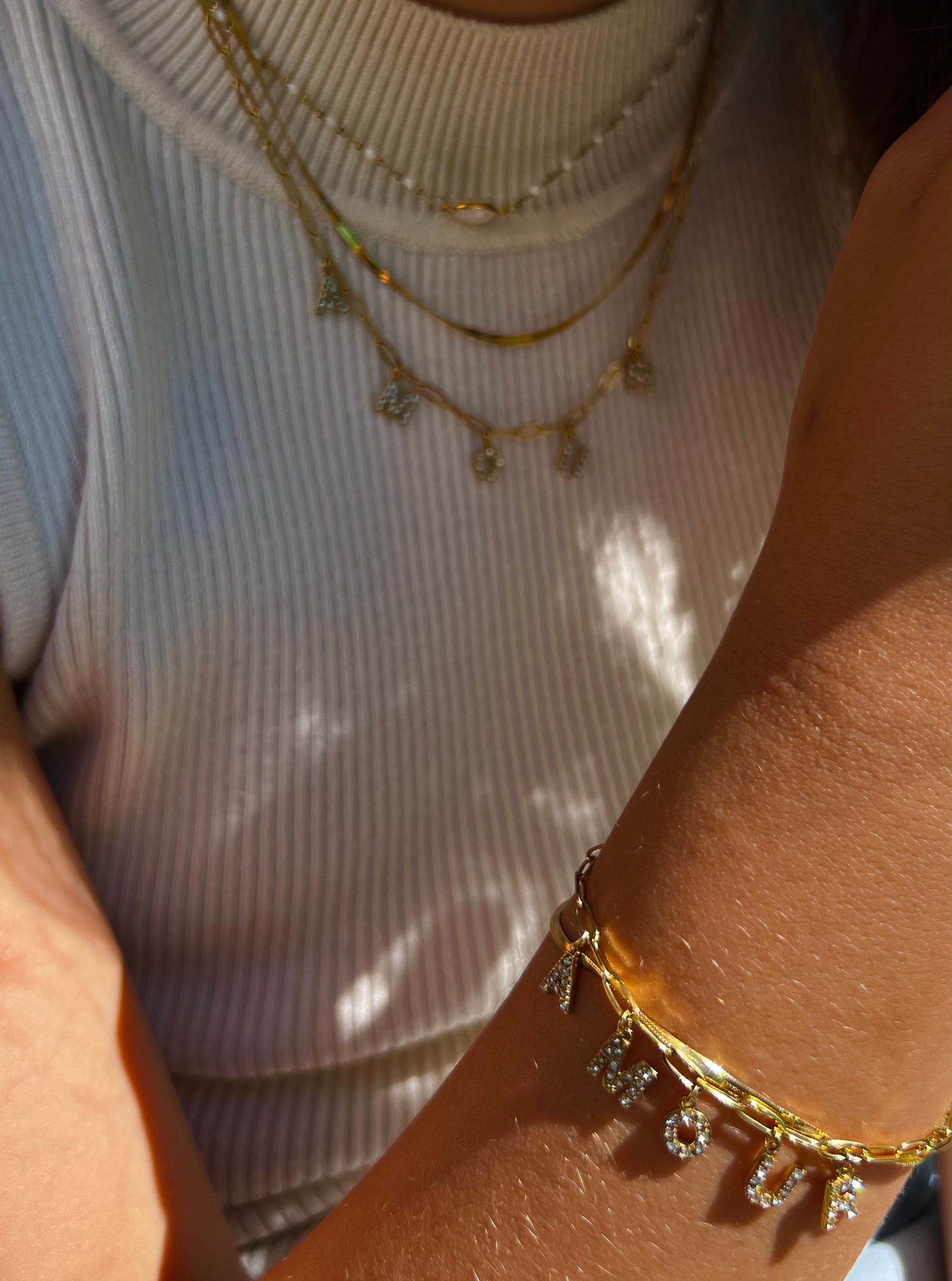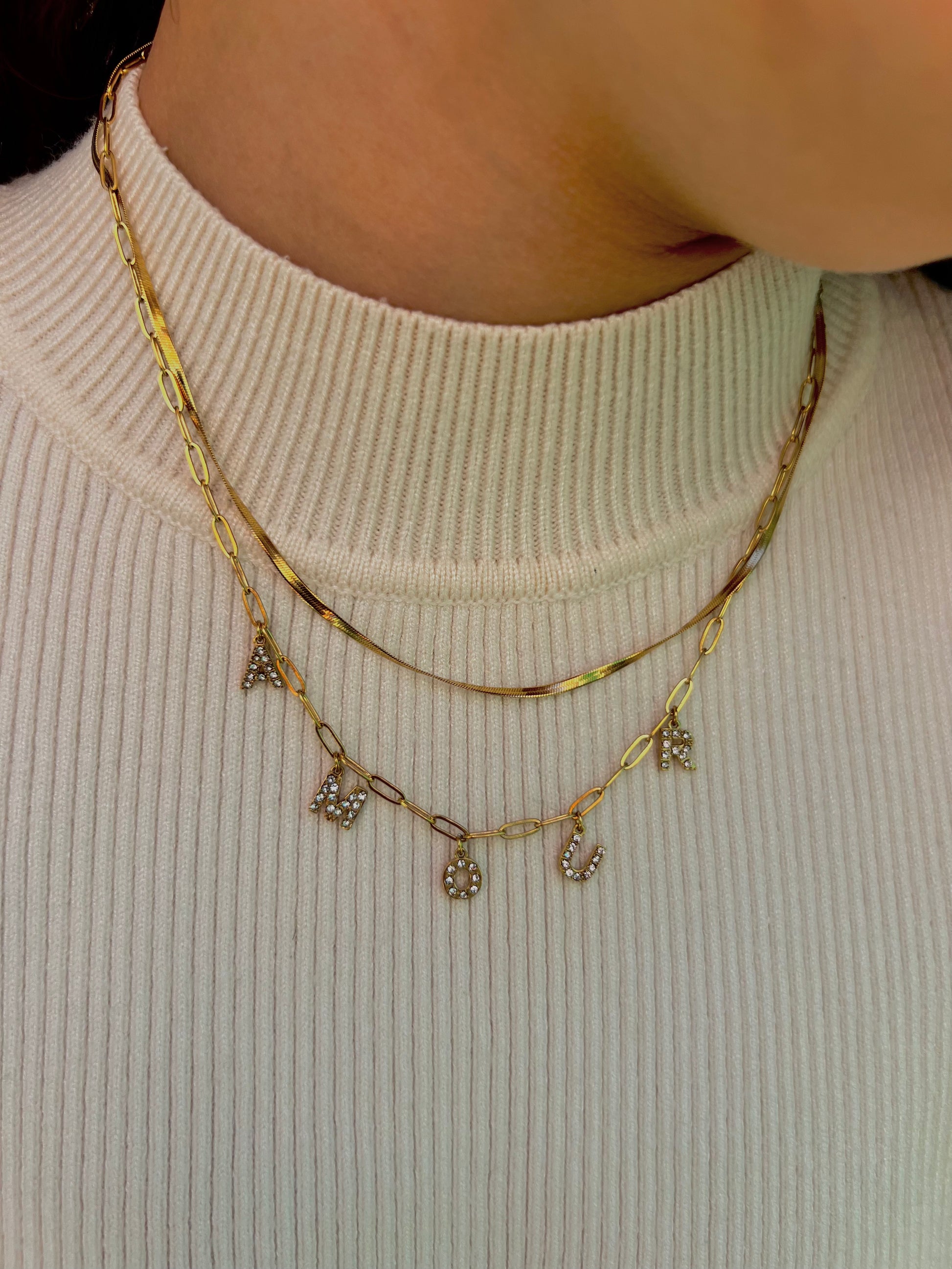 Ce bijou à deux rangs associe une maille miroir délicate à une chaîne aux anneaux ovales, ornée des lettres "AMOUR", chacune sertie d'oxydes de zirconium pour une touche lumineuse💫