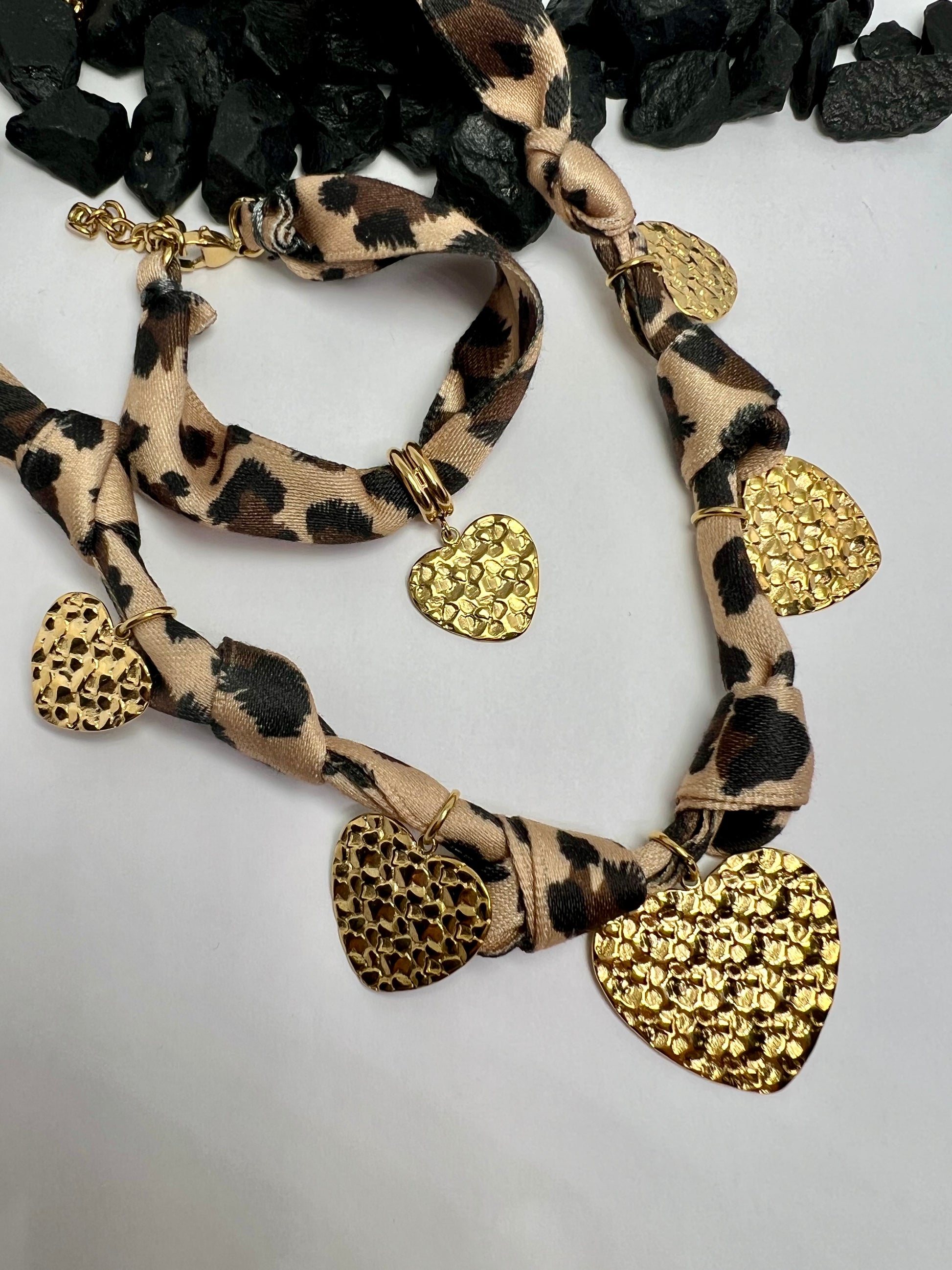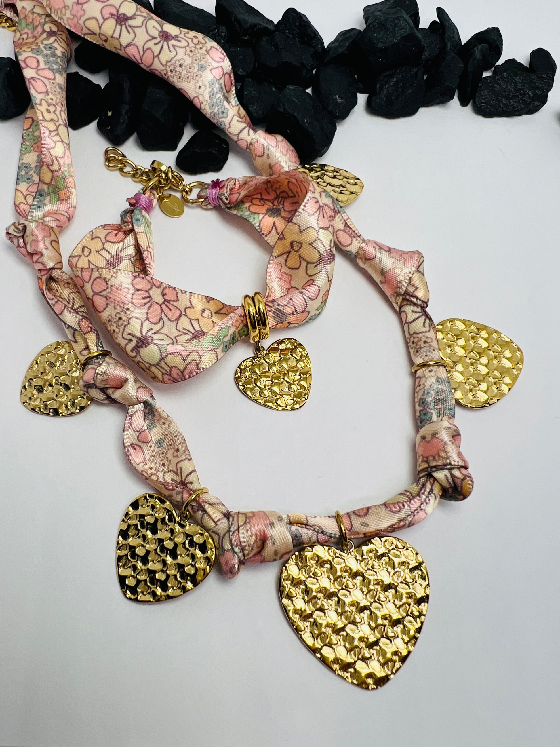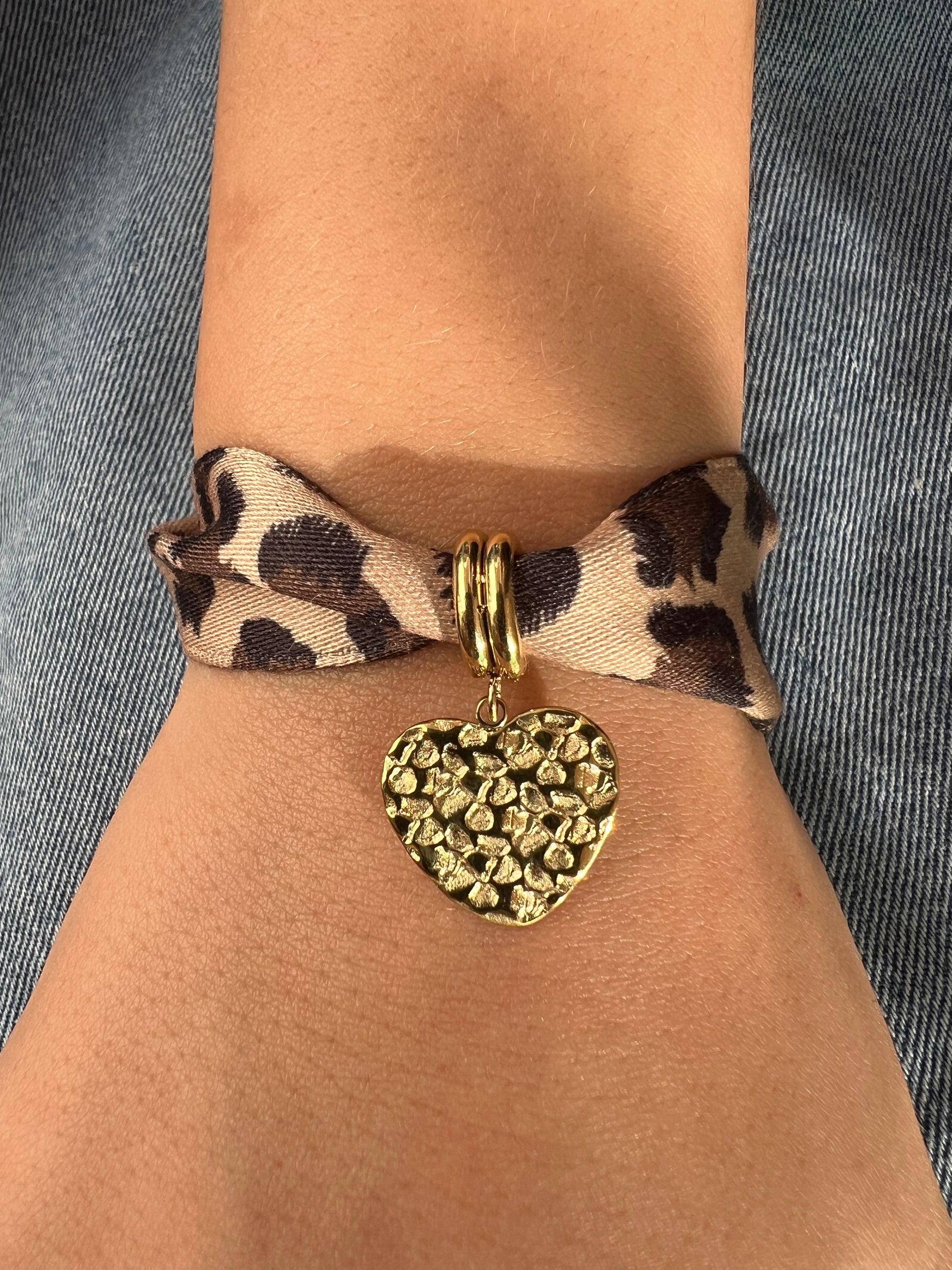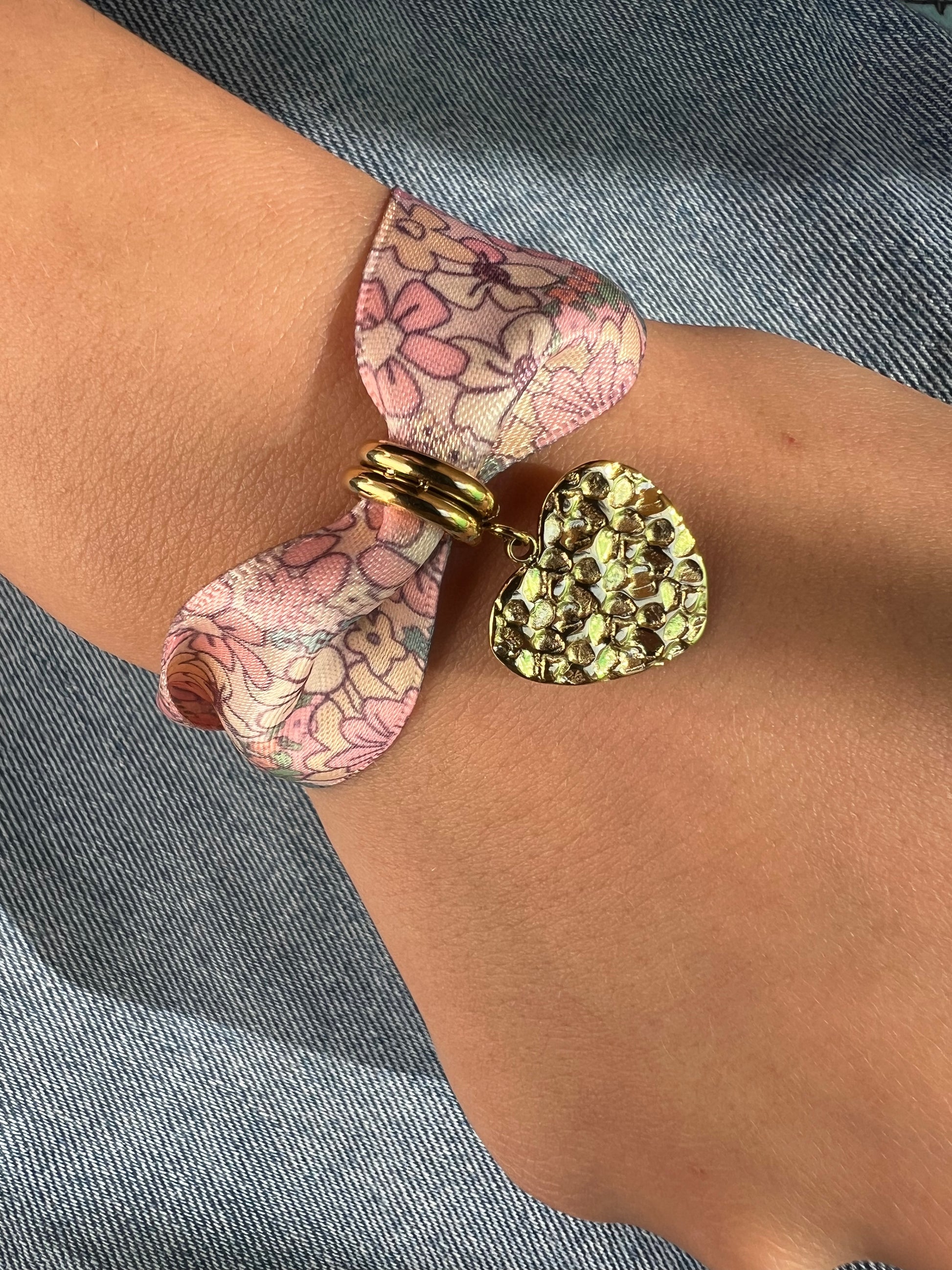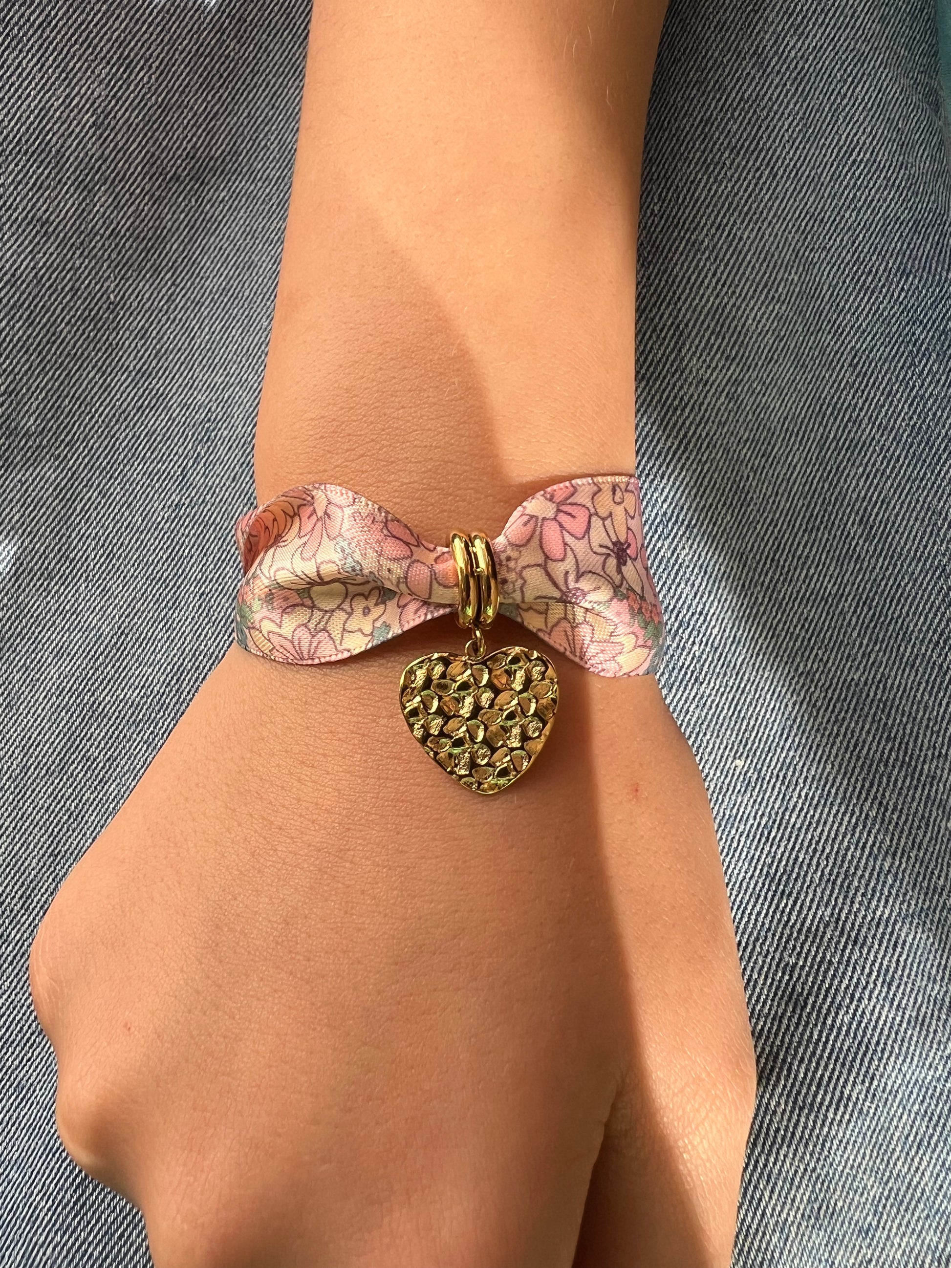 ✧ Bracelet composé d'un tissu aux motifs uniques et d'une pampille en forme de coeur texturé en acier inoxydable.
