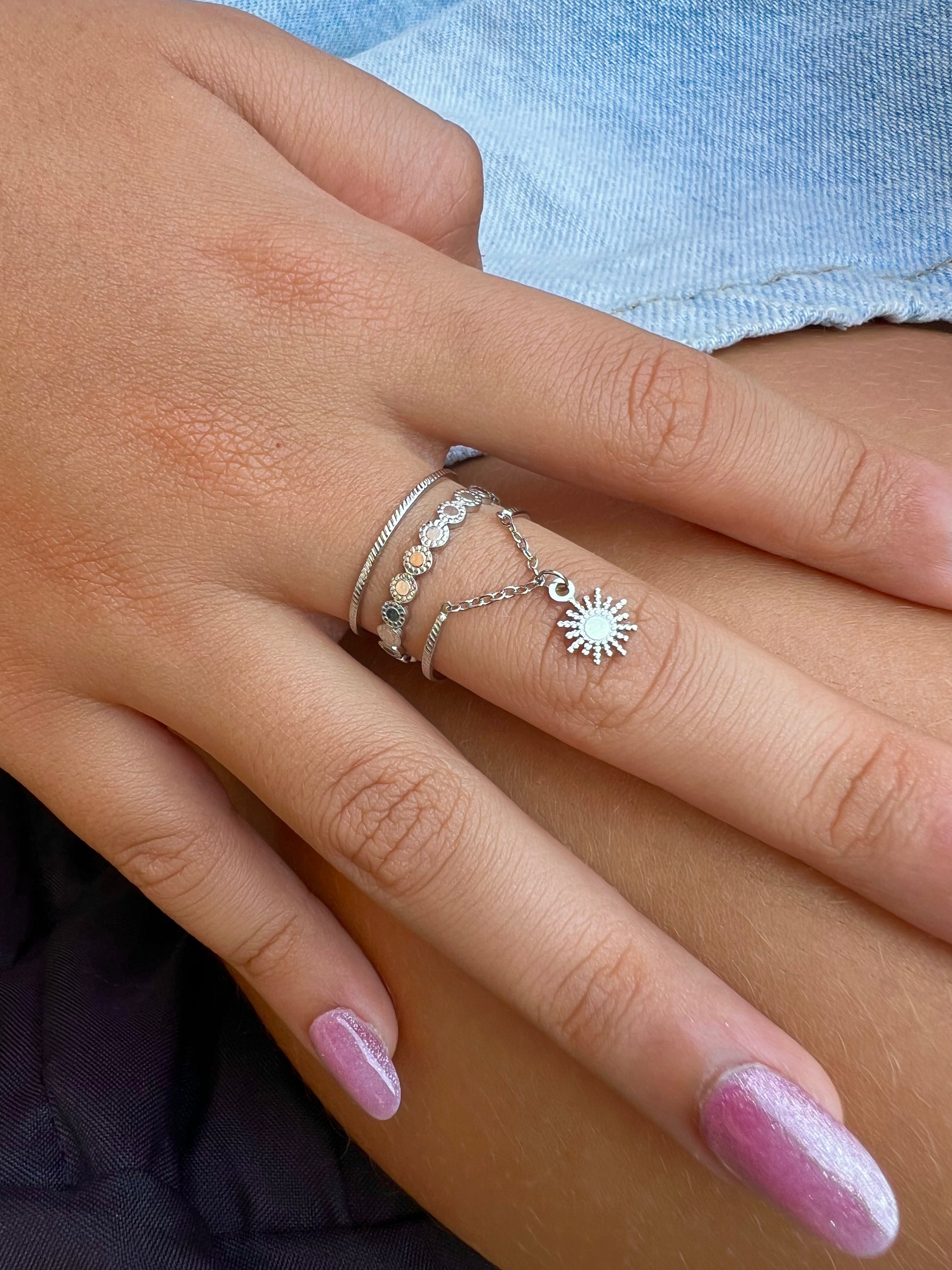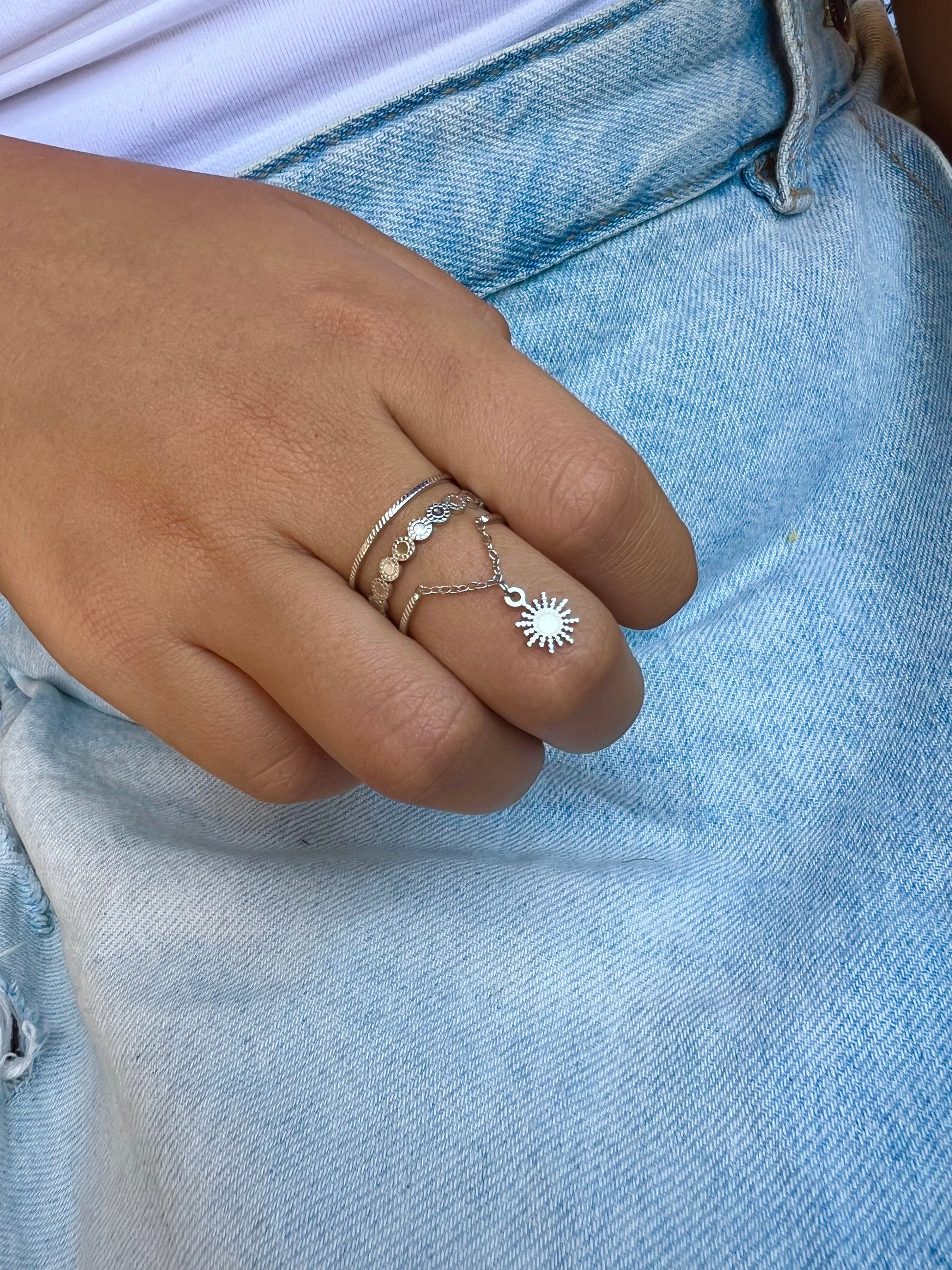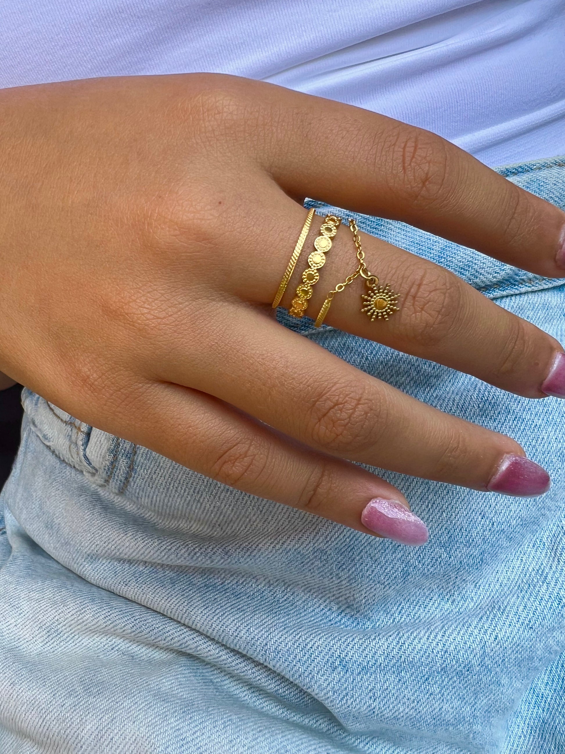 Faites rayonner votre style avec la bague Capri 🌞, une création audacieuse à trois rangs en acier, rehaussée d’une chaîne délicate et d’une breloque soleil dorée ou argentée. Son design structuré et lumineux en fait une pièce forte, parfaite en accumulation ou seule.