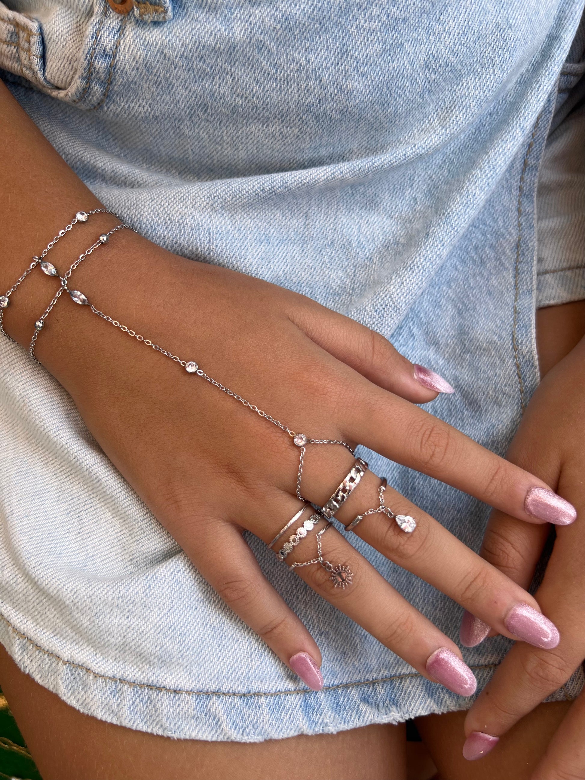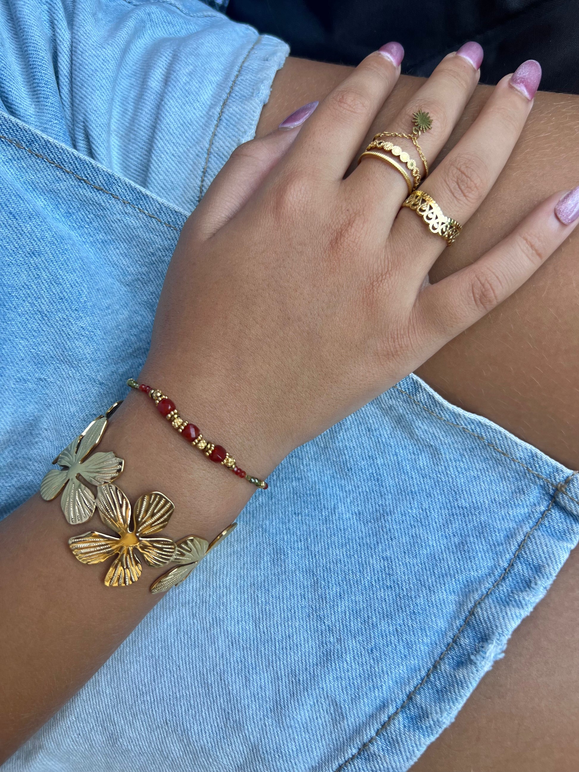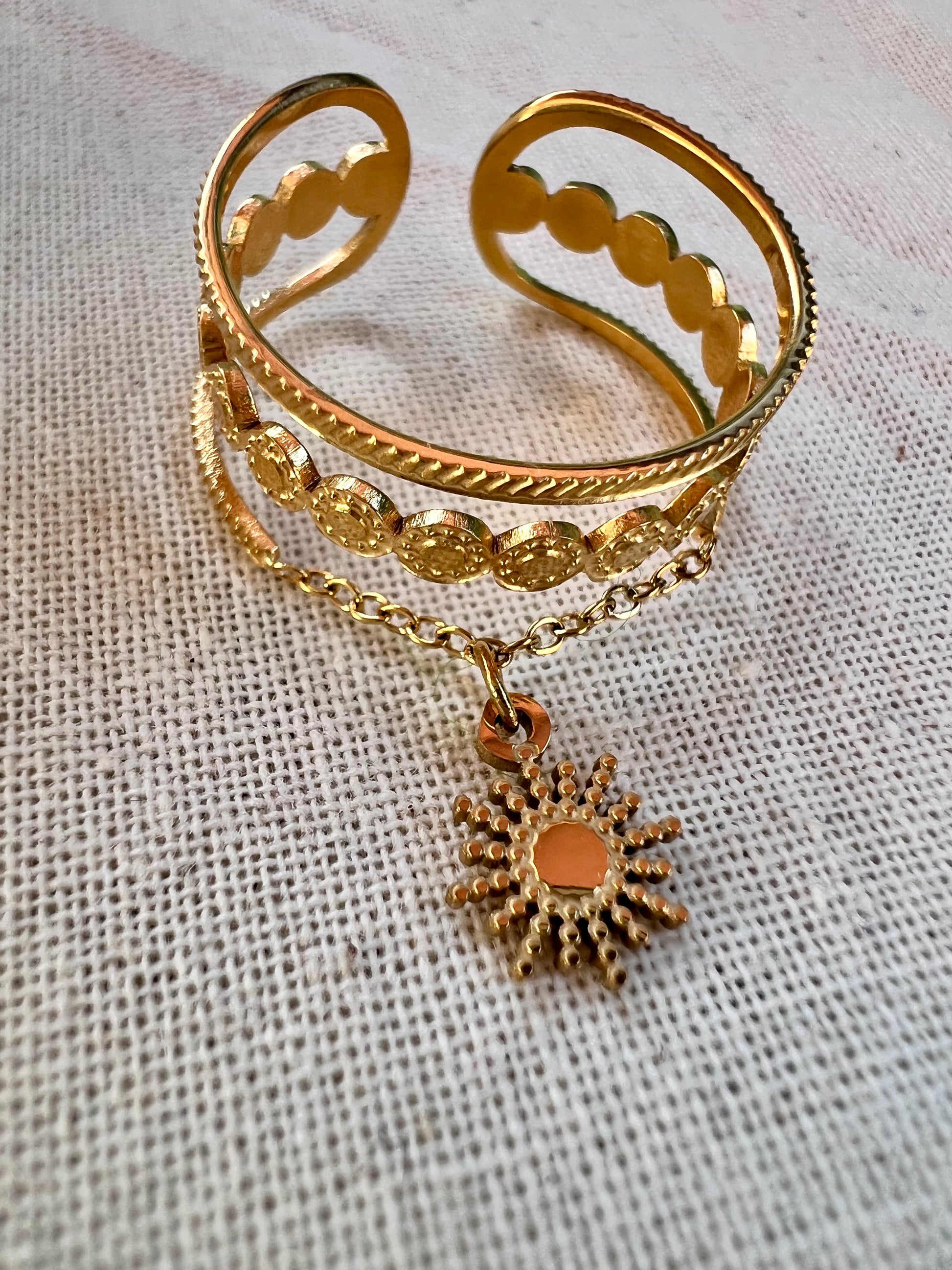 Faites rayonner votre style avec la bague Capri 🌞, une création audacieuse à trois rangs en acier, rehaussée d’une chaîne délicate et d’une breloque soleil dorée ou argentée. Son design structuré et lumineux en fait une pièce forte, parfaite en accumulation ou seule.