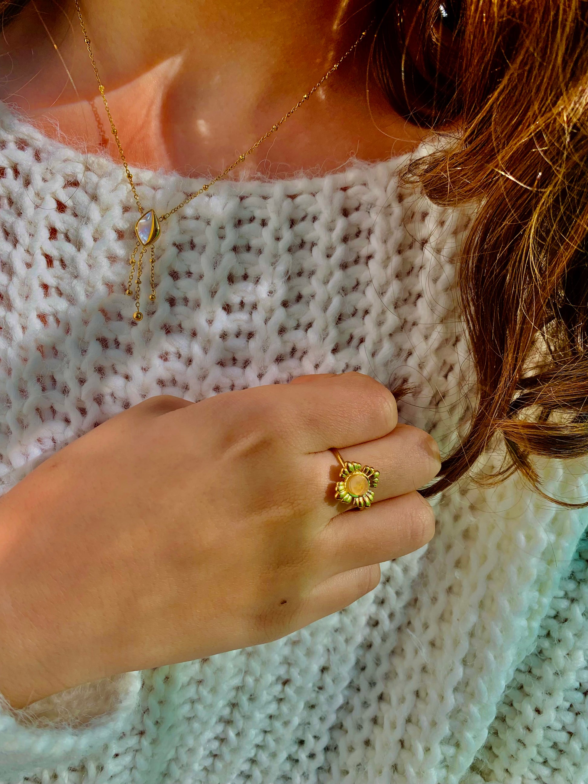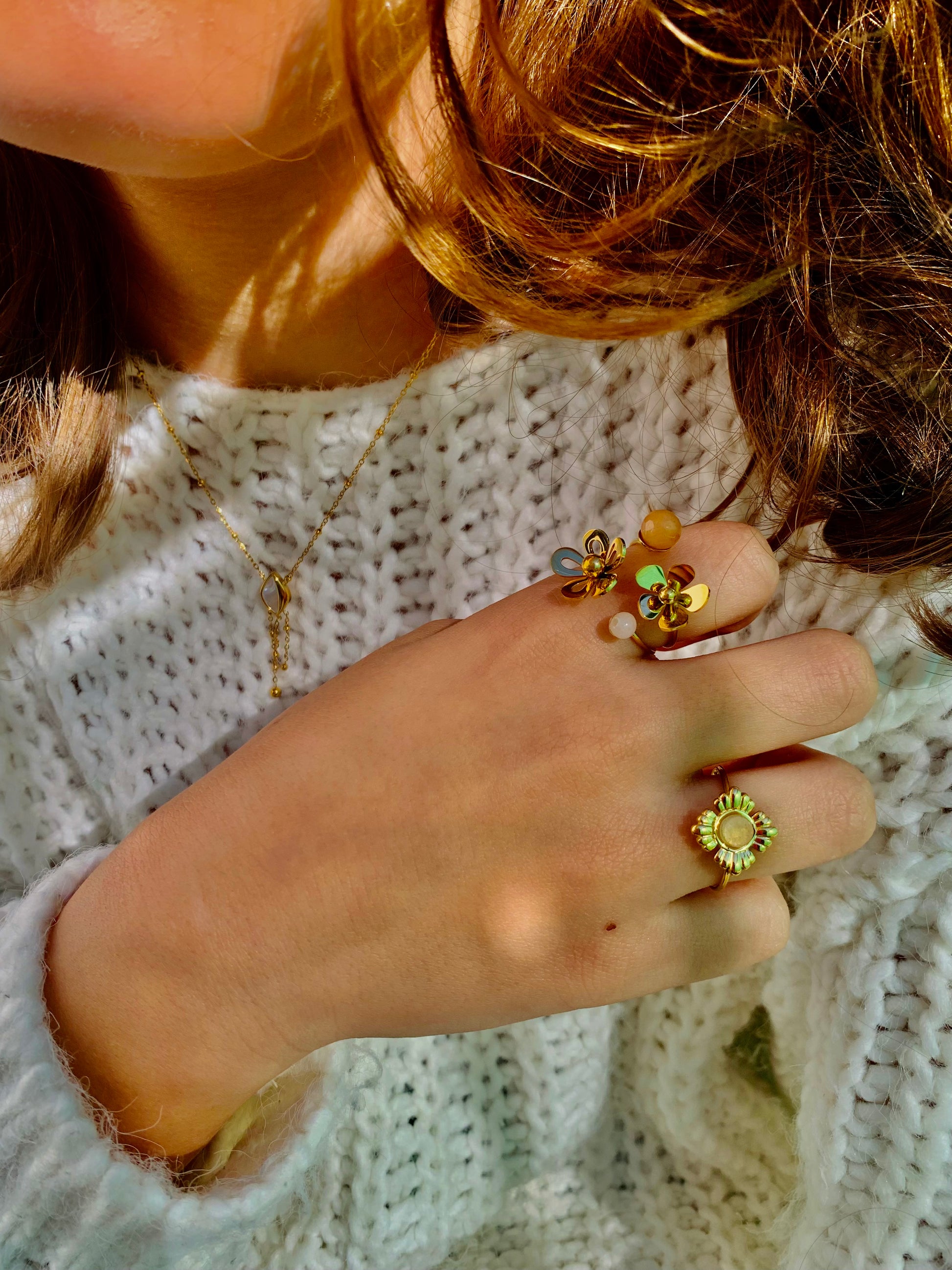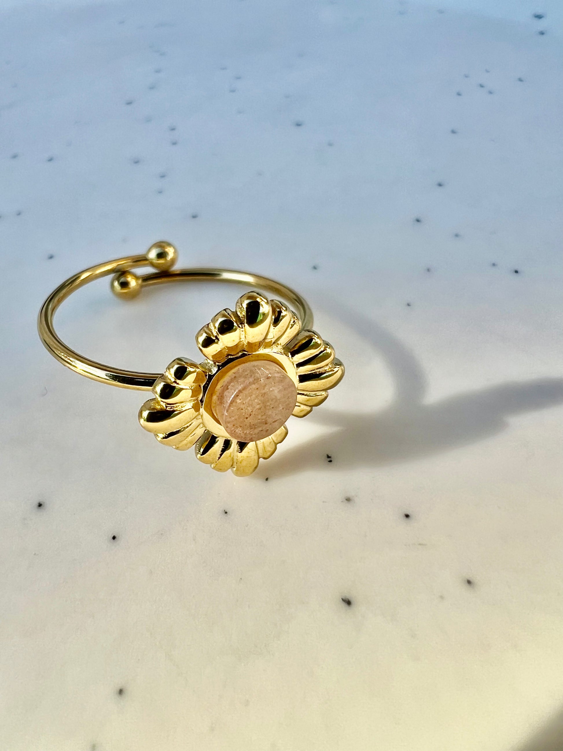 ✧ Bague dorée en acier inoxydable et pierre de soleil.