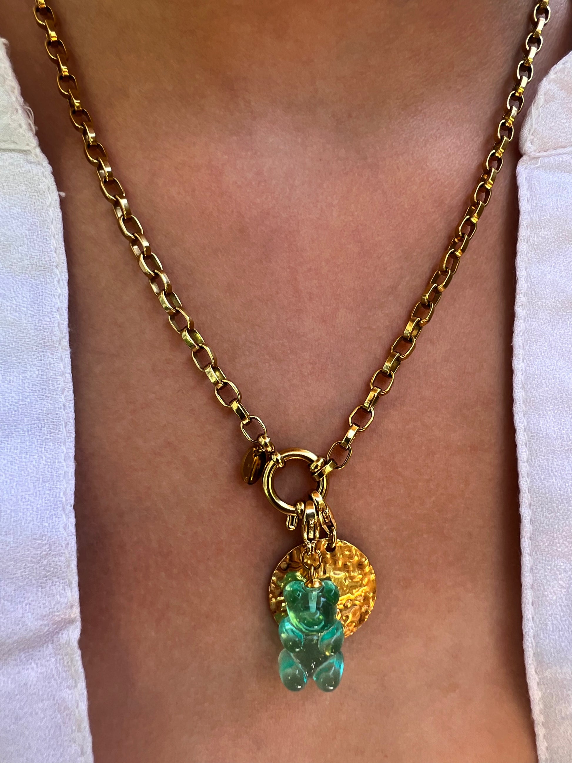 Le charm PAMPILLE en acier inoxydable représentant une pièce ronde au fini martelé, à accrocher à vos chaînes, bracelets ou créoles pour une touche dorée au style antique ✨.