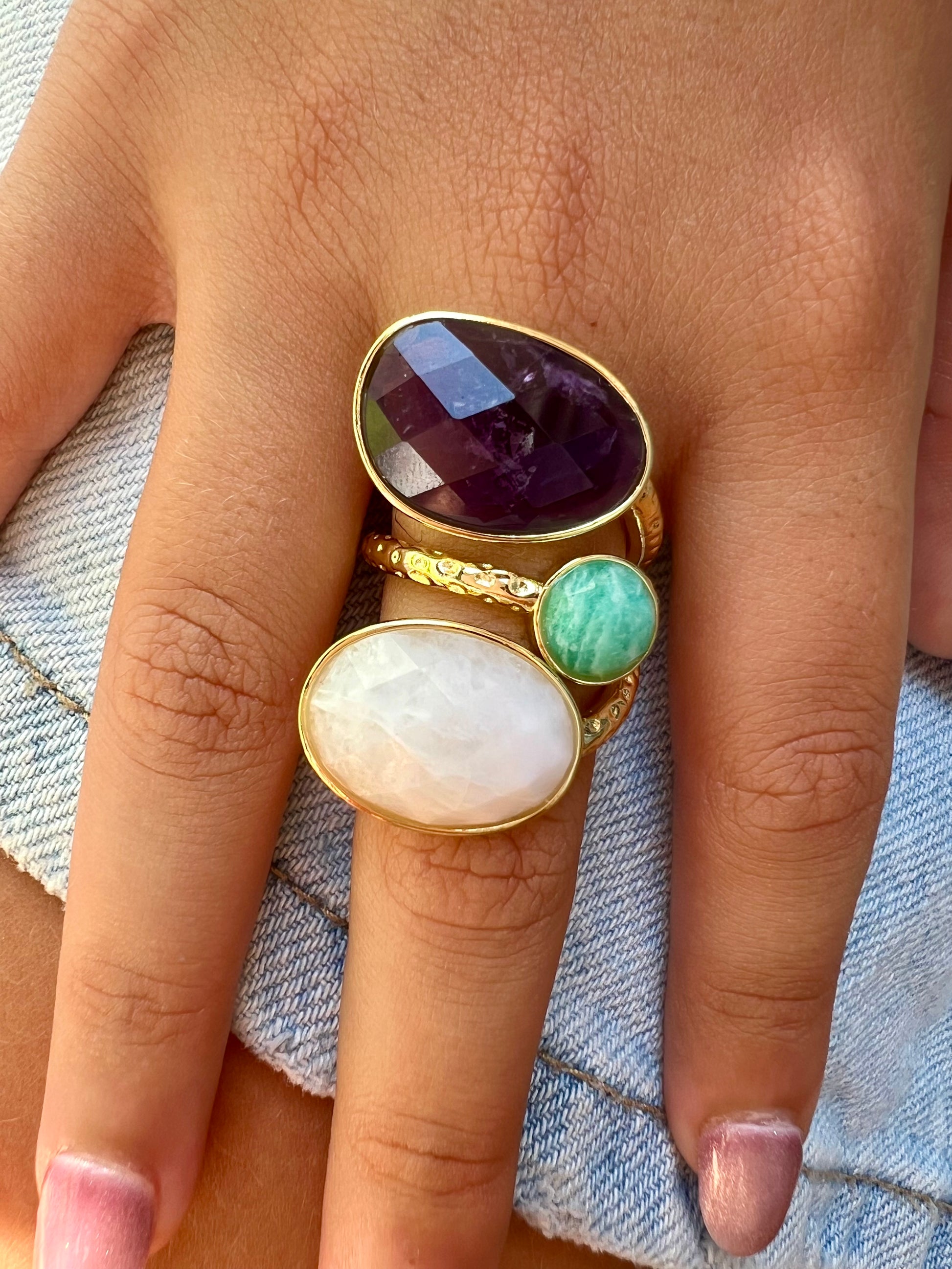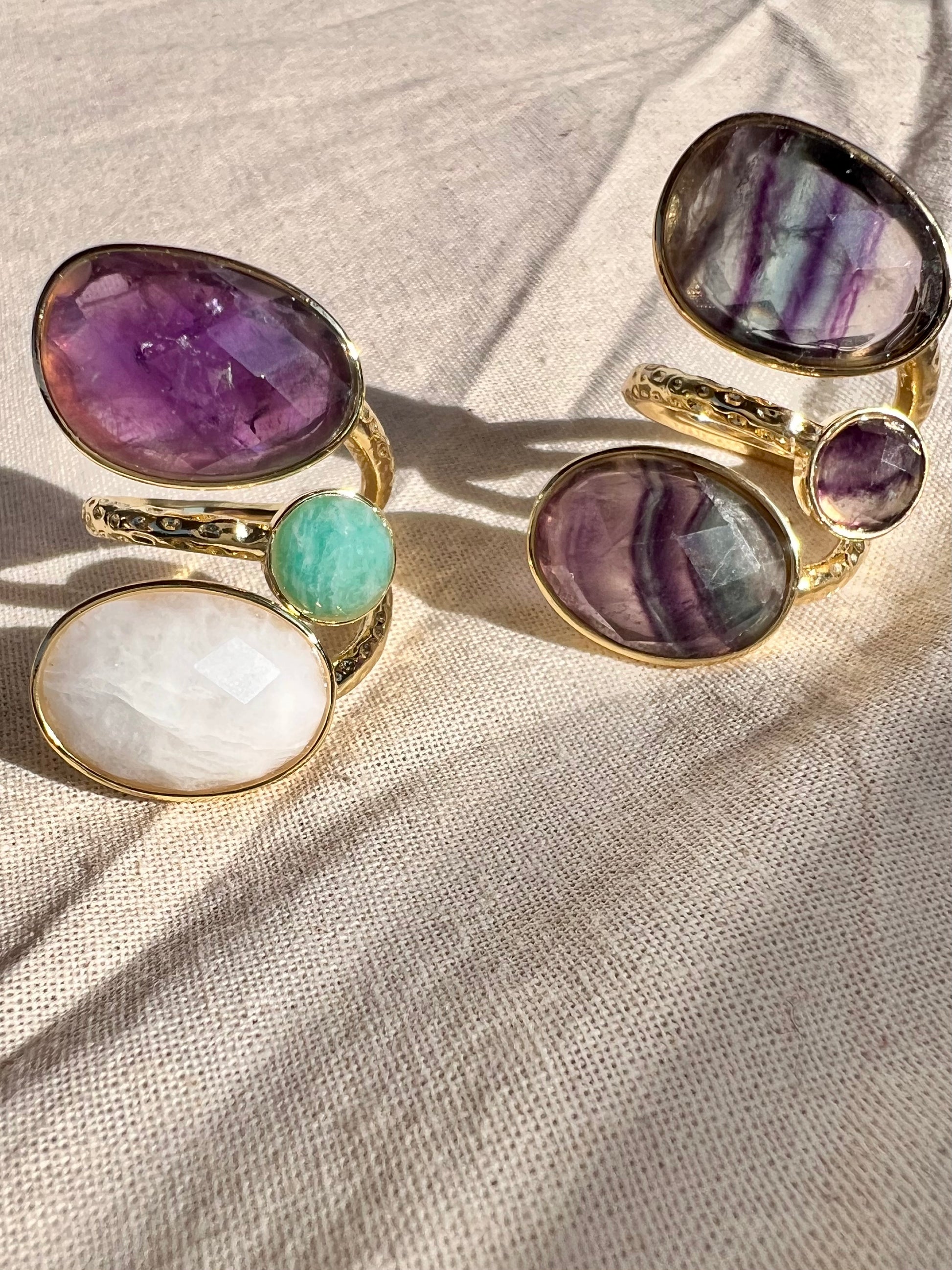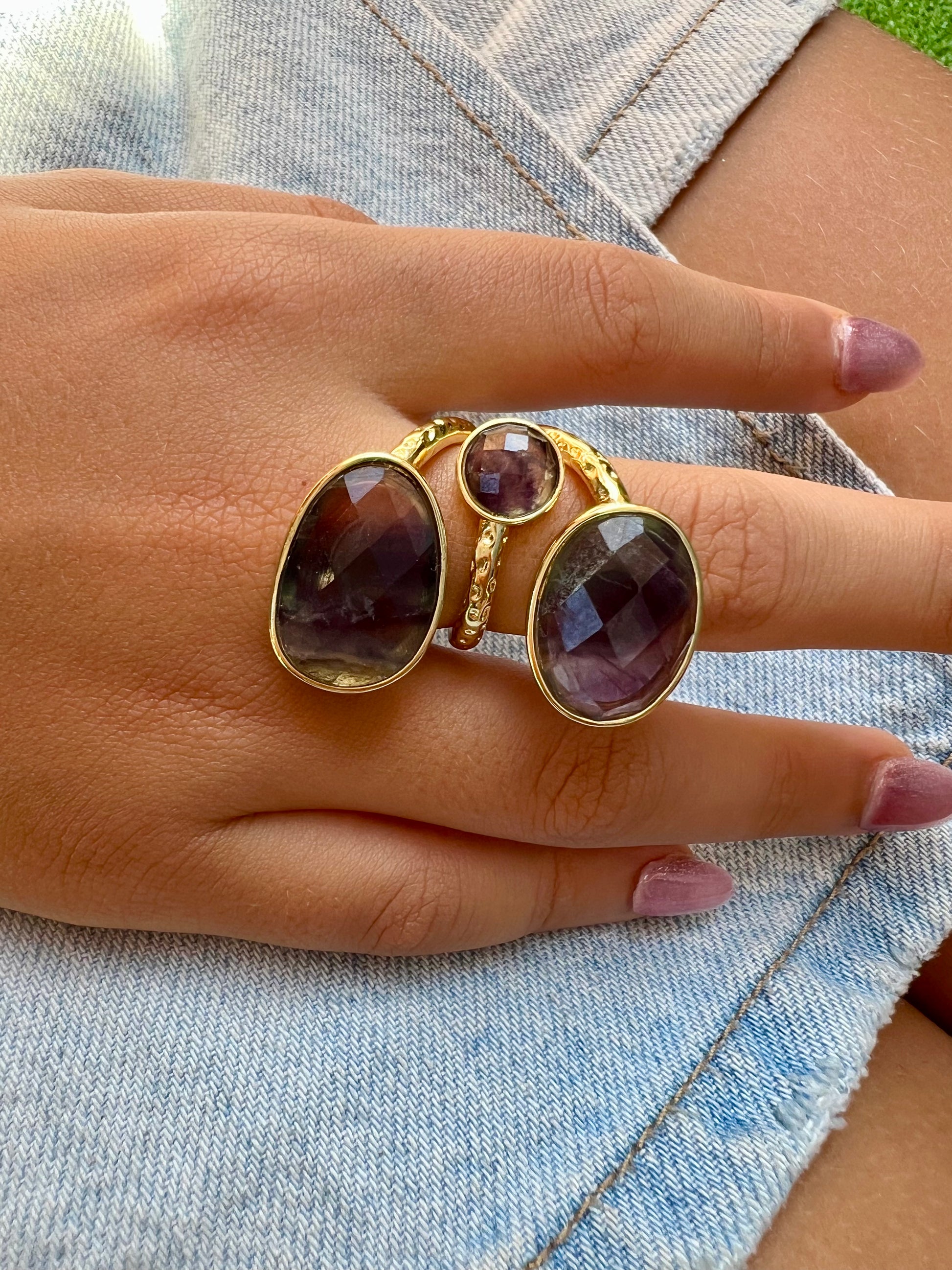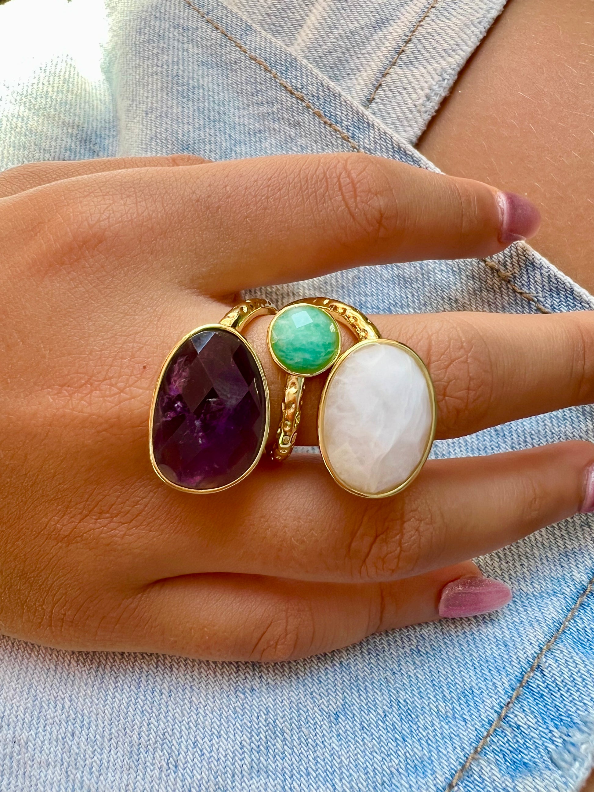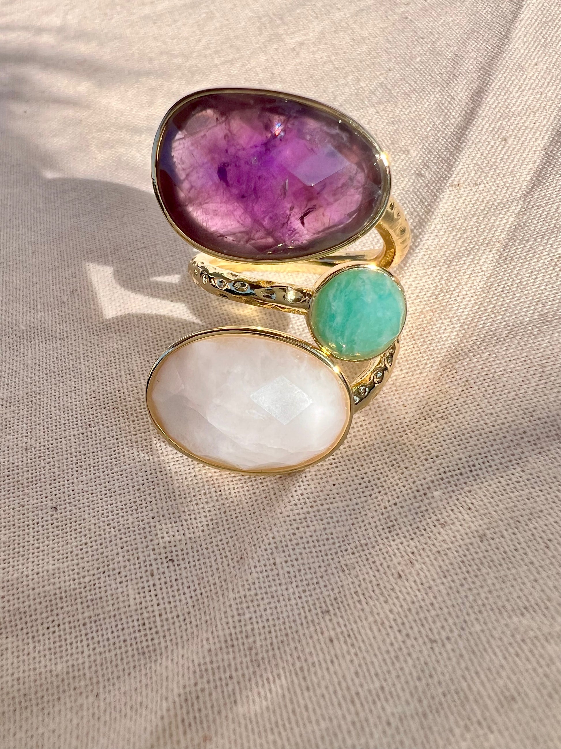 Raffinée et féminine, la bague Chiara séduit par son allure chic et son éclat subtil ✨. Conçue en laiton doré à l’or fin, elle est ornée de trois pierres naturelles soigneusement sélectionnées. Disponible en deux versions :