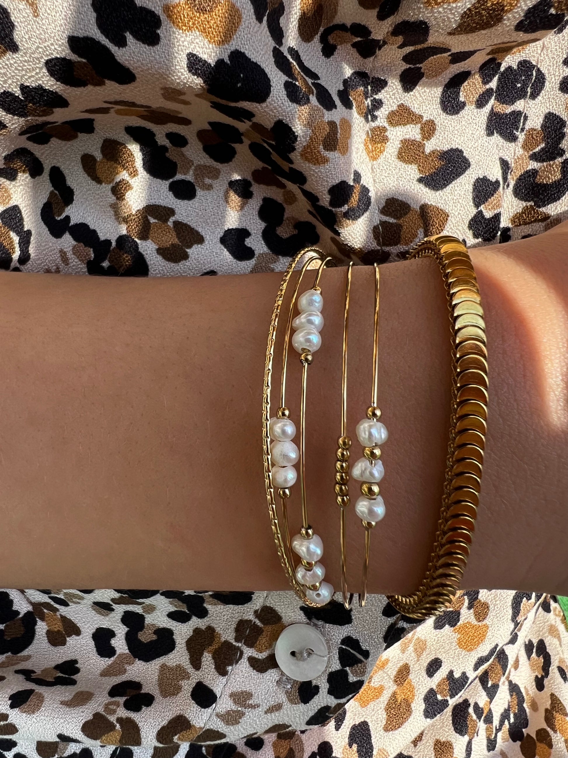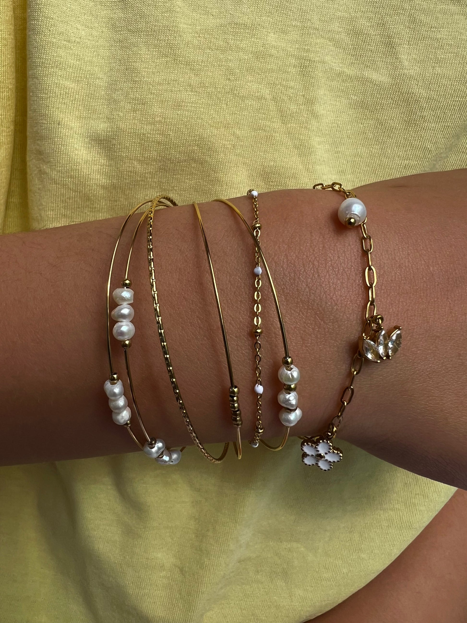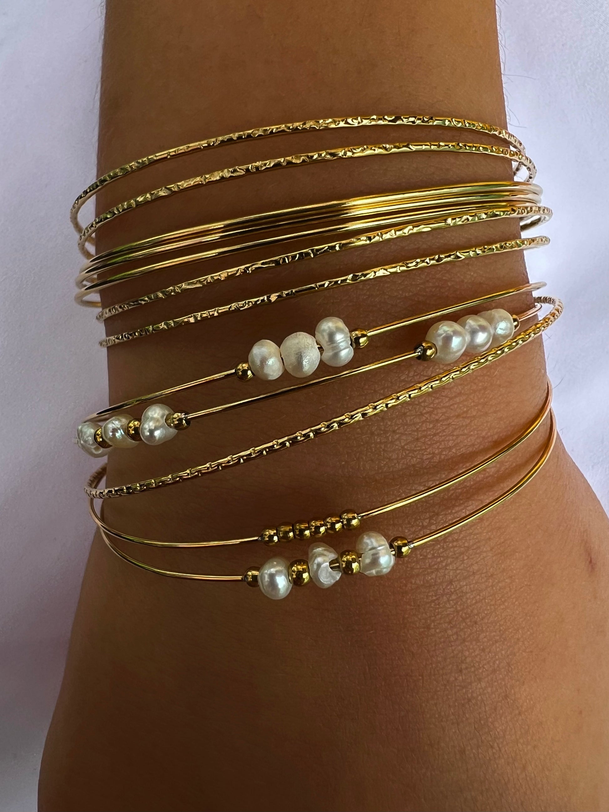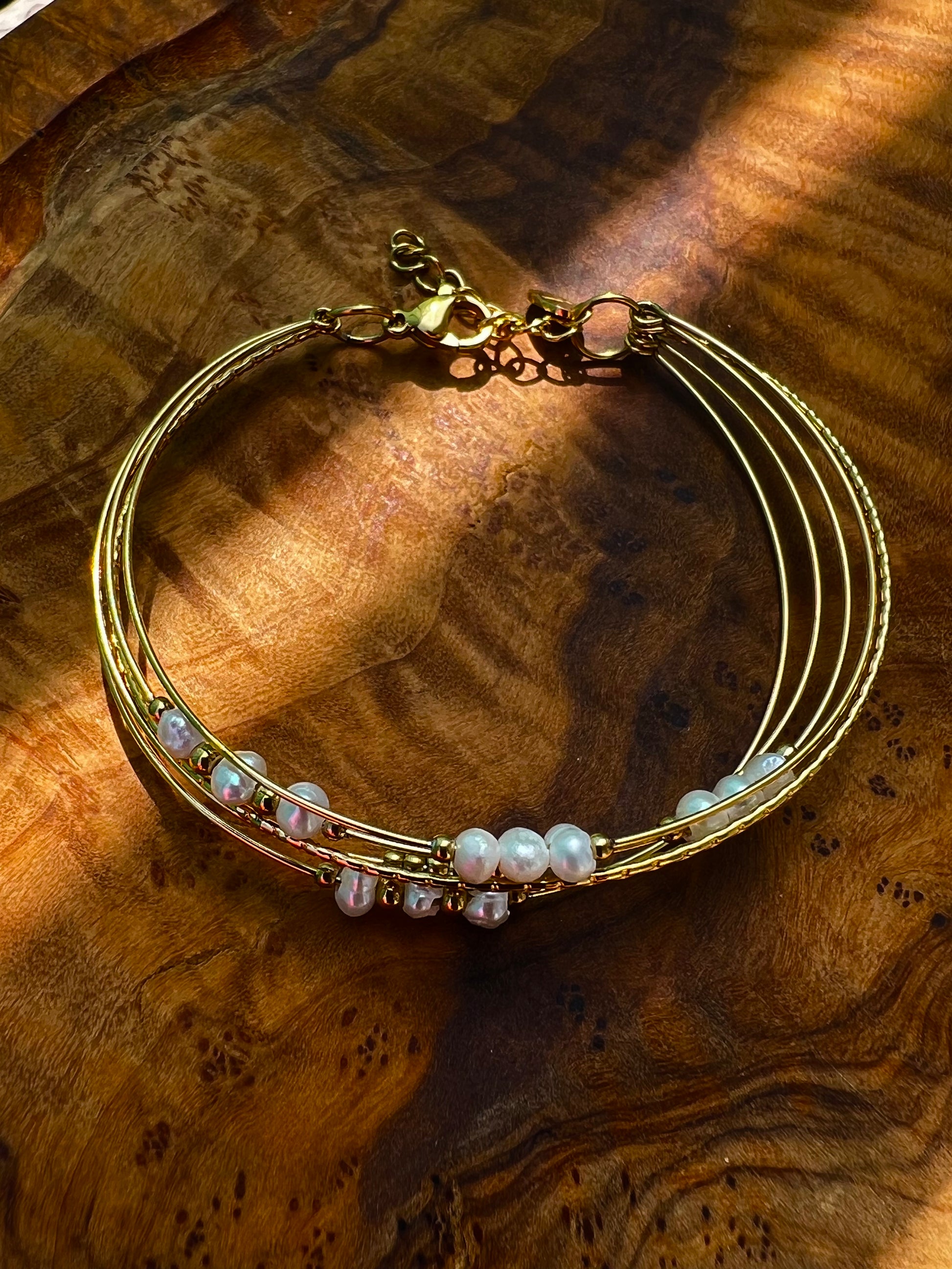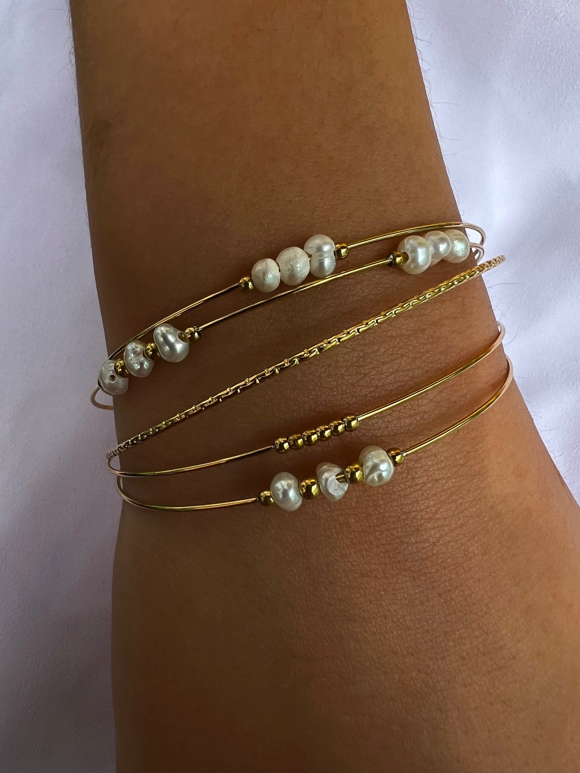 ✧ Jonc semainier doré en acier inoxydable et perles d'eau douce.