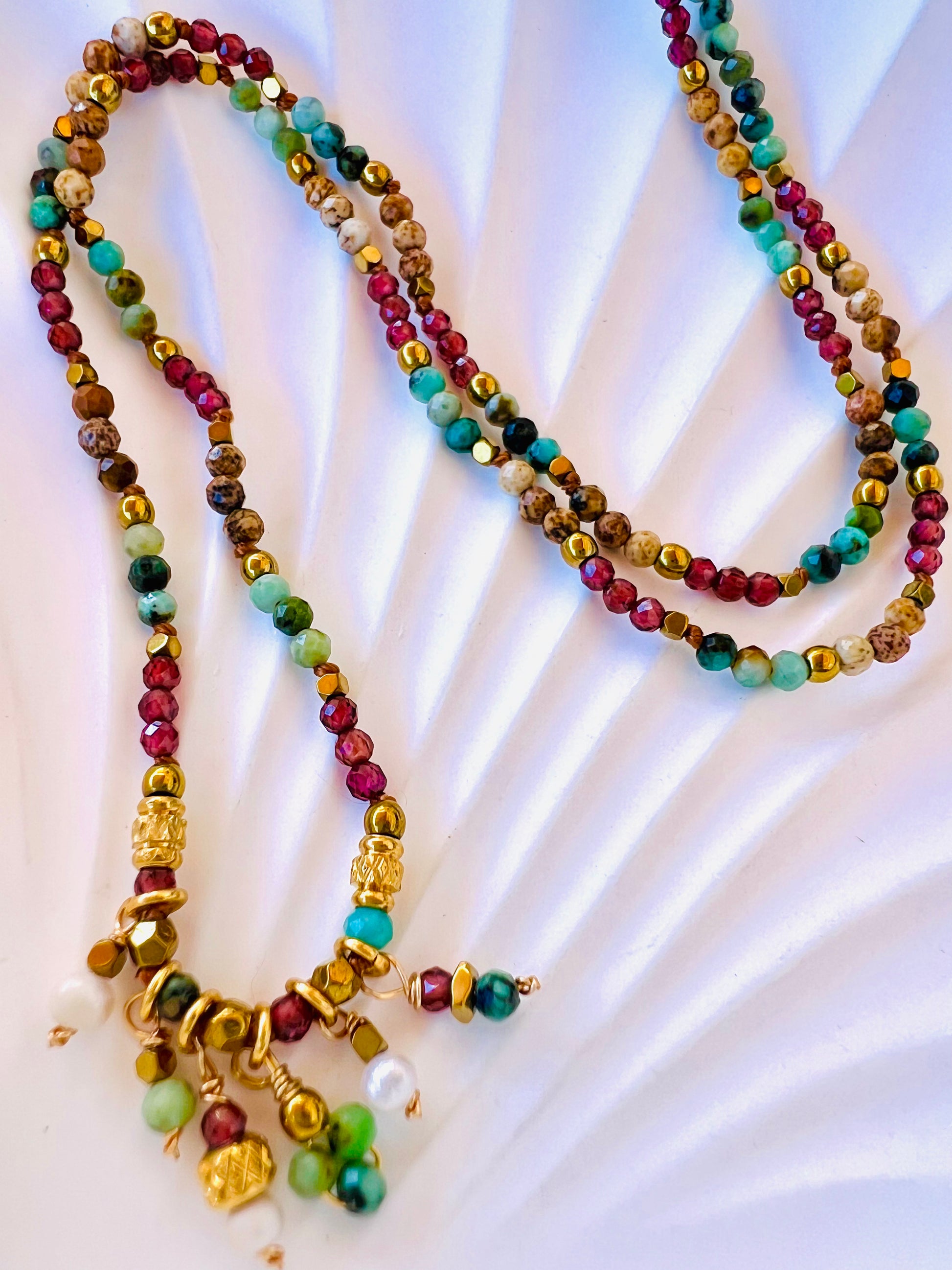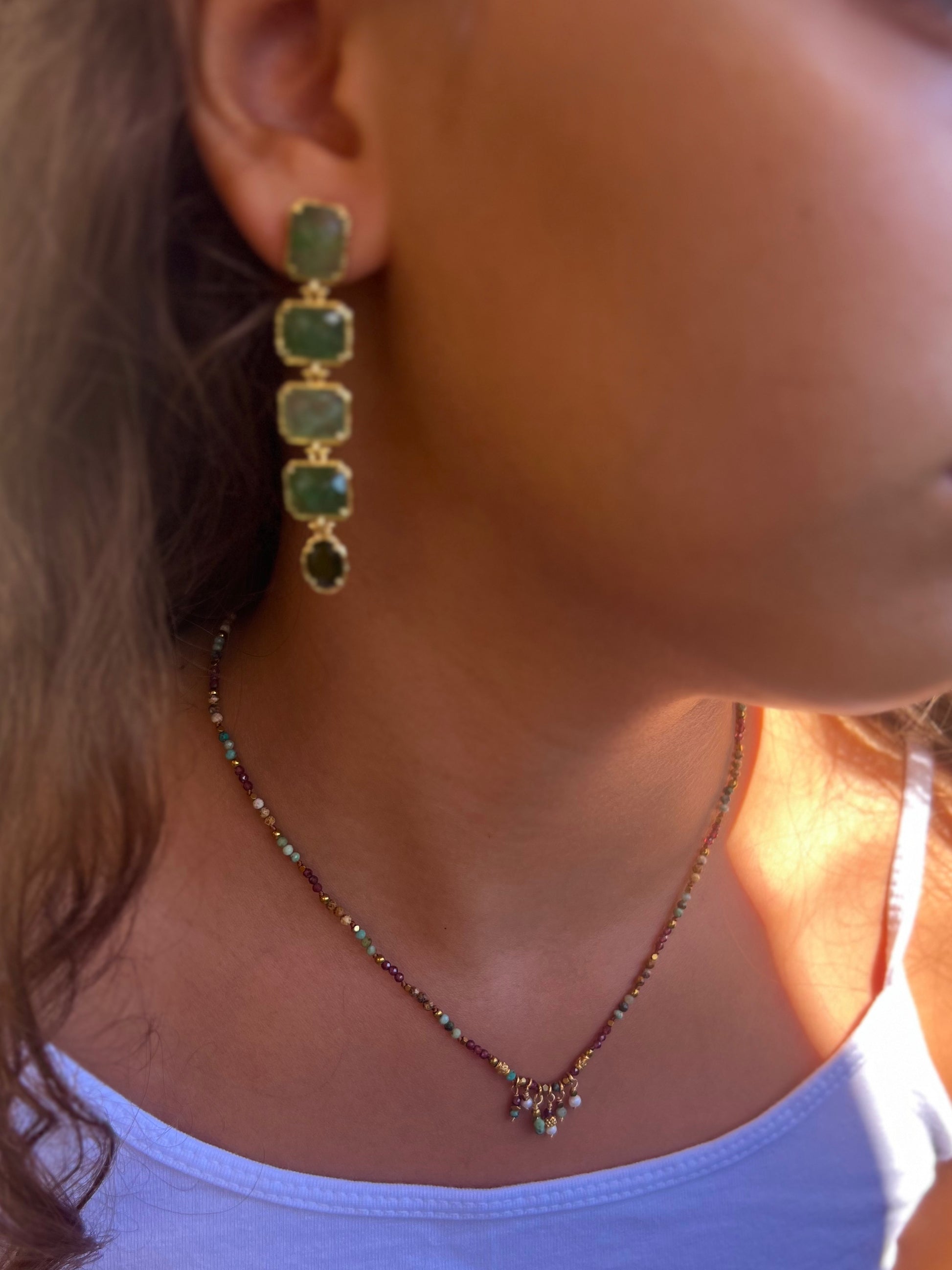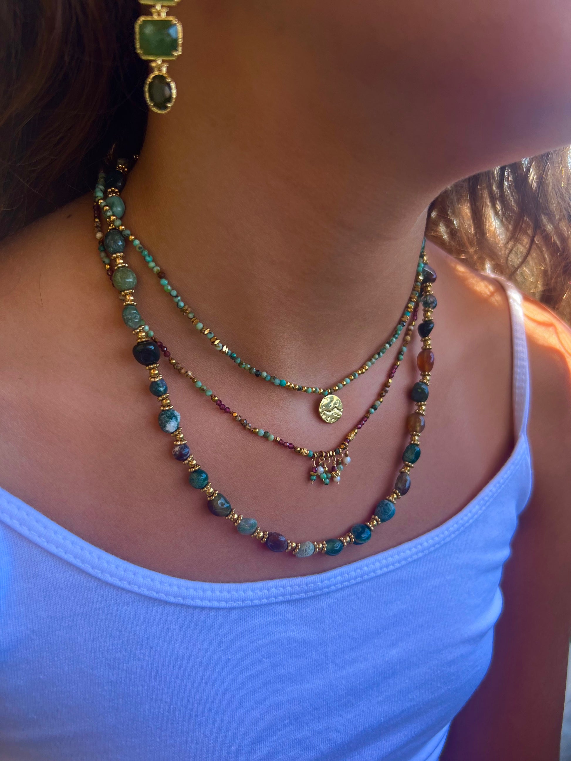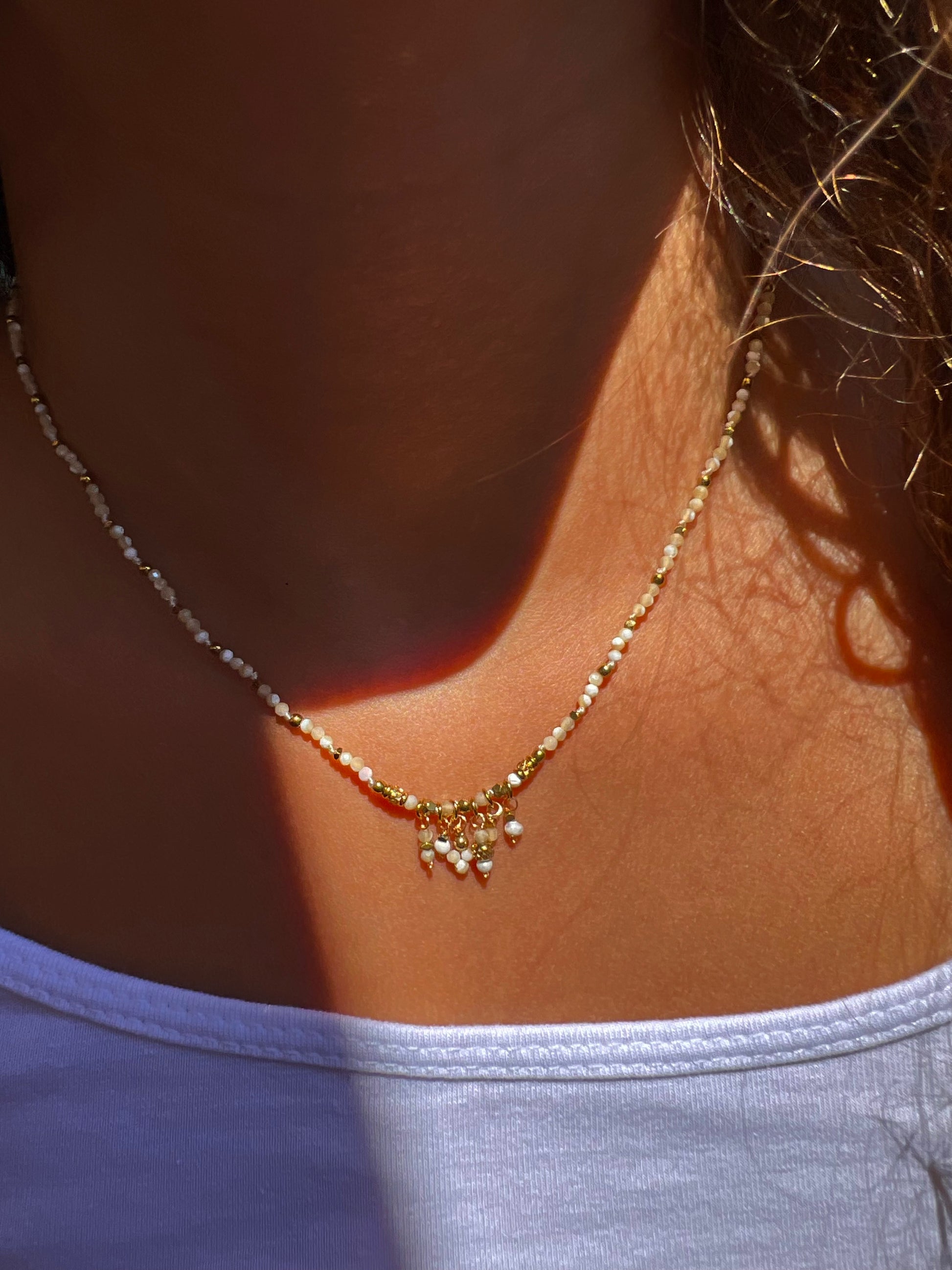 Le collier Cordelia associe une base perlée à des pampilles en pierres naturelles et perles d’eau douce. Disponible en plusieurs déclinaisons :Turquoise africaine, amazonite, cornaline ou nacre.
