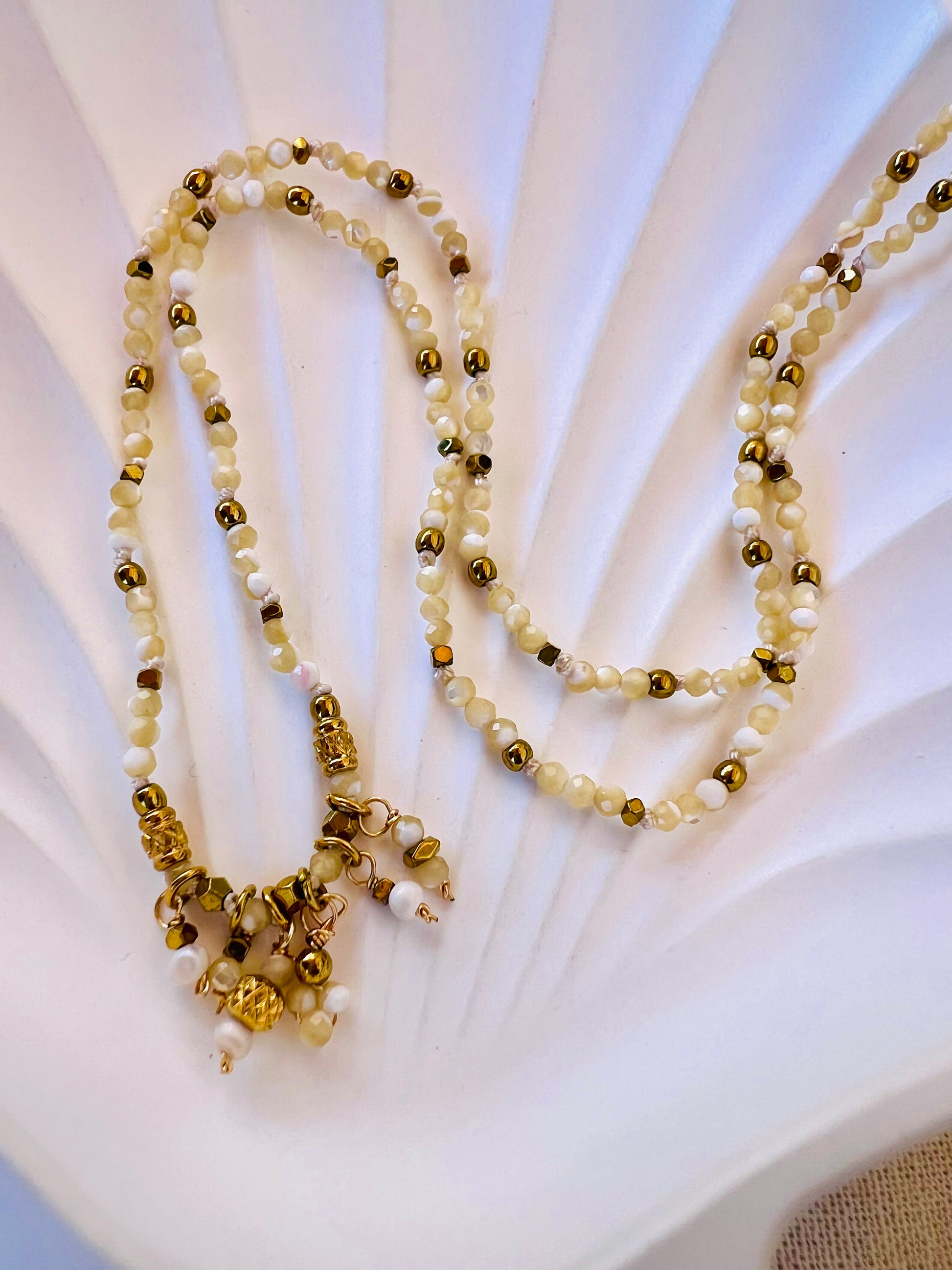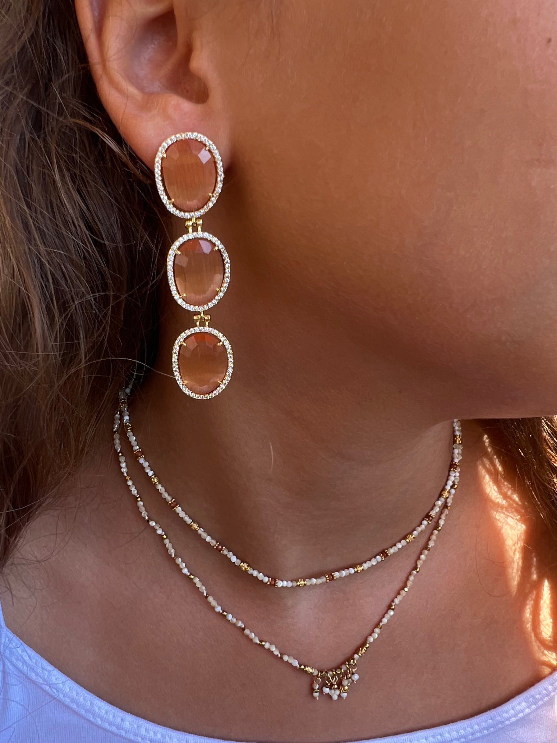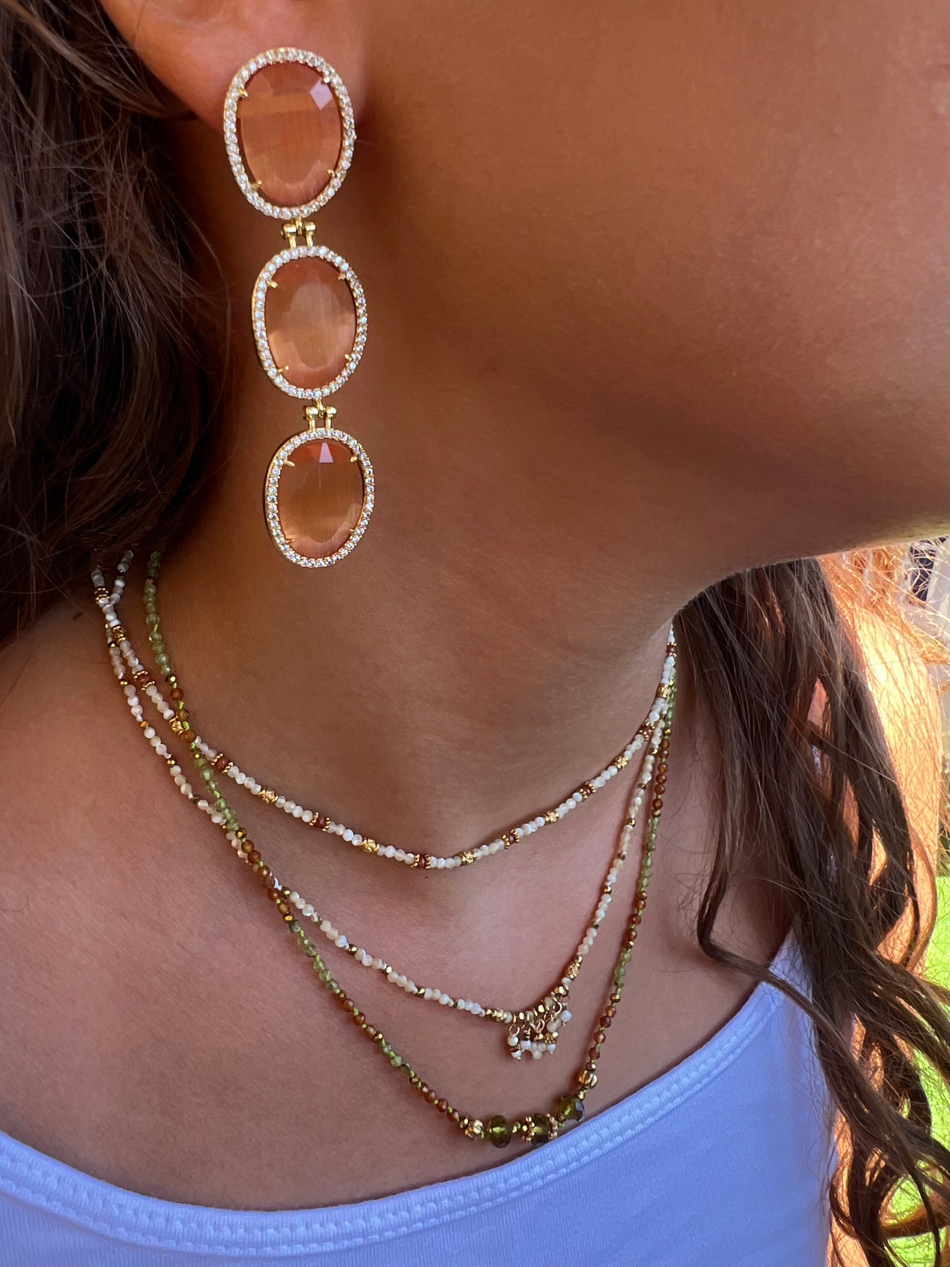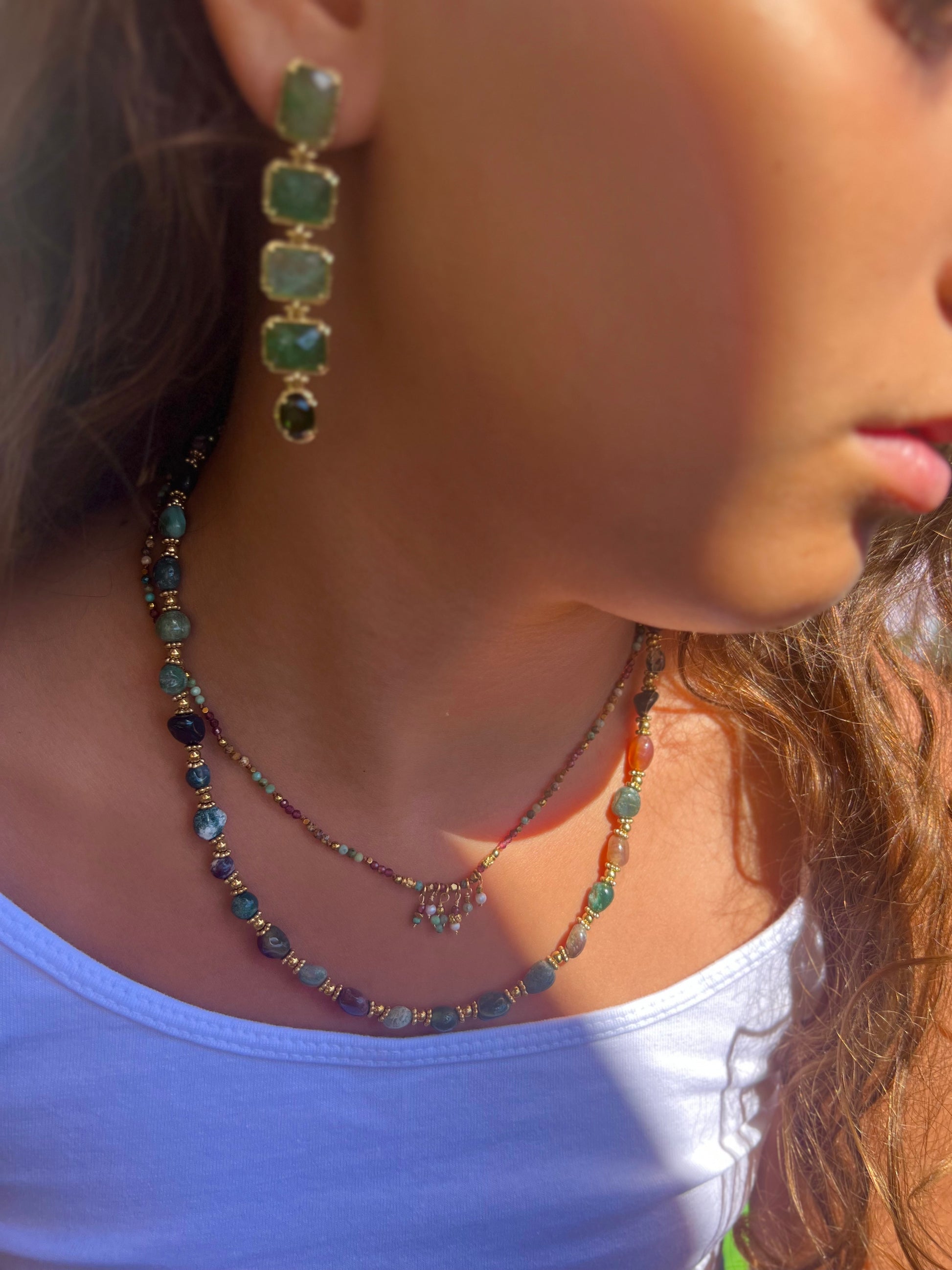 Le collier Cordelia associe une base perlée à des pampilles en pierres naturelles et perles d’eau douce. Disponible en plusieurs déclinaisons :Turquoise africaine, amazonite, cornaline ou nacre.