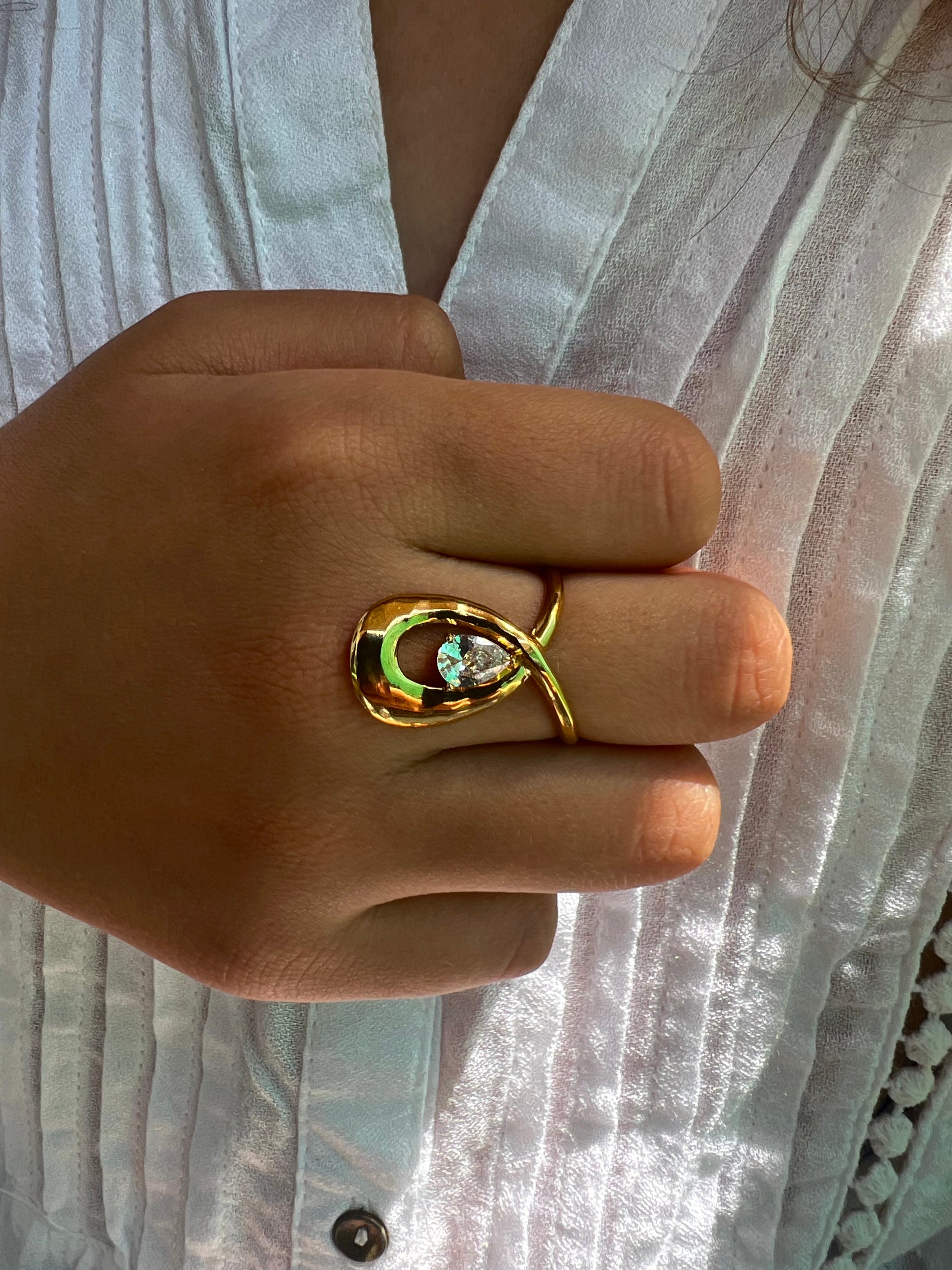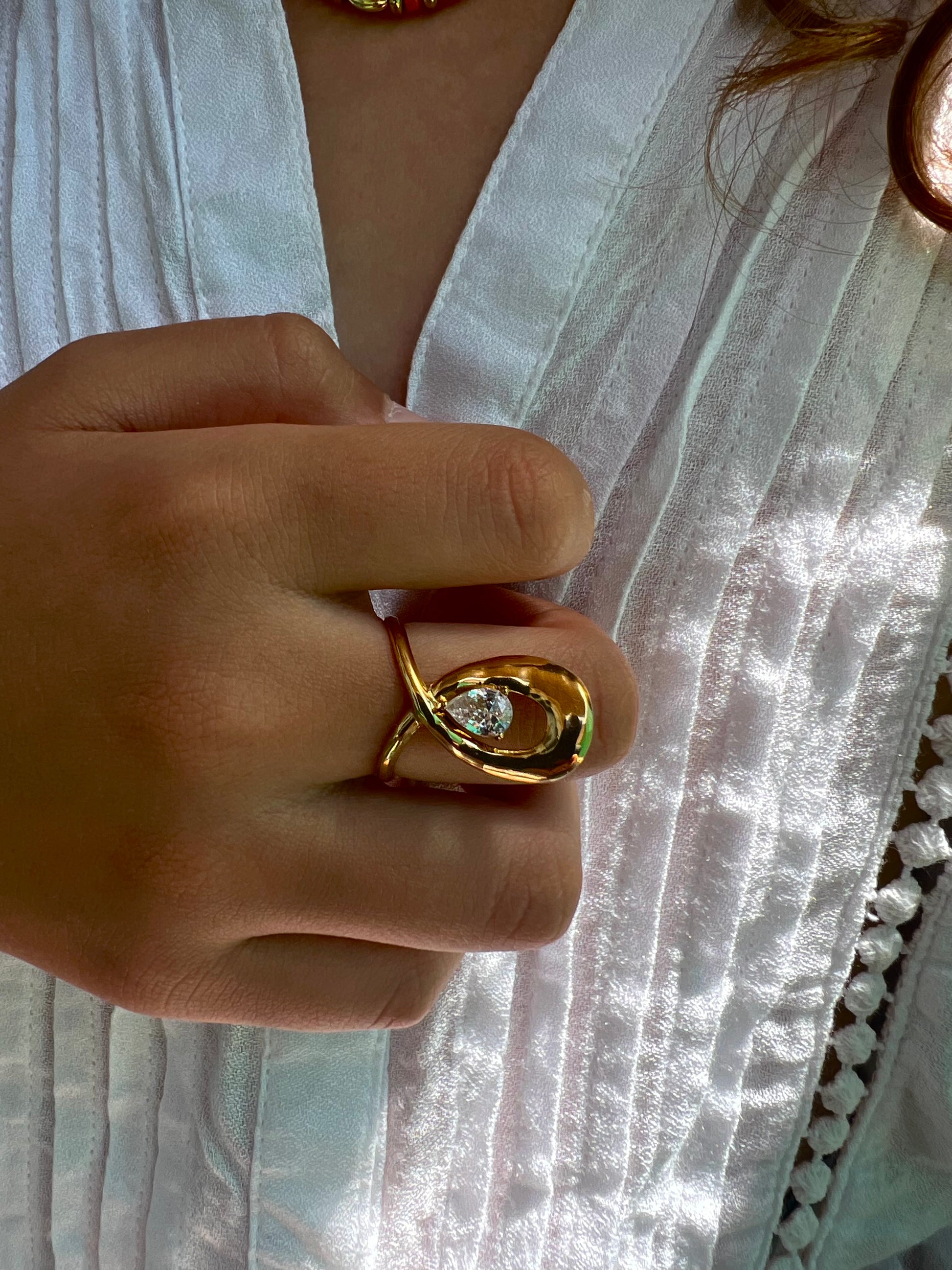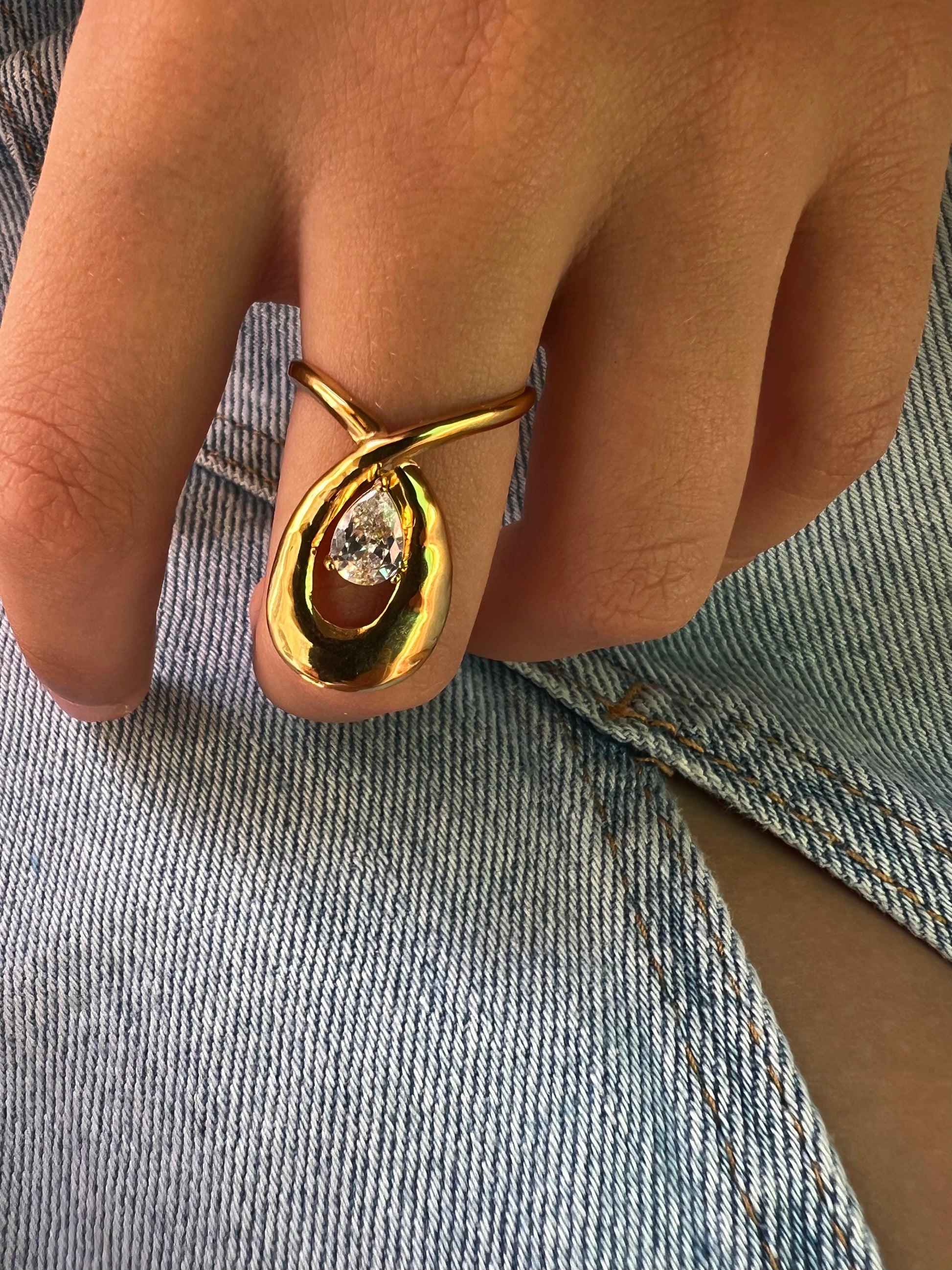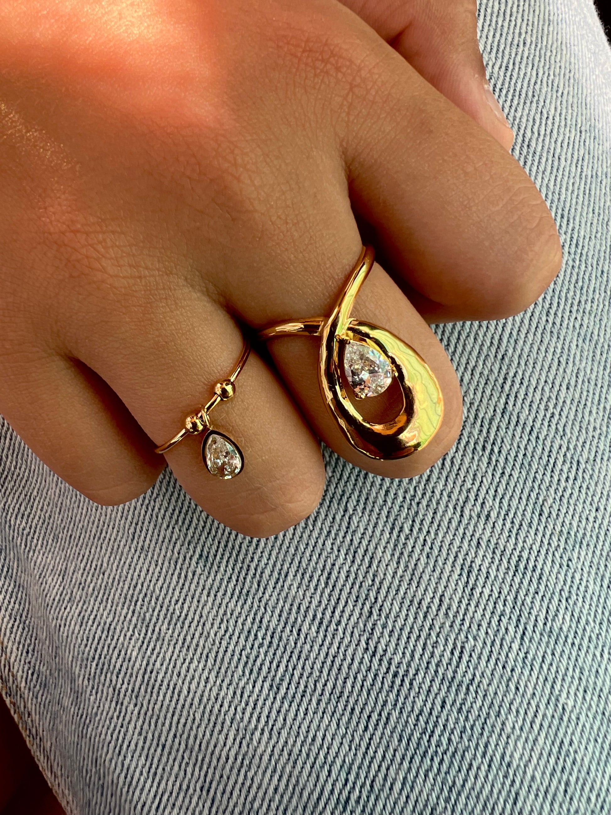✧ Bague dorée en acier inoxydable ornée d’un cristal en forme de goutte délicatement inséré dans une structure ajourée.