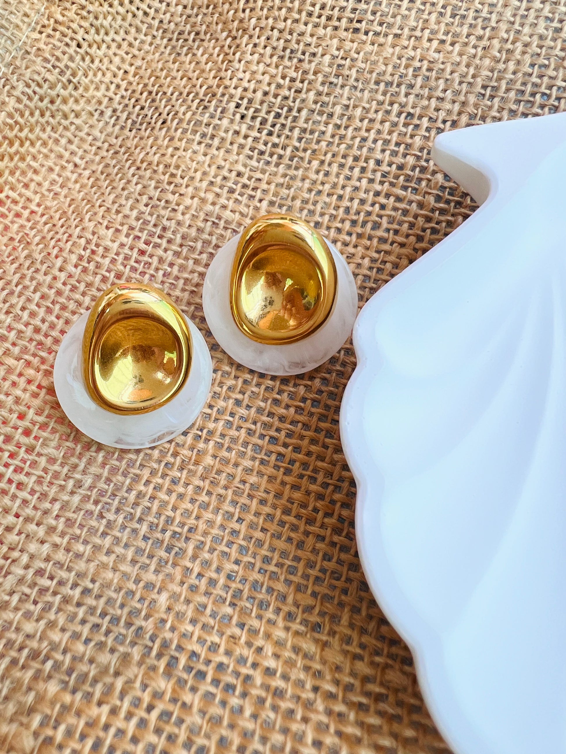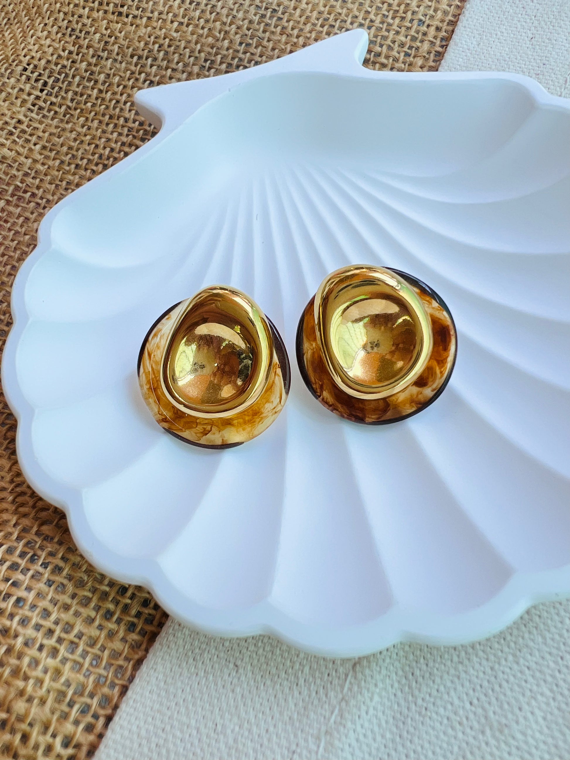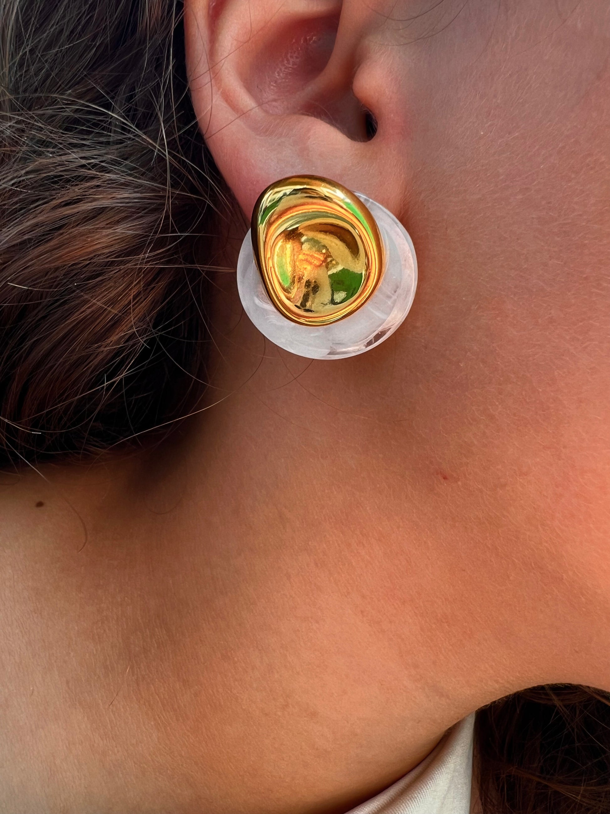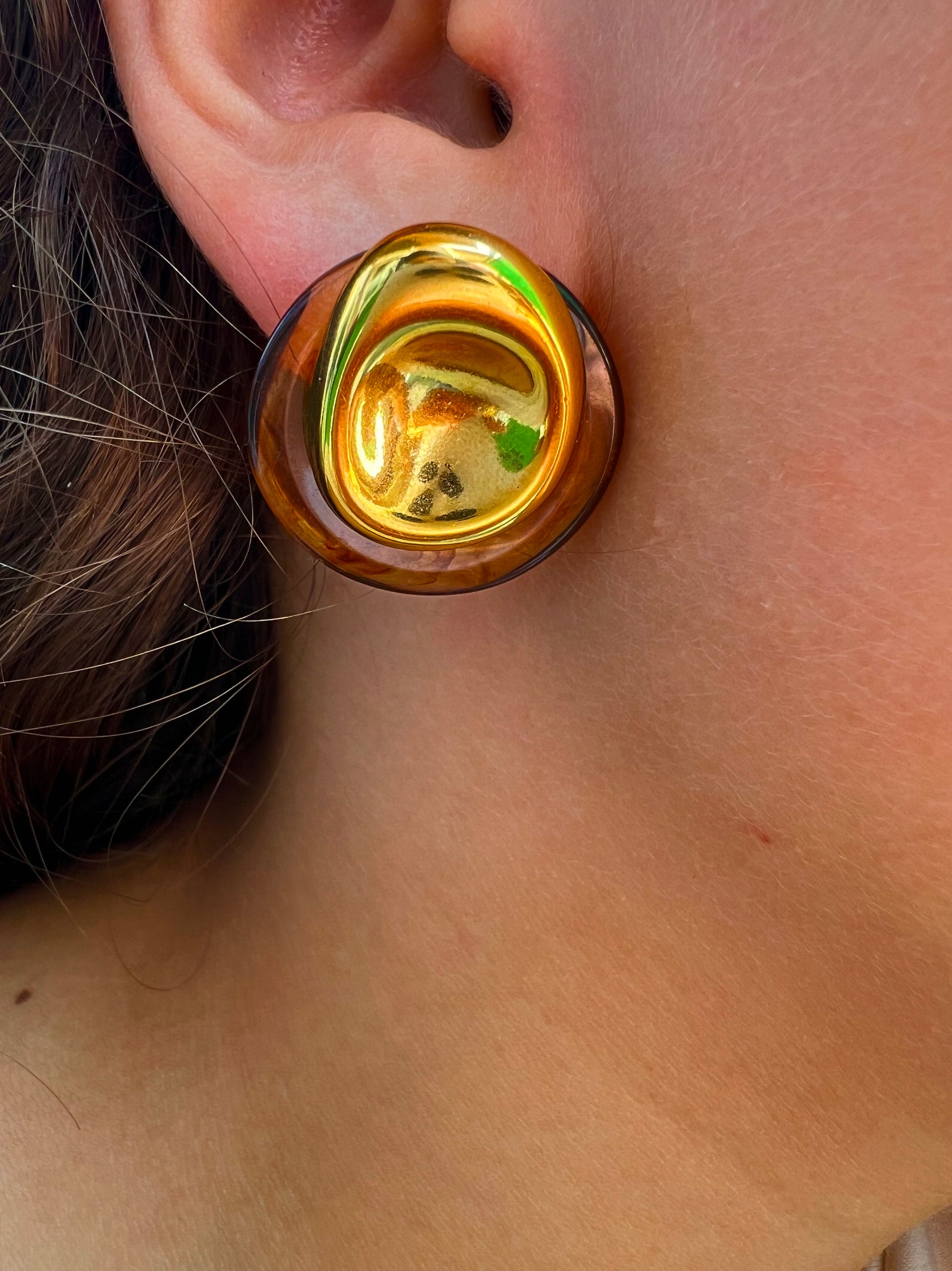 Les boucles Dune associent une base en acier inoxydable doré à un médaillon de résine marbrée, pour un rendu à la fois organique, moderne et élégant. Leur forme ondulée et texturée rappelle les courbes du désert 🌬️.