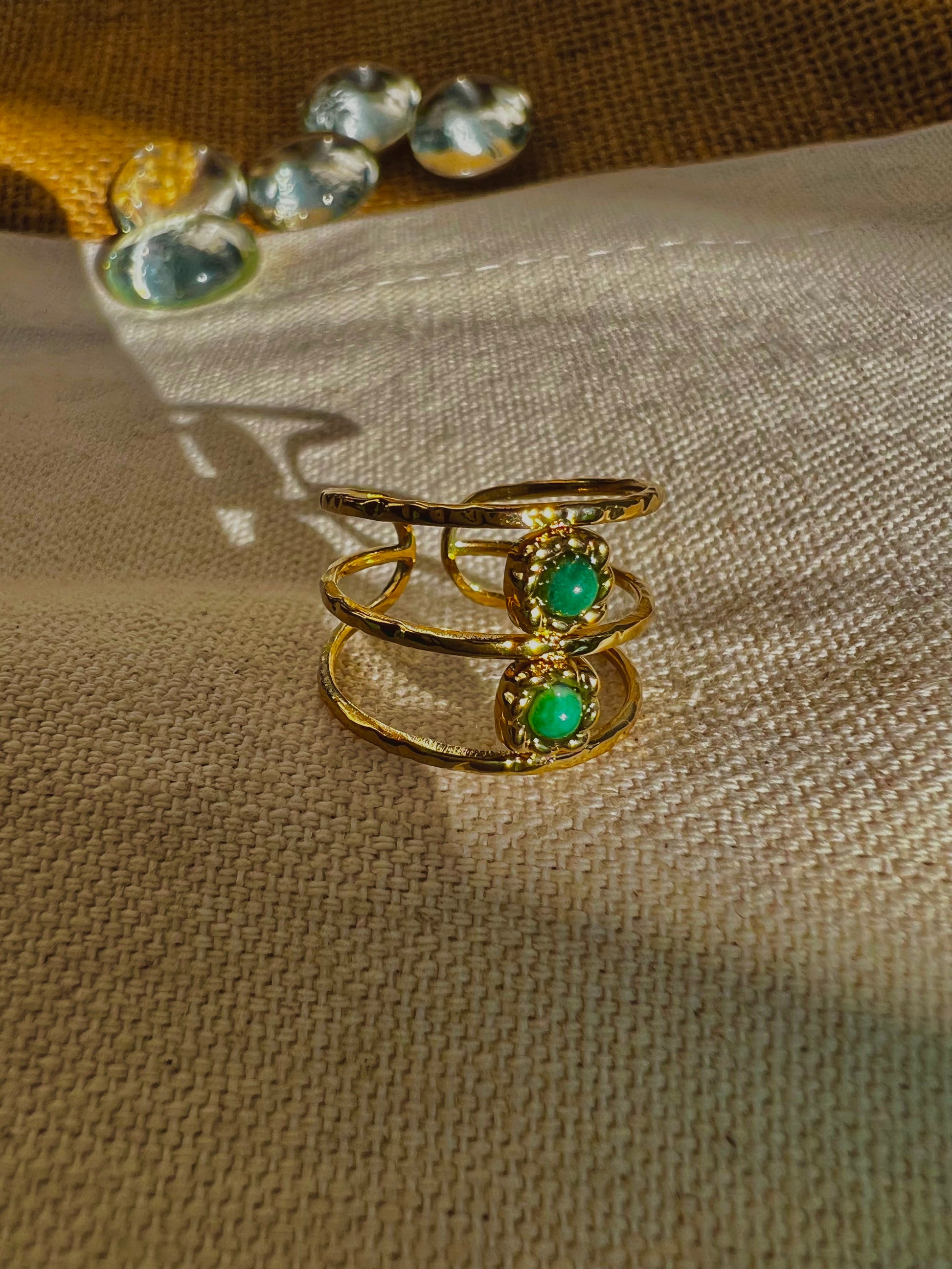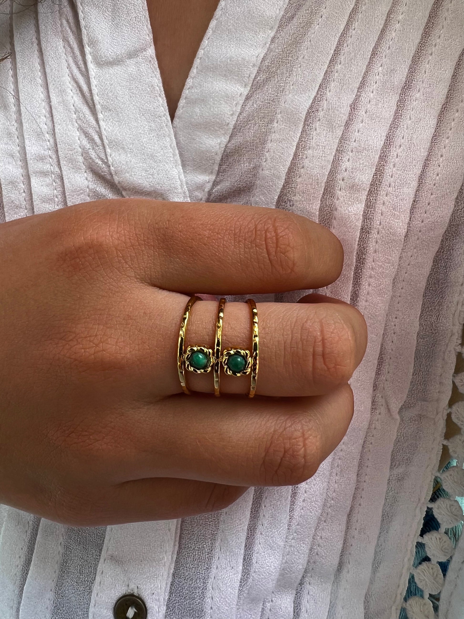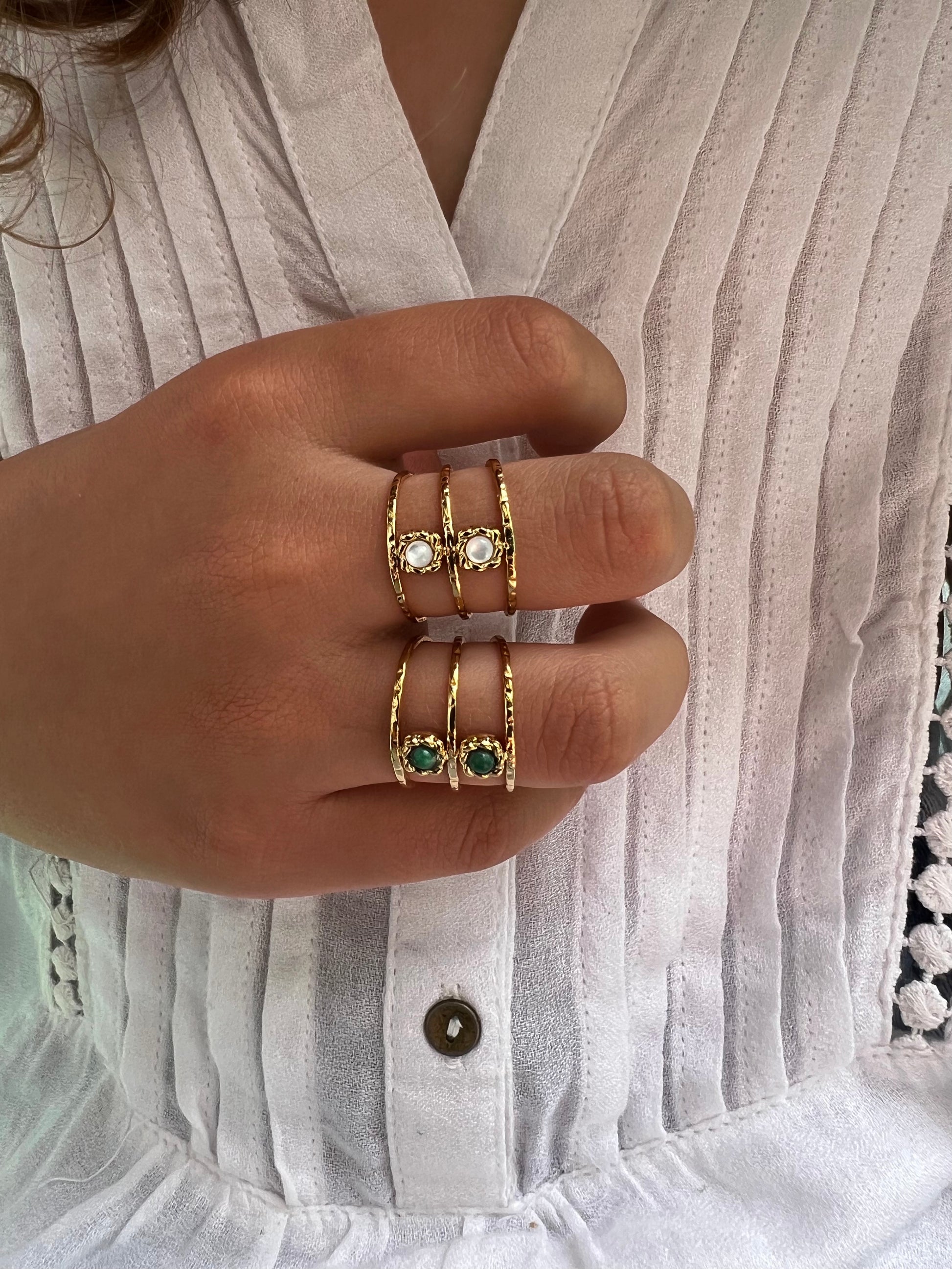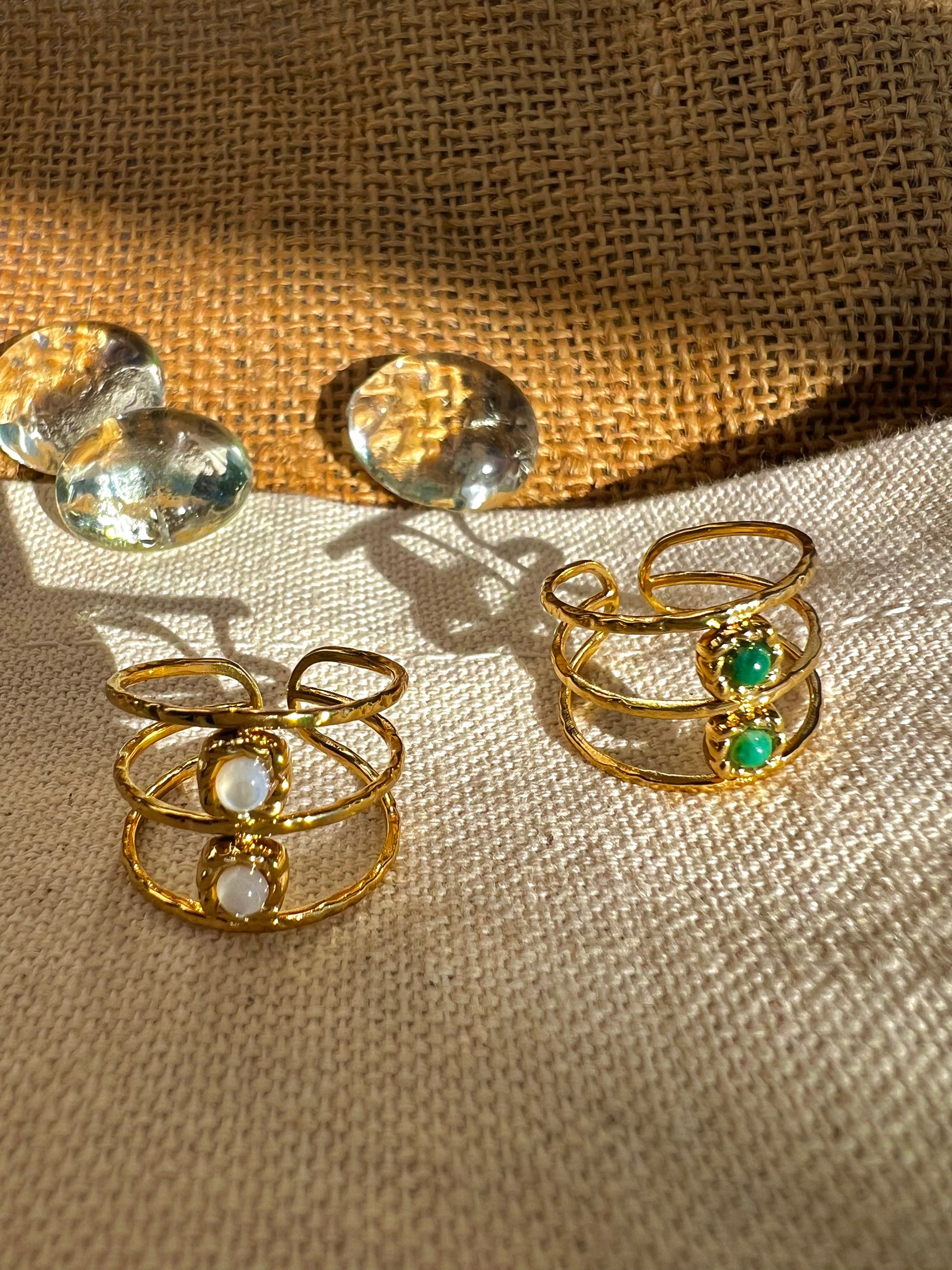 Craquez pour la bague ÉLORA composée de 3 anneaux martelés entrelacés ✨, sublimés par 2 pierres naturelles rondes. Disponible en nacre 🐚 ou en turquoise africaine 🌍, elle apporte une touche authentique et raffinée à votre look. Conçue en acier inoxydable doré , ajustable, hypoallergénique et résistante à l’eau💧, elle se porte en toute simplicité au quotidien.