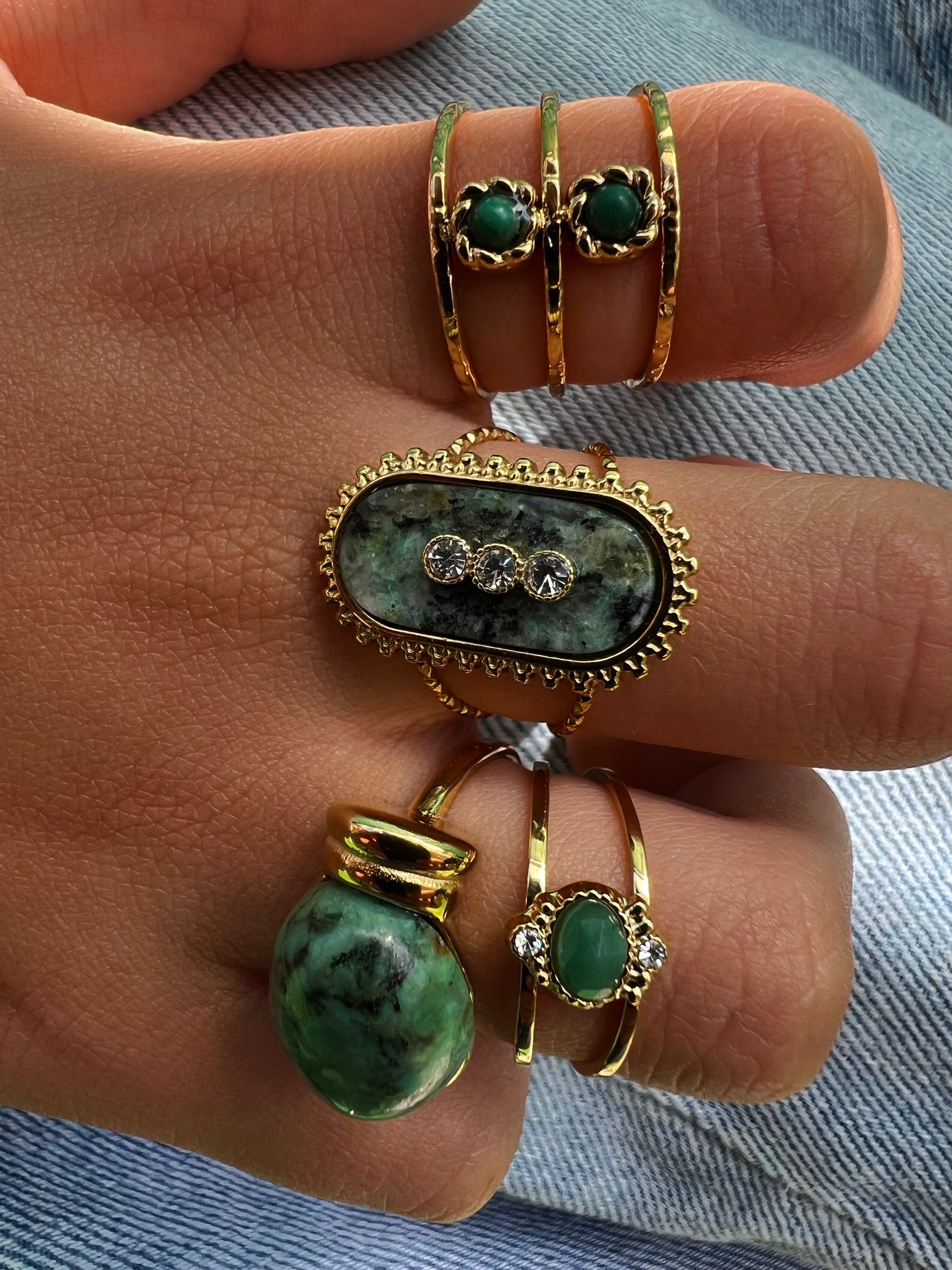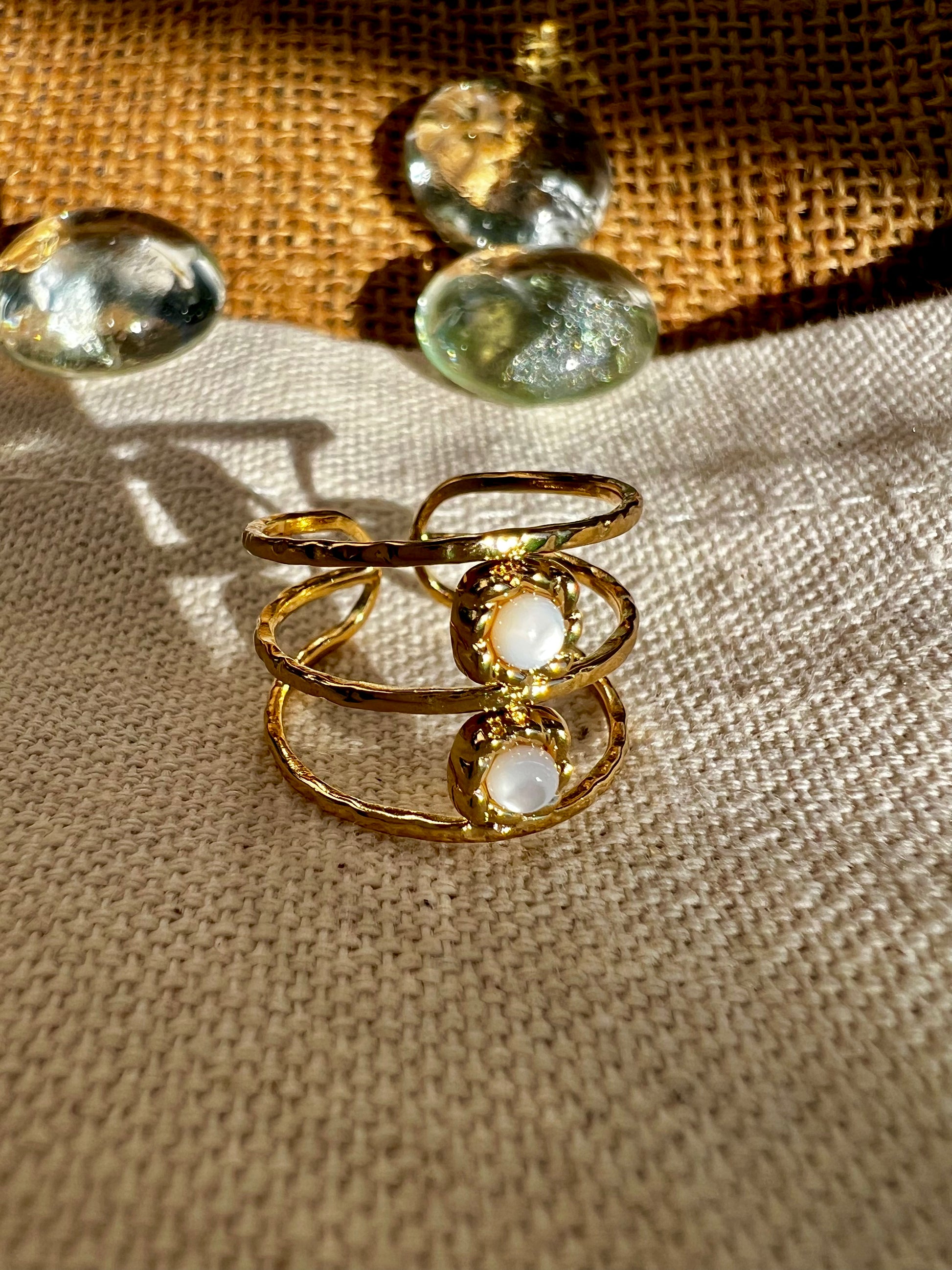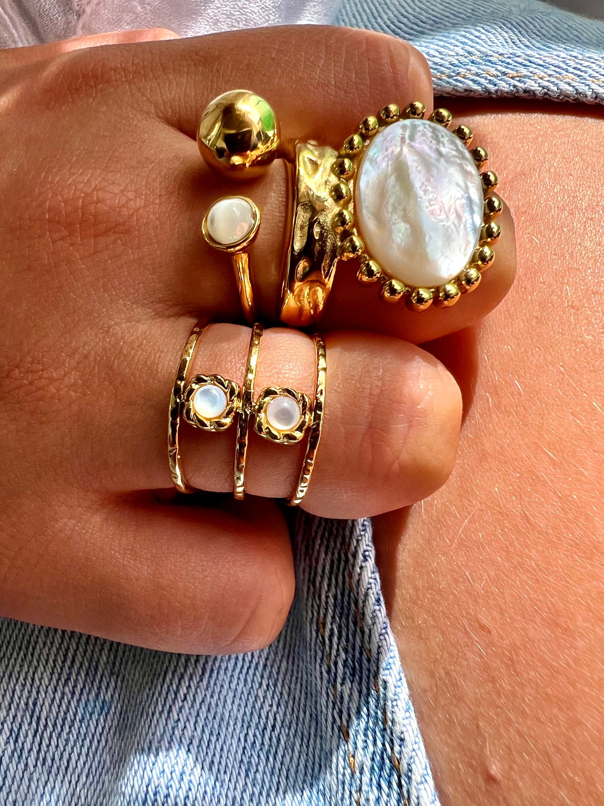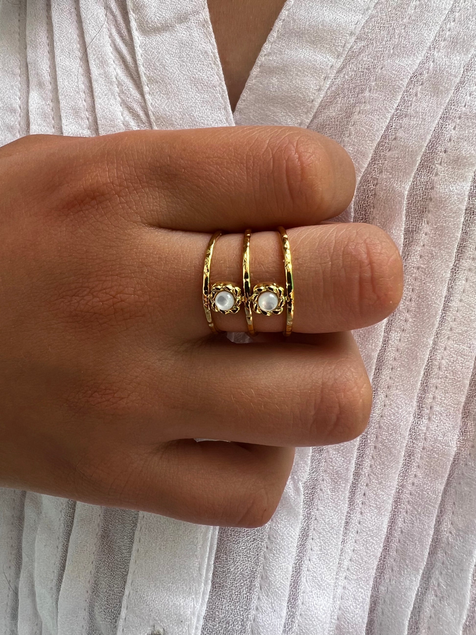 Craquez pour la bague ÉLORA composée de 3 anneaux martelés entrelacés ✨, sublimés par 2 pierres naturelles rondes. Disponible en nacre 🐚 ou en turquoise africaine 🌍, elle apporte une touche authentique et raffinée à votre look. Conçue en acier inoxydable doré , ajustable, hypoallergénique et résistante à l’eau💧, elle se porte en toute simplicité au quotidien.