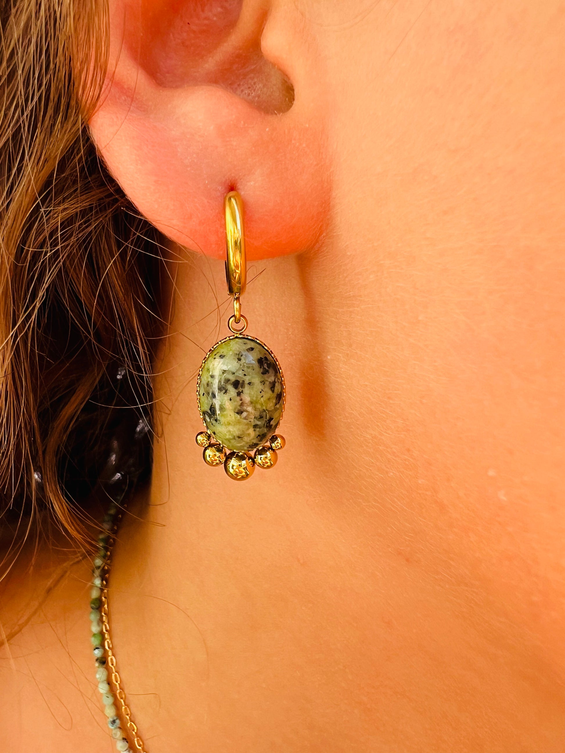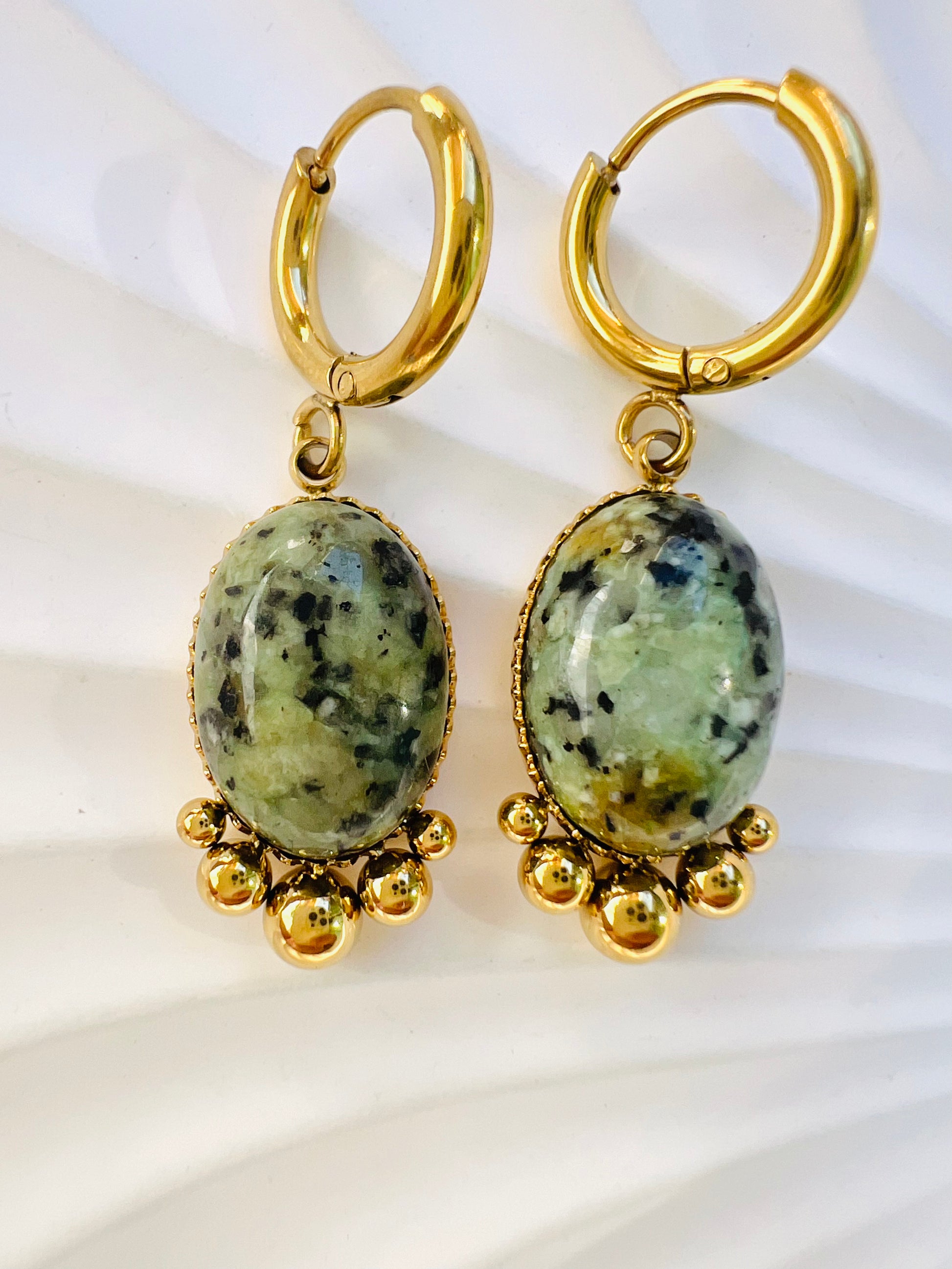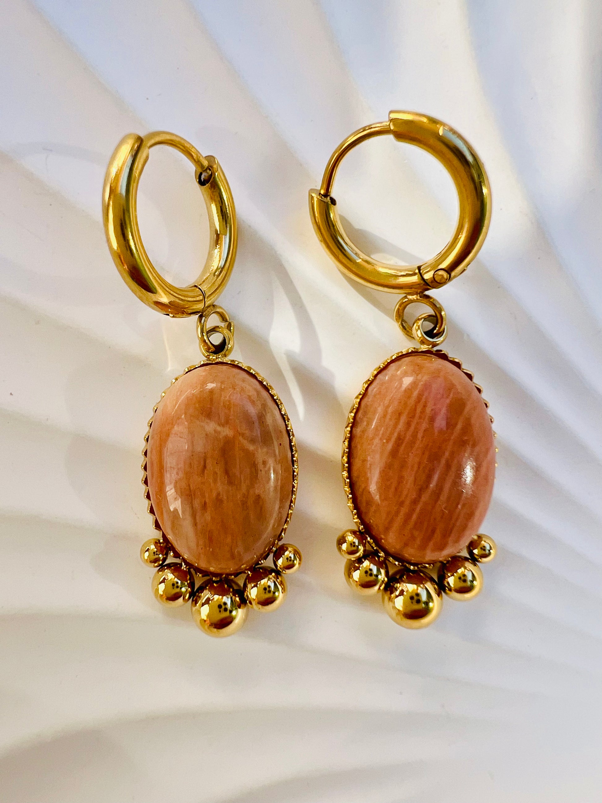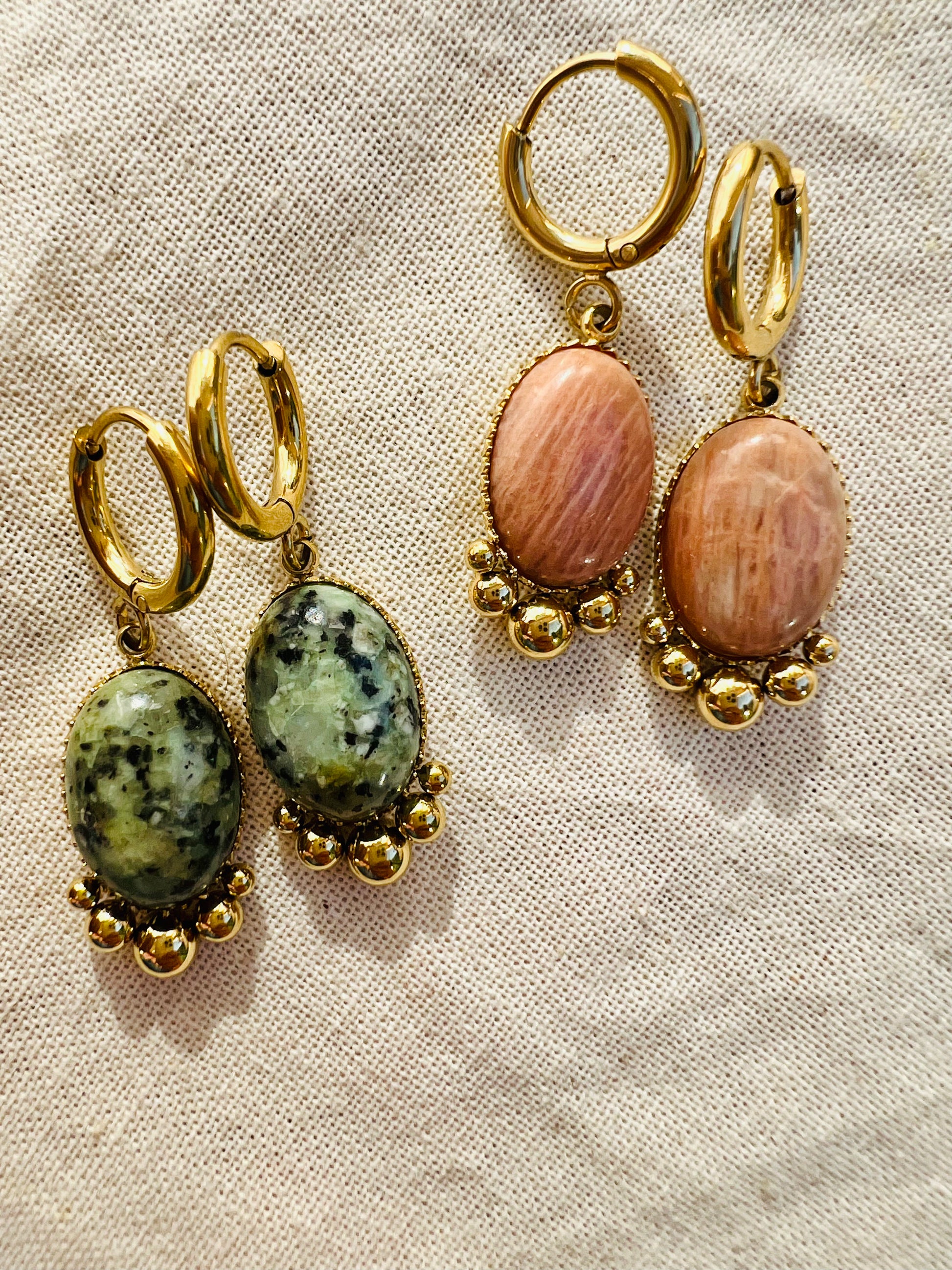✧ Boucles dorées pendantes en acier inoxydable doré et pierres naturelles.