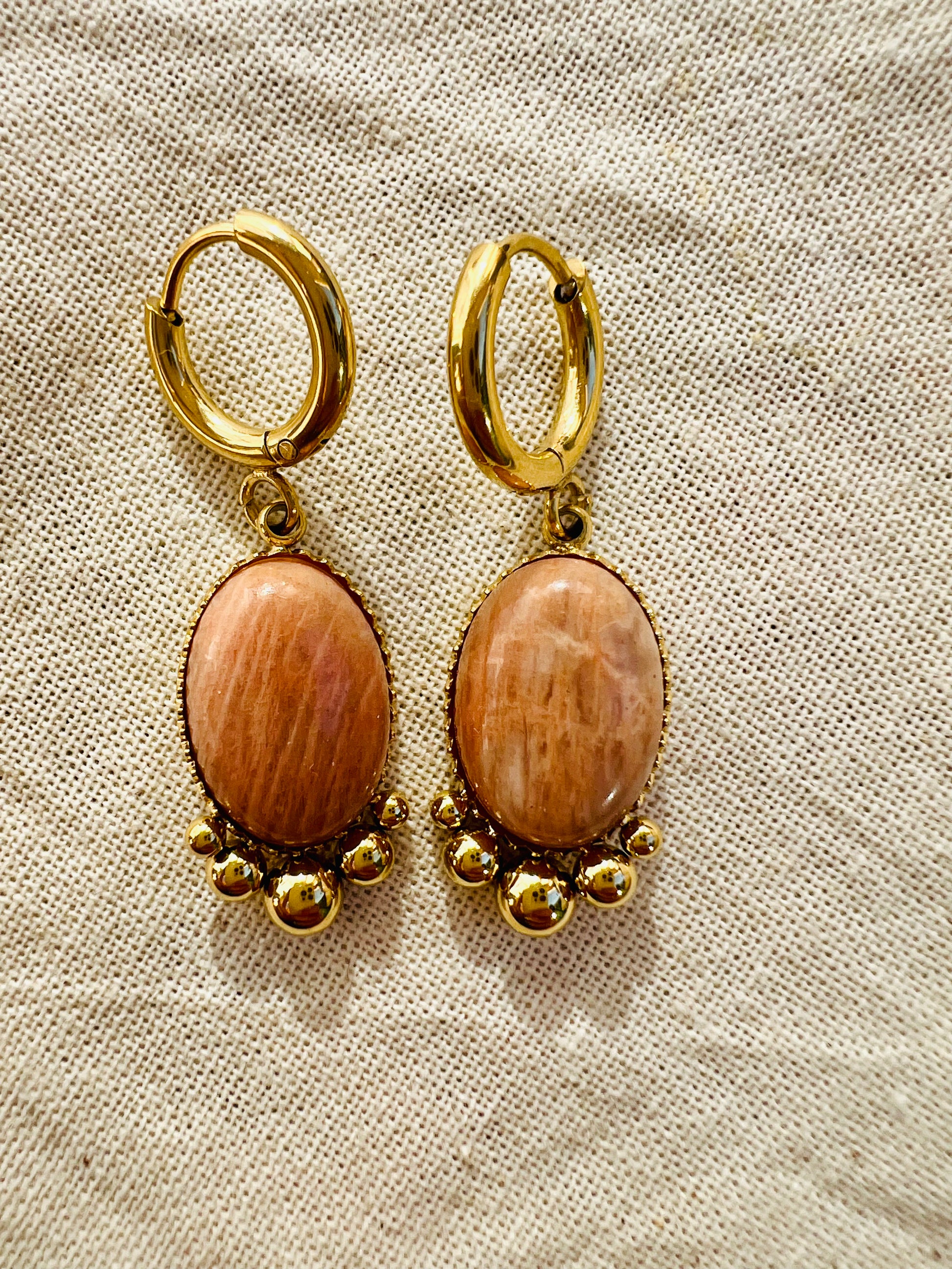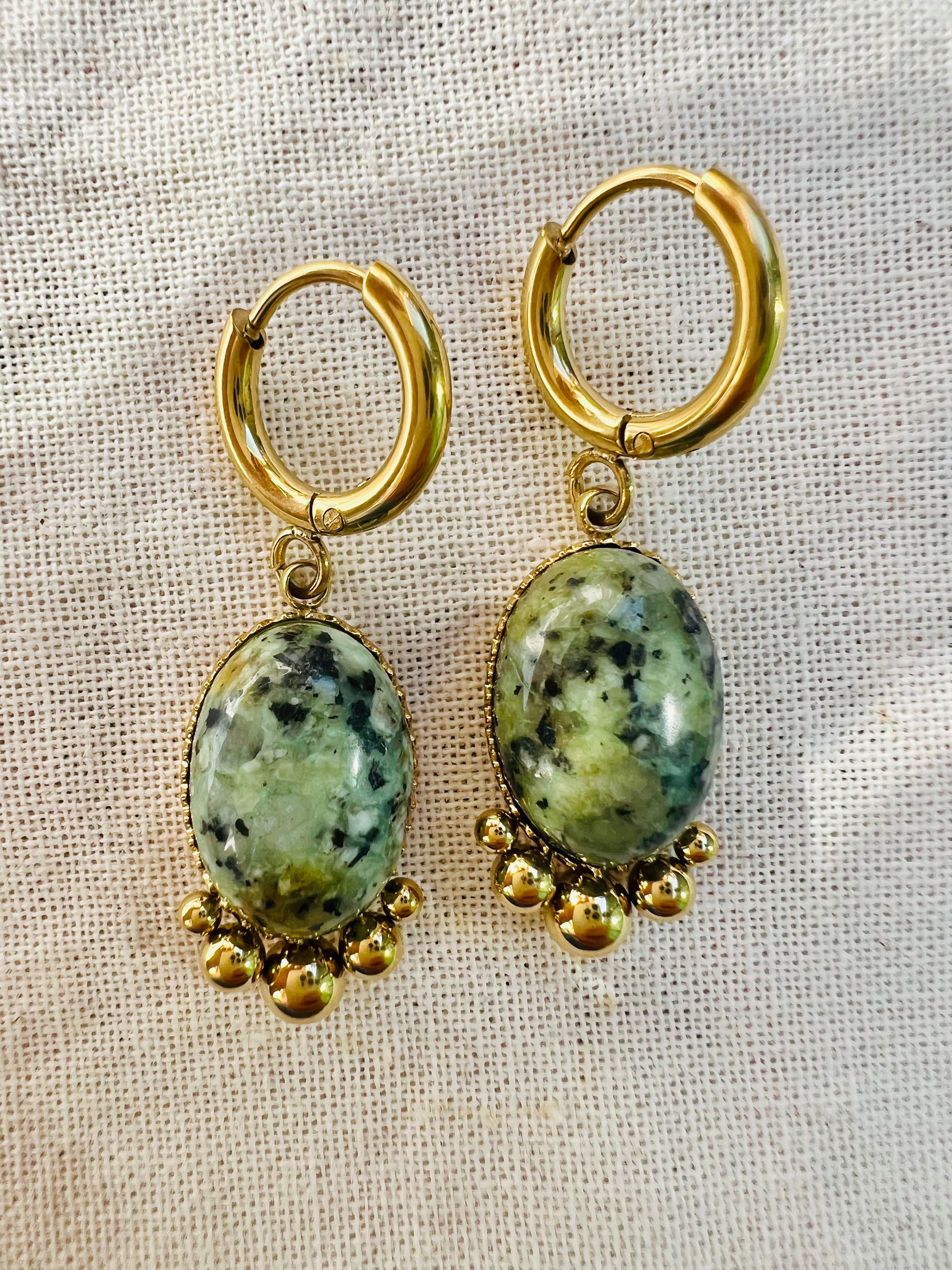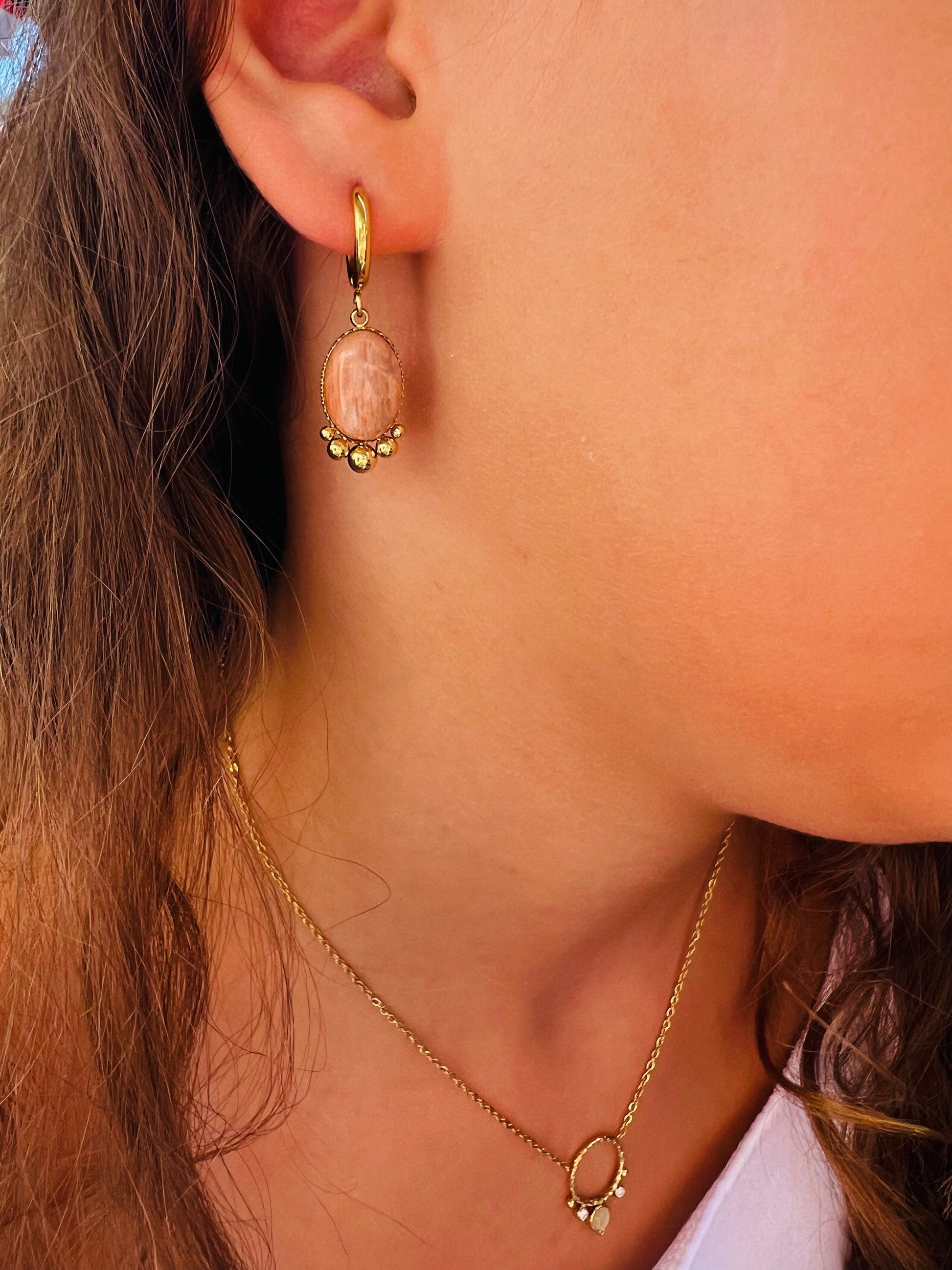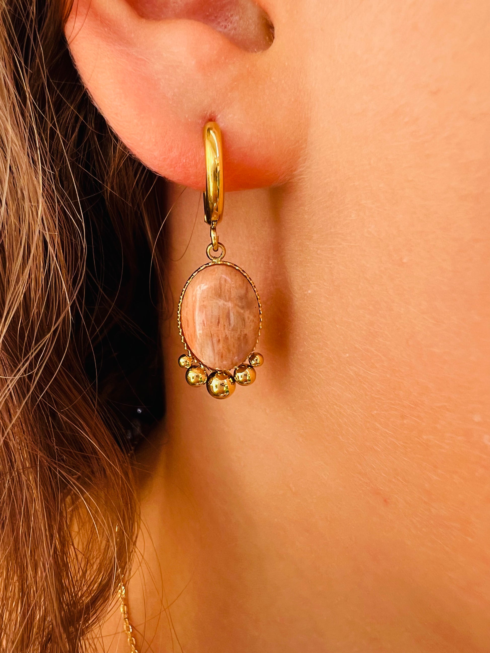✧ Boucles dorées pendantes en acier inoxydable doré et pierres naturelles.