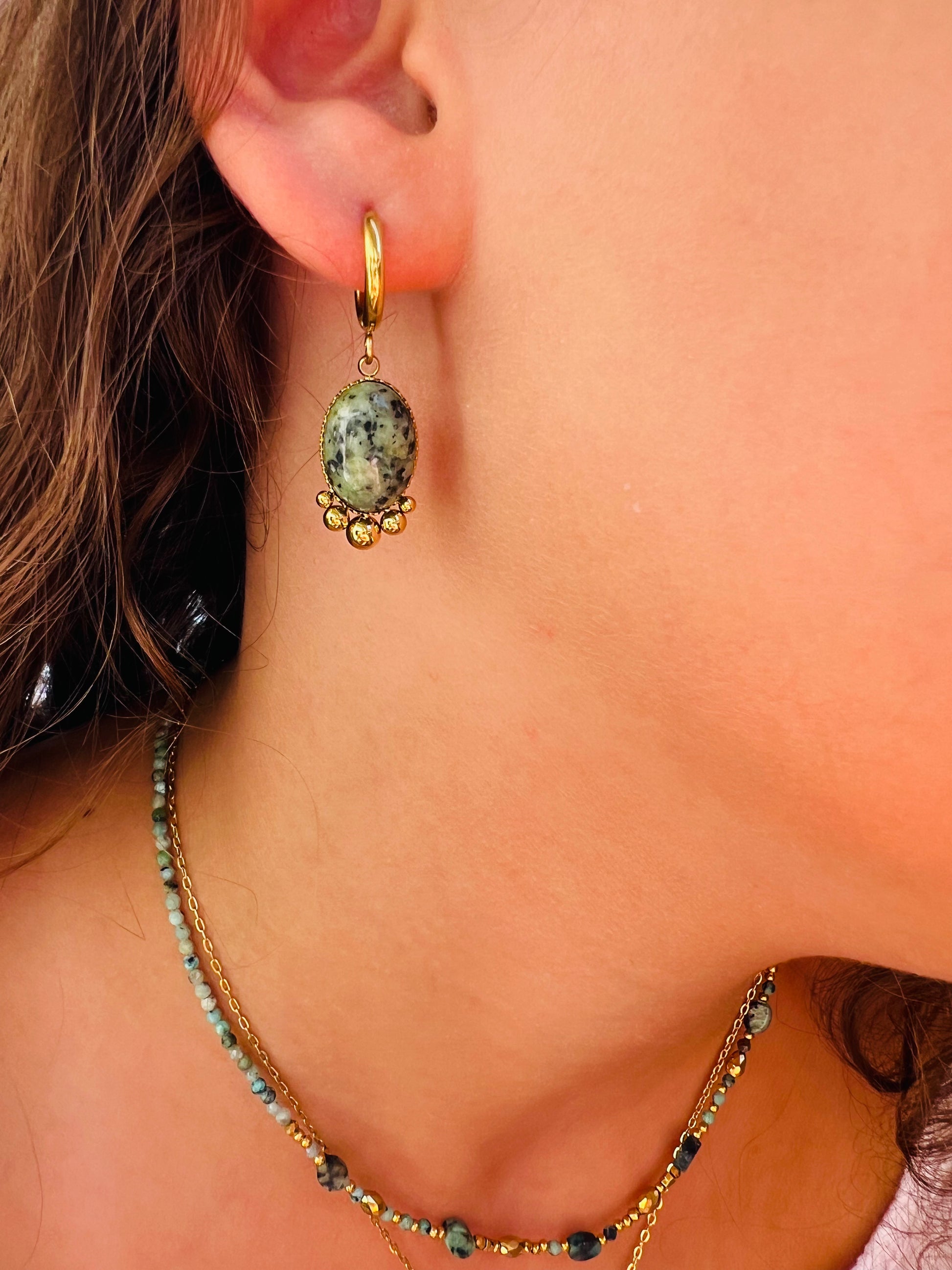 Les boucles Emma illuminent le visage grâce à leur design pendants orné d’une pierre naturelle ovale. Déclinées en turquoise africaine ou en pierre de soleil, elles associent éclat et énergie positive 🌿.