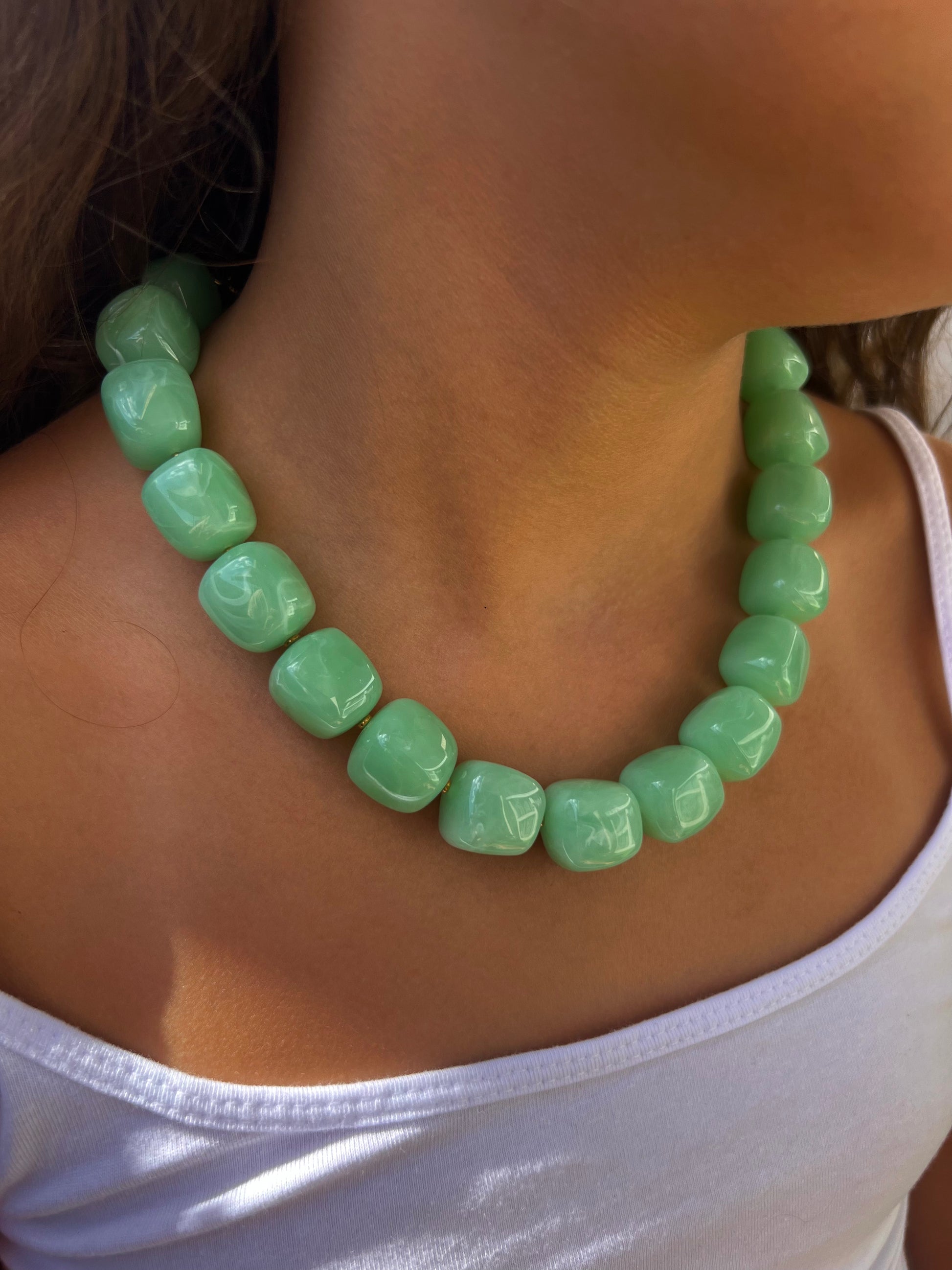✧ Collier en acier inoxydable avec perles carrées en résine et fermoir mousqueton.