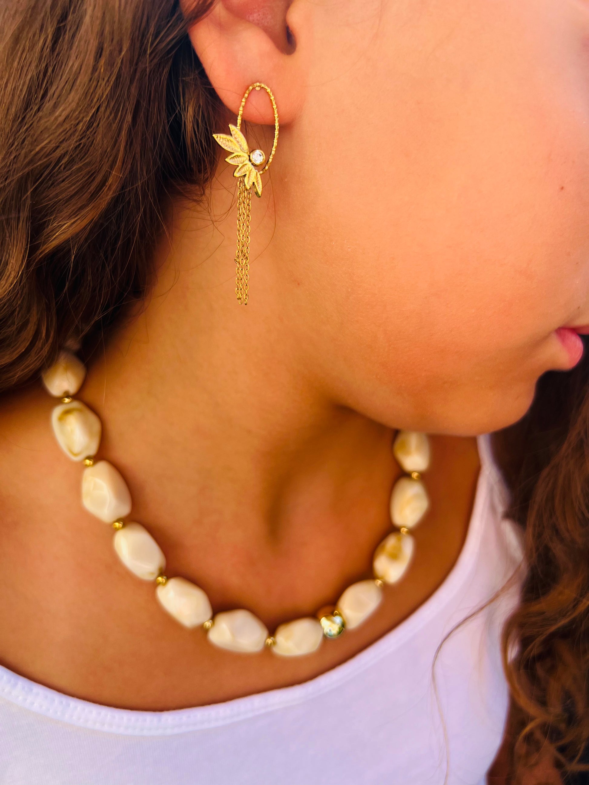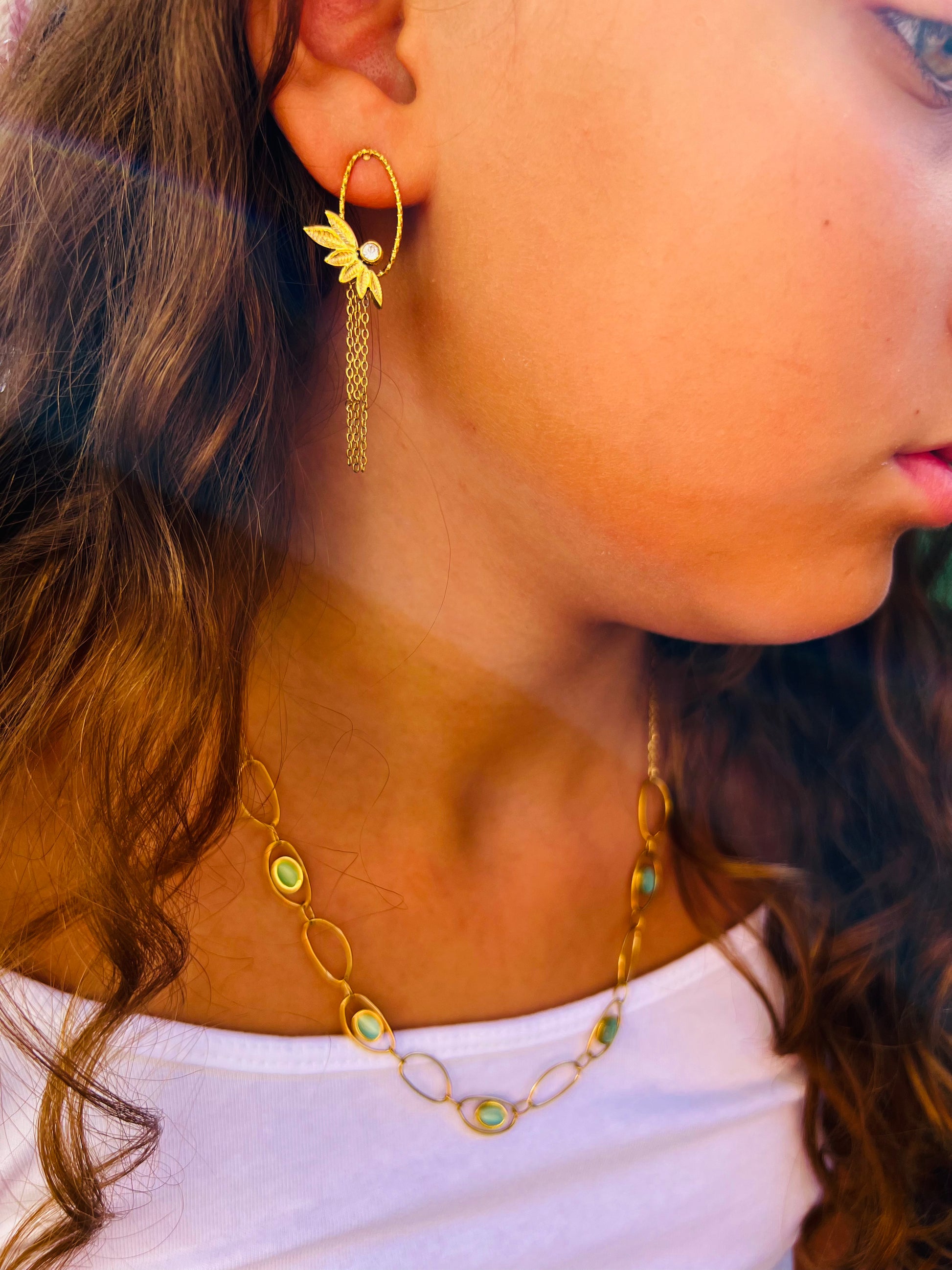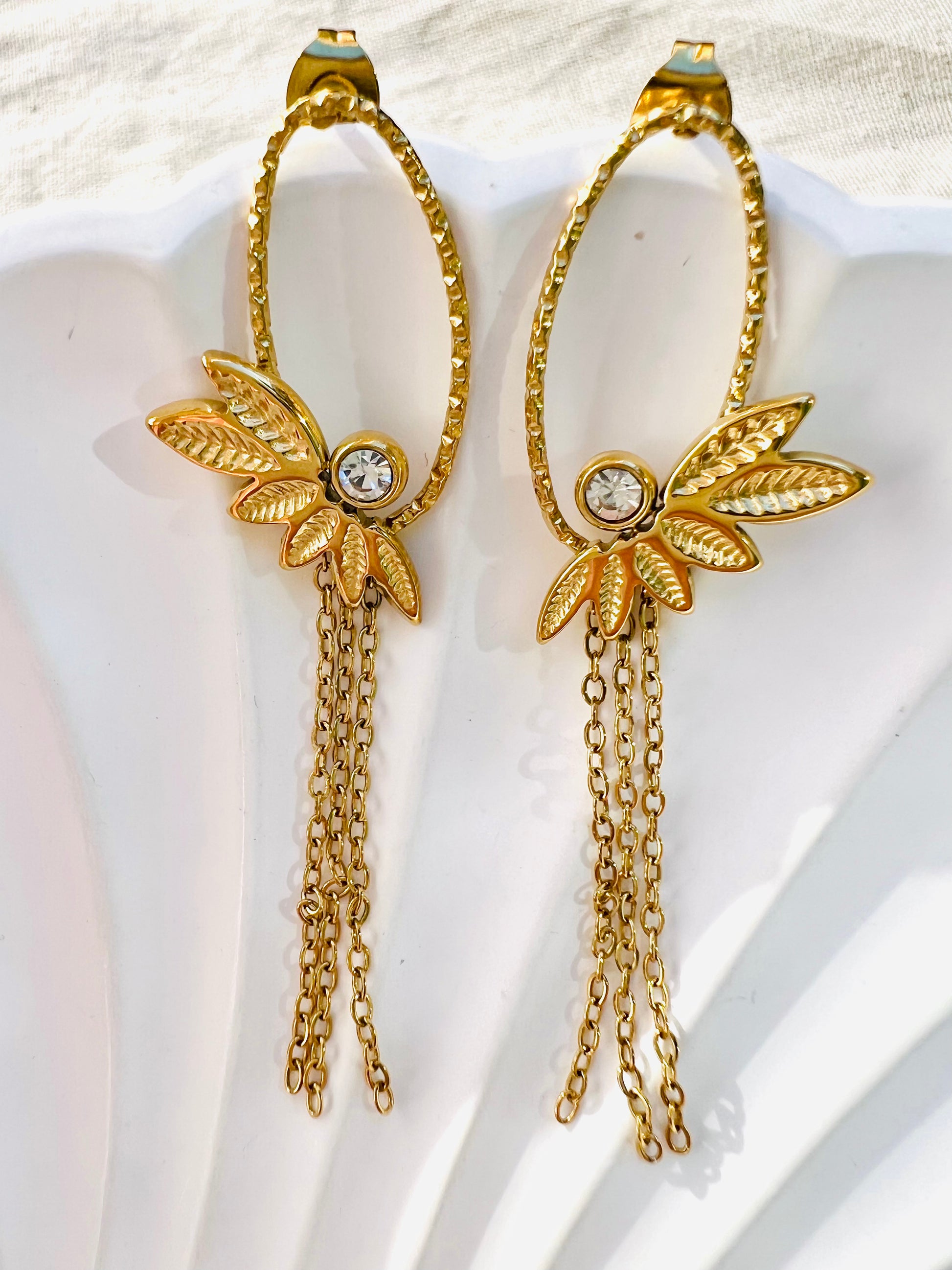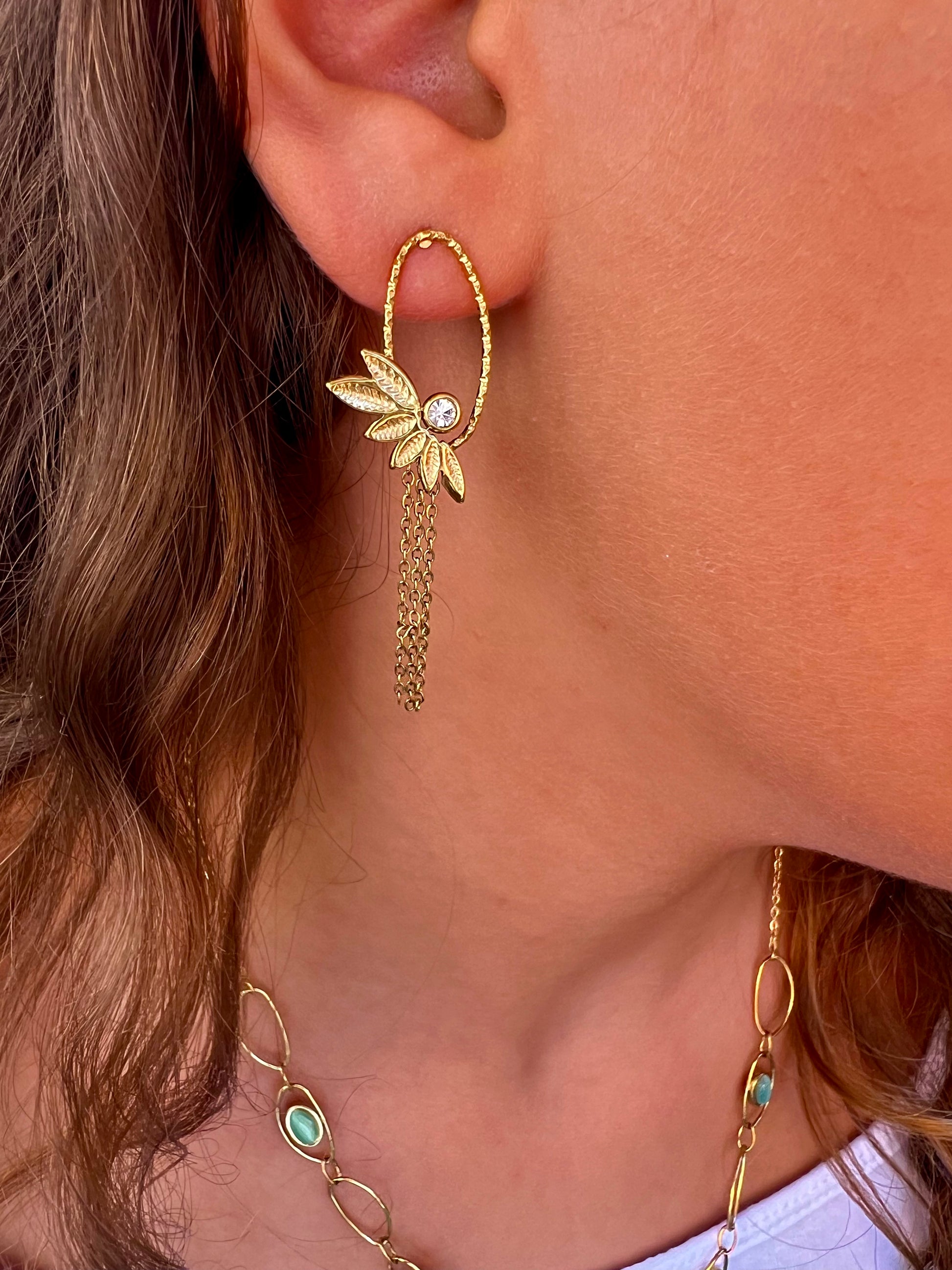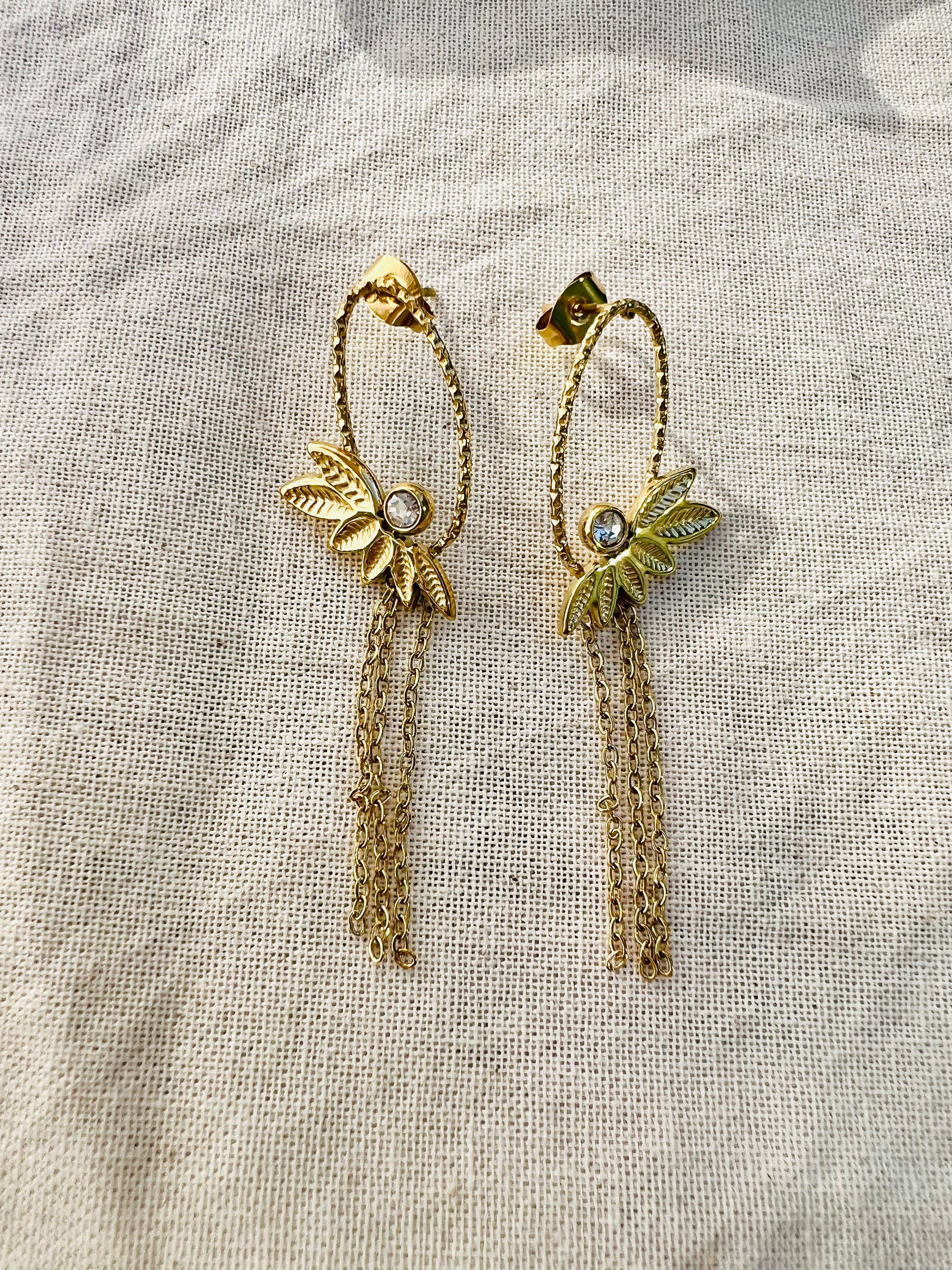 Les boucles Erika offrent un charme délicat avec leurs motifs de feuilles décorés de zirconium. De fines chaînes pendantes ajoutent un mouvement gracieux et lumineux 🌸.