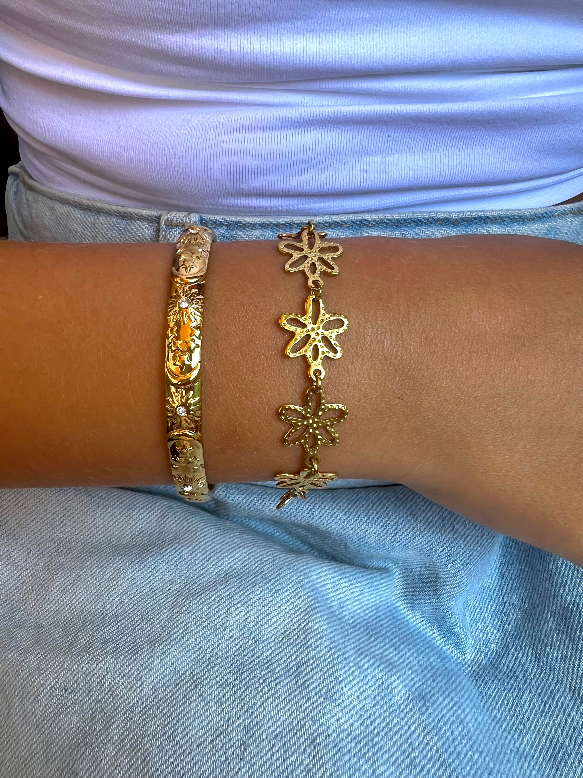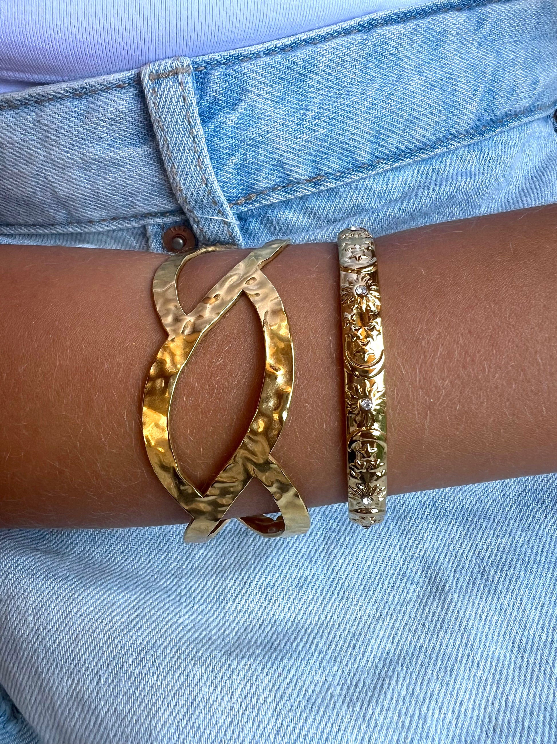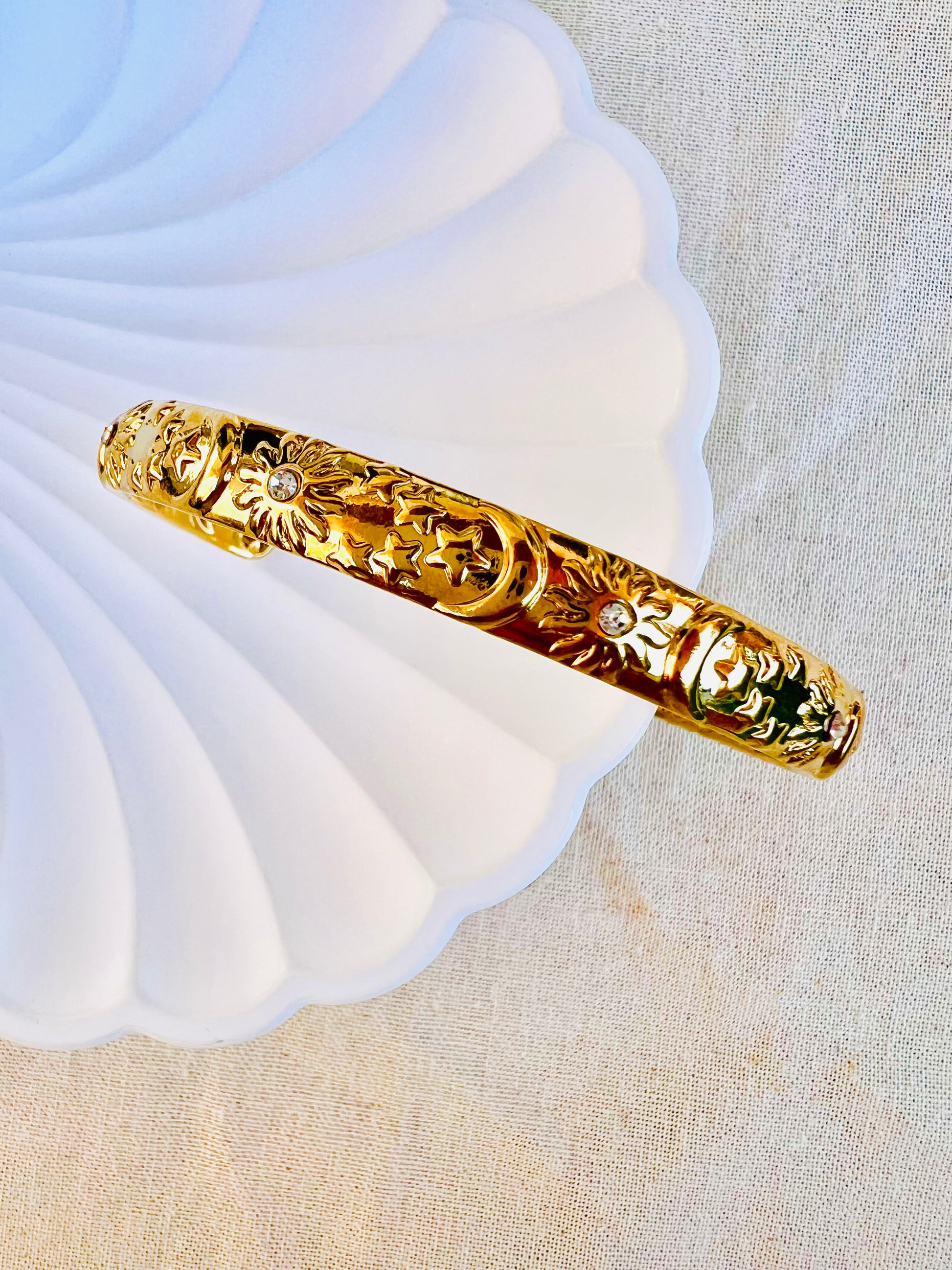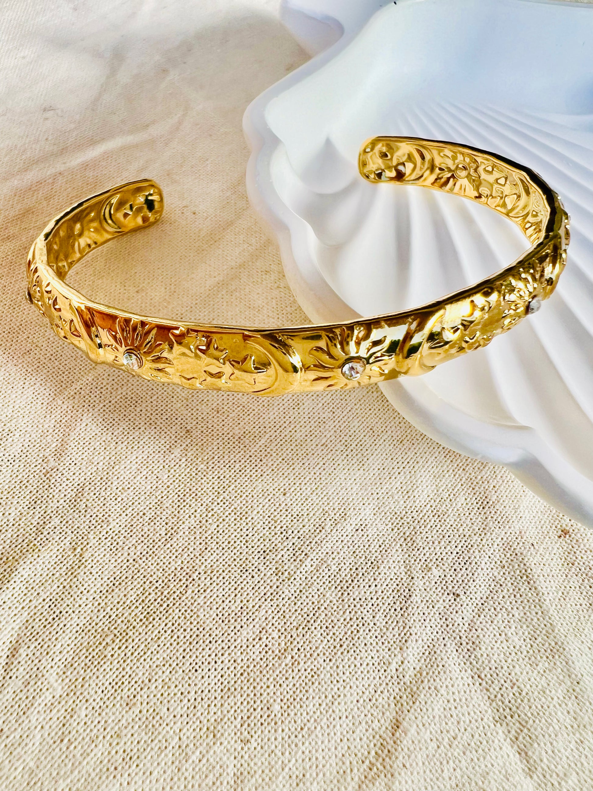 Le jonc Gaia en acier fin est orné de délicats motifs d’étoiles, lune et soleil, sublimés par un oxyde de zirconium scintillant au centre de chaque soleil. Un bijou poétique et élégant qui illumine votre poignet avec grâce.