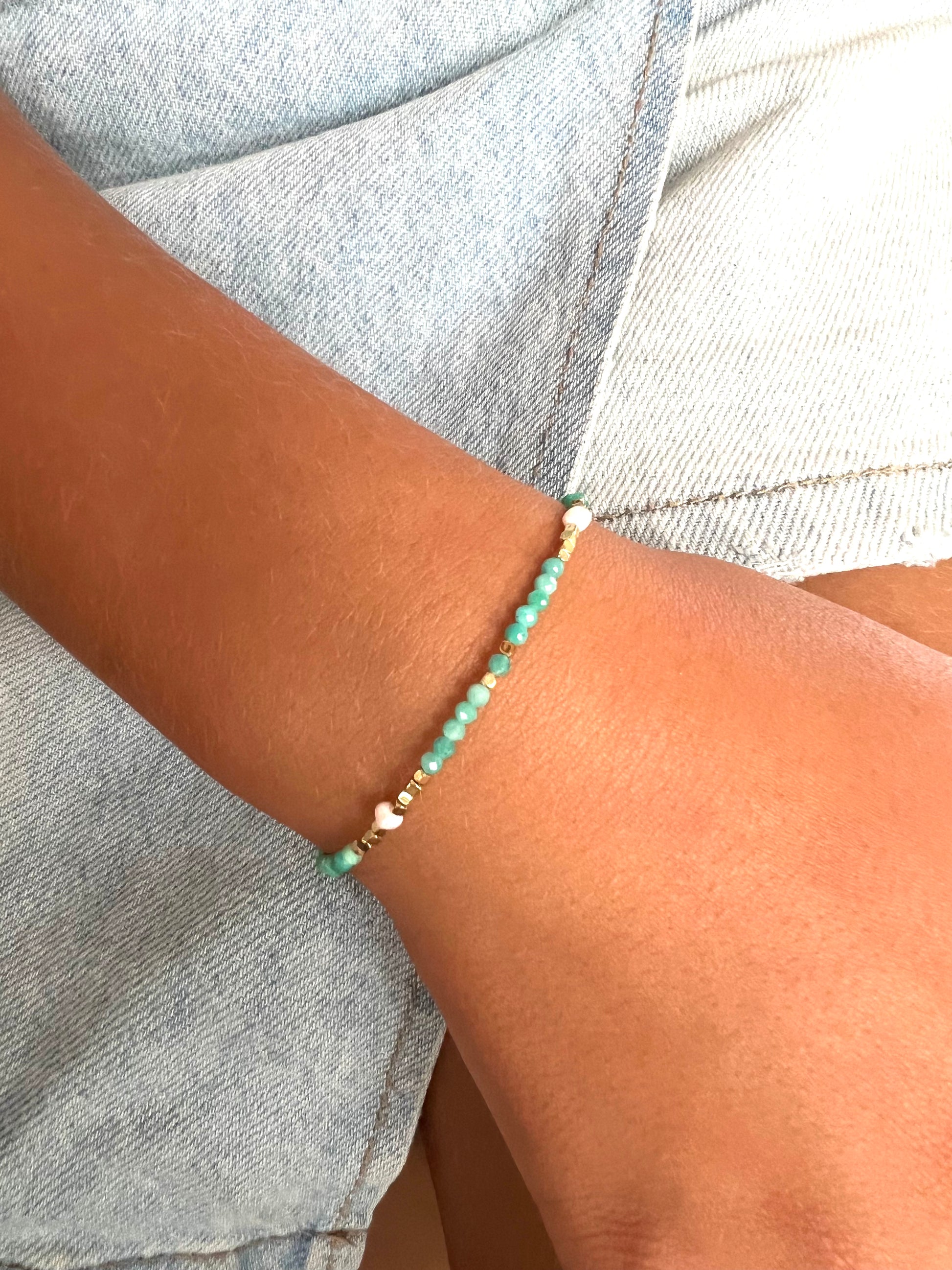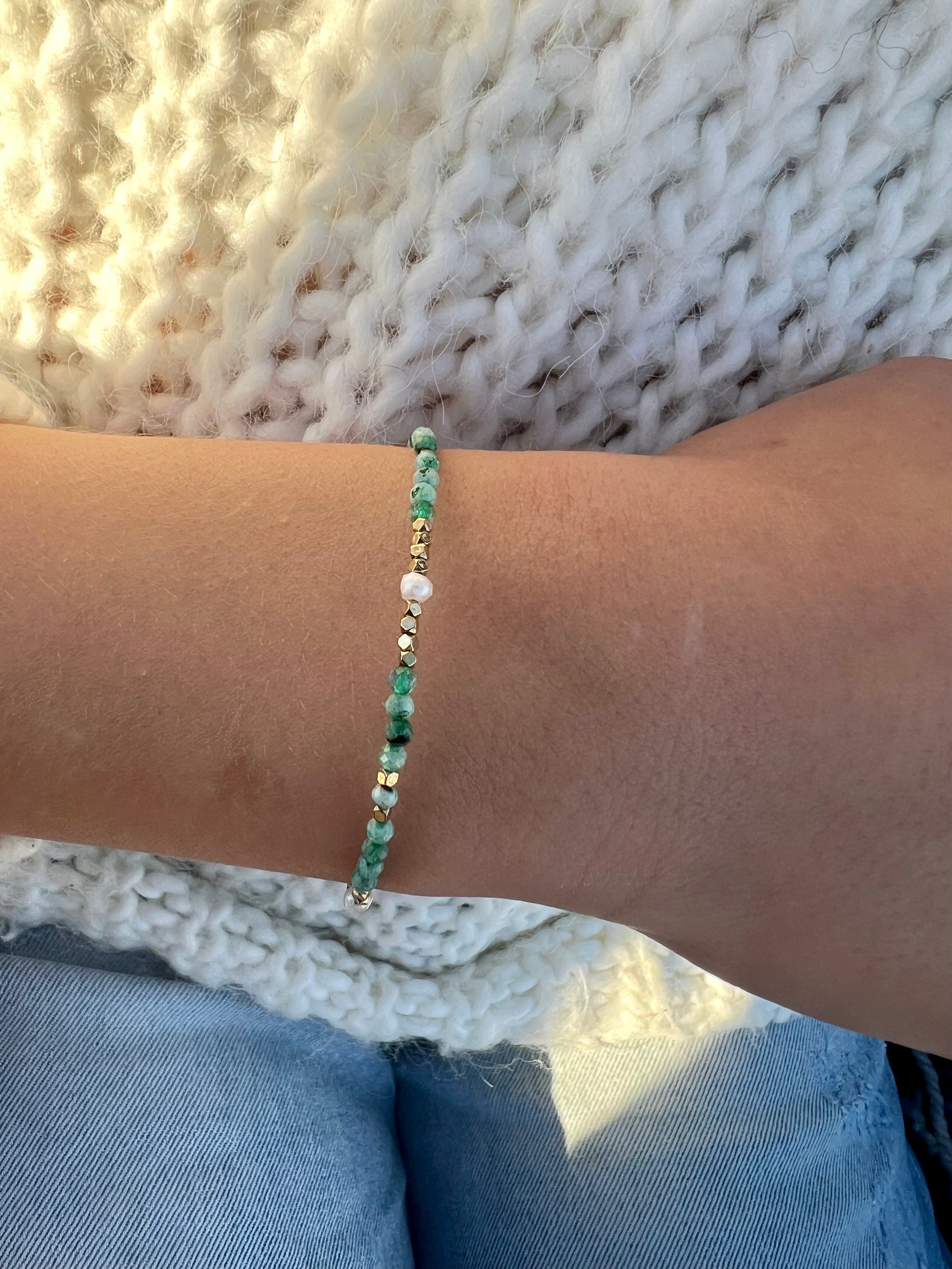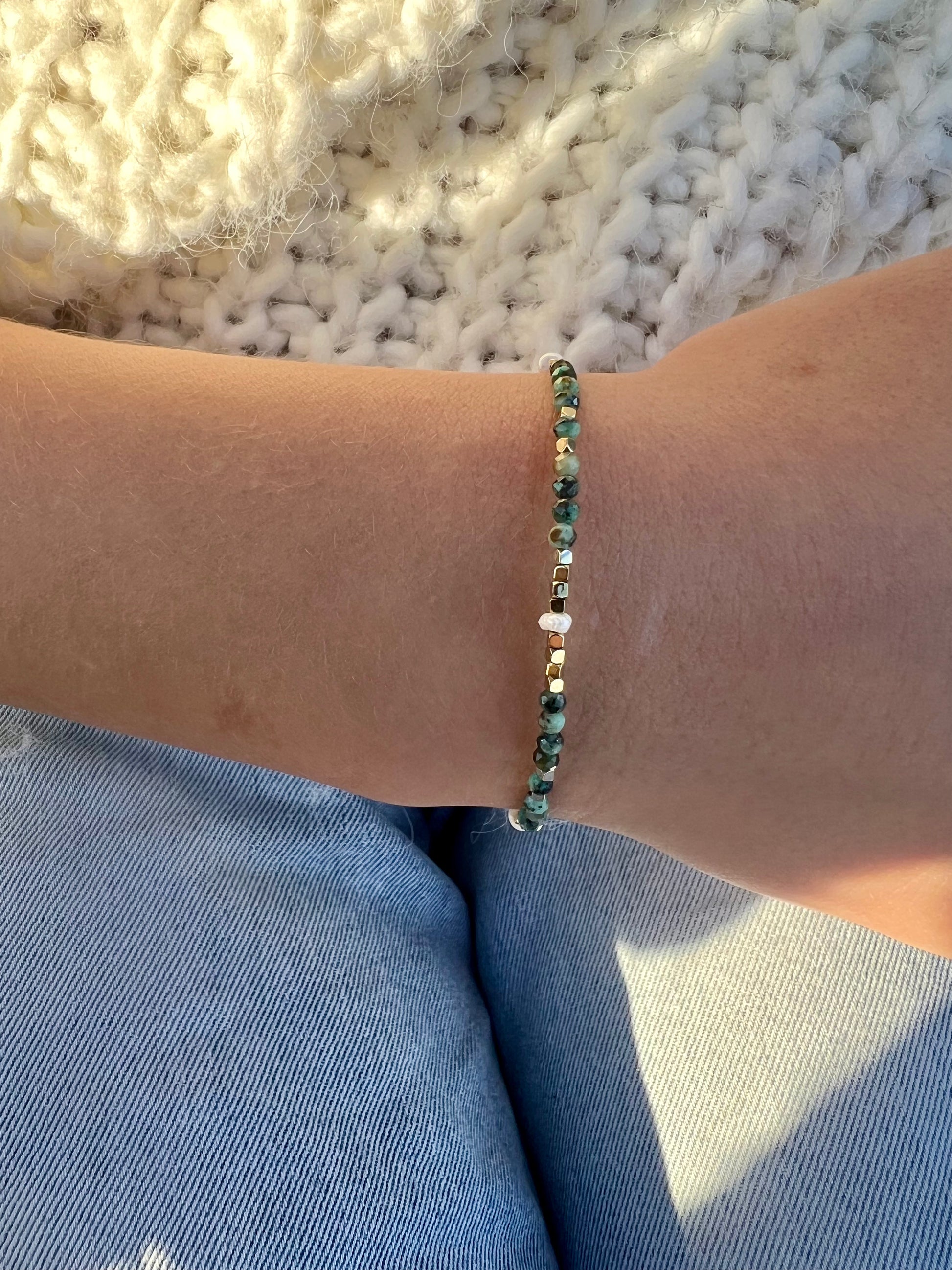 ✧ Bracelet doré en acier inoxydable, perles d'eau douce et pierre naturelle.