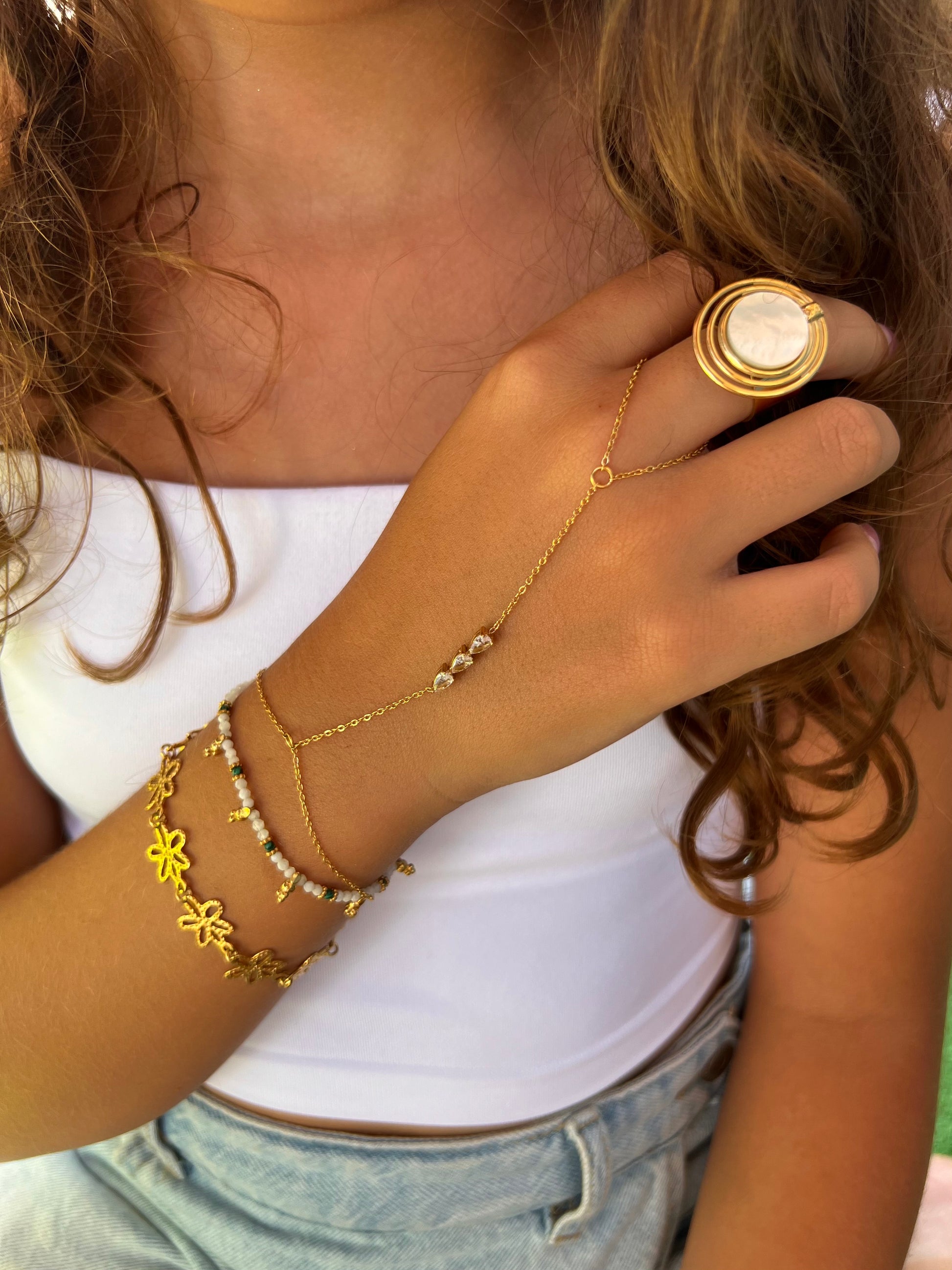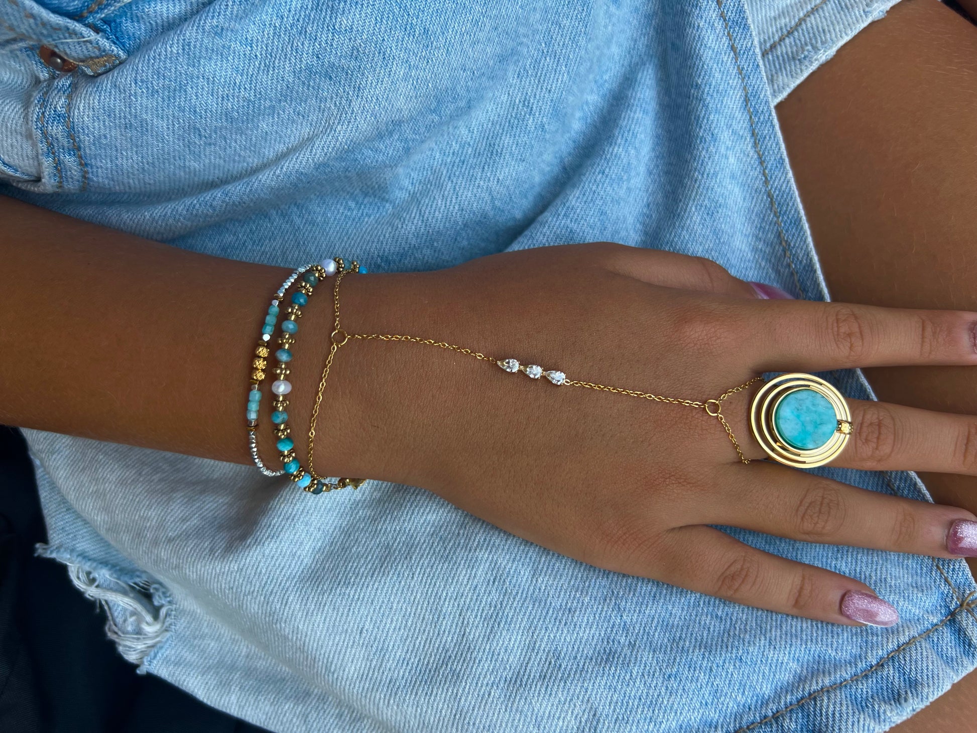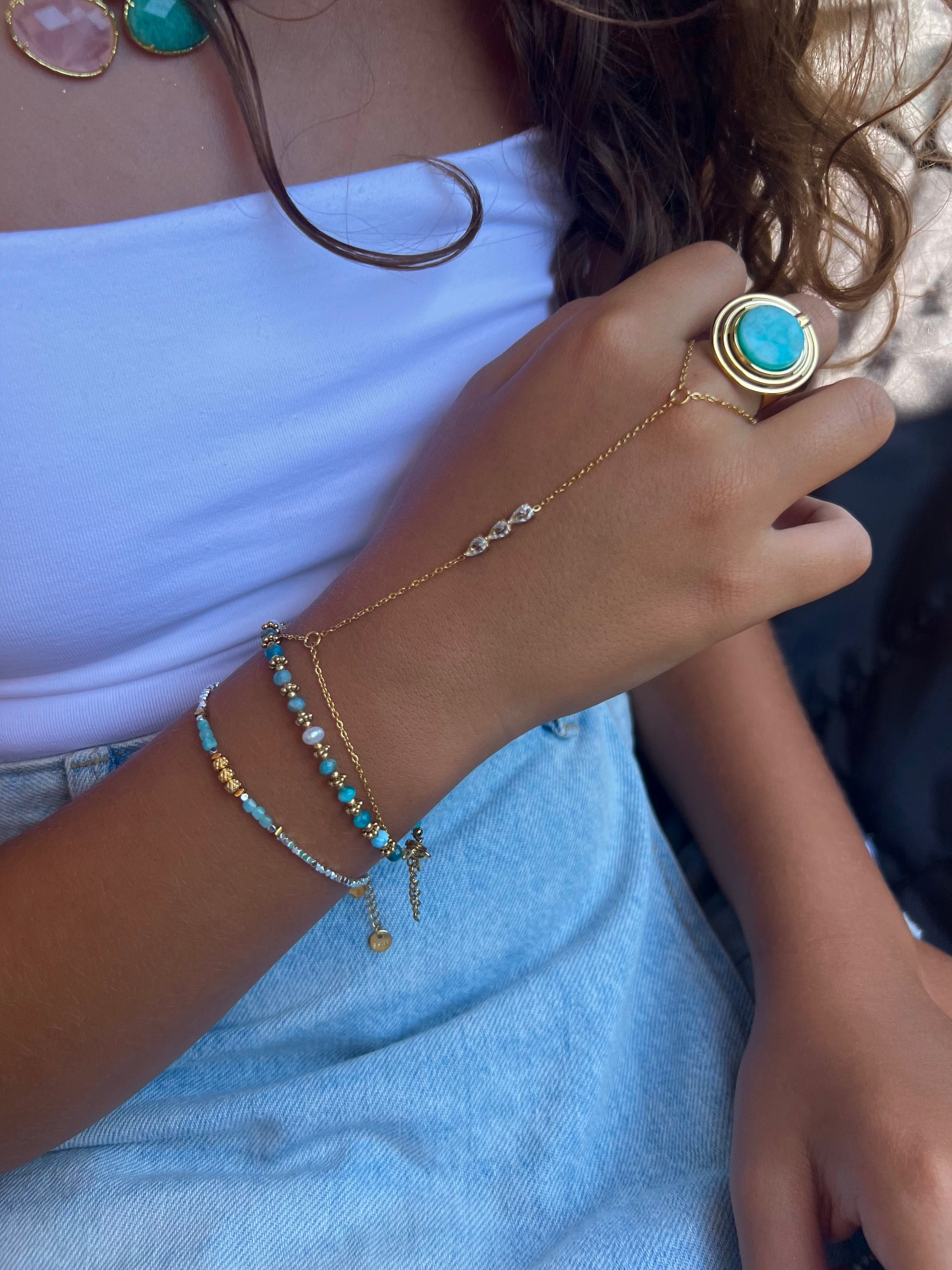 Disponible en sable d’or, amazonite ou nacre blanche, elle apporte une note solaire à chaque tenue 🌞.