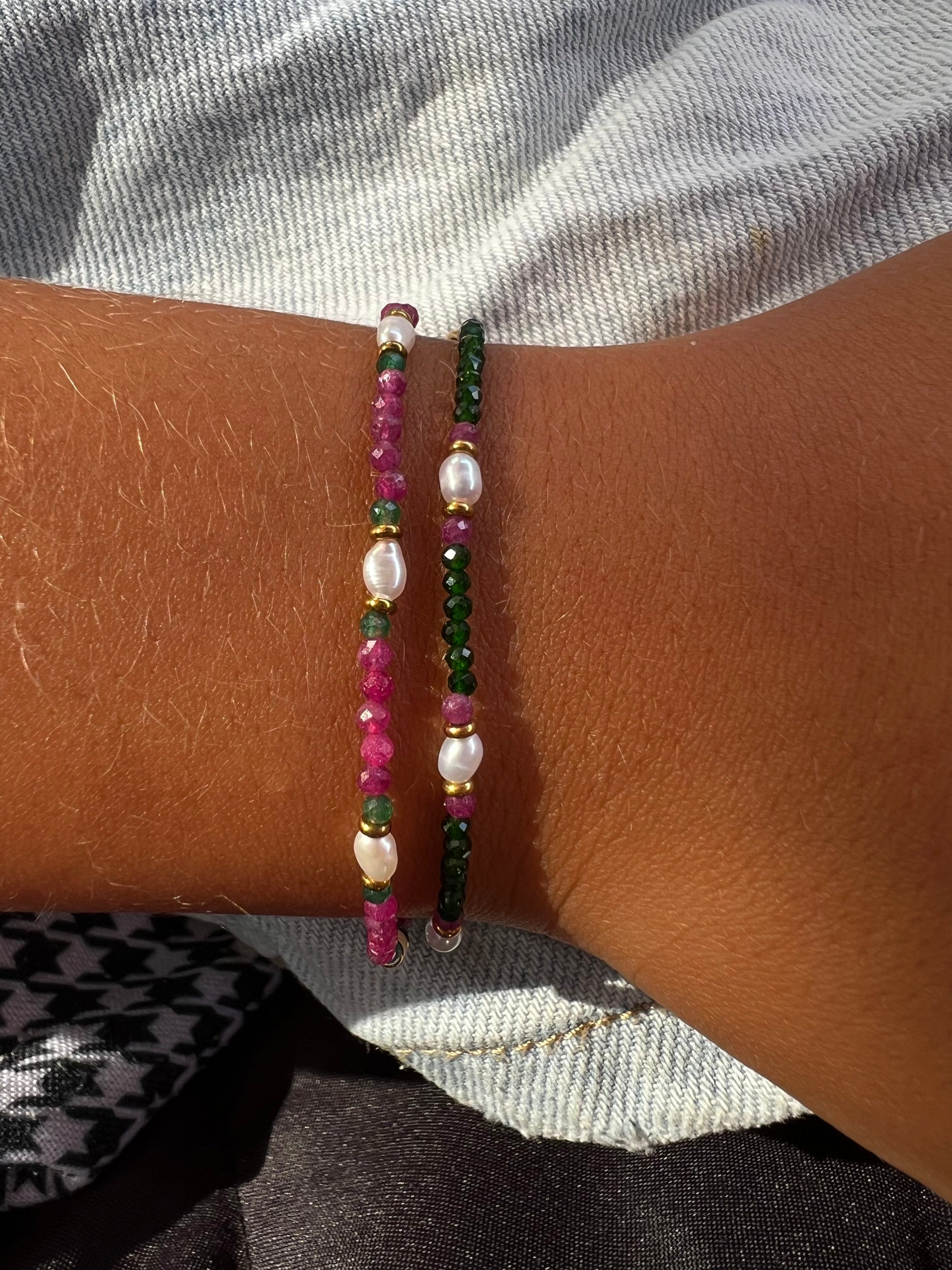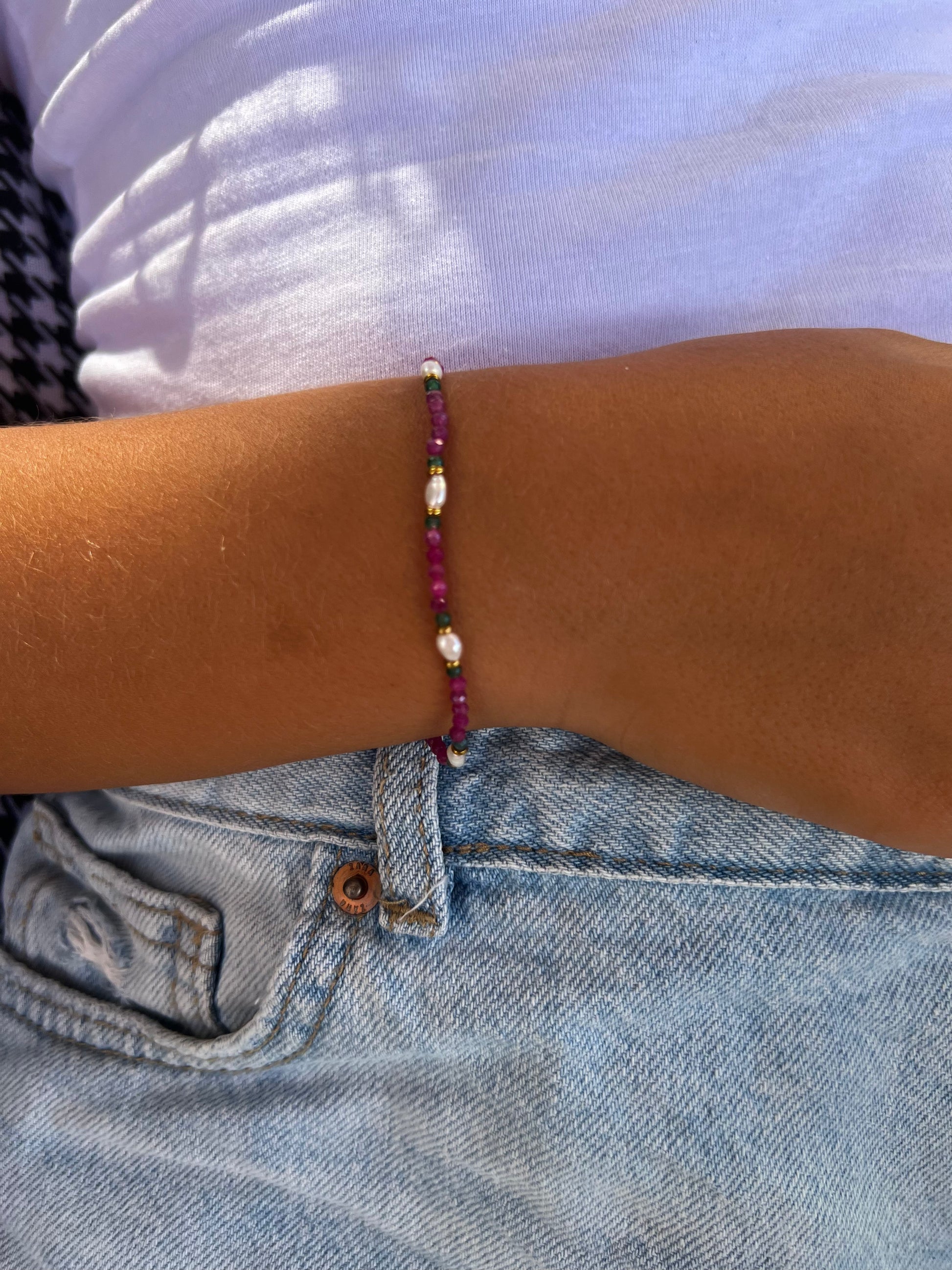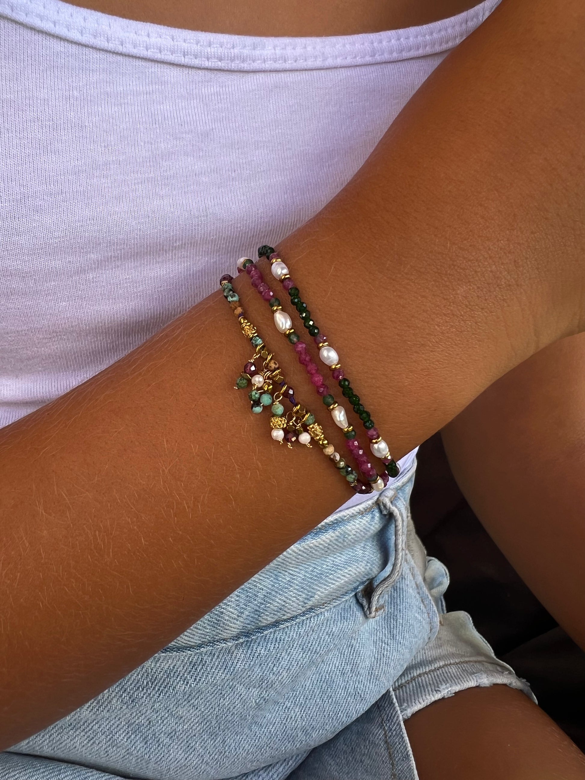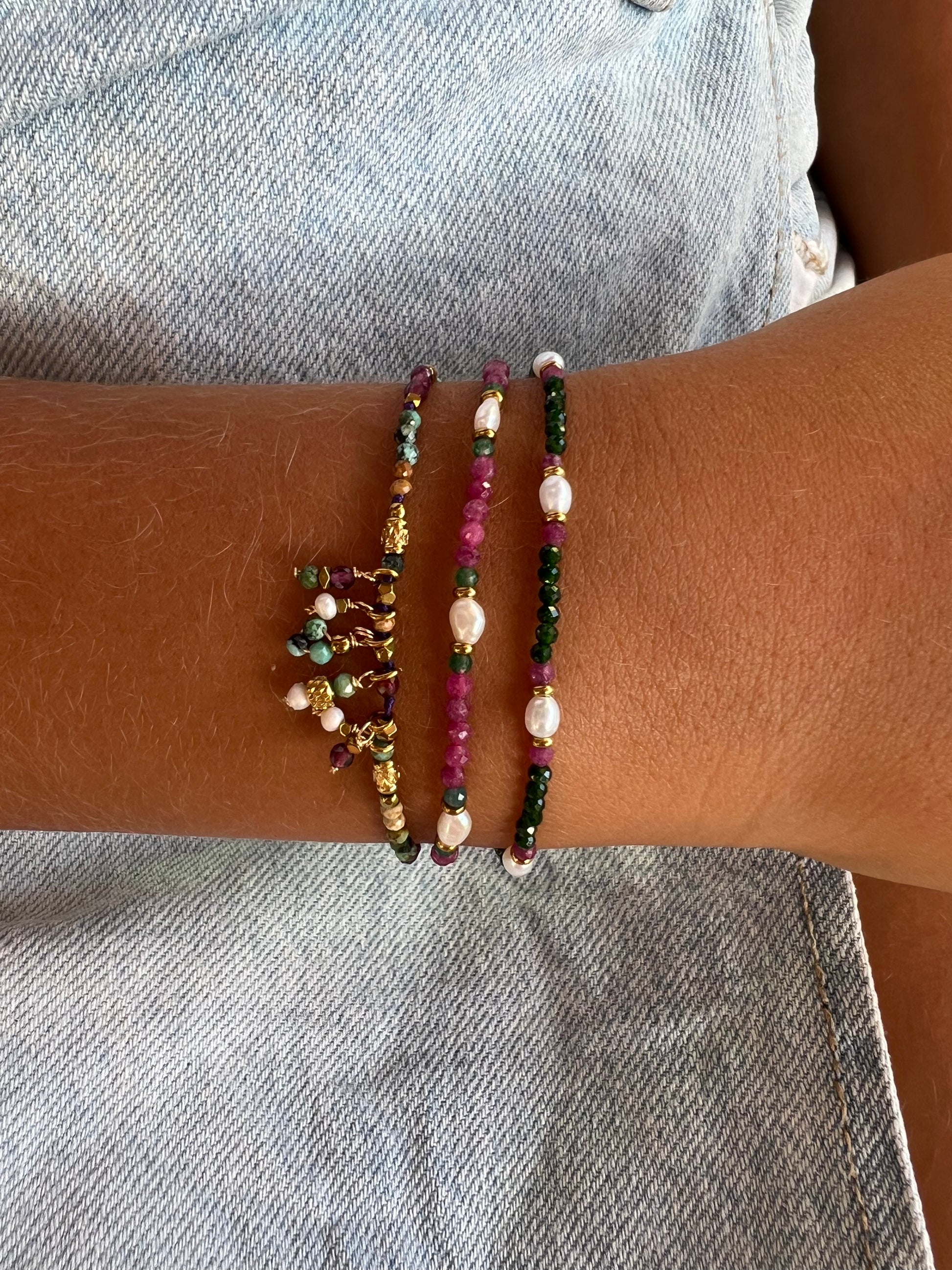 Le bracelet Giuseppa combine perles d’eau douce et pierres naturelles : sable d’or, pyrite, rubis, tourmaline verte, zircon, opale rose, pour une allure raffinée et chaleureuse.