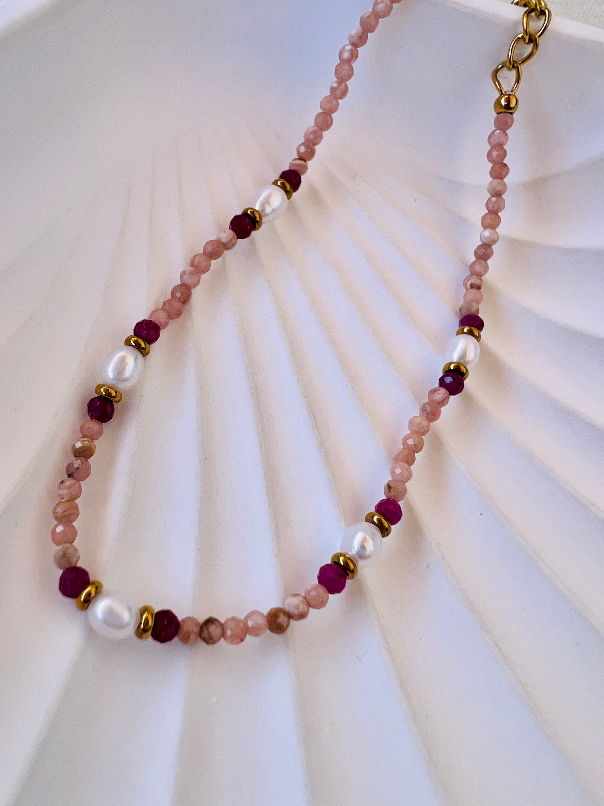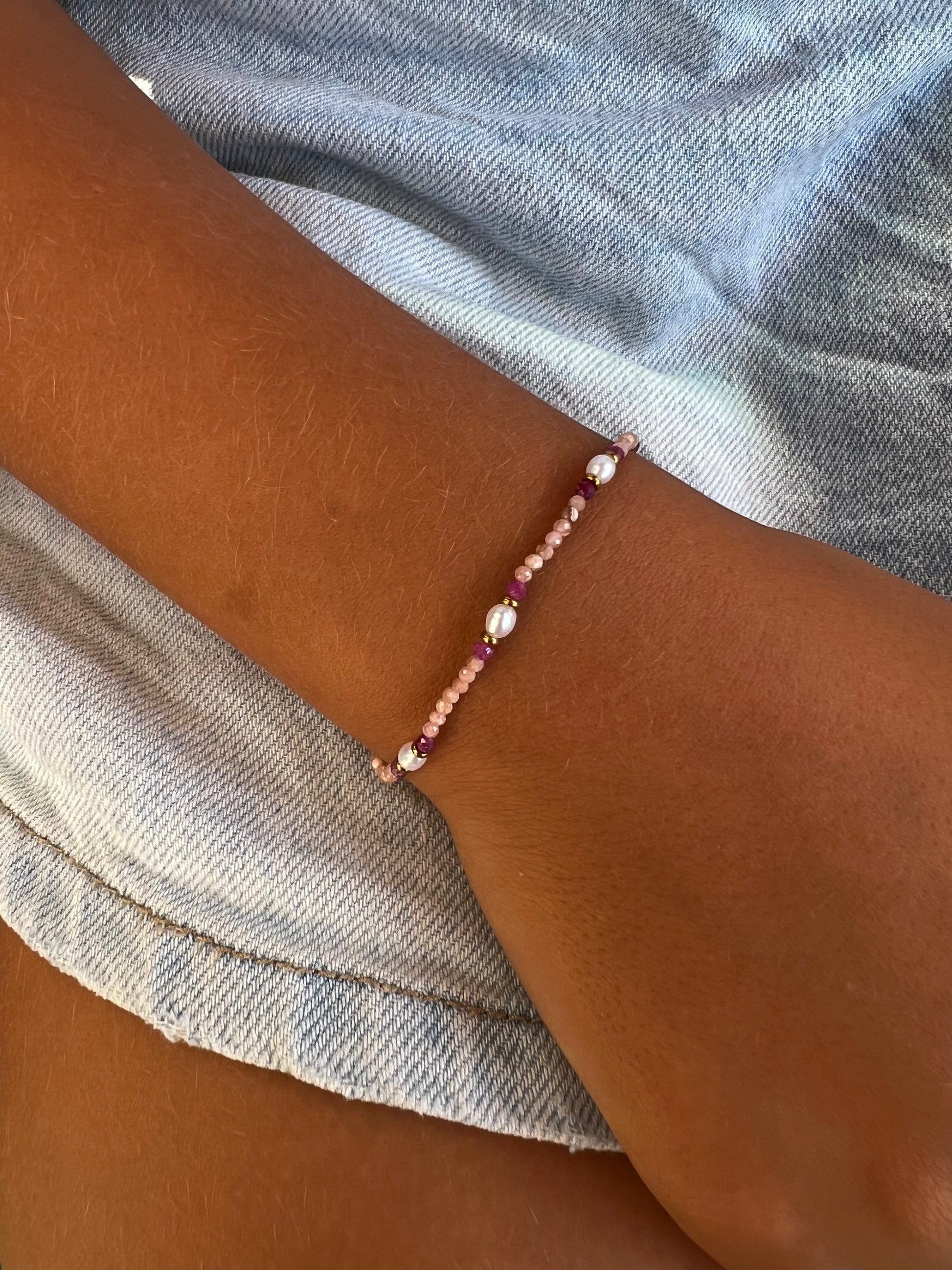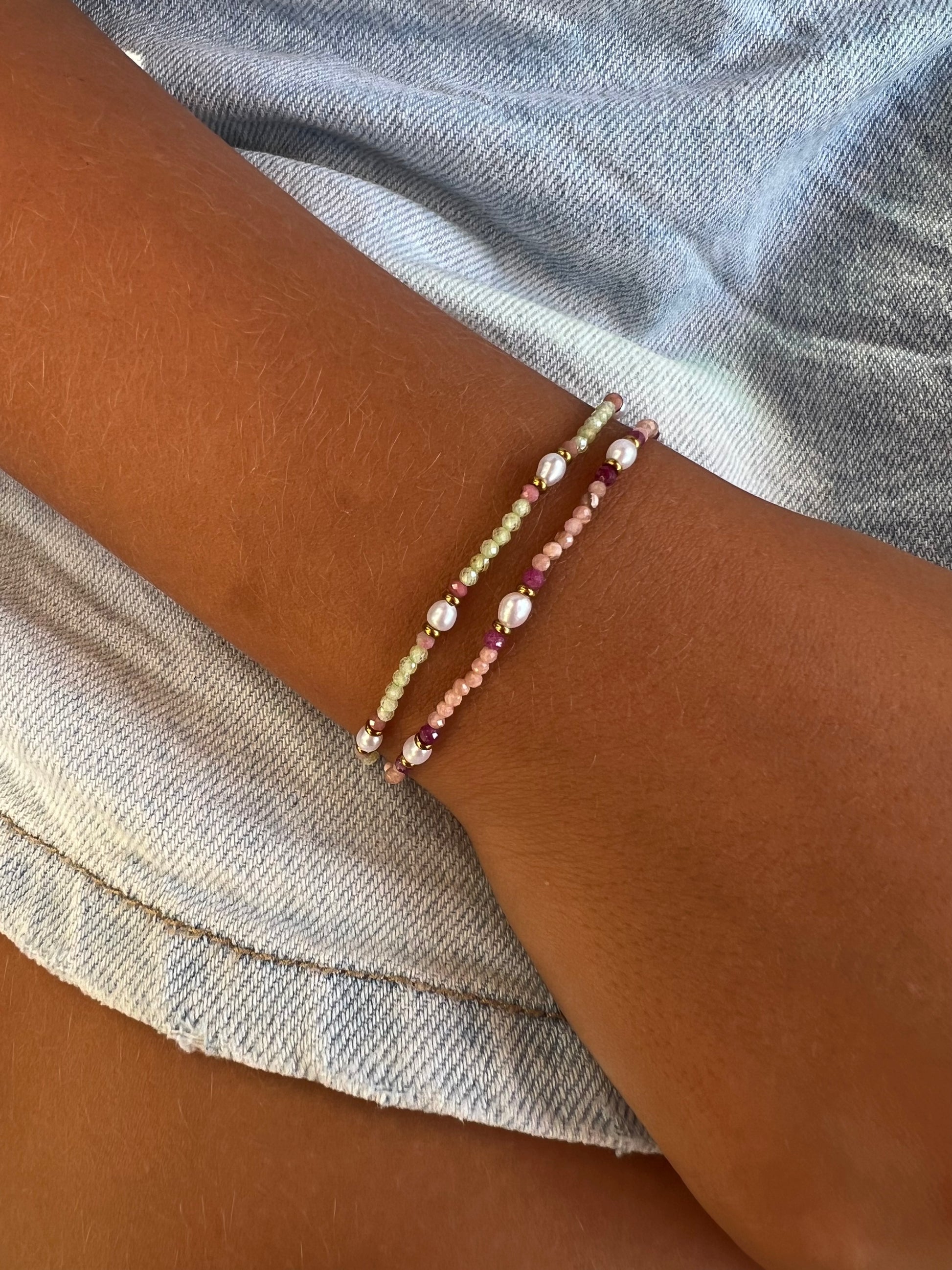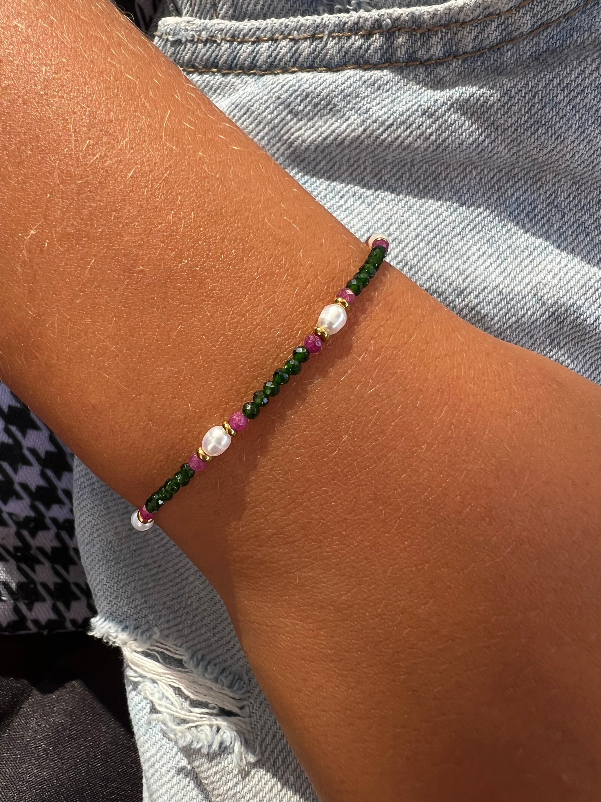 Le bracelet Giuseppa combine perles d’eau douce et pierres naturelles : sable d’or, pyrite, rubis, tourmaline verte, zircon, opale rose, pour une allure raffinée et chaleureuse.