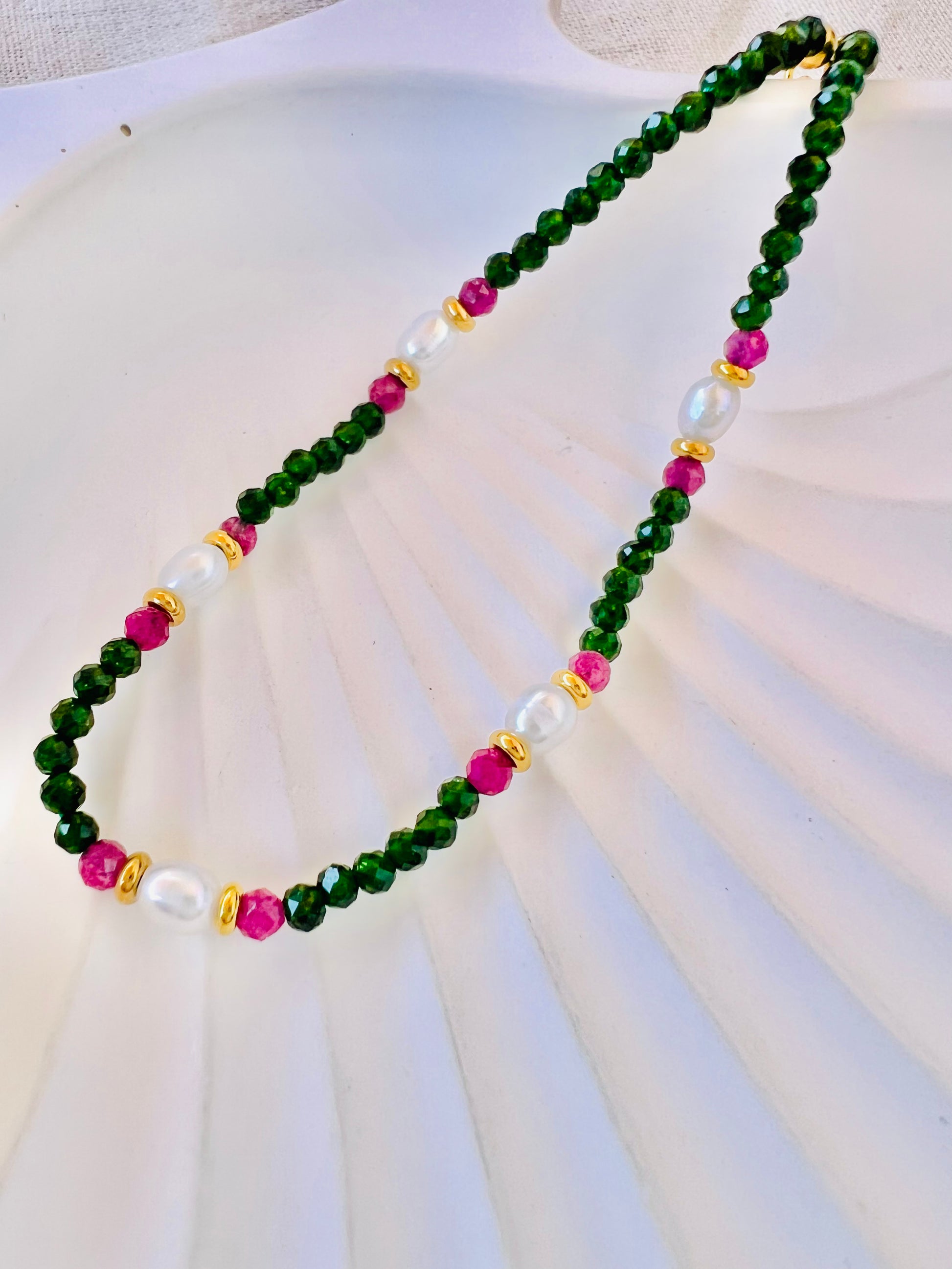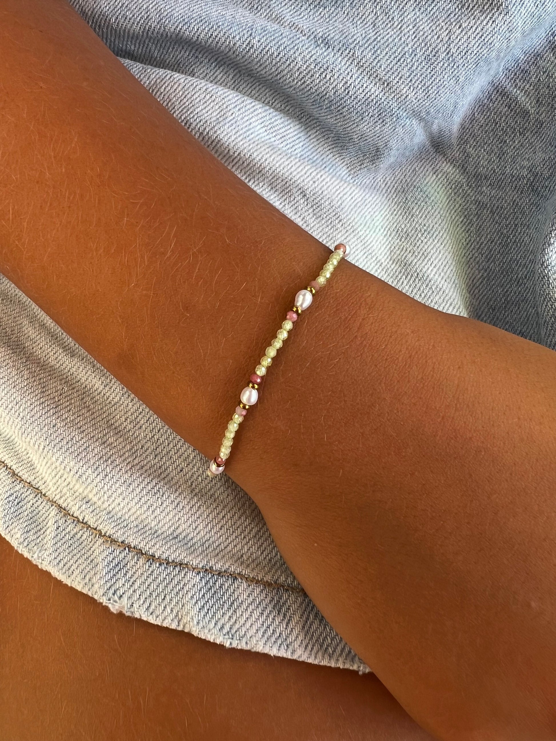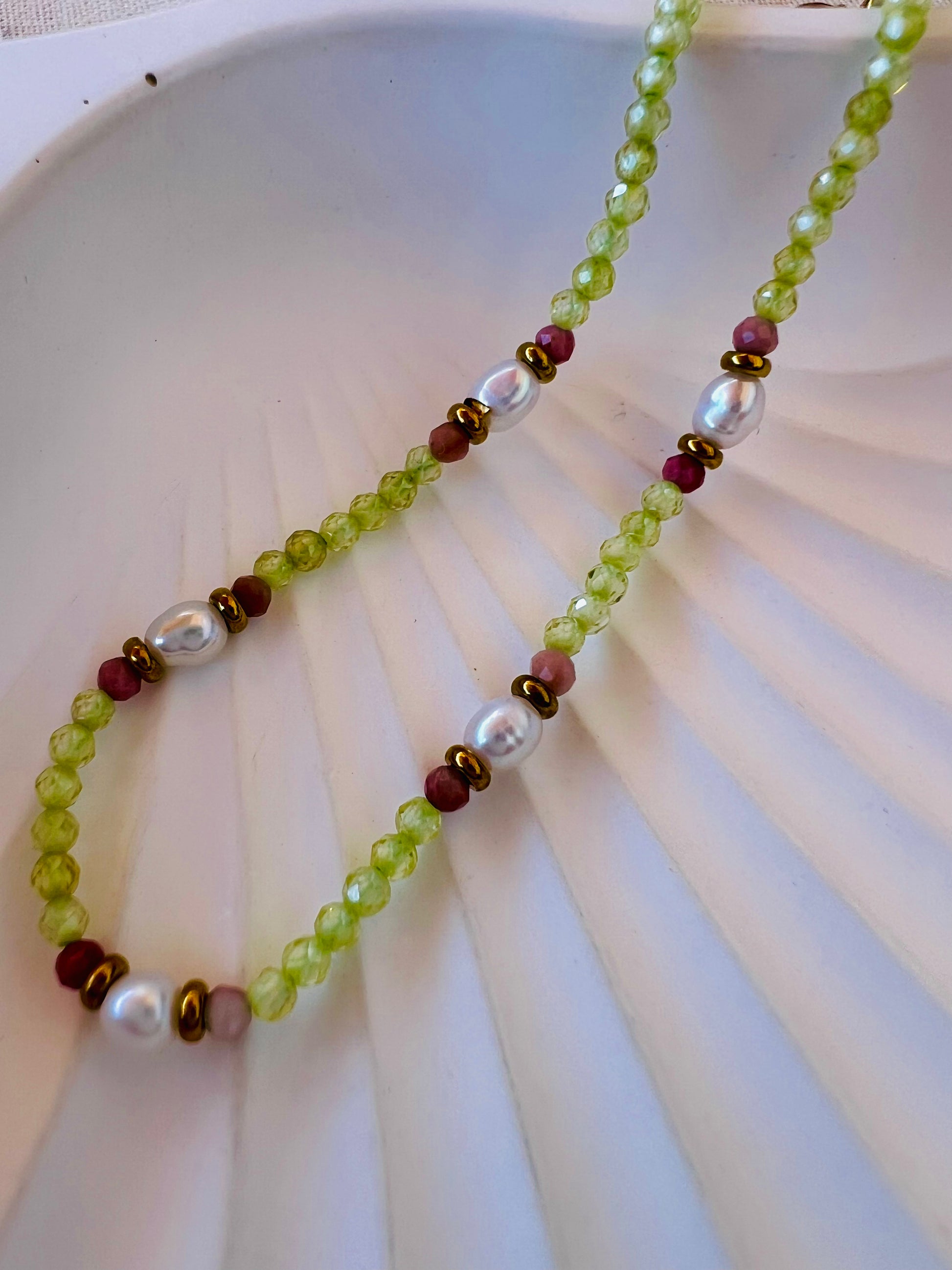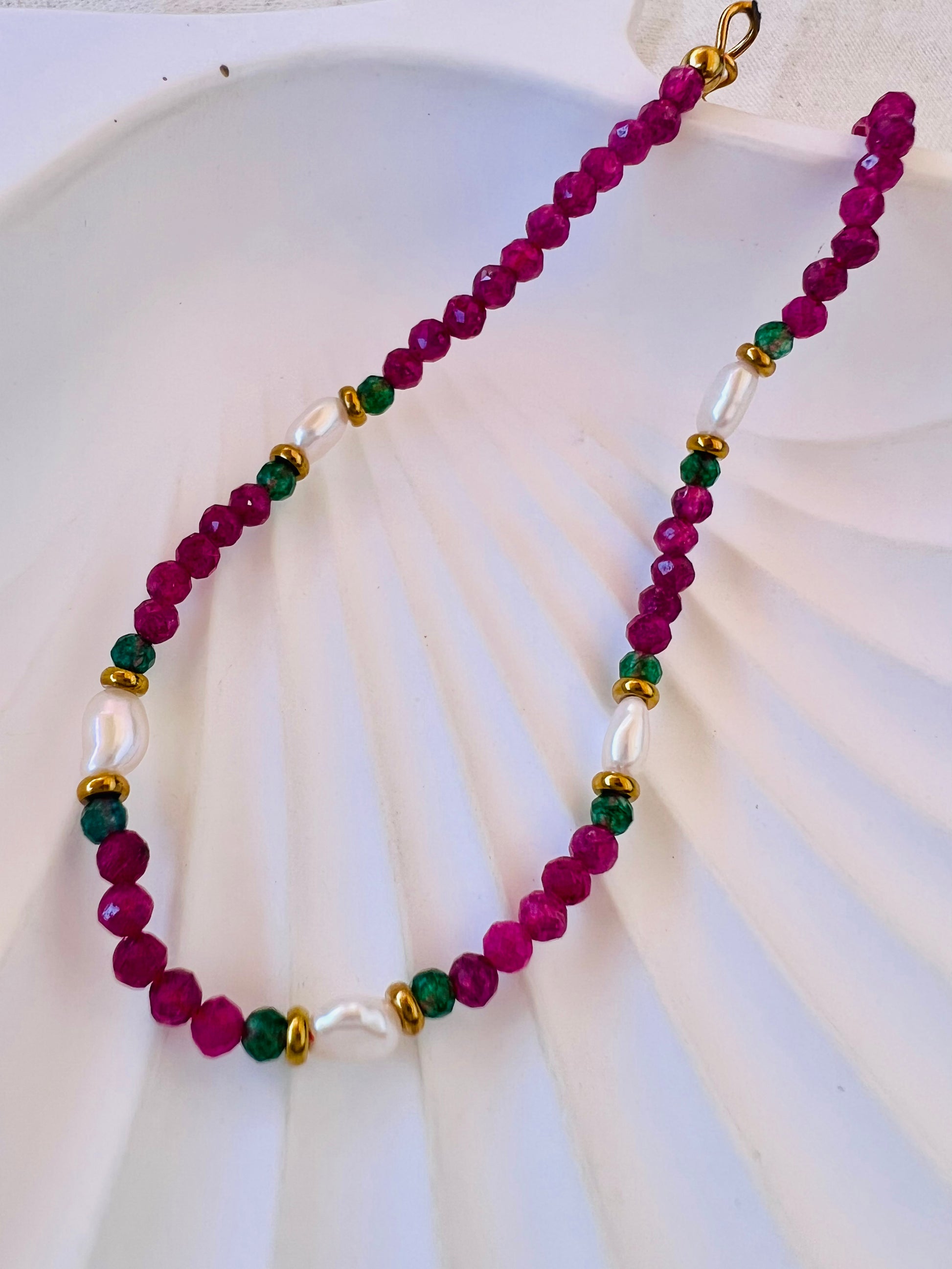 Le bracelet Giuseppa combine perles d’eau douce et pierres naturelles : sable d’or, pyrite, rubis, tourmaline verte, zircon, opale rose, pour une allure raffinée et chaleureuse.