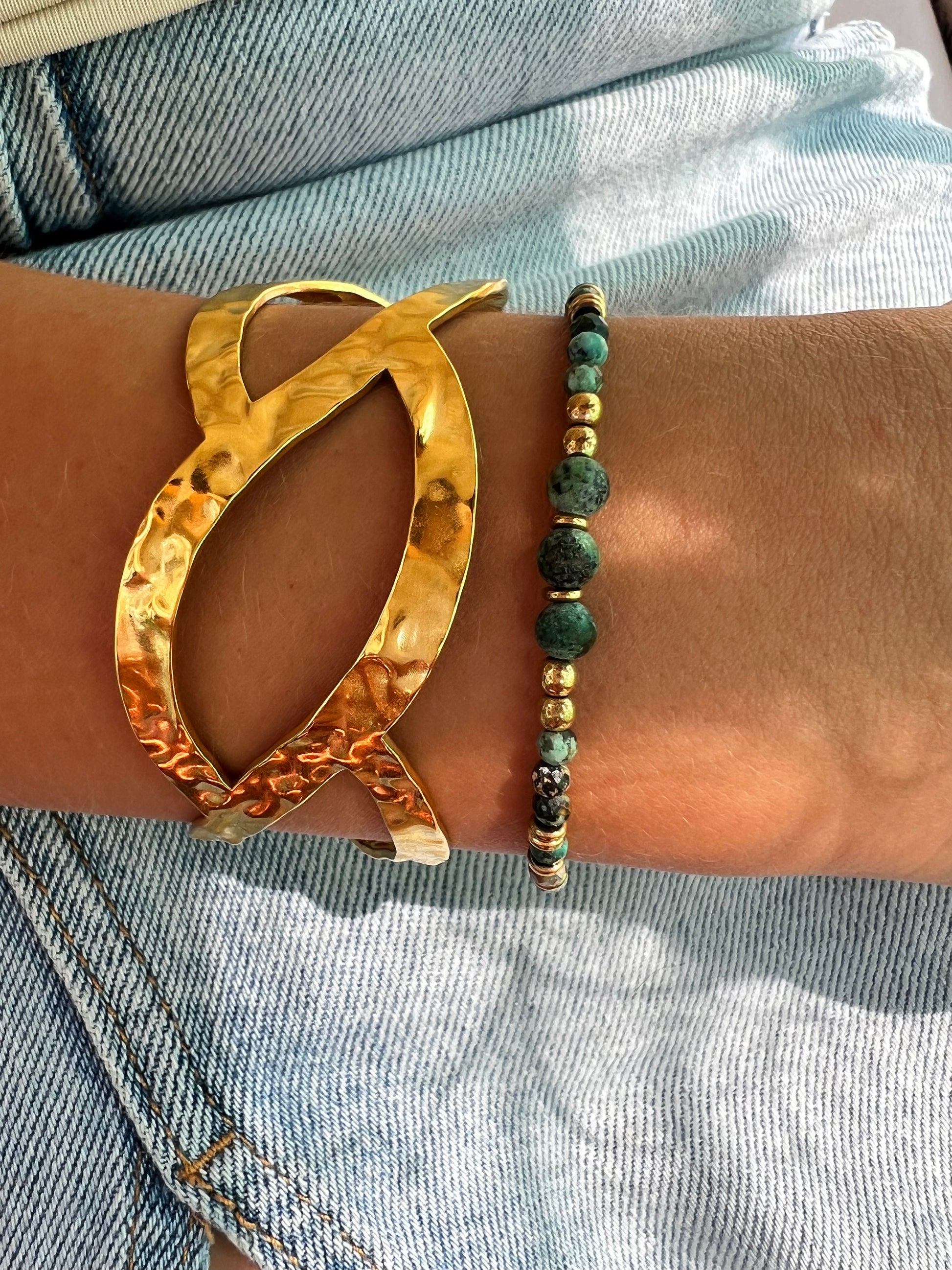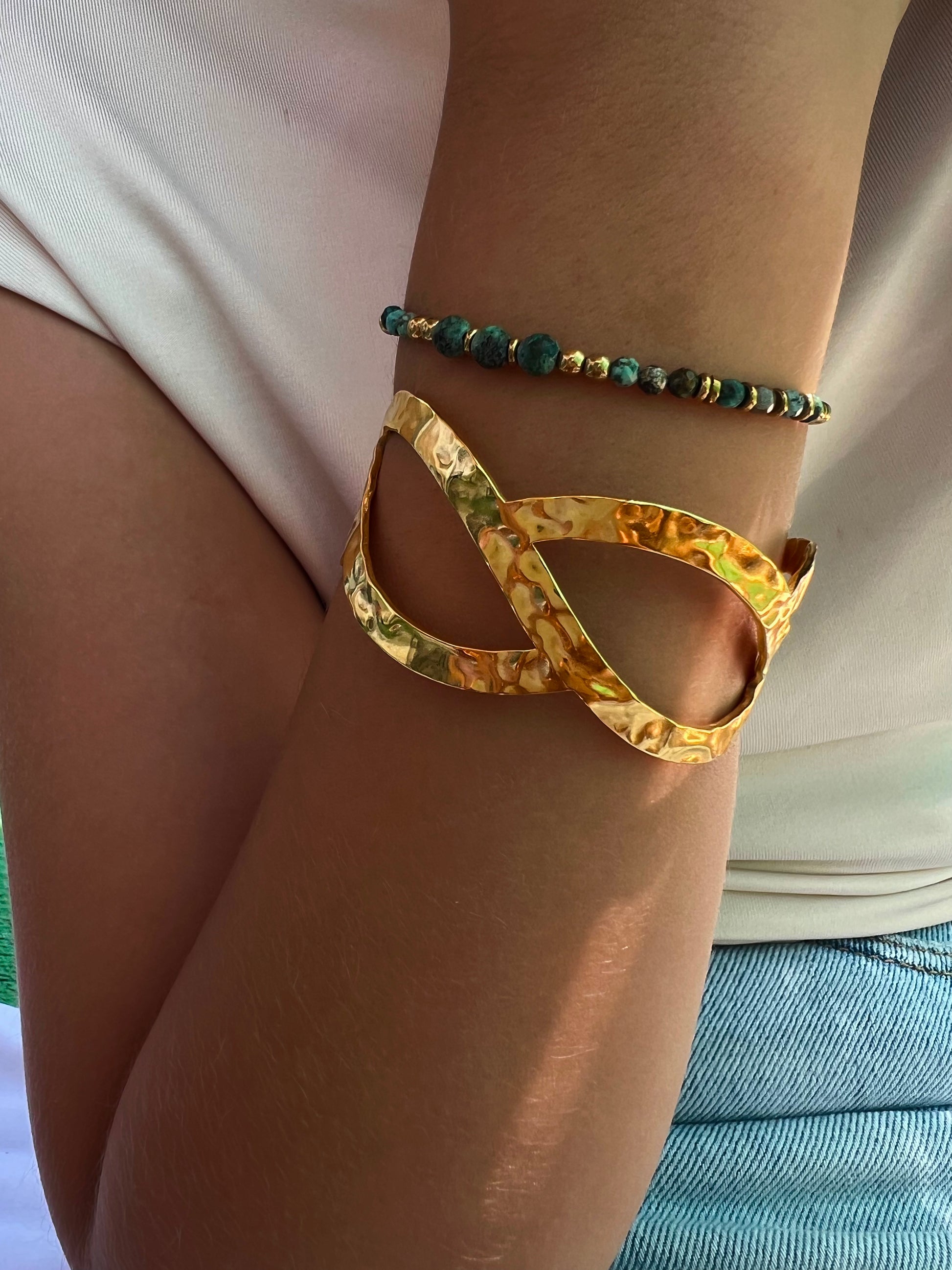 Un jonc doré intemporel au fini martelé, en acier inoxydable brillant 🌞. Son design texturé capte la lumière et apporte une touche chic et moderne à votre poignet. À porter seul pour un look épuré ou en accumulation pour plus de style.