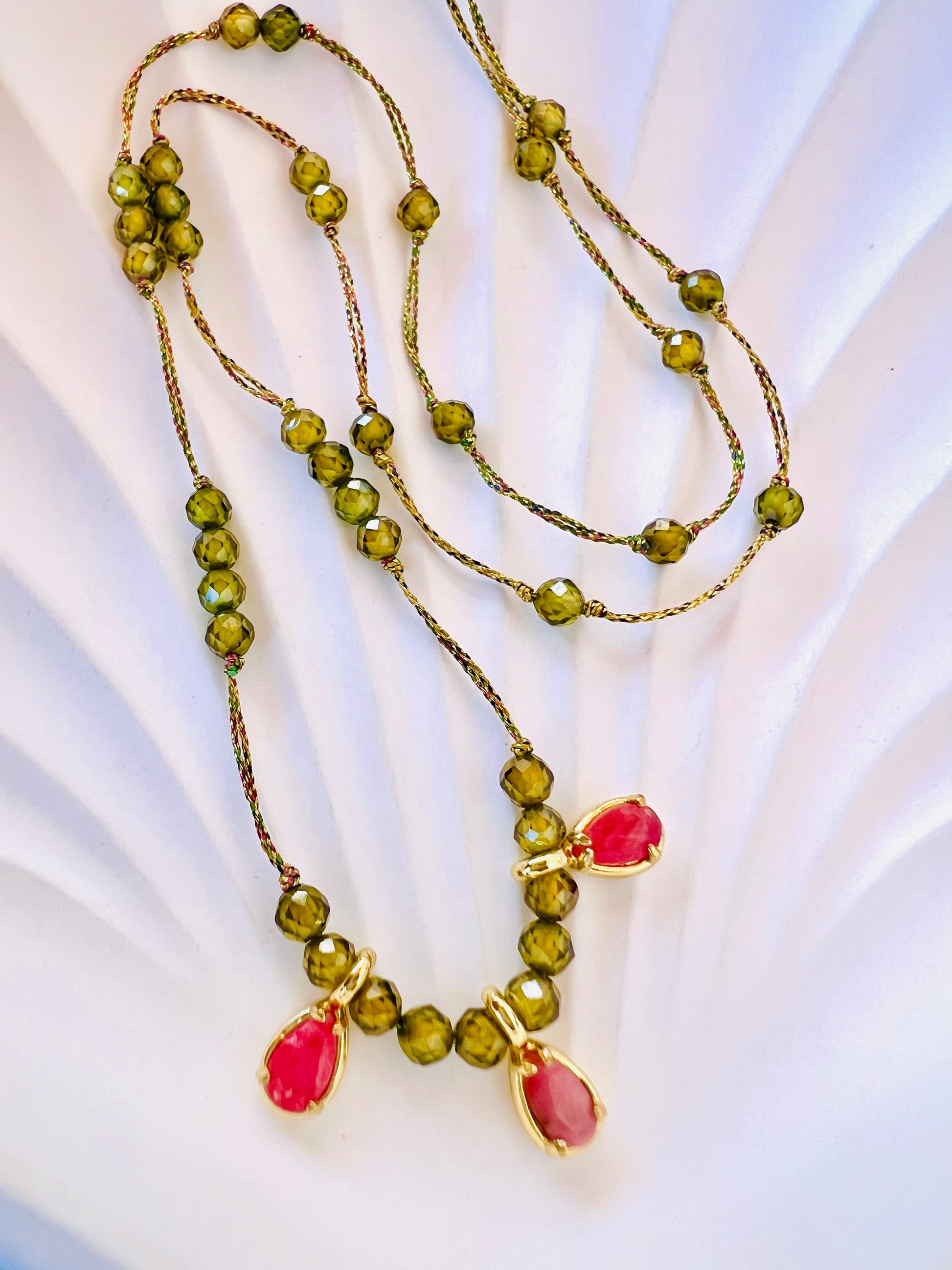 Le collier Ilyssa séduit par sa finesse et son éclat 💚. Monté sur un fil perlé en péridot, il est sublimé par trois délicates gouttes roses qui ajoutent une touche de douceur et de féminité.