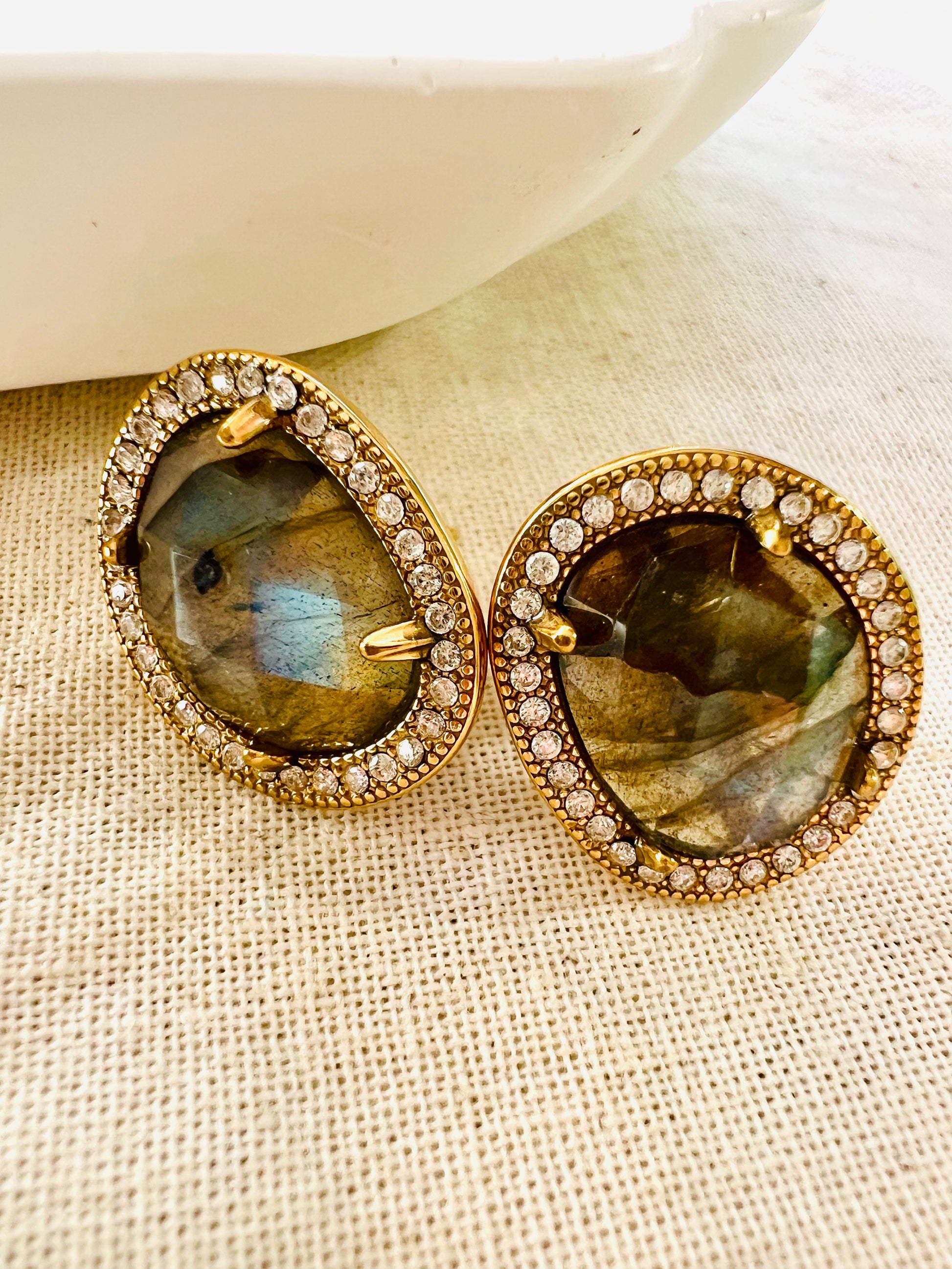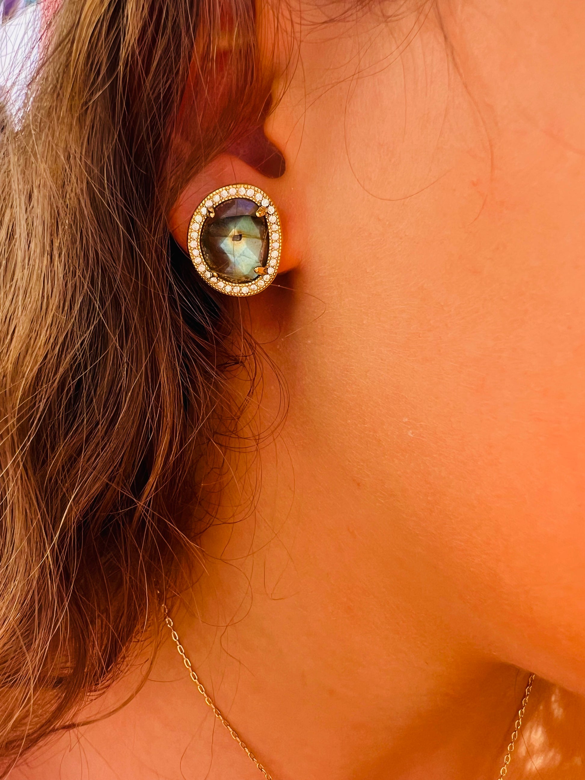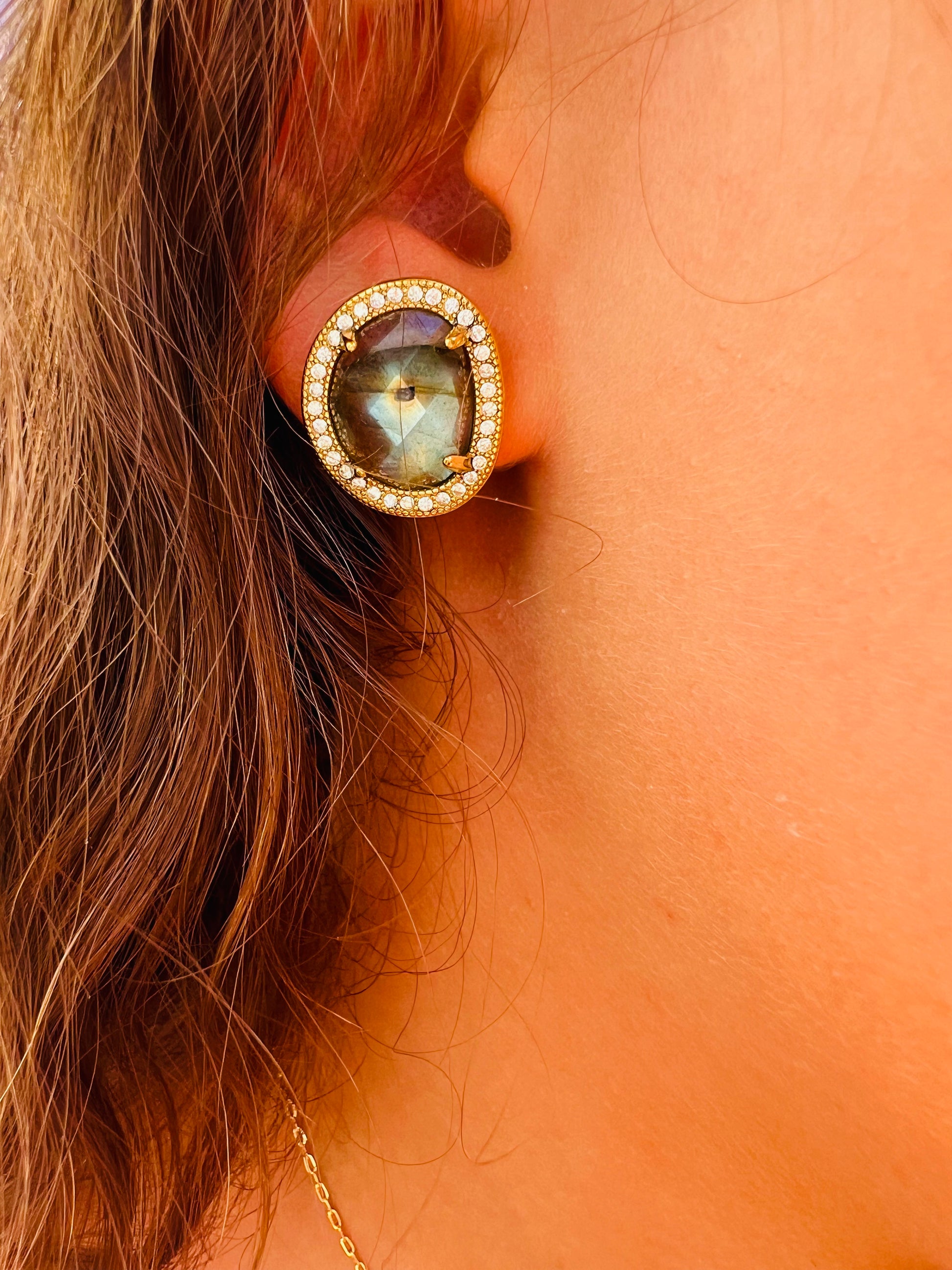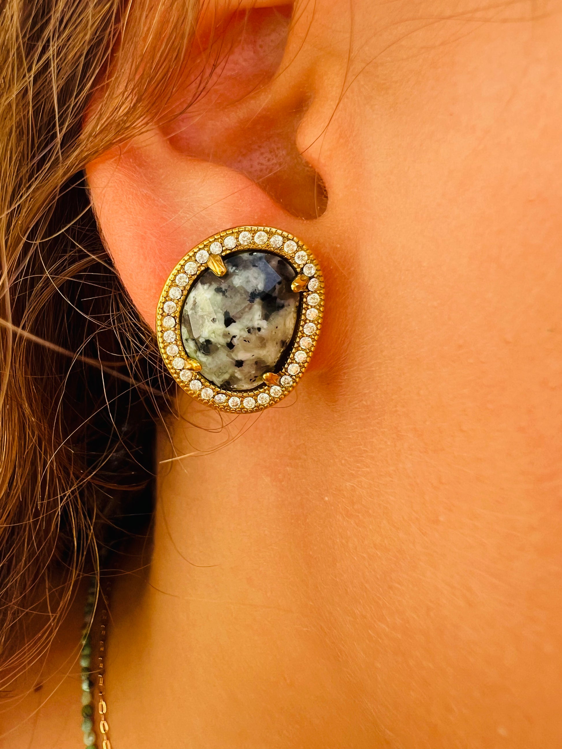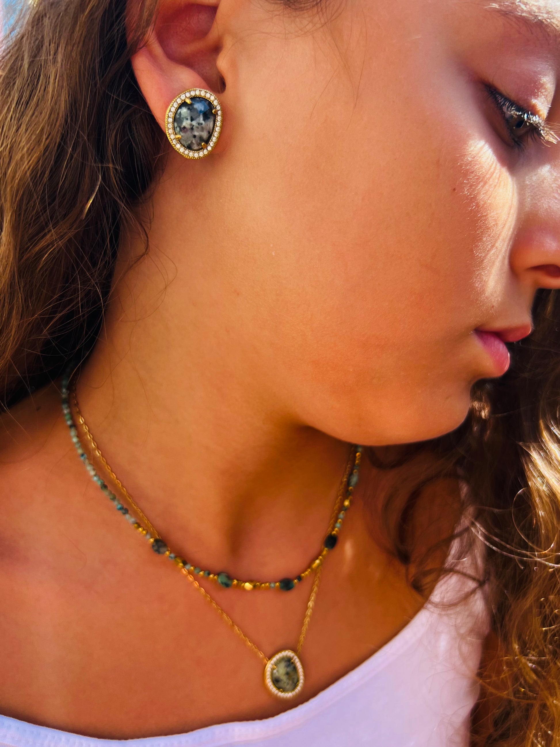 Les boucles Isadora révèlent toute la beauté des pierres naturelles. Déclinées en turquoise africaine ou en labradorite, elles sont serties d’oxydes de zirconium étincelants. Elles existent aussi en collier et bague assortis pour une parure complète ✨.