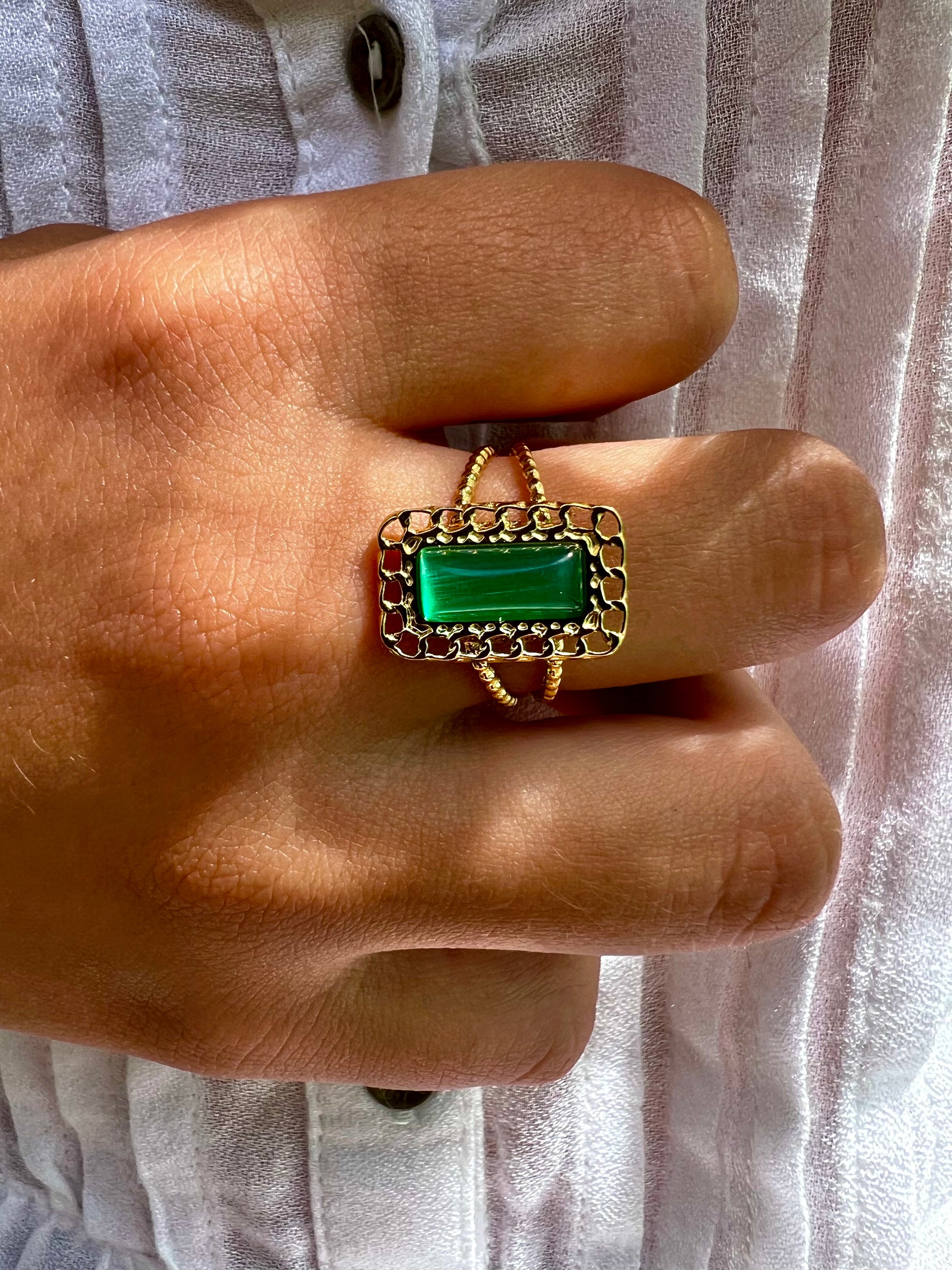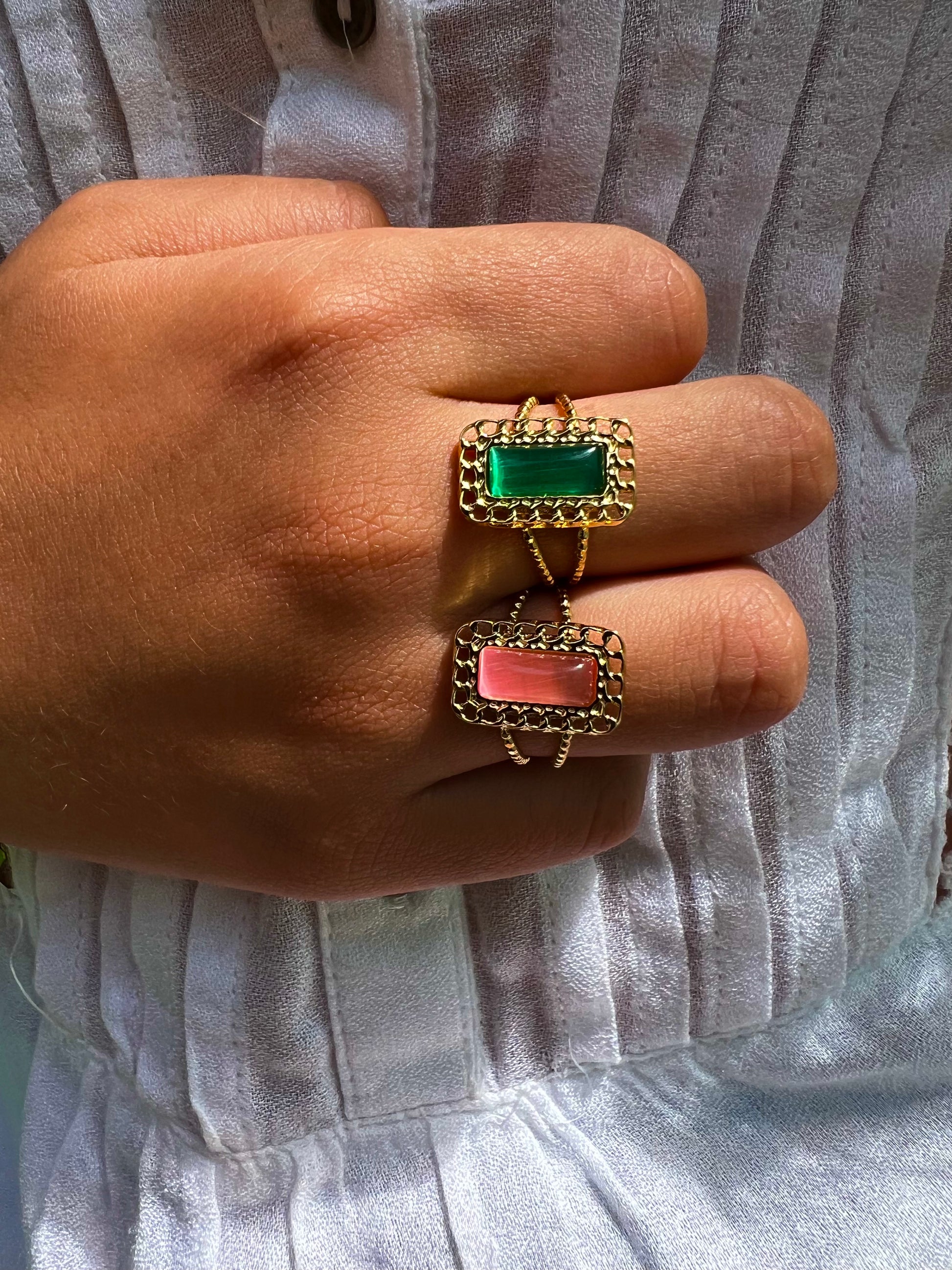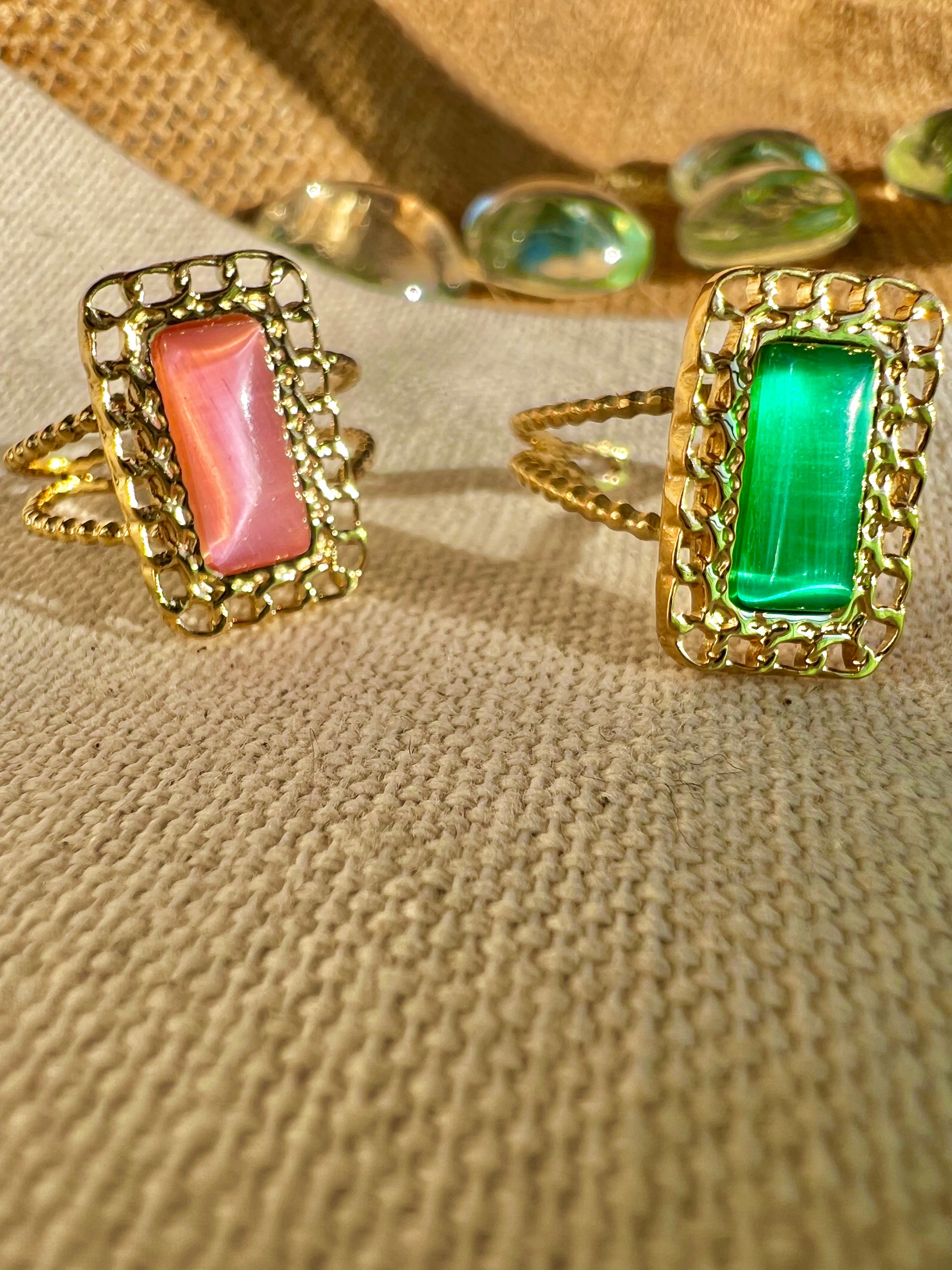 Laissez-vous séduire par la bague ISALINE 💍, ornée d’une élégante pierre œil de chat rectangulaire, aux reflets subtils et mystérieux. Disponible en œil de chat rose et œil de chat vert, elle s’adapte à tous les styles. Montée sur un anneau doré en acier inoxydable, cette bague est ajustable, hypoallergénique et résistante à l’eau 💧, l’alliance parfaite du style et du confort au quotidien ✨.