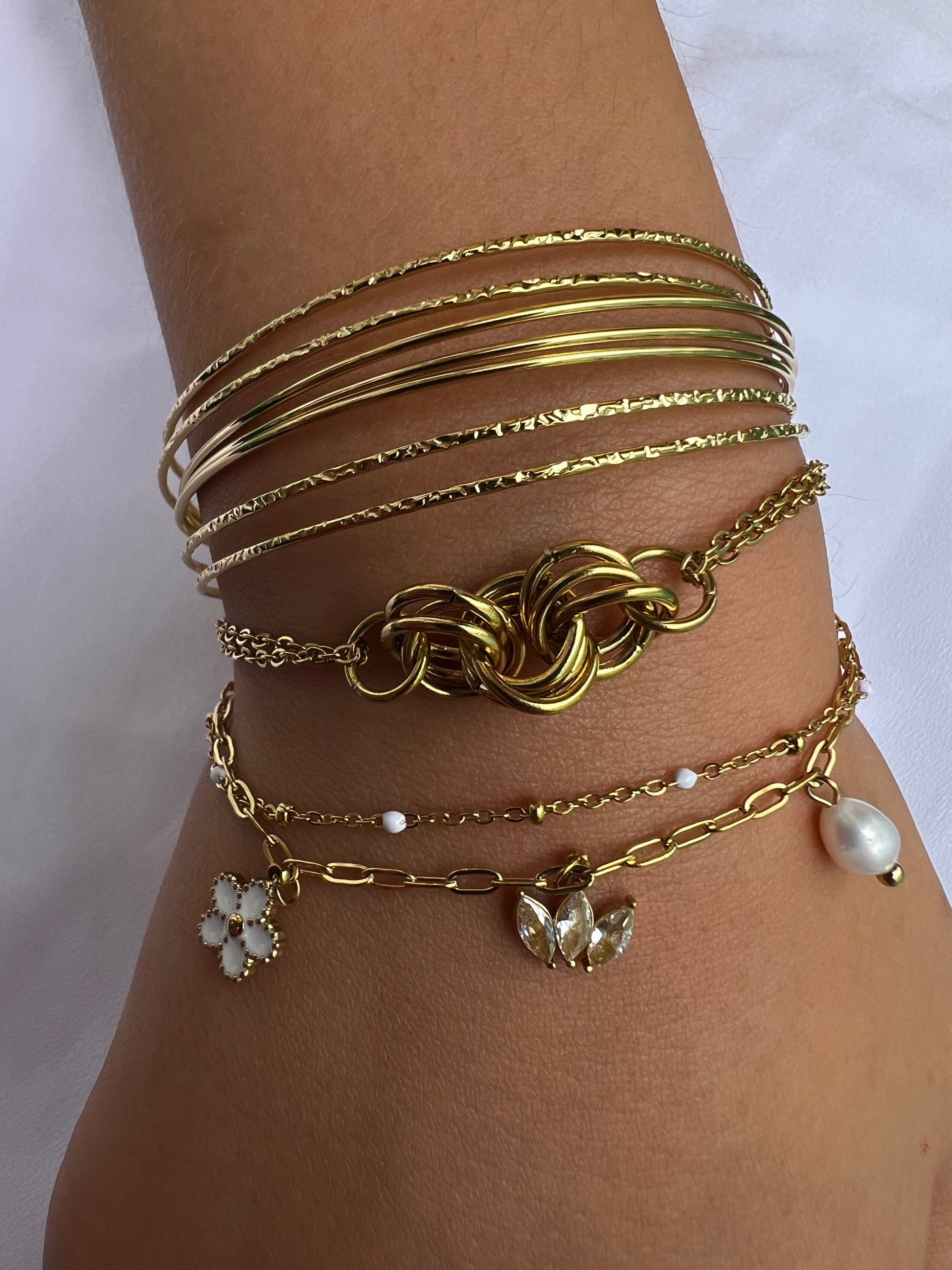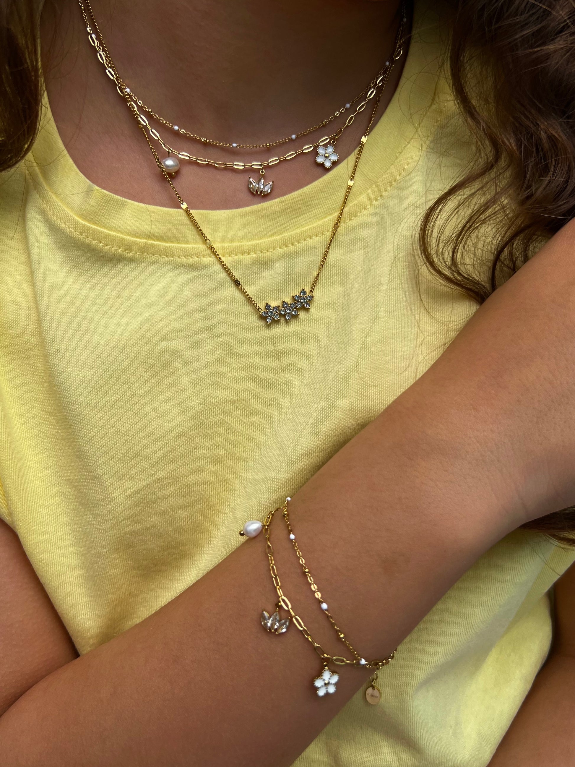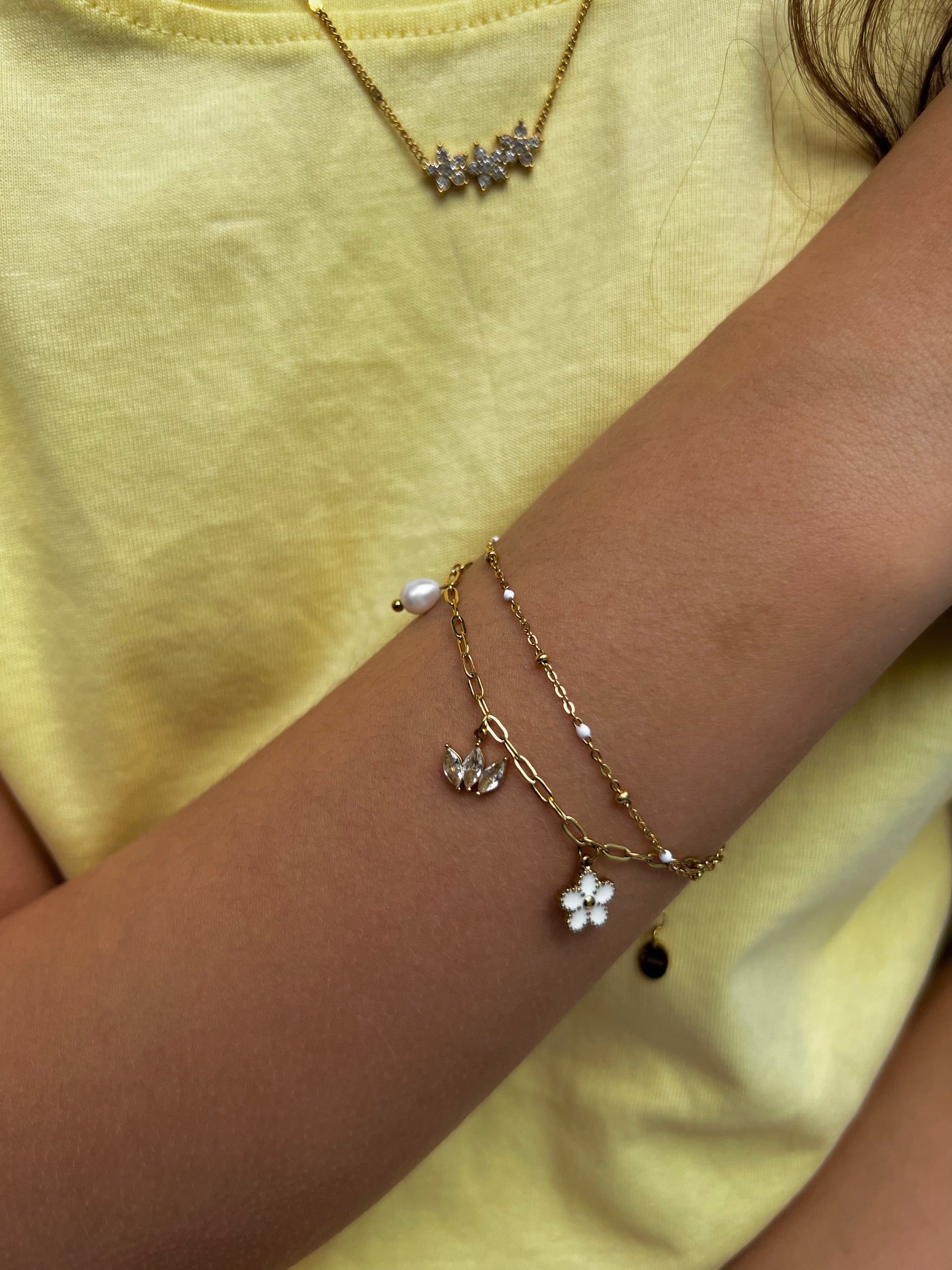 ✧ Bracelet doré 2 rangs en acier inoxydable - maille avec émail, anneaux ovales et 3 pendentifs (fleur, diadème de cristaux, perle d'eau douce).