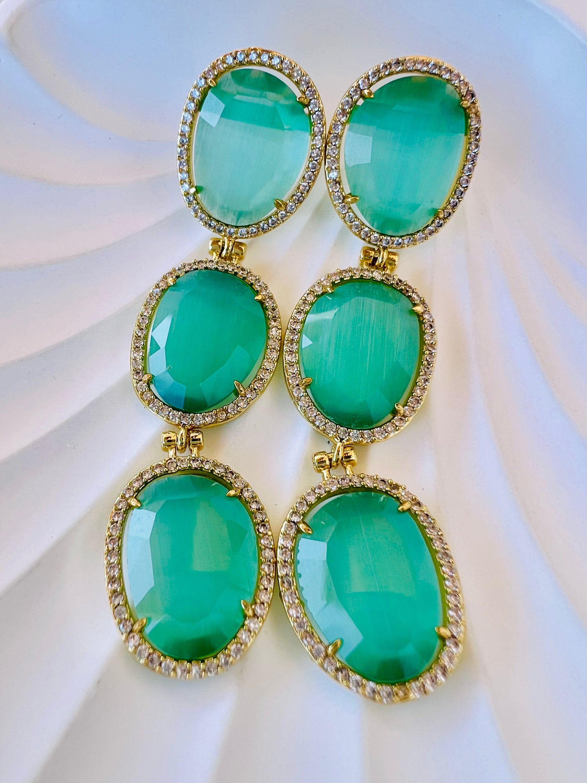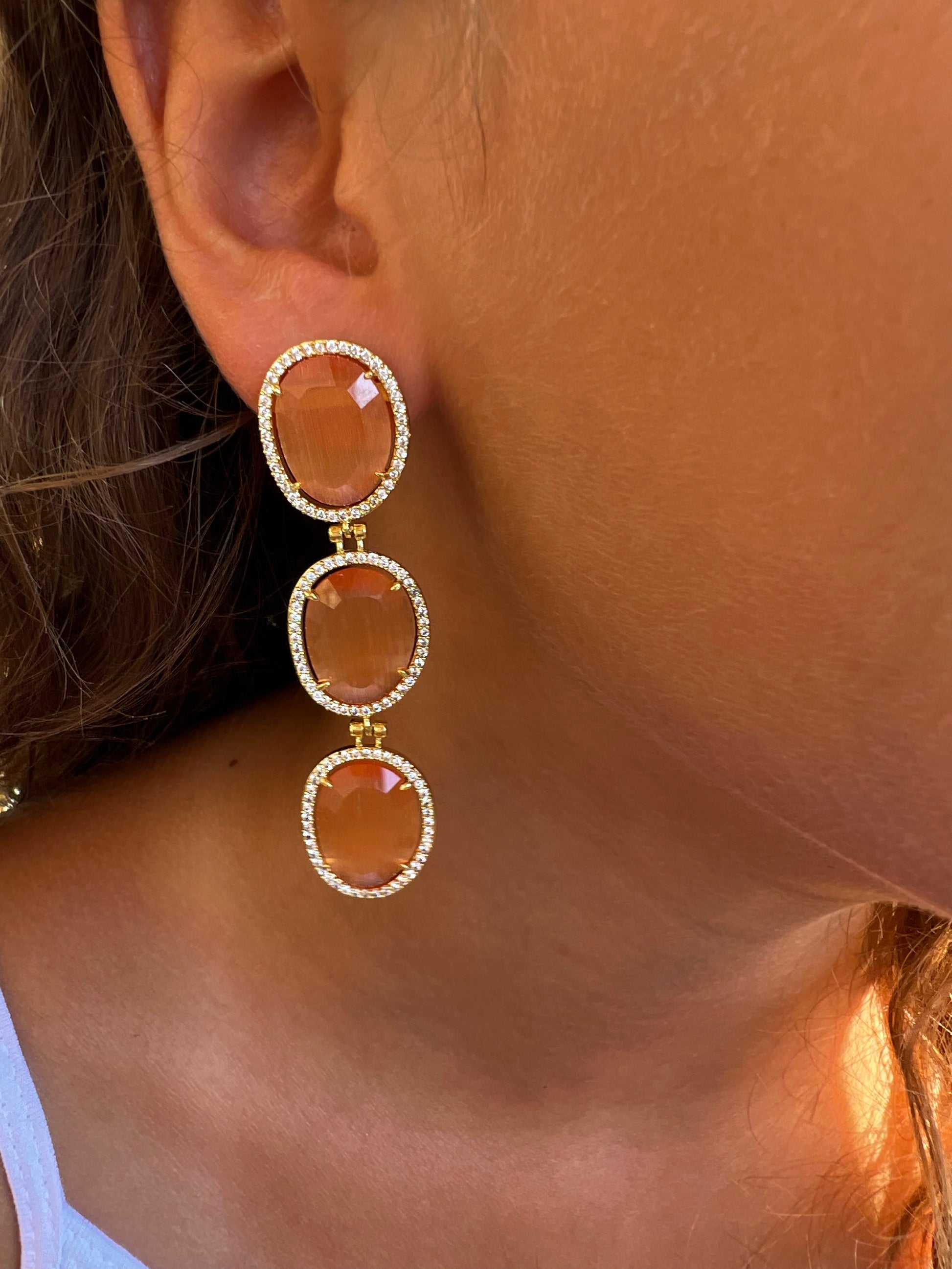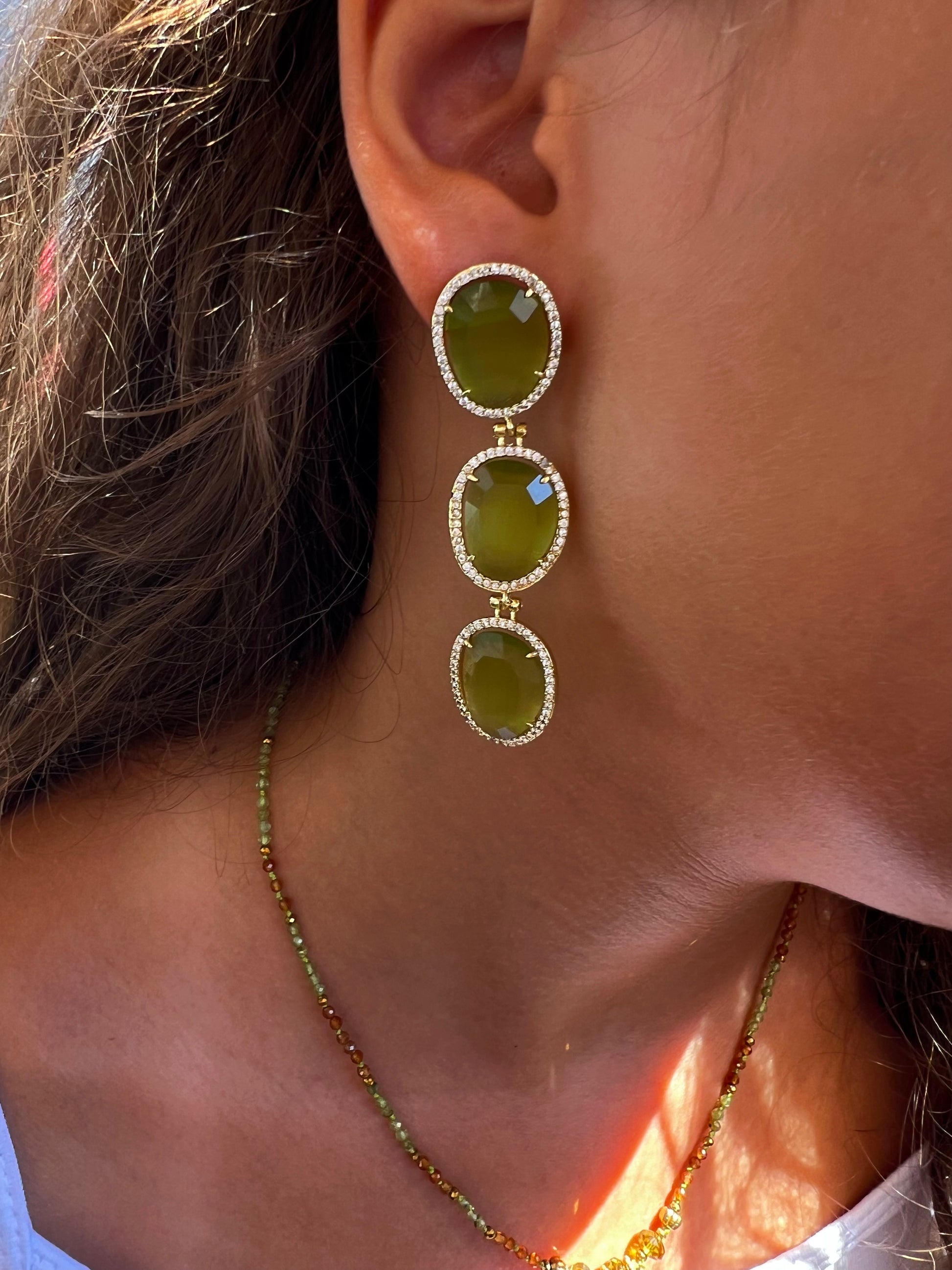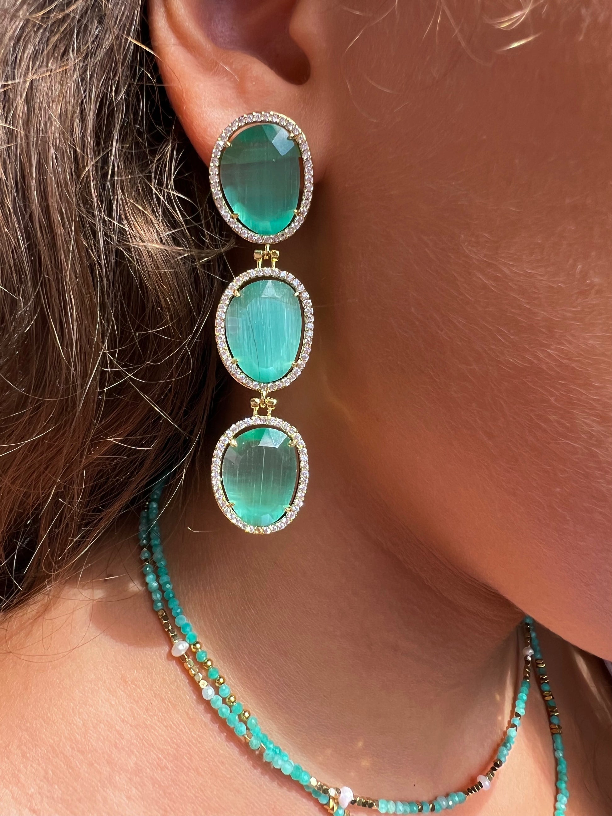 Les boucles Liora illuminent vos looks avec élégance ✨. En laiton, elles sont ornées de trois pierres ovales naturelles scintillantes, sublimées par un serti d’oxydes de zirconium. Disponibles en œil de chat vert, bleu ou orange.
