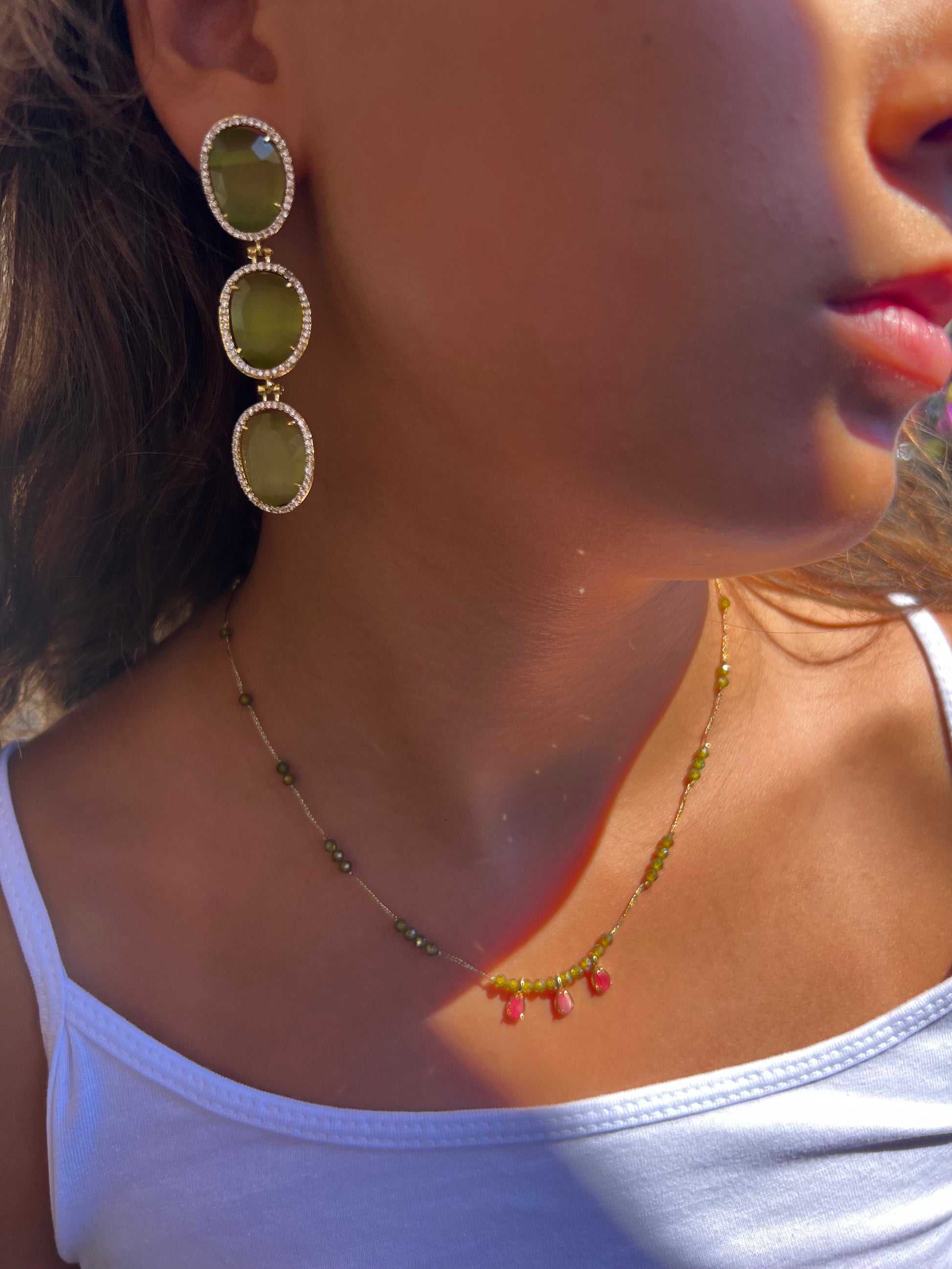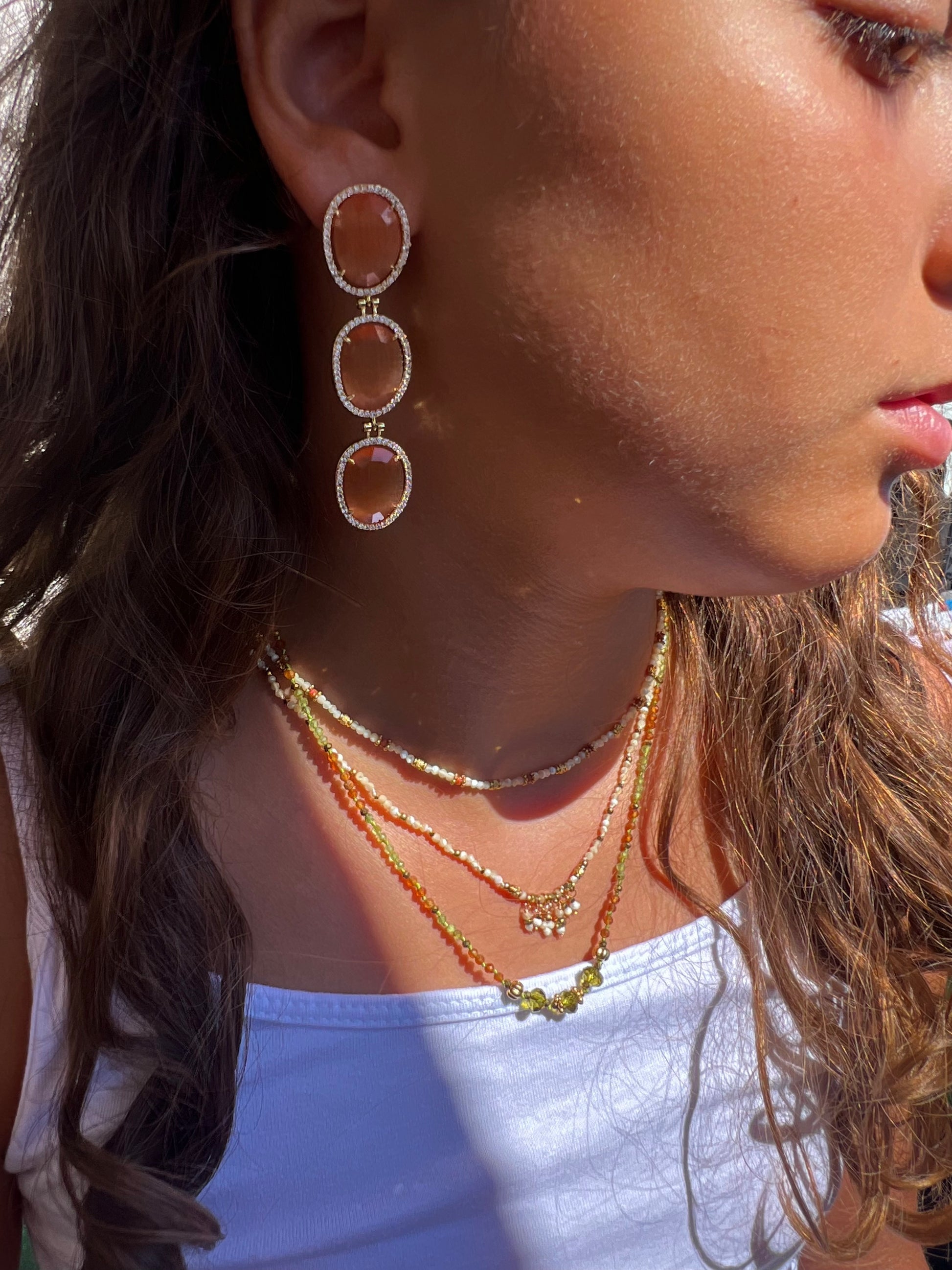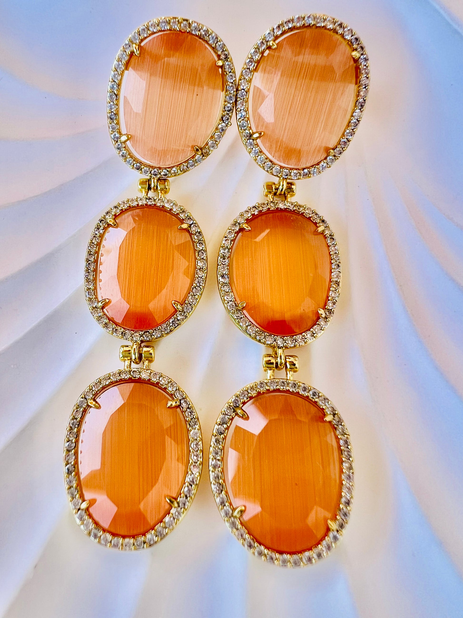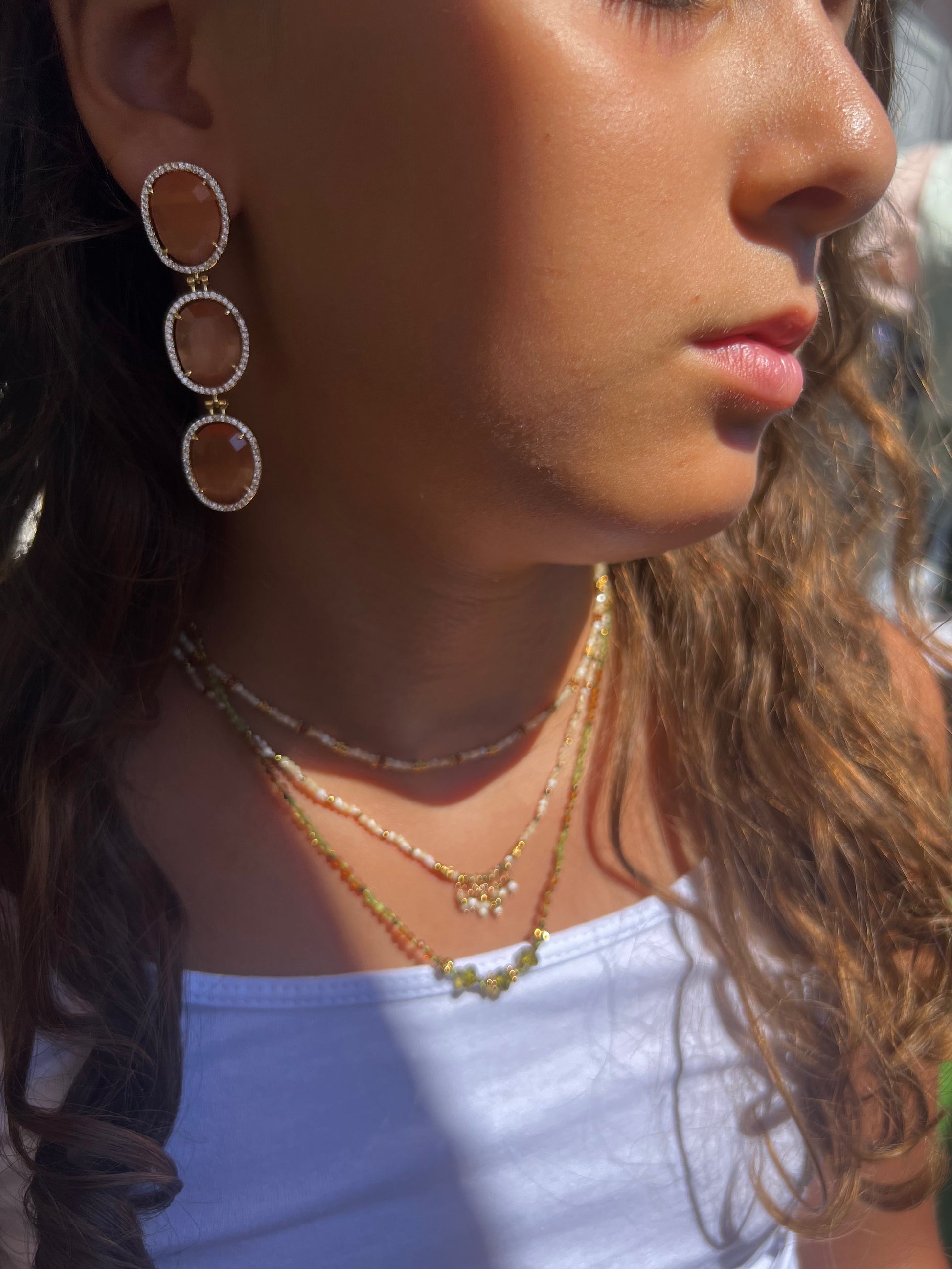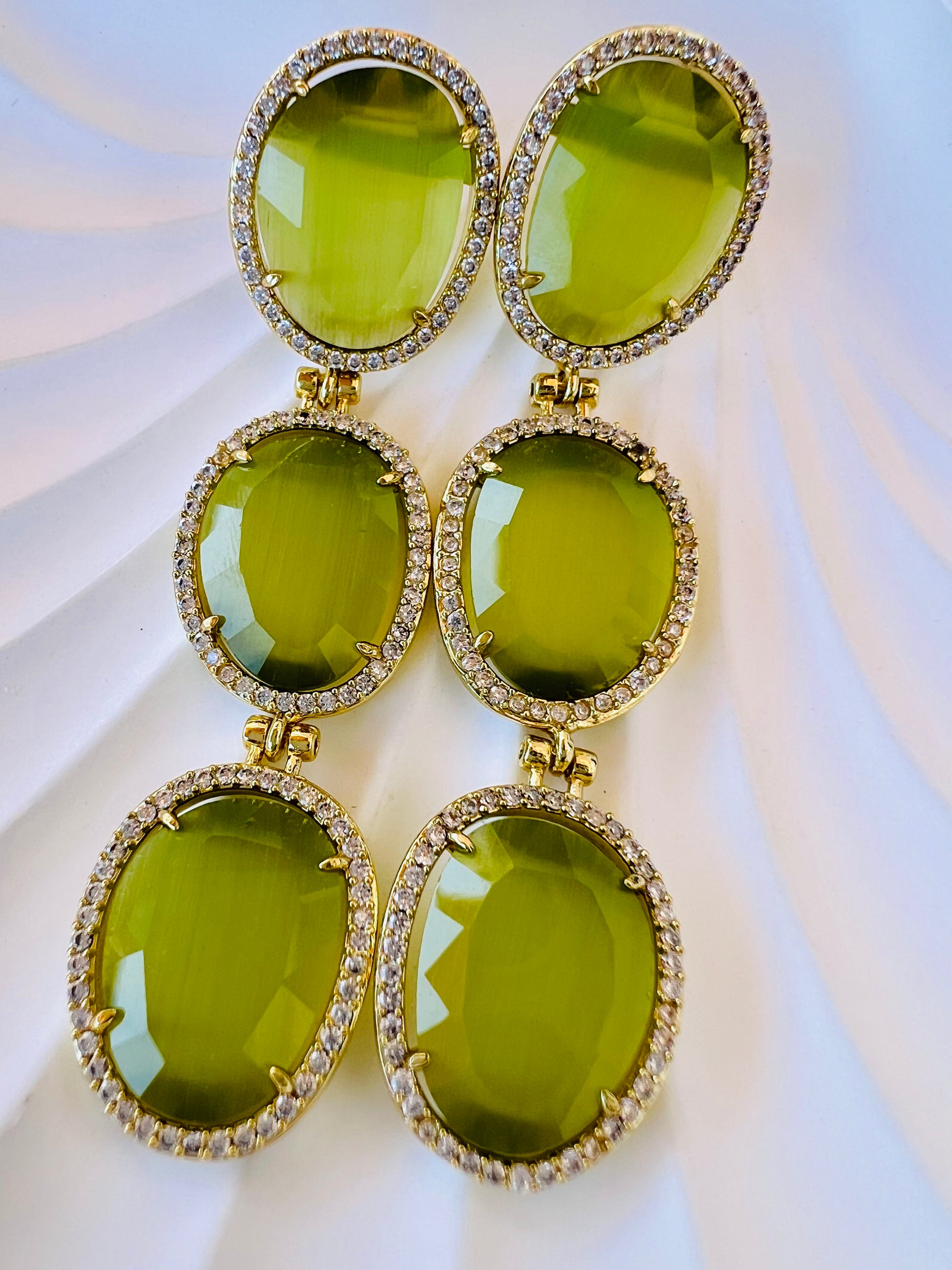 Les boucles Liora illuminent vos looks avec élégance ✨. En laiton, elles sont ornées de trois pierres ovales naturelles scintillantes, sublimées par un serti d’oxydes de zirconium. Disponibles en œil de chat vert, bleu ou orange.