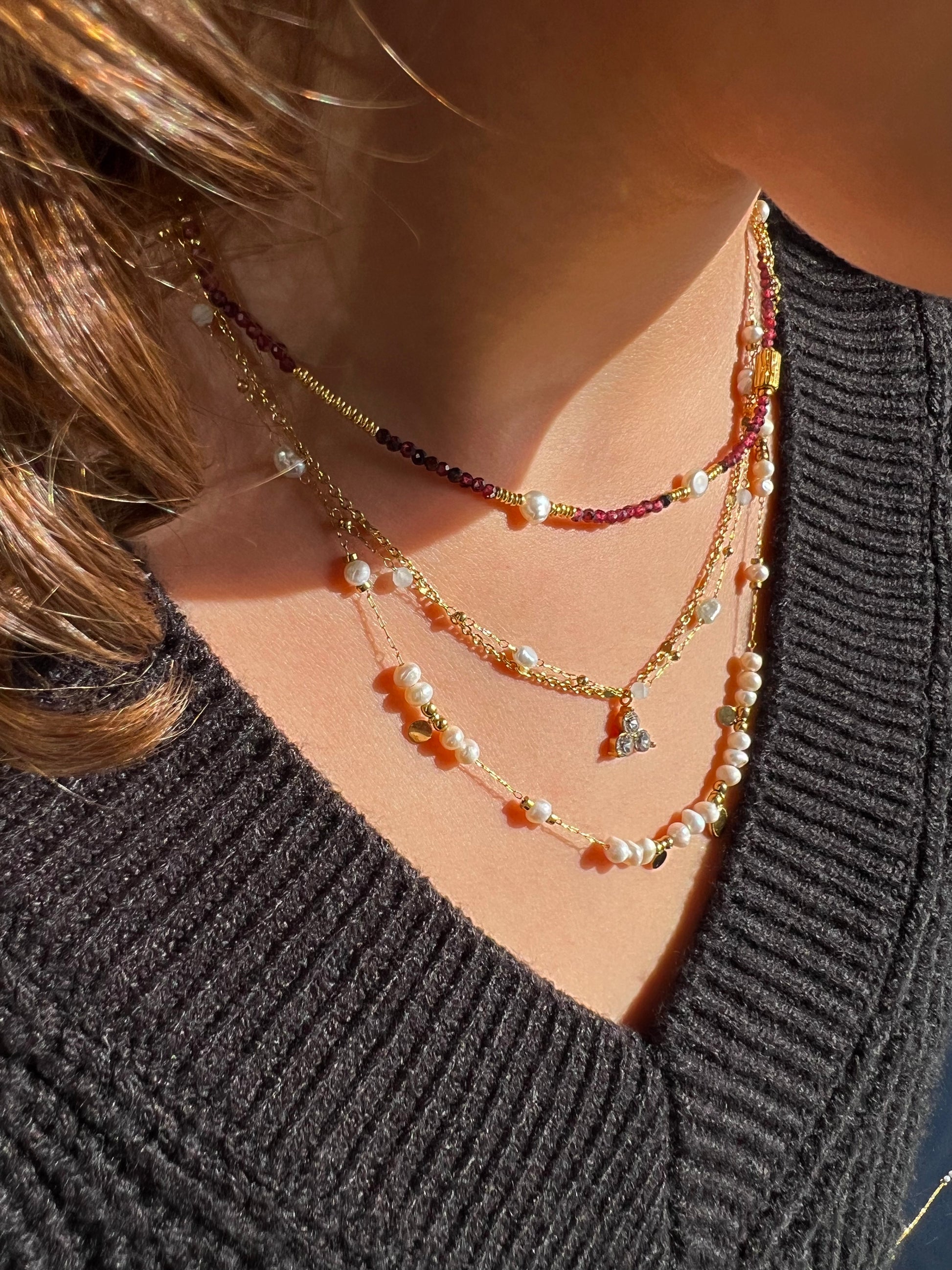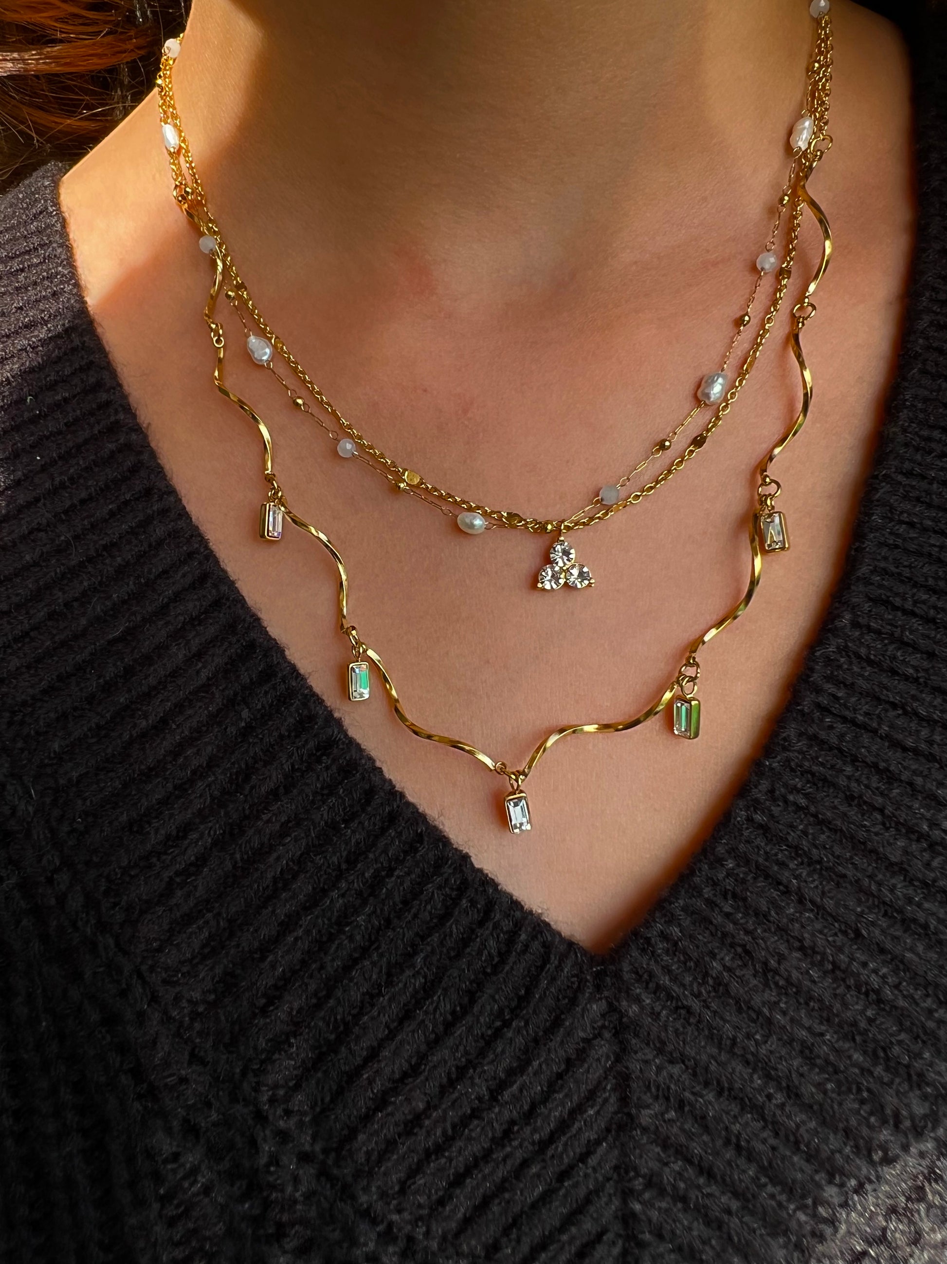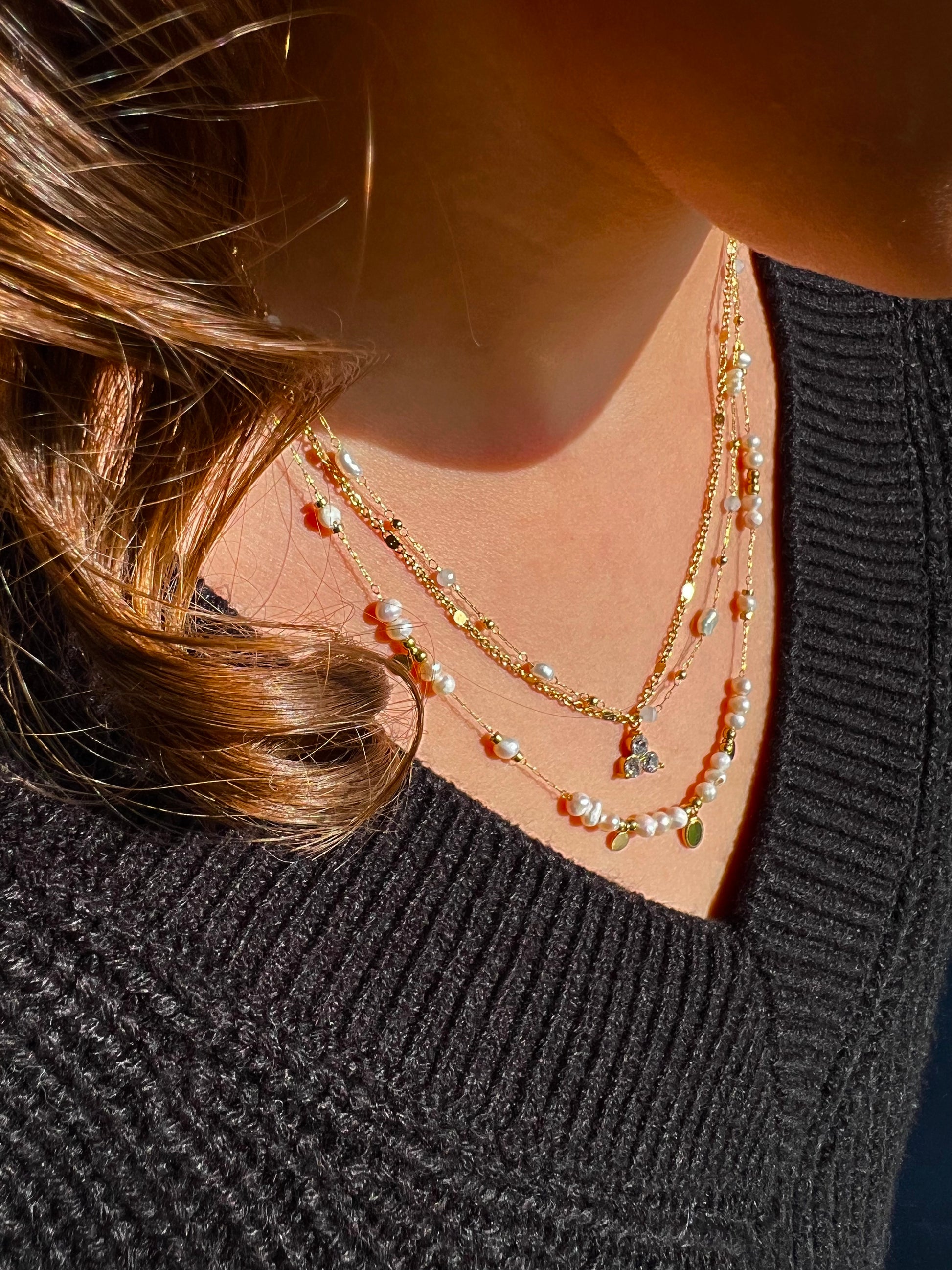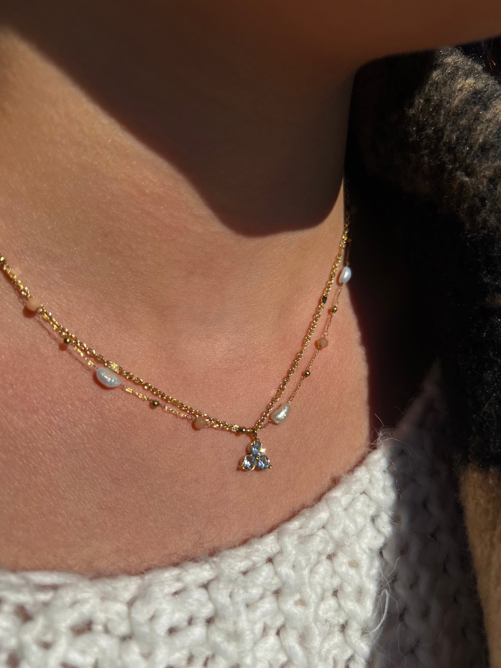 ✧ Collier doré deux rangs en acier inoxydable, agate bleue, blanche ou orange, perles d'eau douce et 3 cristaux.