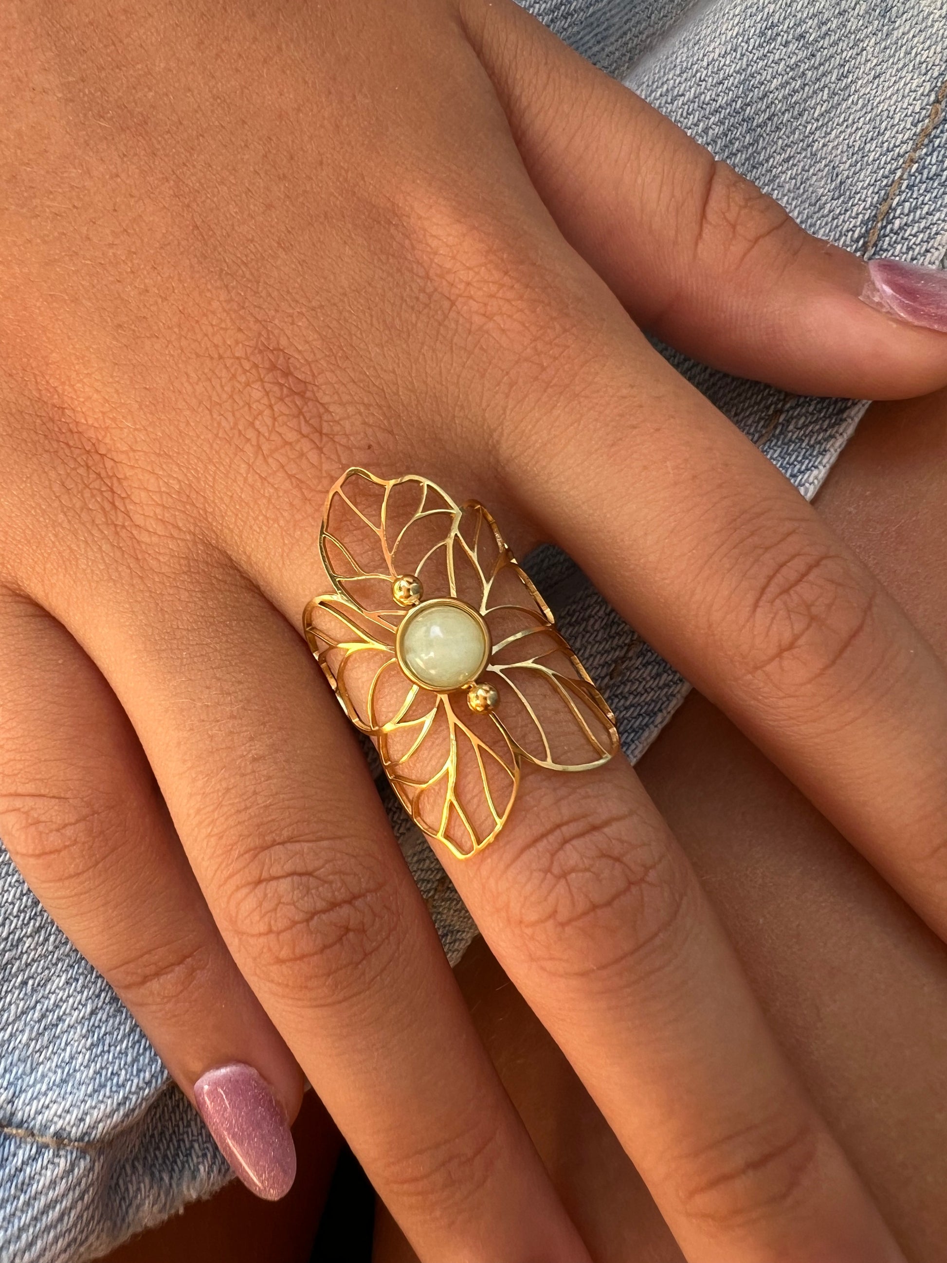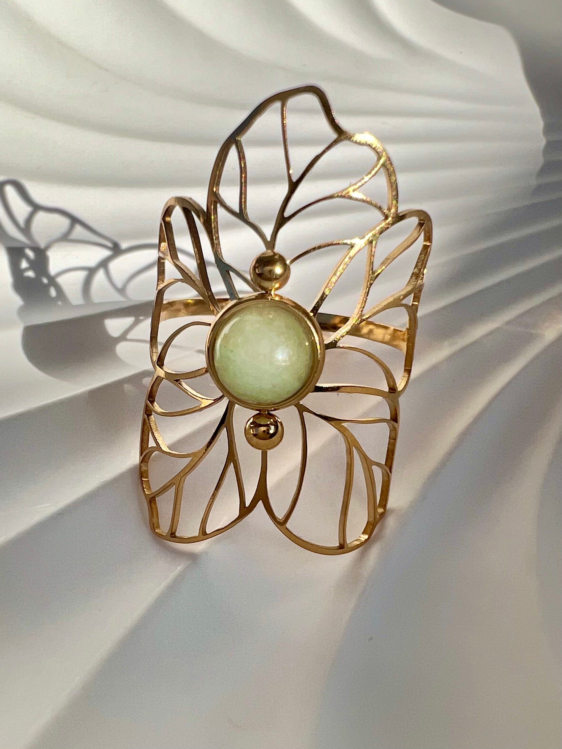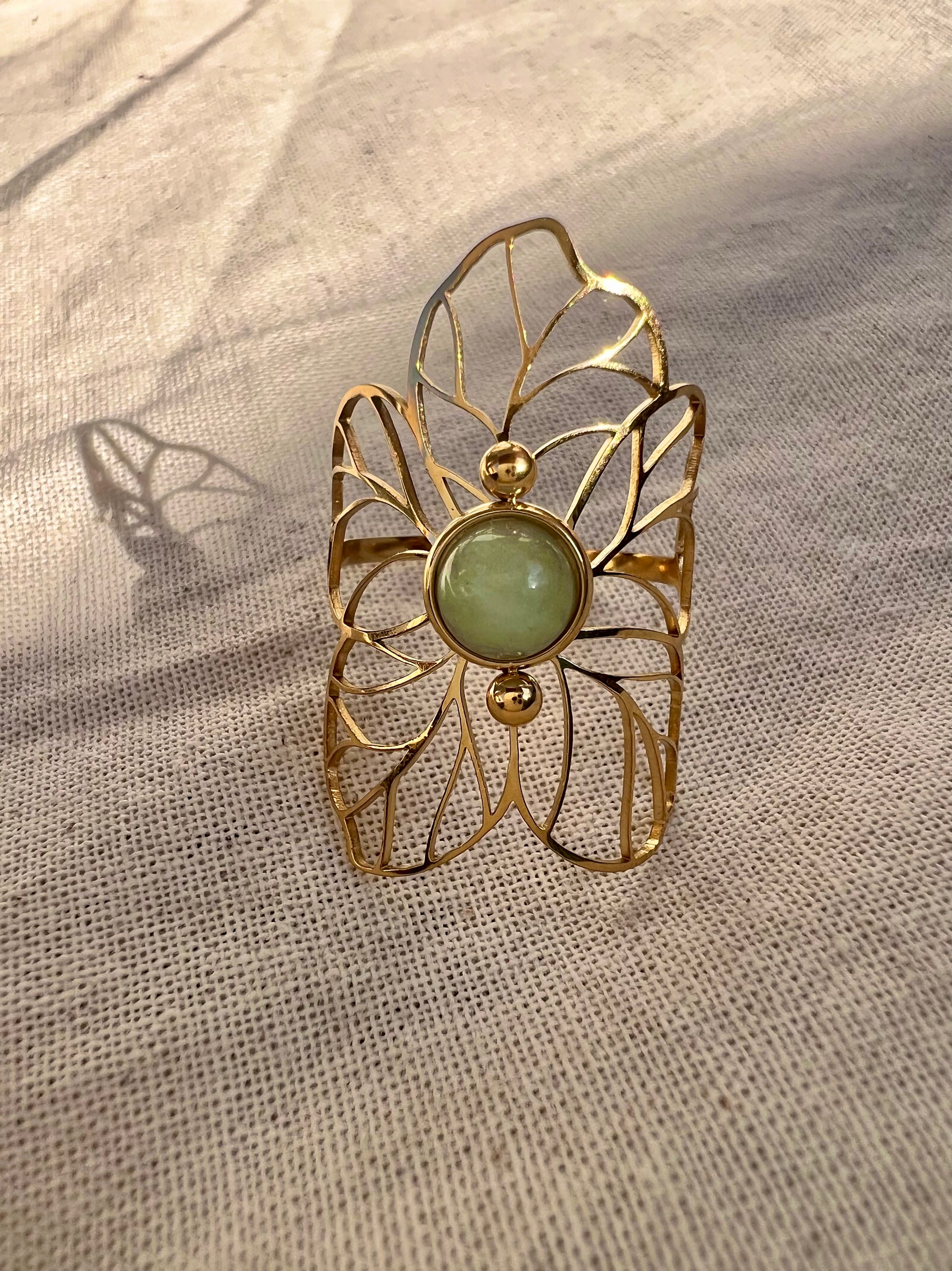 Féminine et poétique, la bague Lucia 🌸 évoque une fleur délicate avec son motif ajouré et sa pierre centrale en amazonite ou en pierre de soleil.