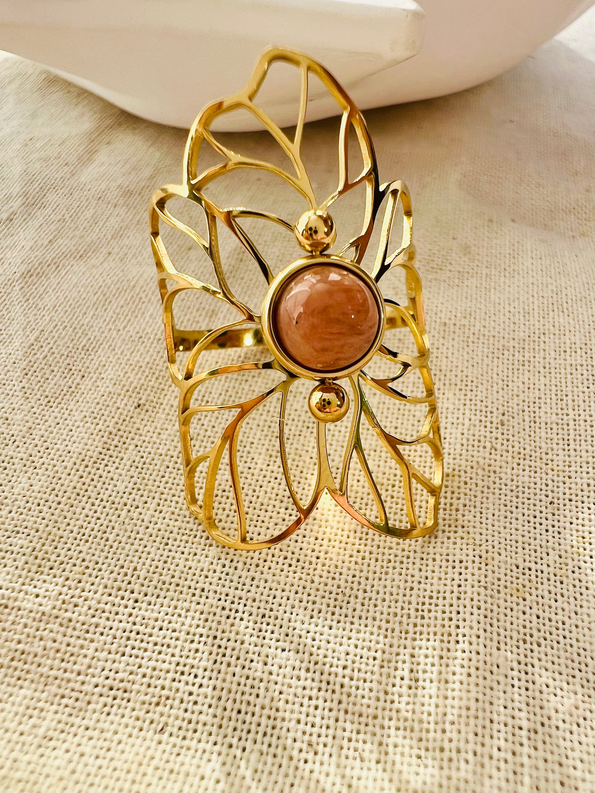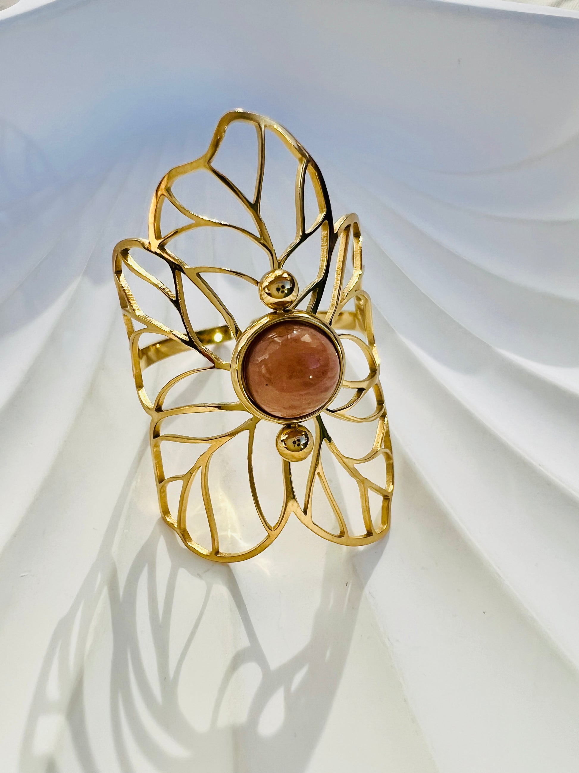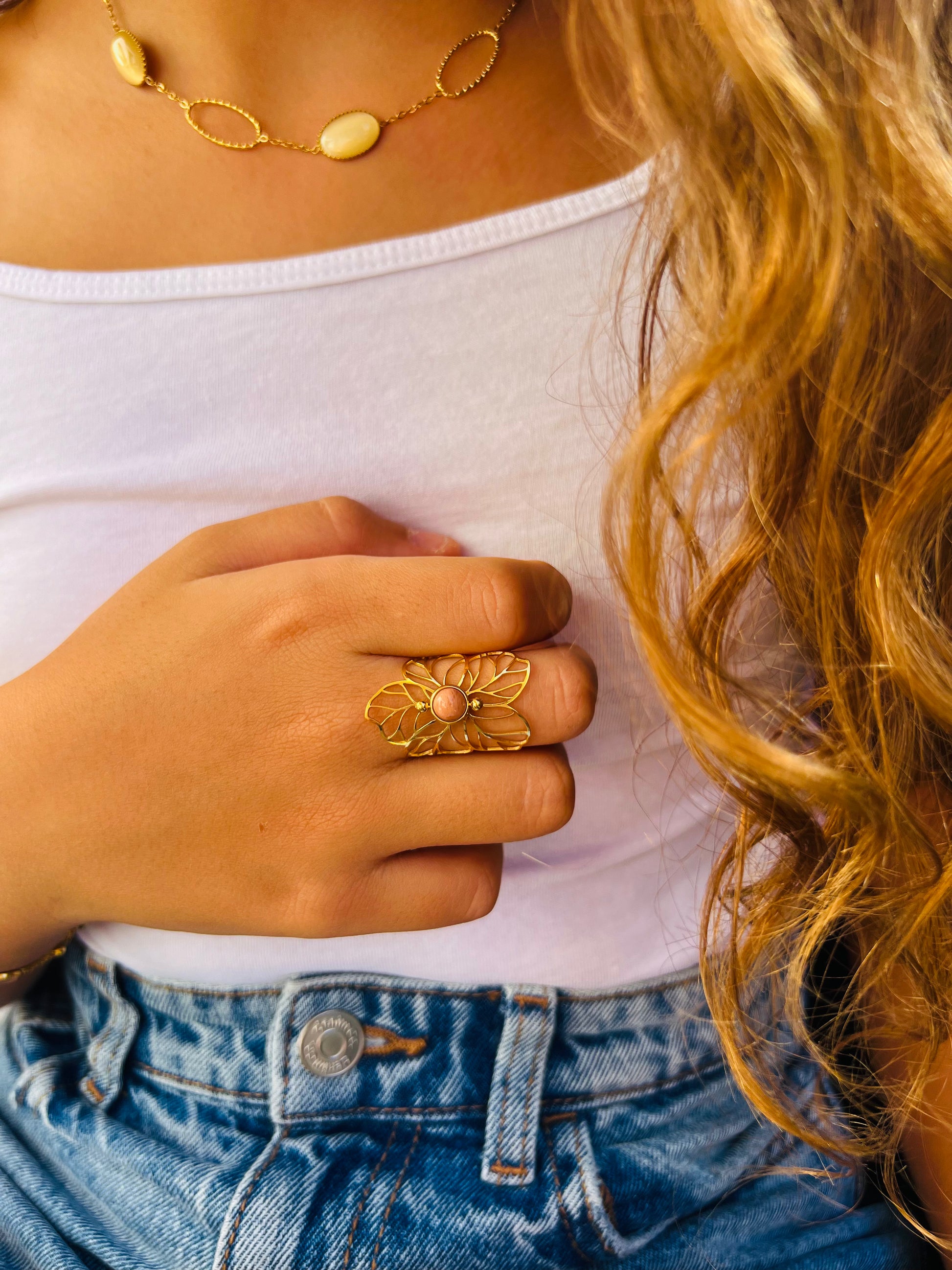 Féminine et poétique, la bague Lucia 🌸 évoque une fleur délicate avec son motif ajouré et sa pierre centrale en amazonite ou en pierre de soleil.
