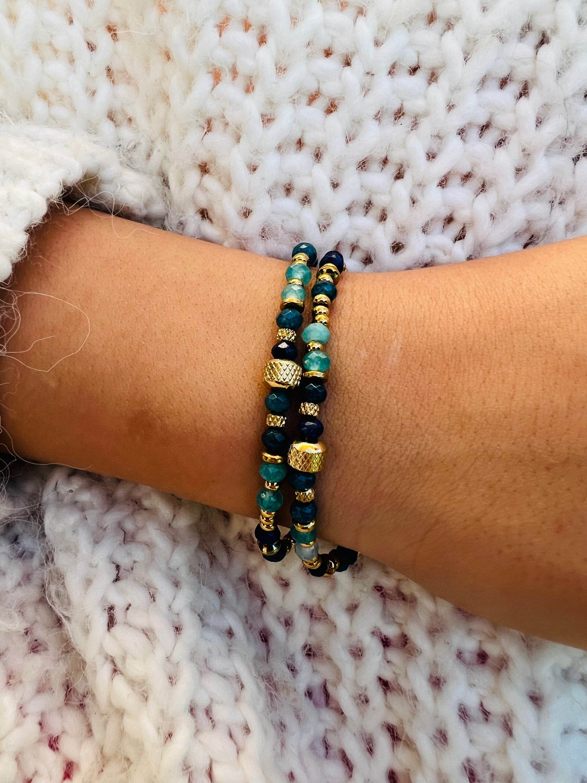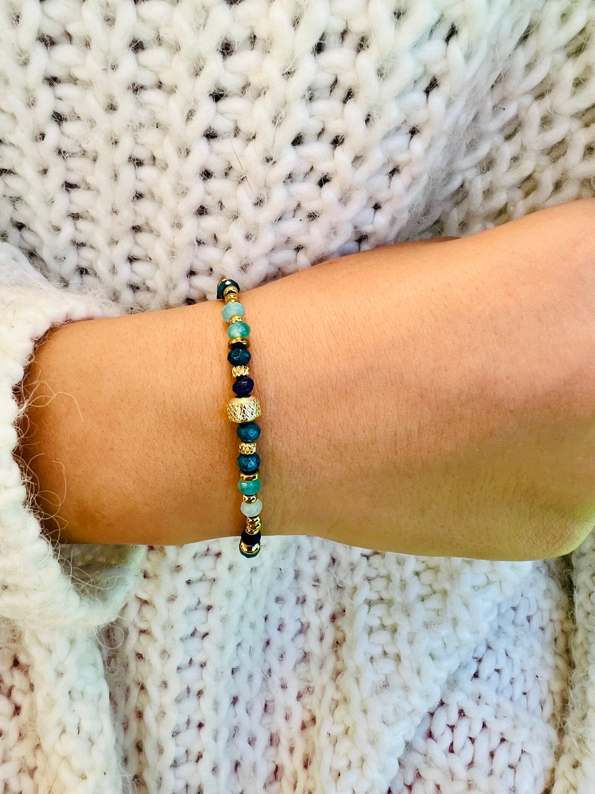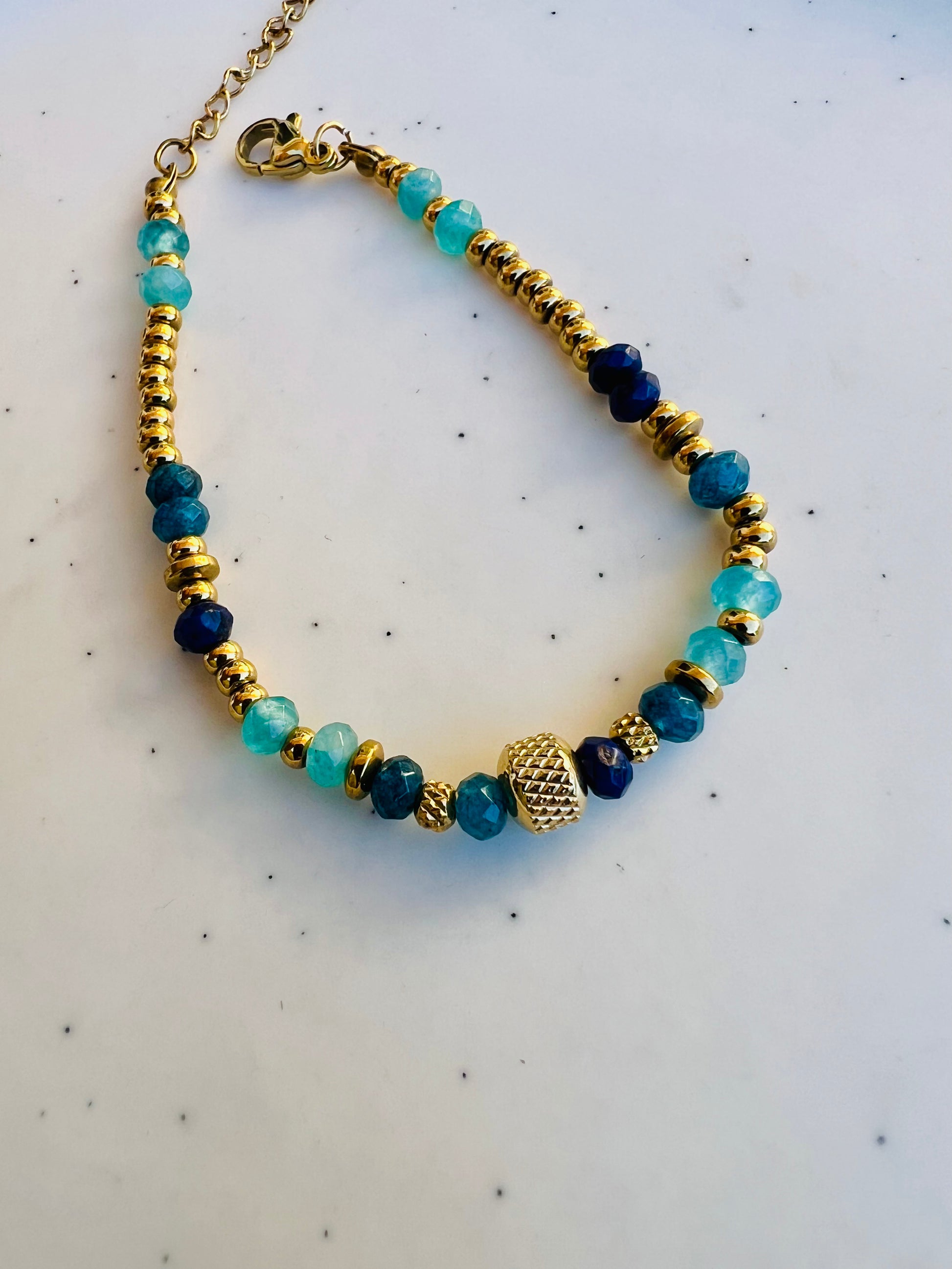 ✧ Bracelet doré en acier inoxydable et mélange de pierres naturelles bleues.