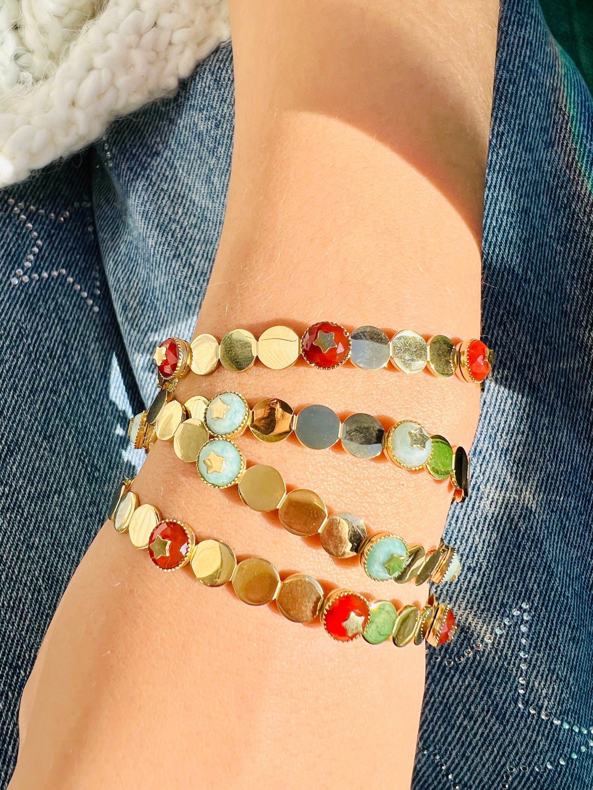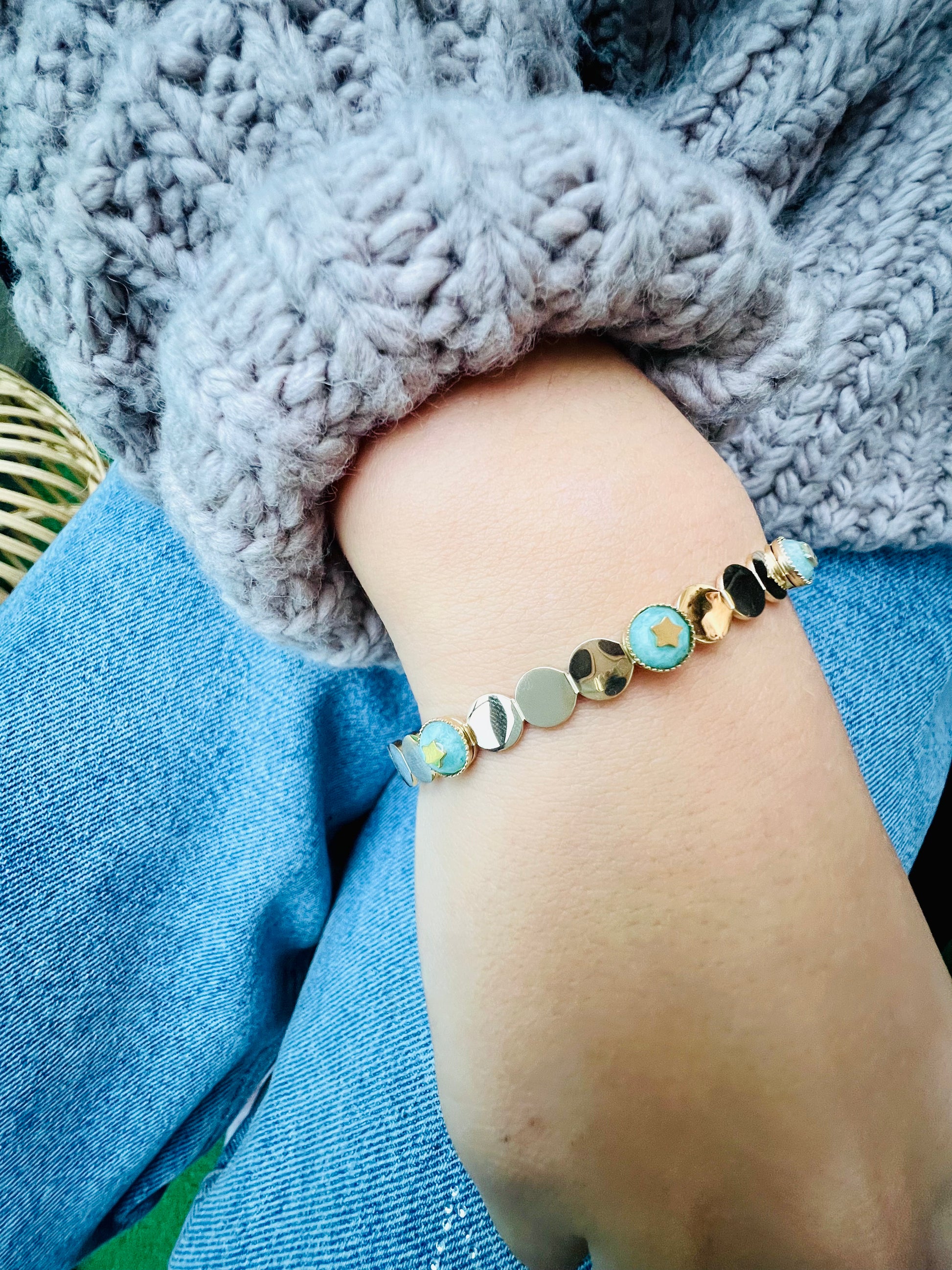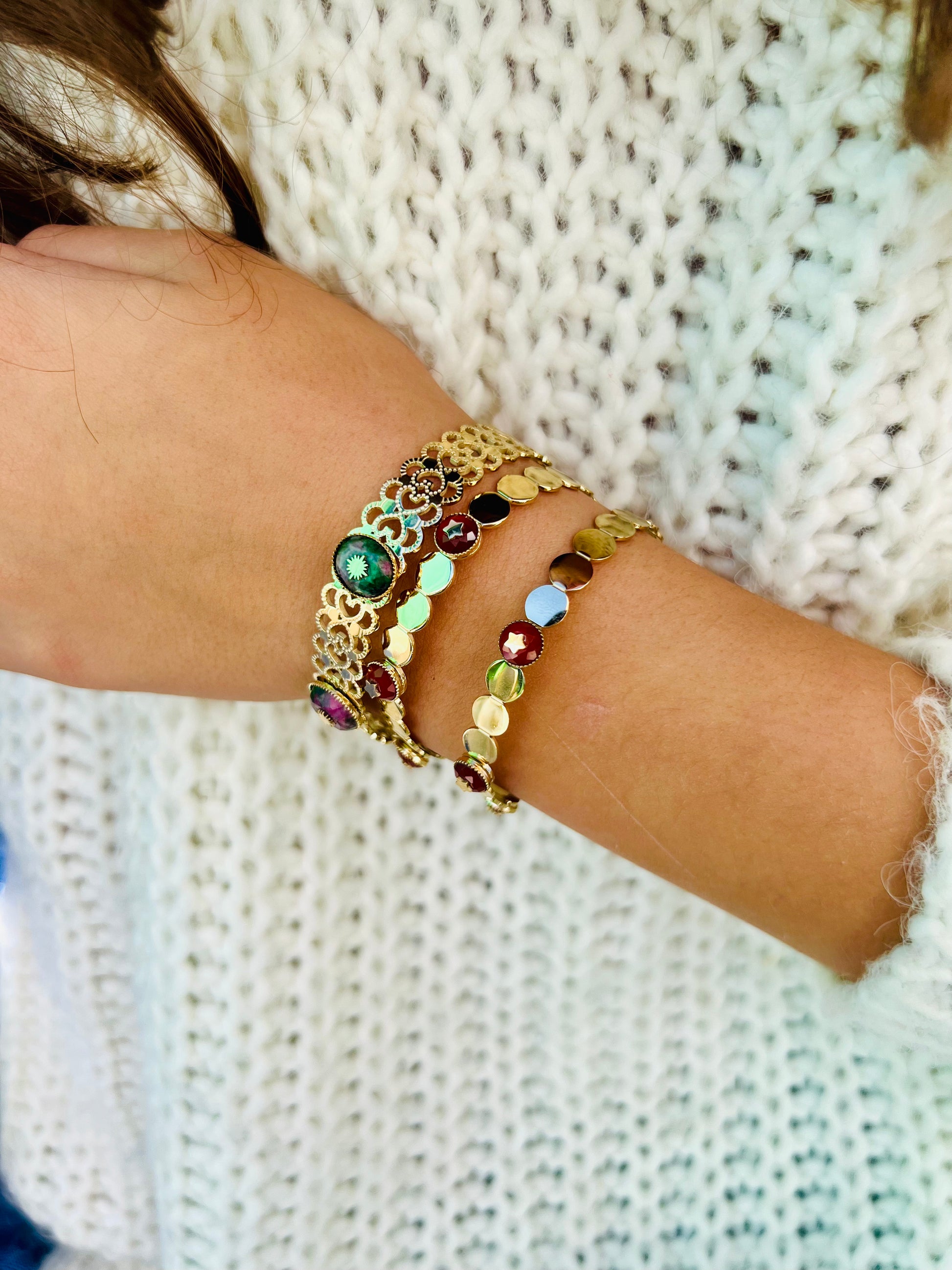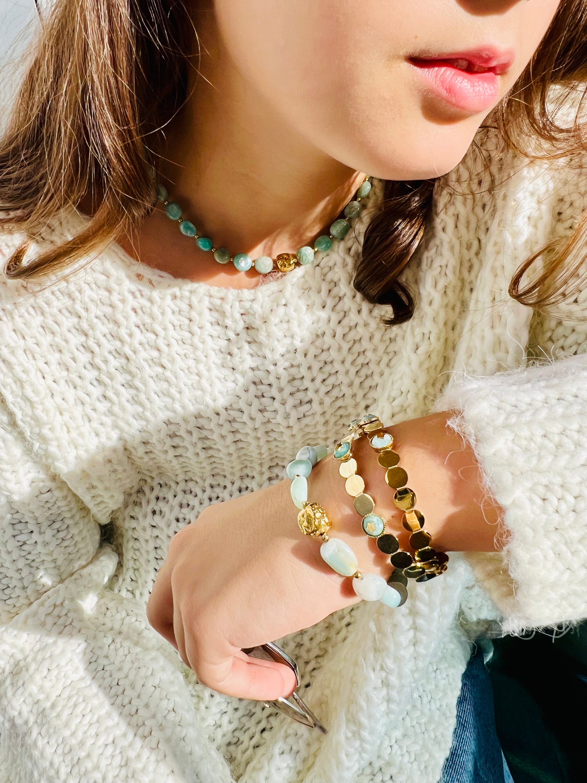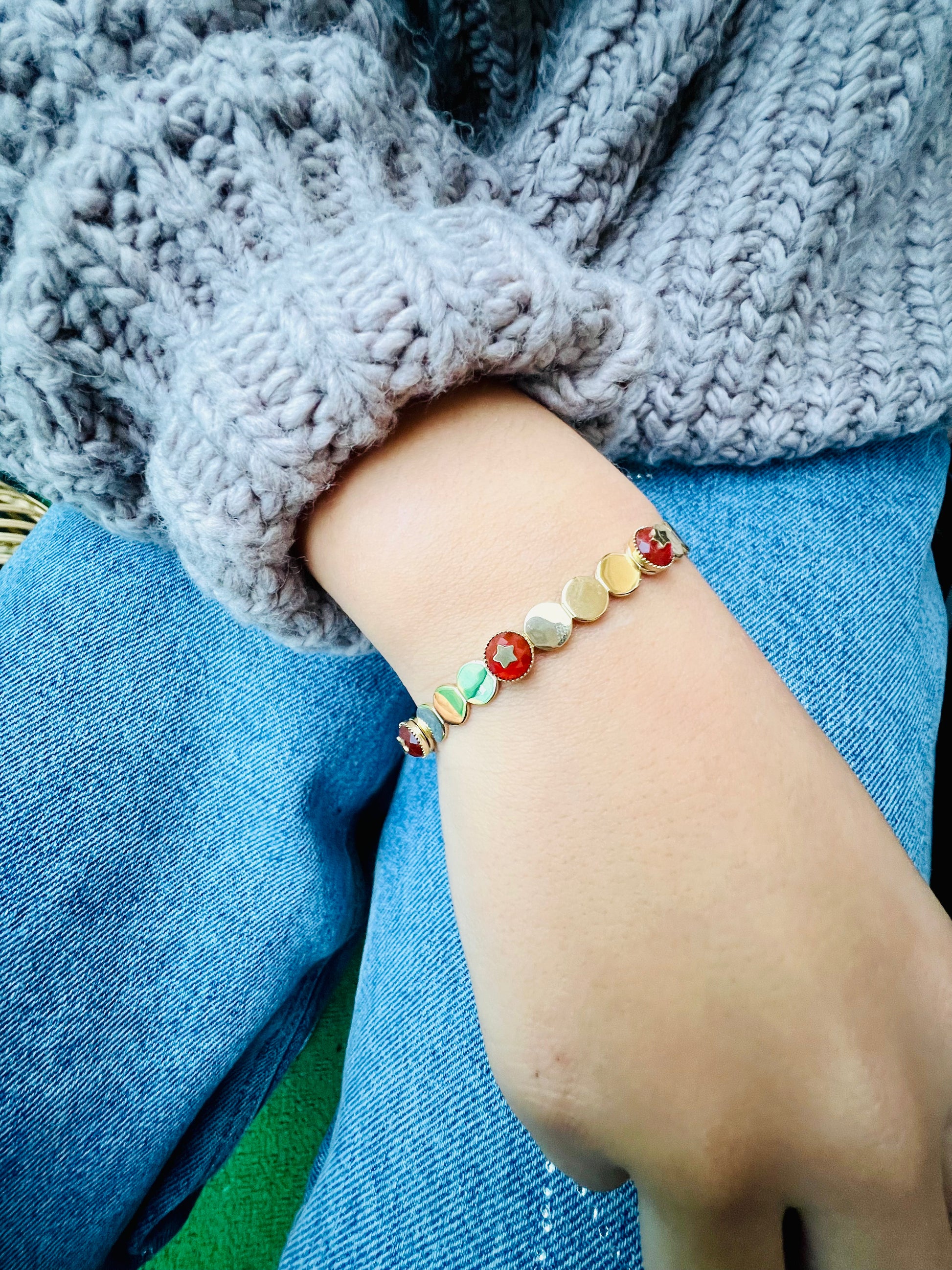 Le jonc MAÉ est sublimé par une pierre naturelle ronde en cornaline ou en amazonite, apportant une touche de couleur et de chaleur. Un bijou élégant et tendance, parfait pour rehausser votre poignet !