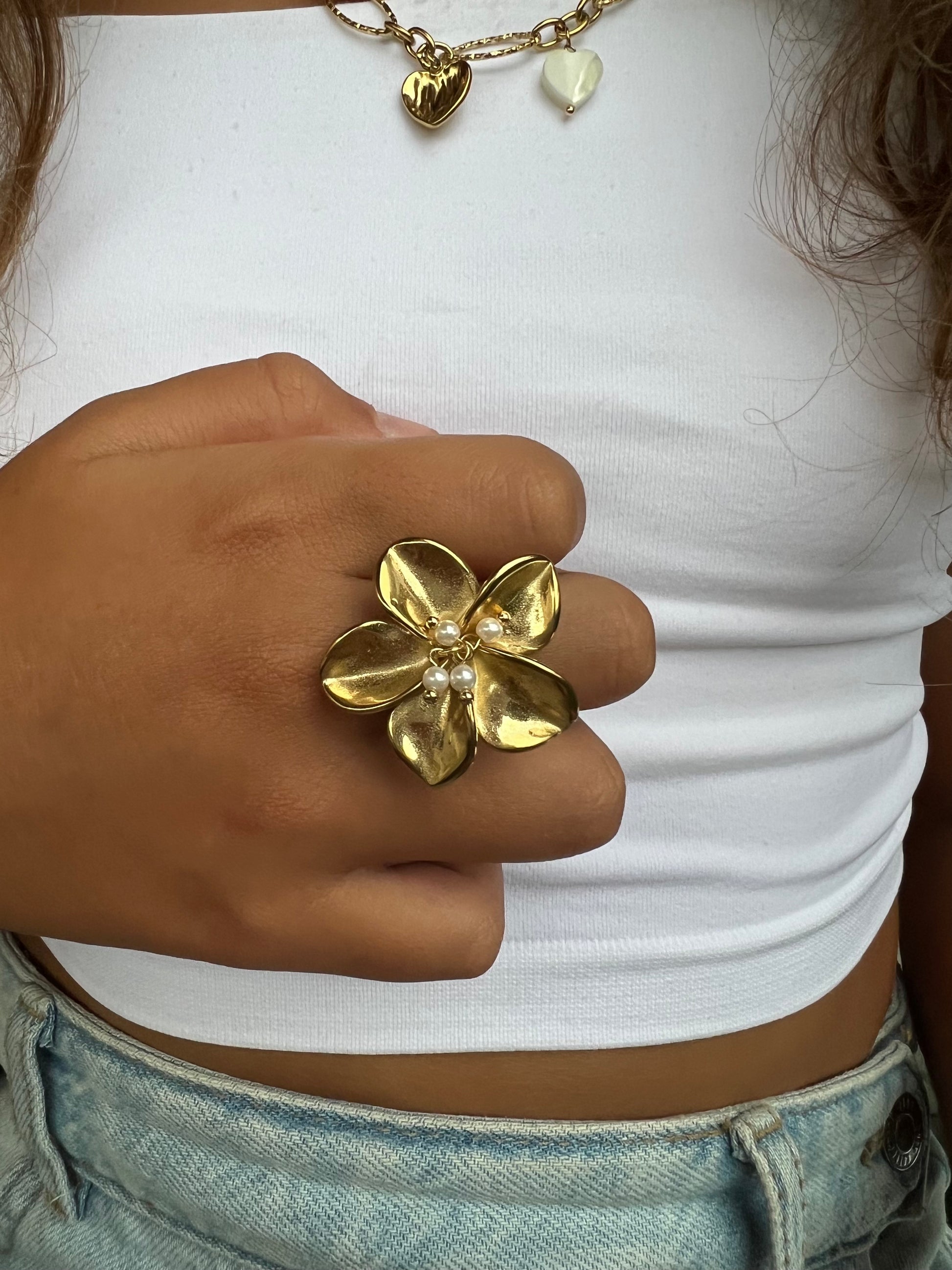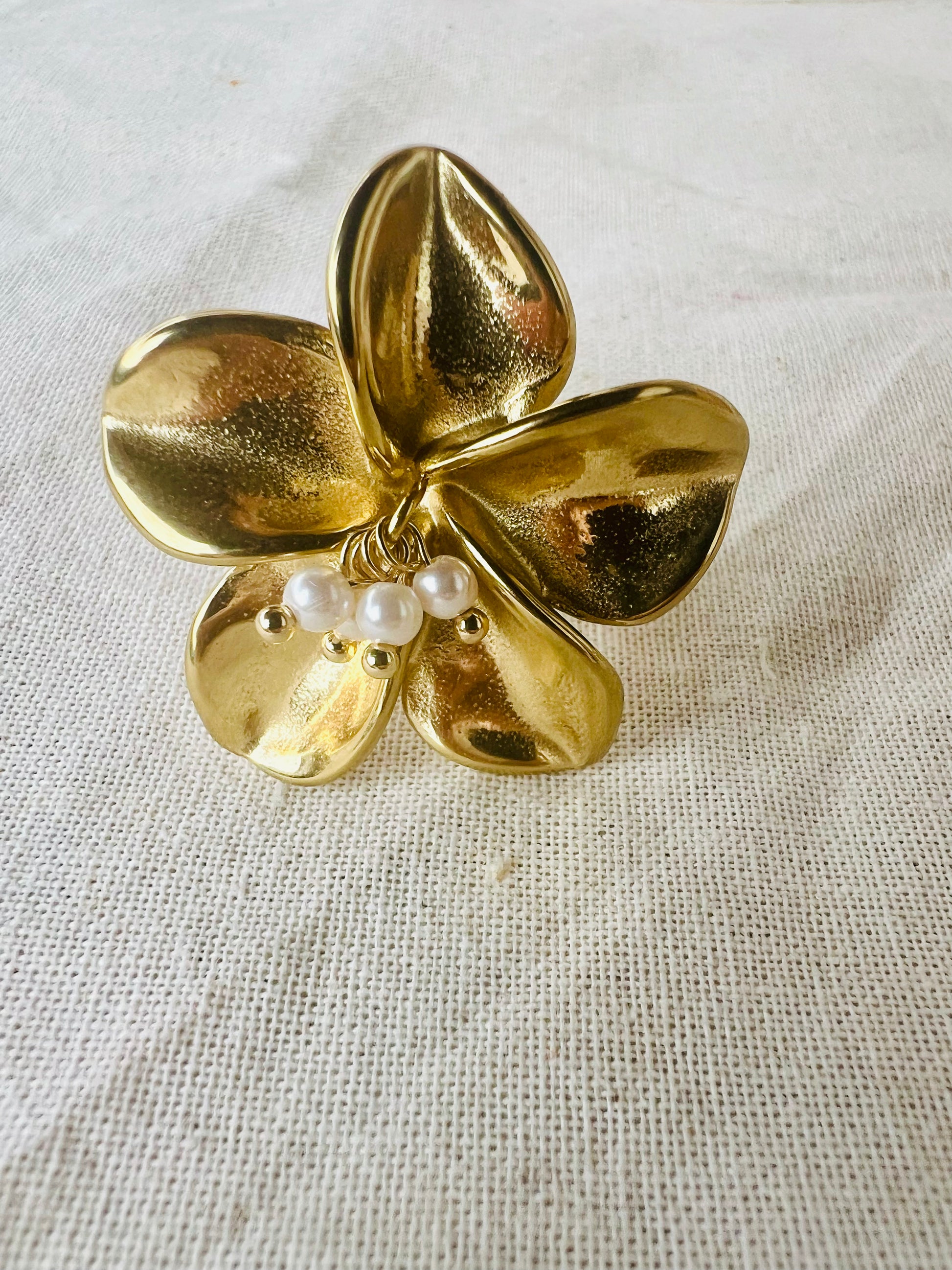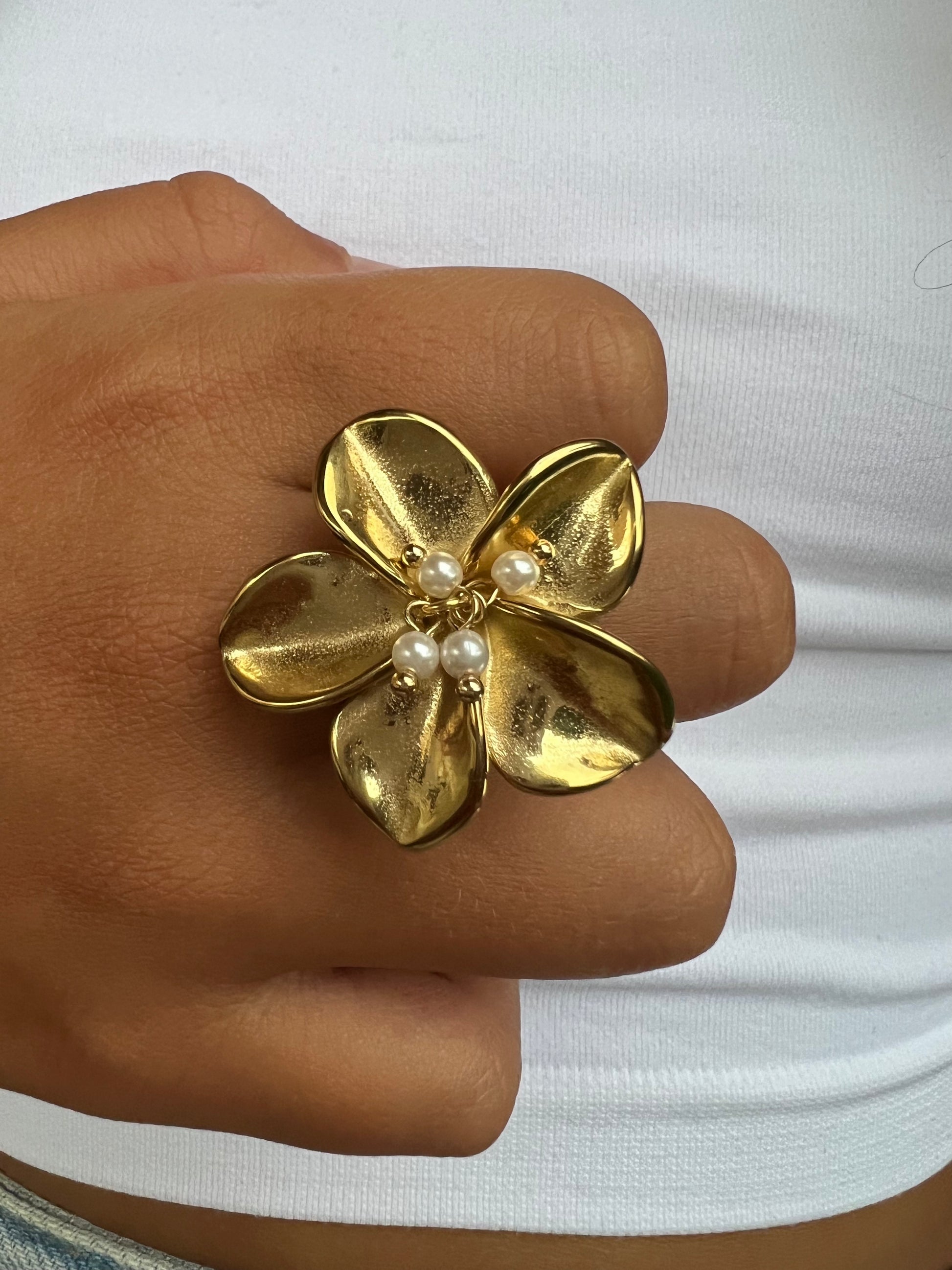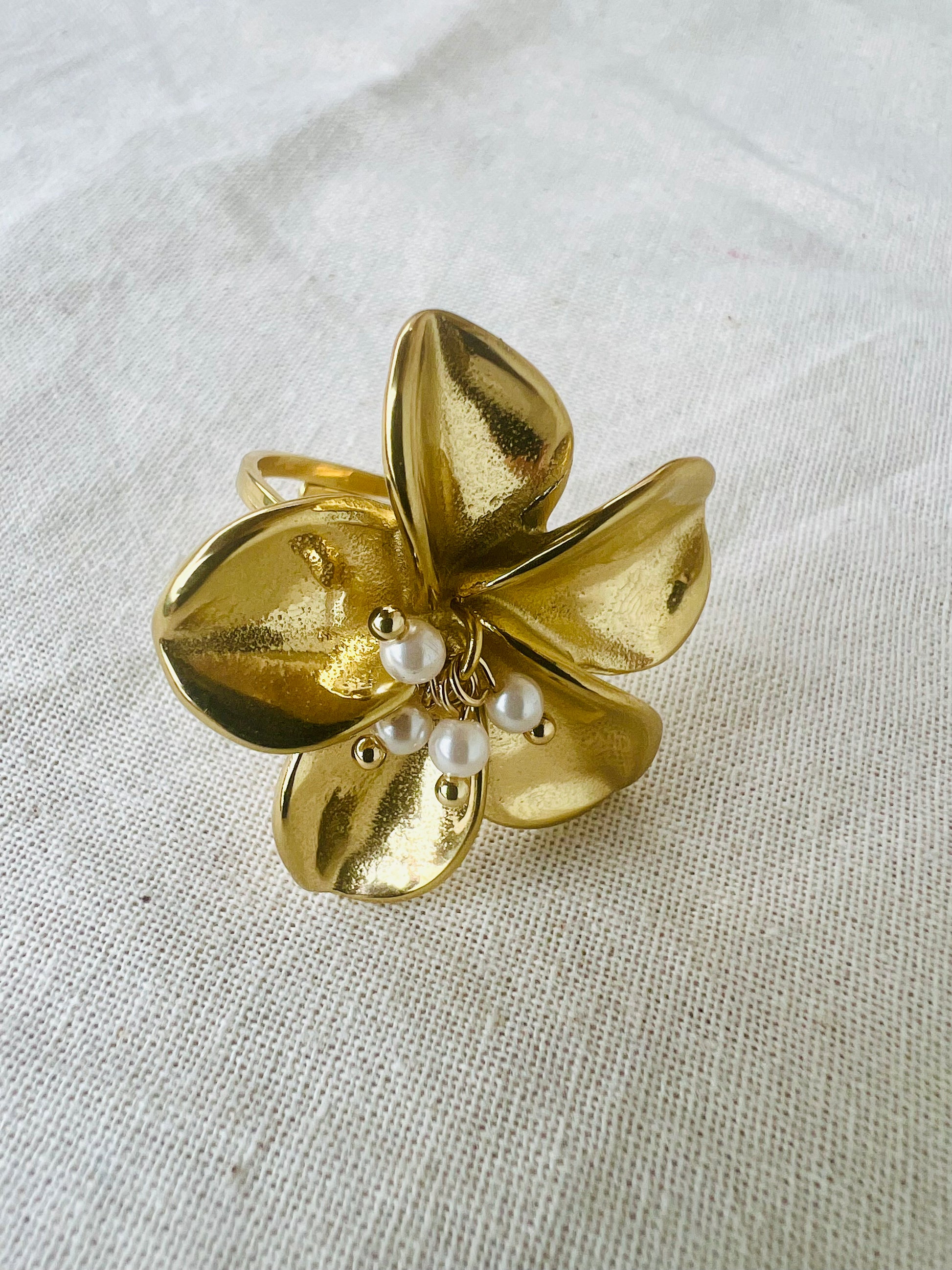✧ Bague dorée en acier inoxydable sous forme de fleur de lys avec des pampilles en perles blanches en résine.