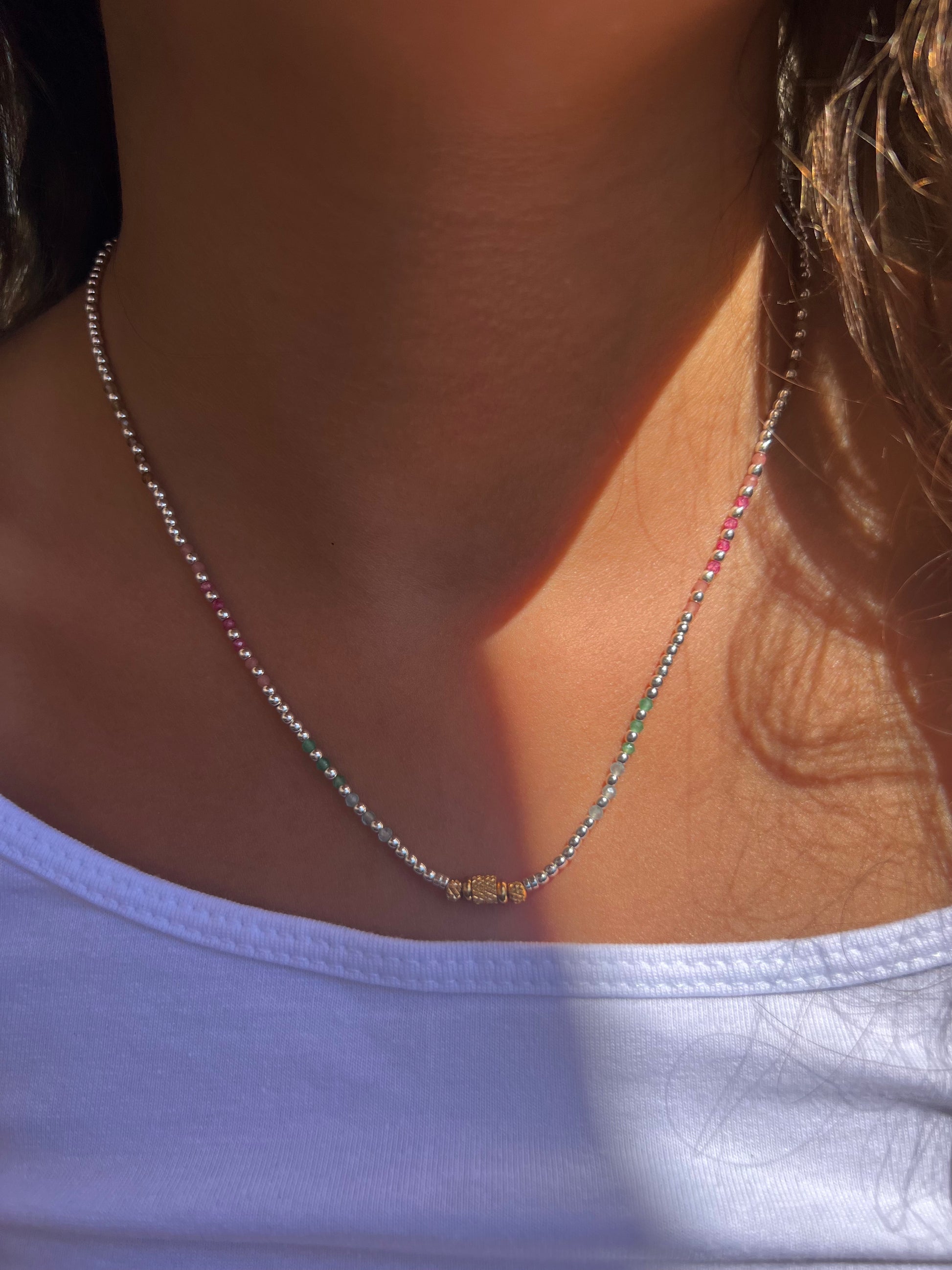 Le collier Manon est un bijou authentique et unique 🌸. Composé d’hématite argentée et d’un mélange de pierres naturelles, il combine force et éclat pour sublimer tous vos looks.