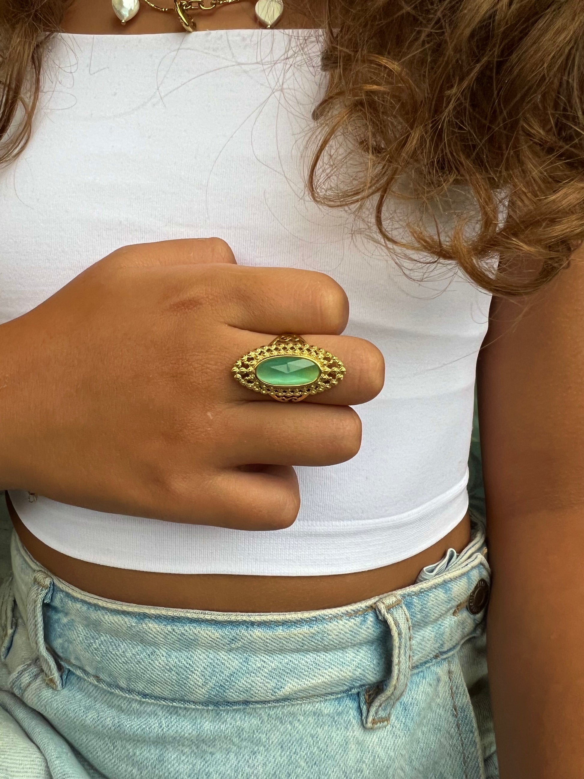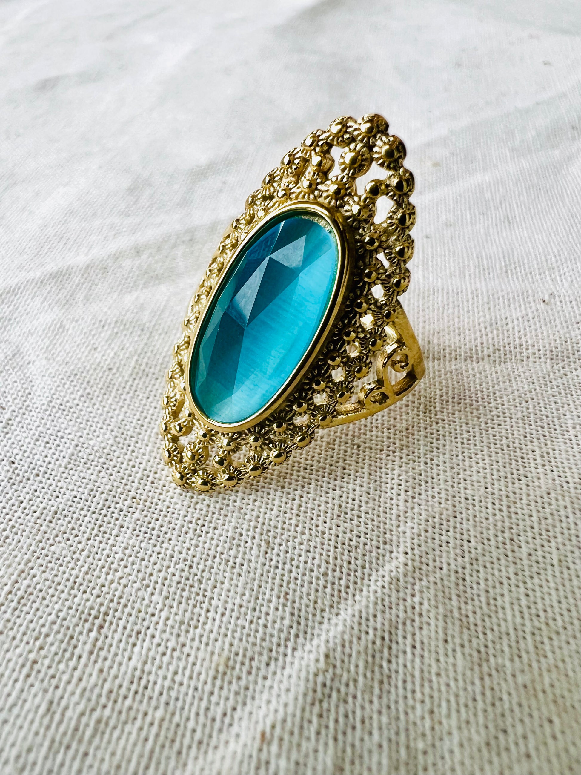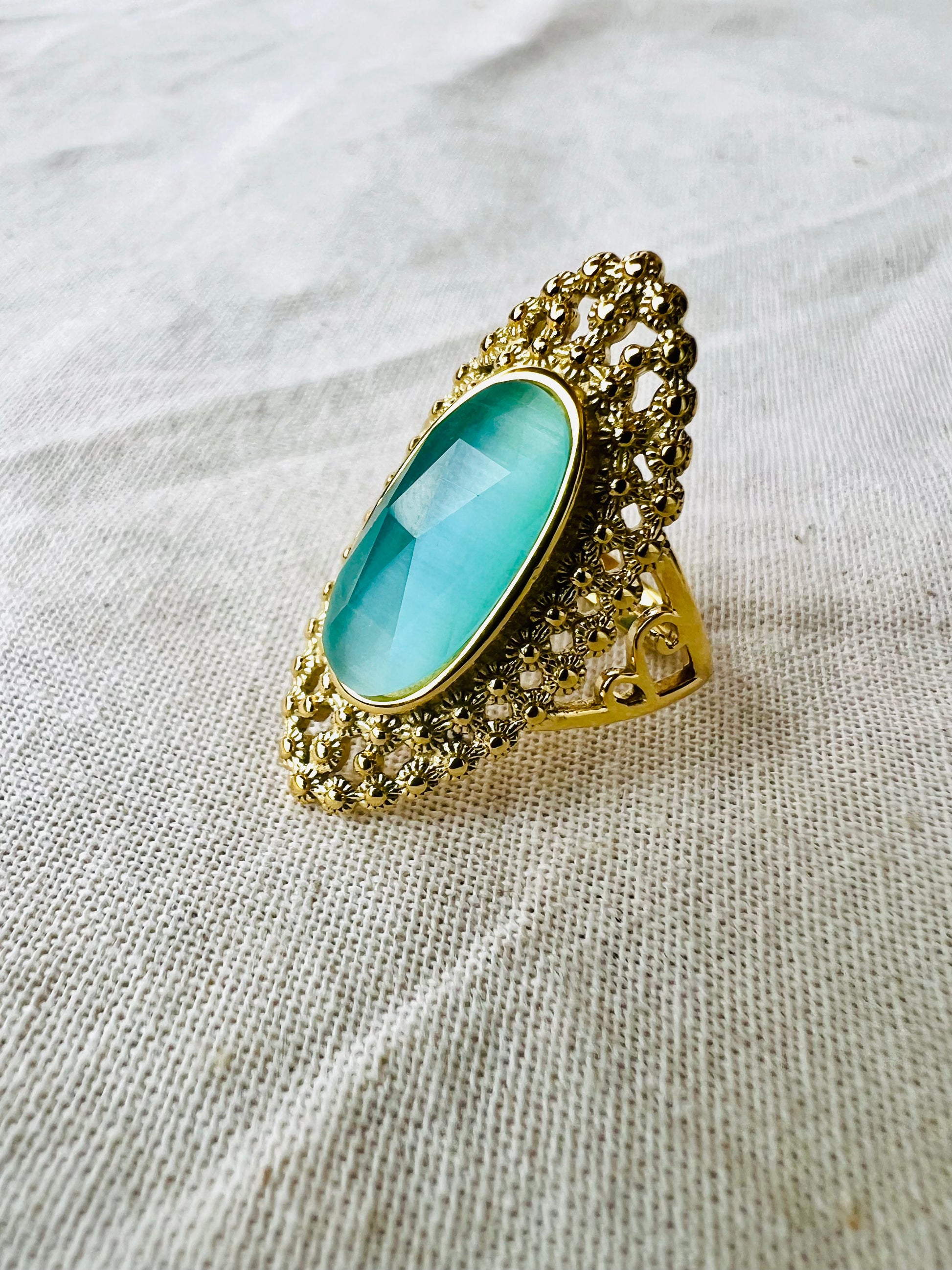 âš ĂlĂ©gante et lumineuse, la bague Marine se compose dâune pierre Ćil de chat đ entourĂ©e dâun cadre raffinĂ© Ă effet milgrain âš.